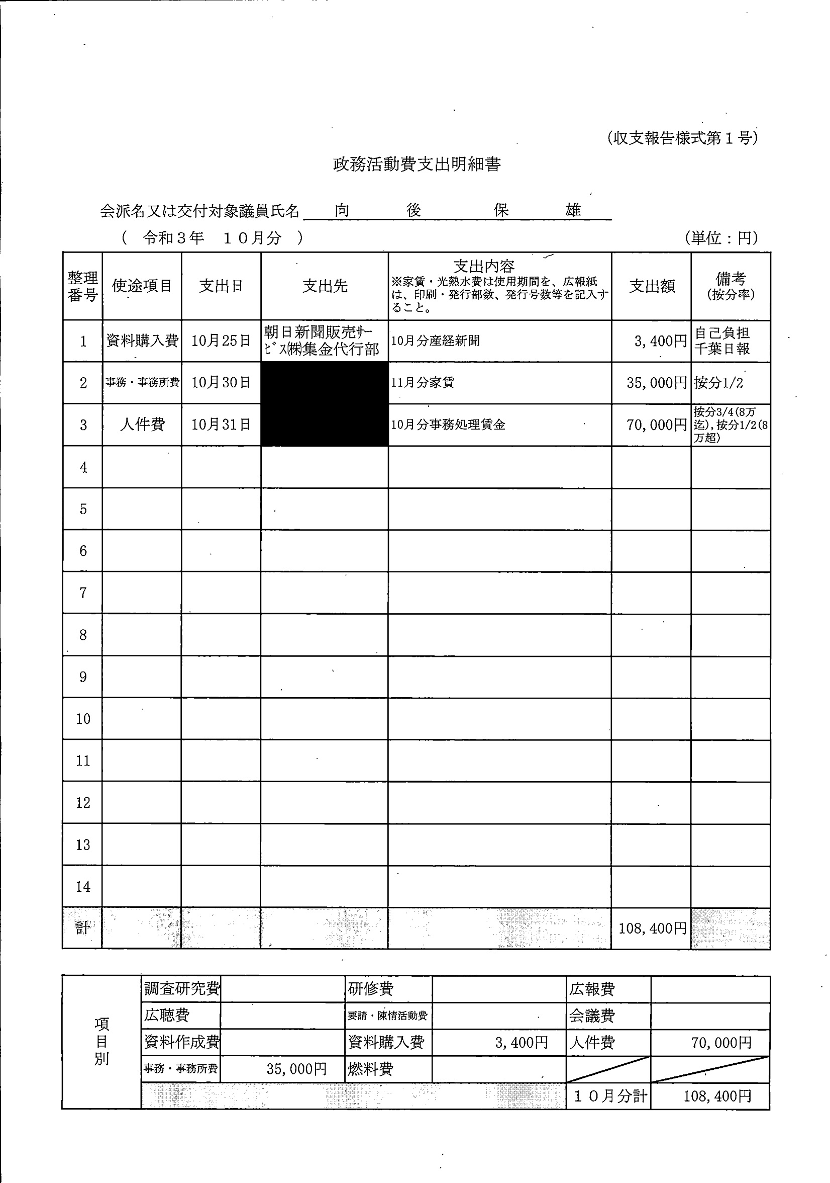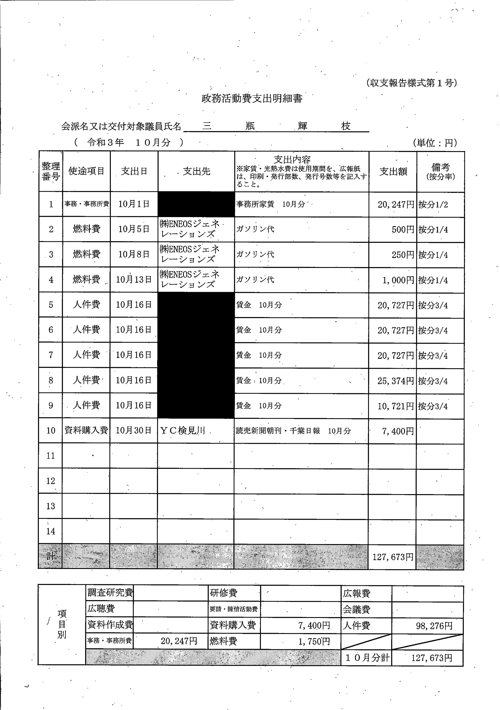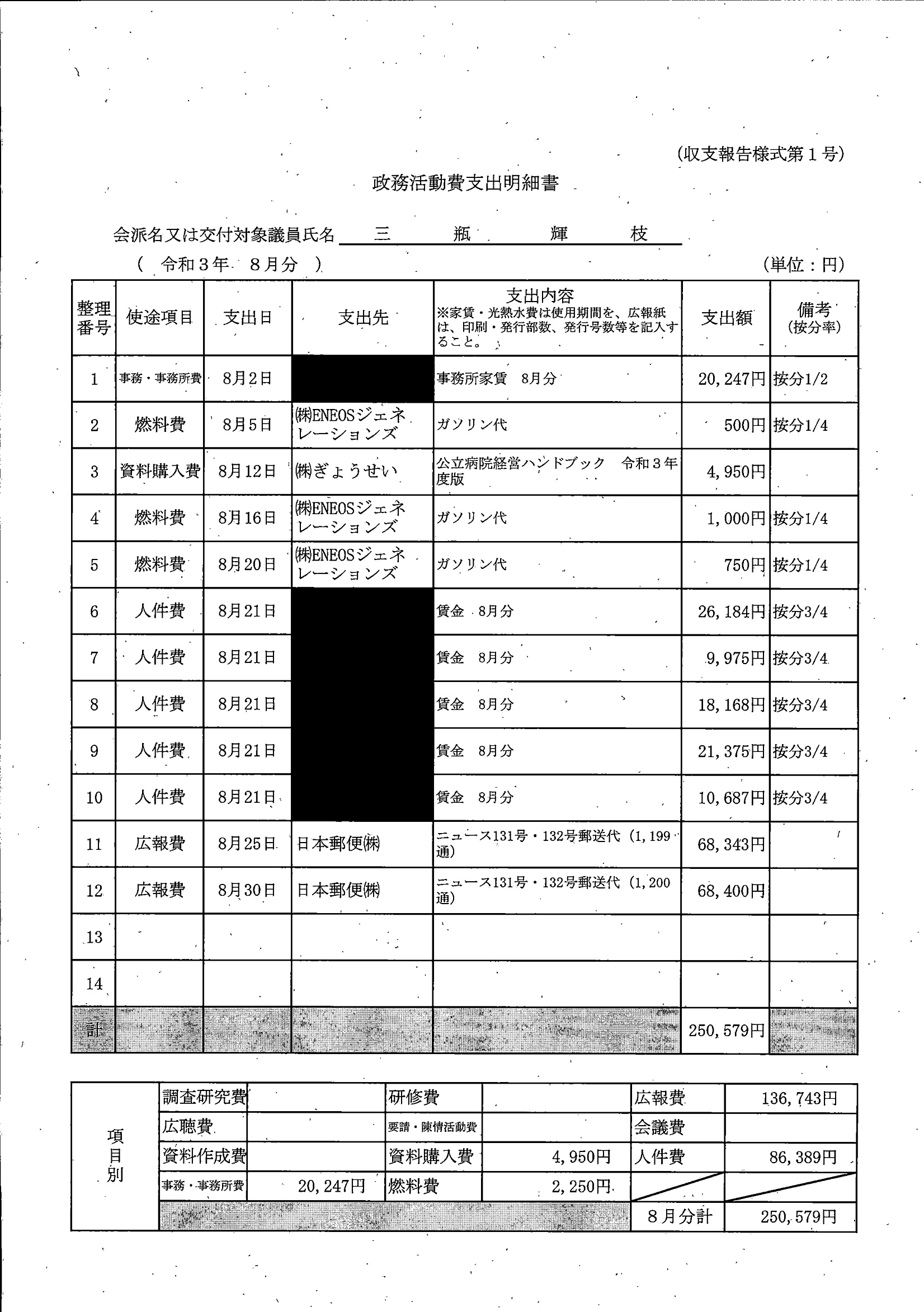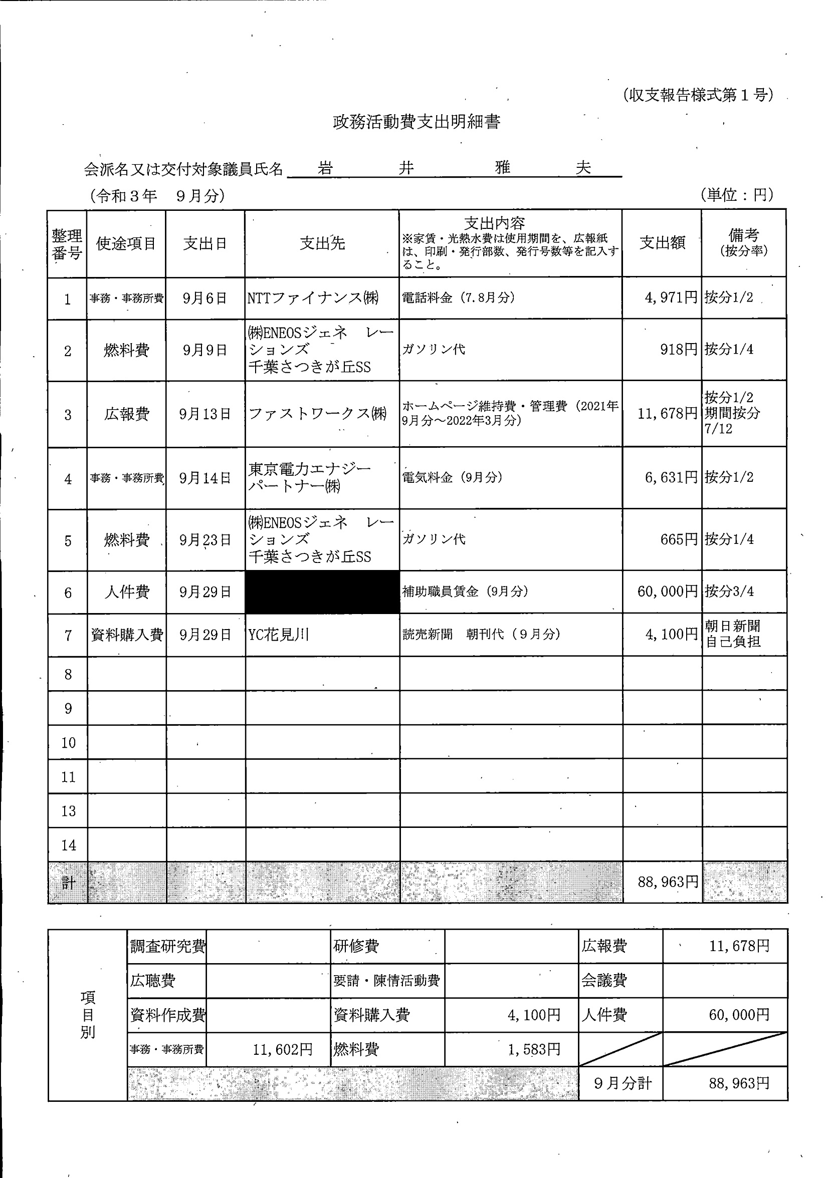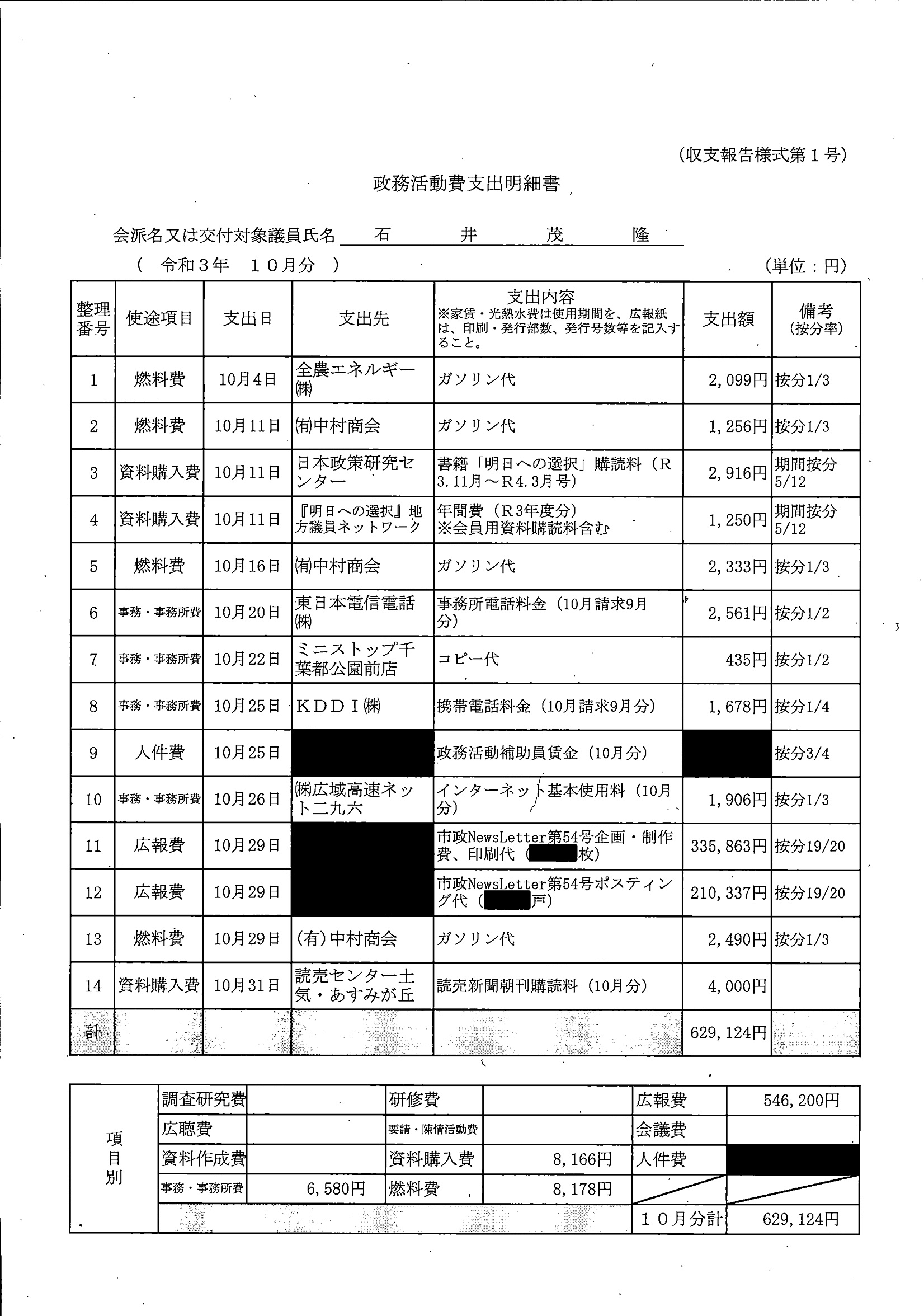 千葉市議会トップページ > 広報・情報公開 > 政務活動費 > 令和3年度交付分(政務活動費収支報告書)