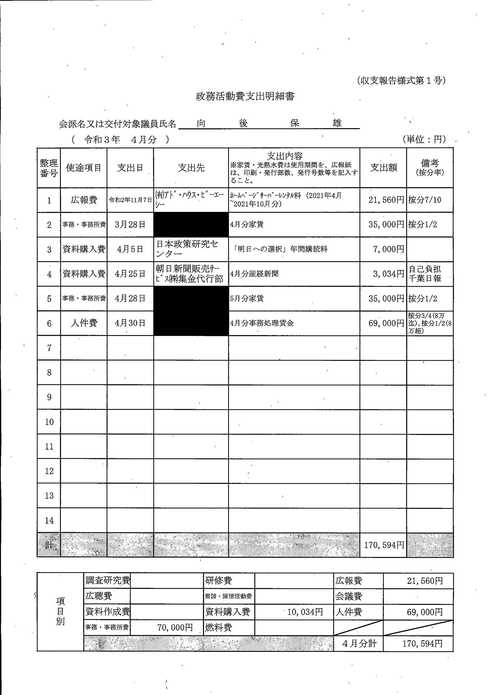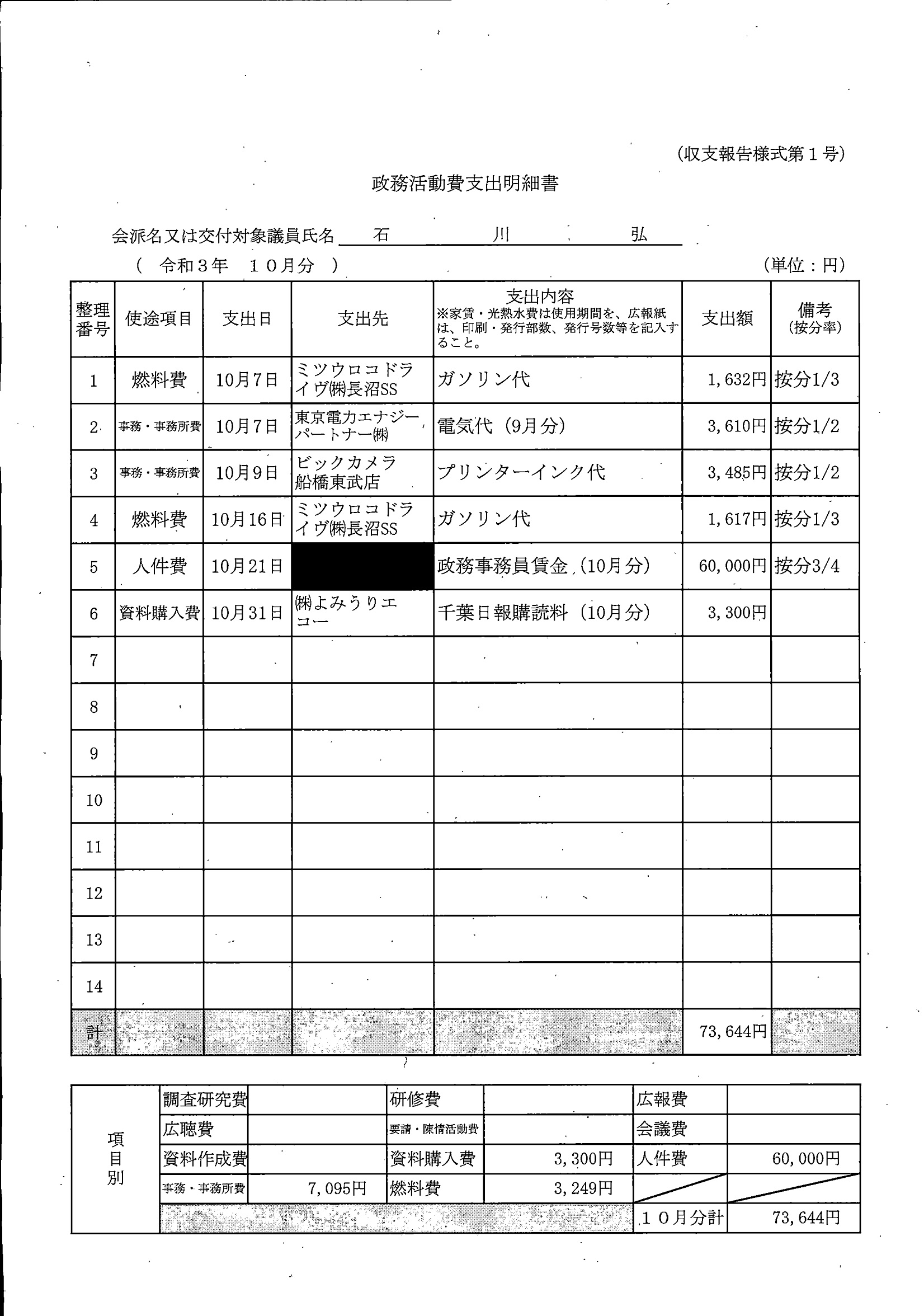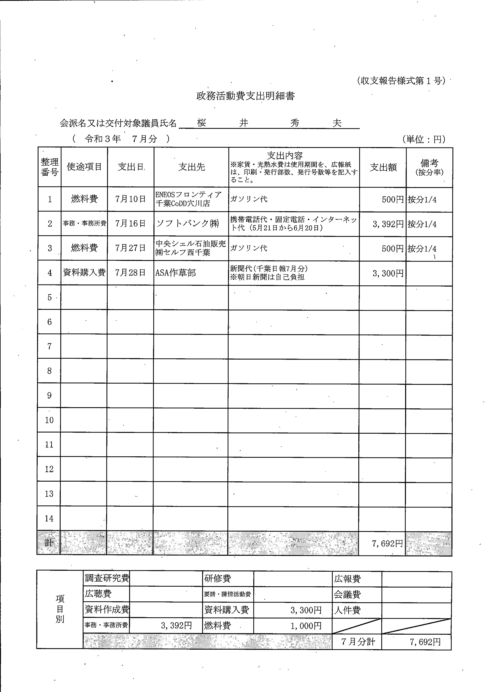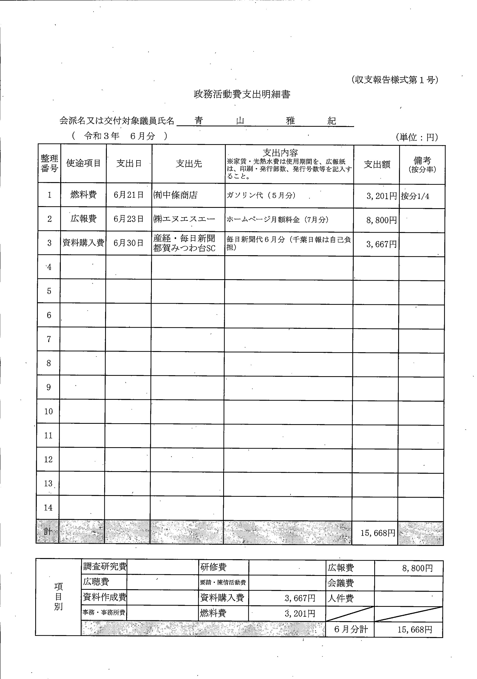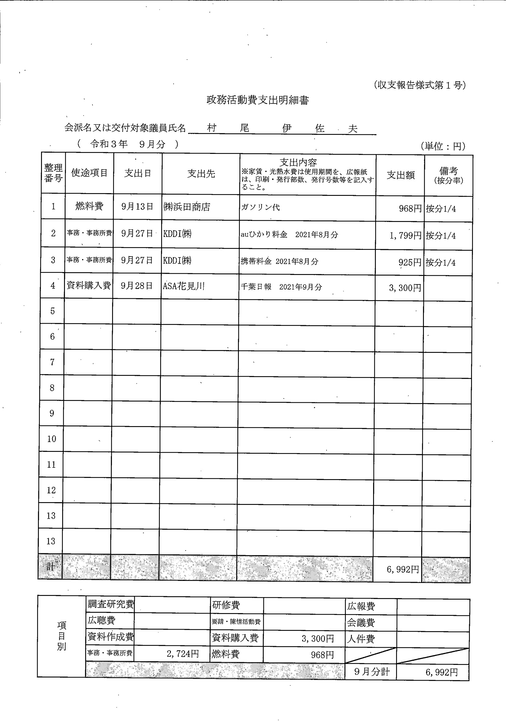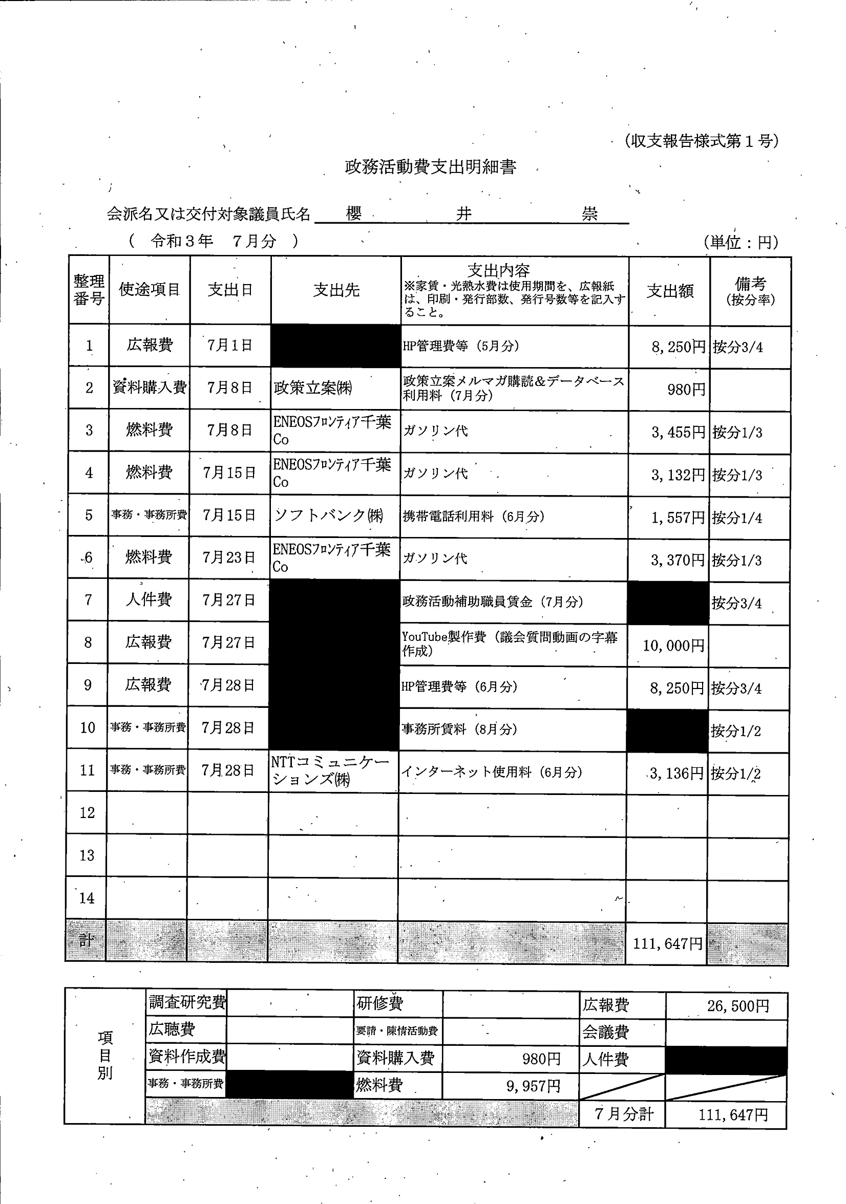千葉市議会トップページ > 広報・情報公開 > 政務活動費 > 令和3年度交付分(政務活動費収支報告書)