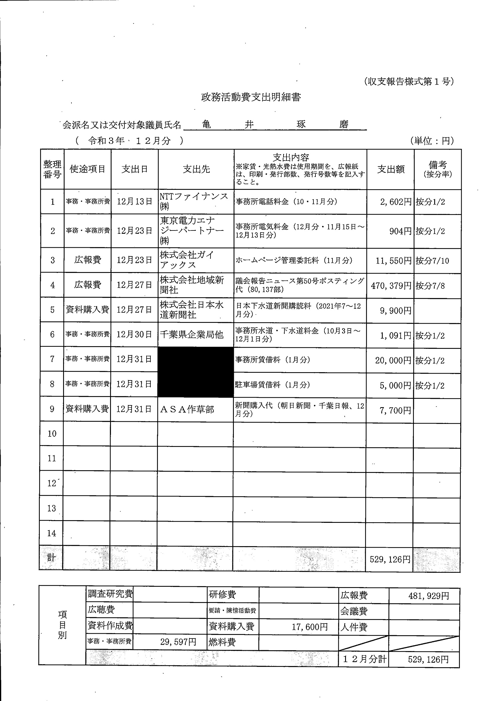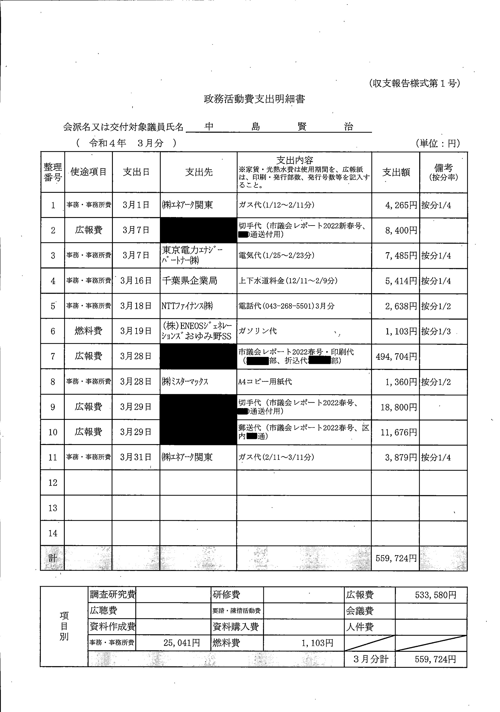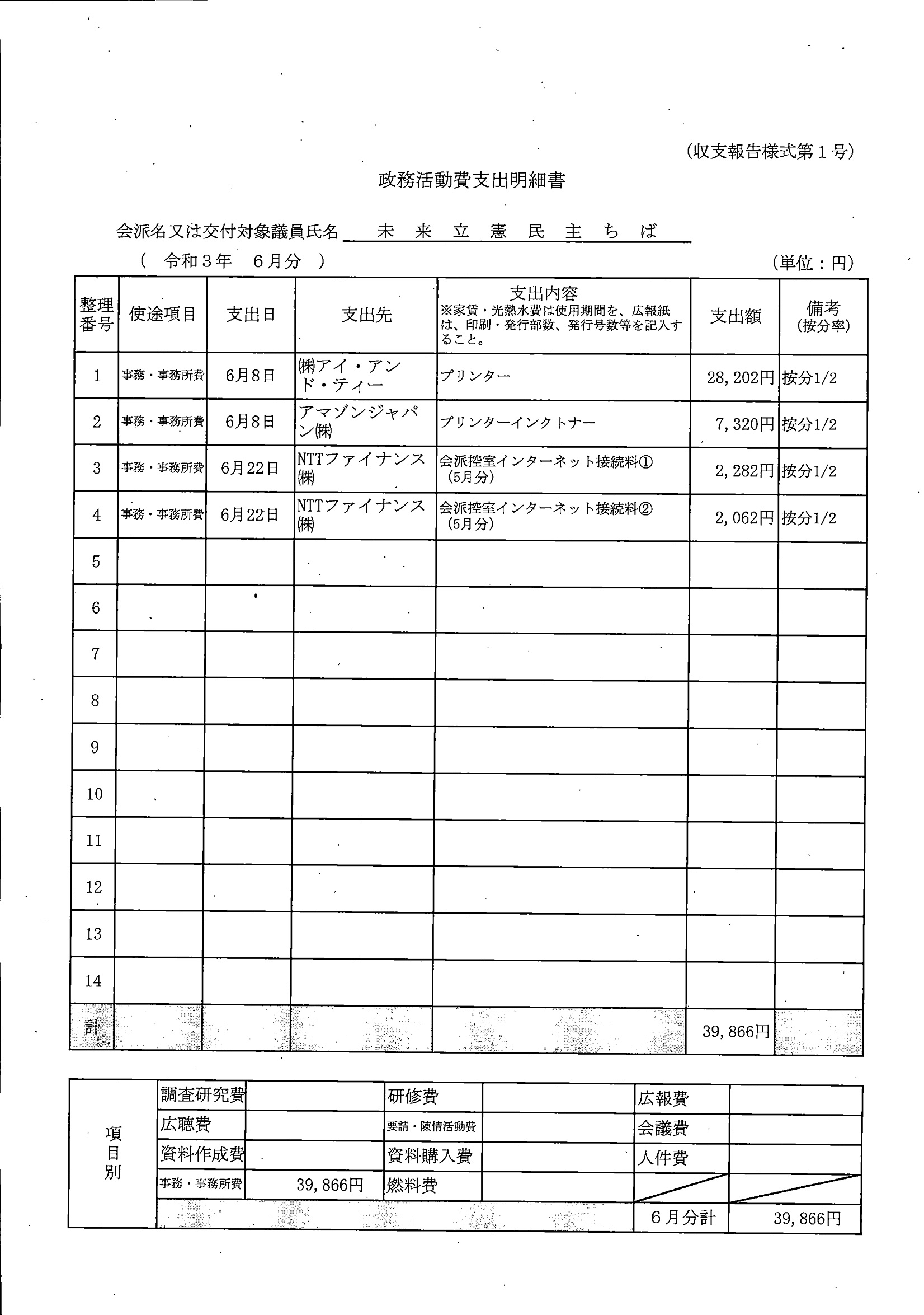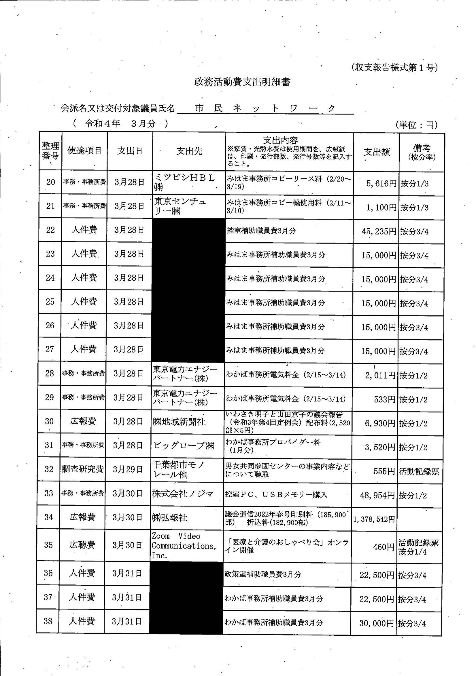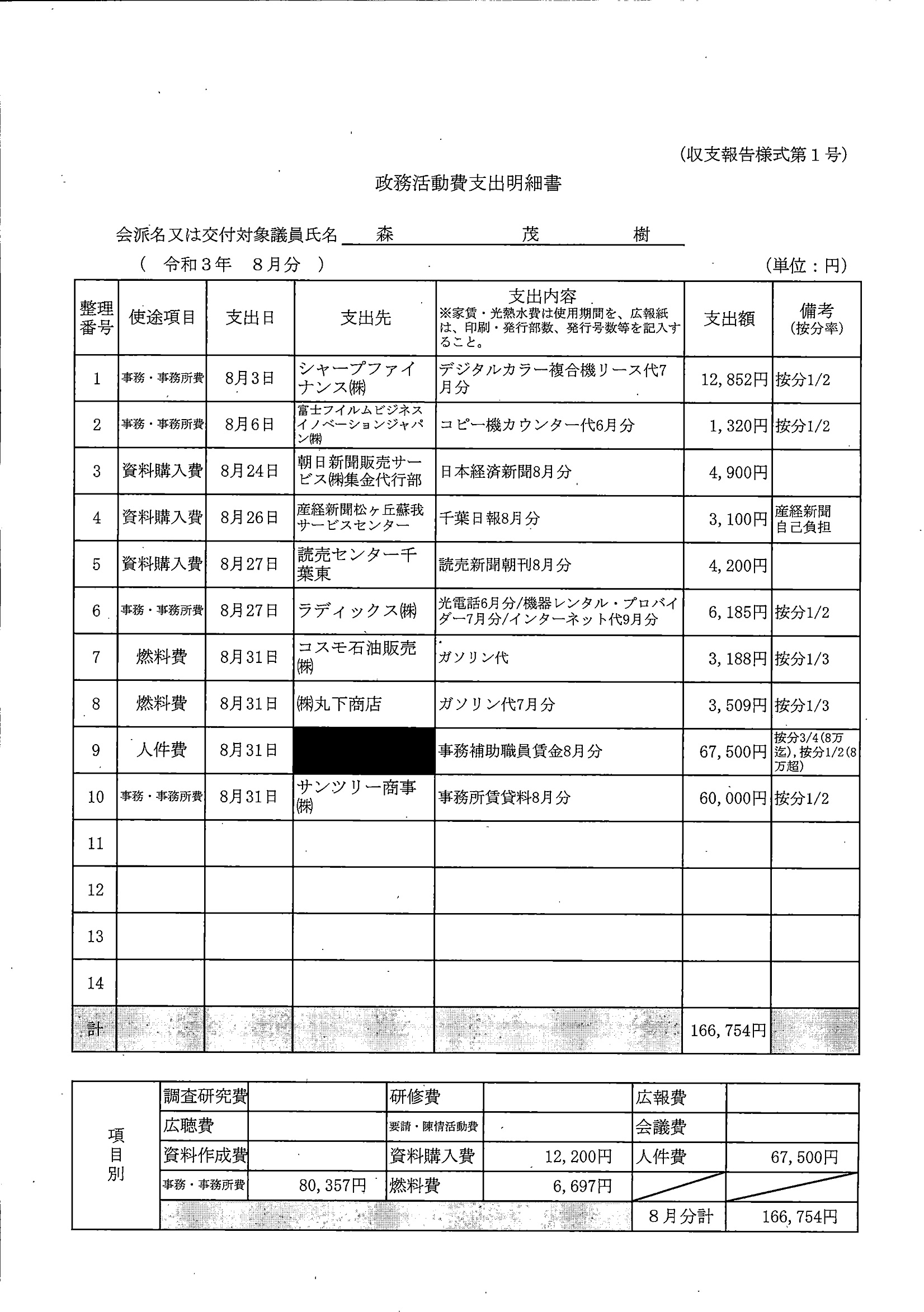 千葉市議会トップページ > 広報・情報公開 > 政務活動費 > 令和3年度交付分(政務活動費収支報告書)