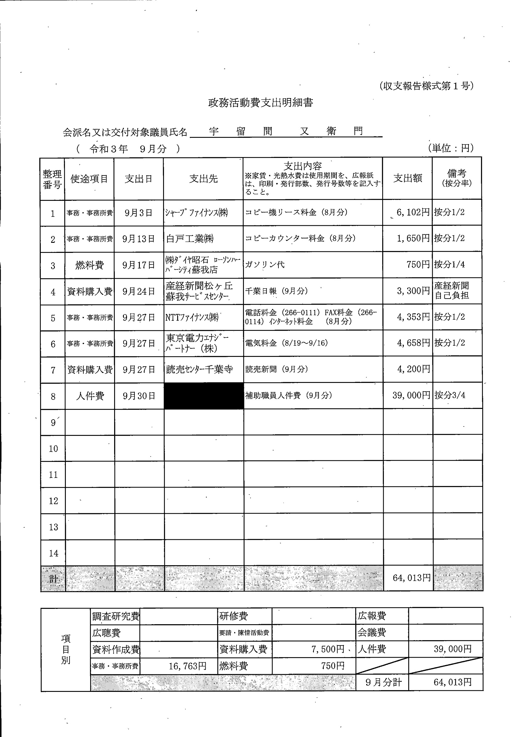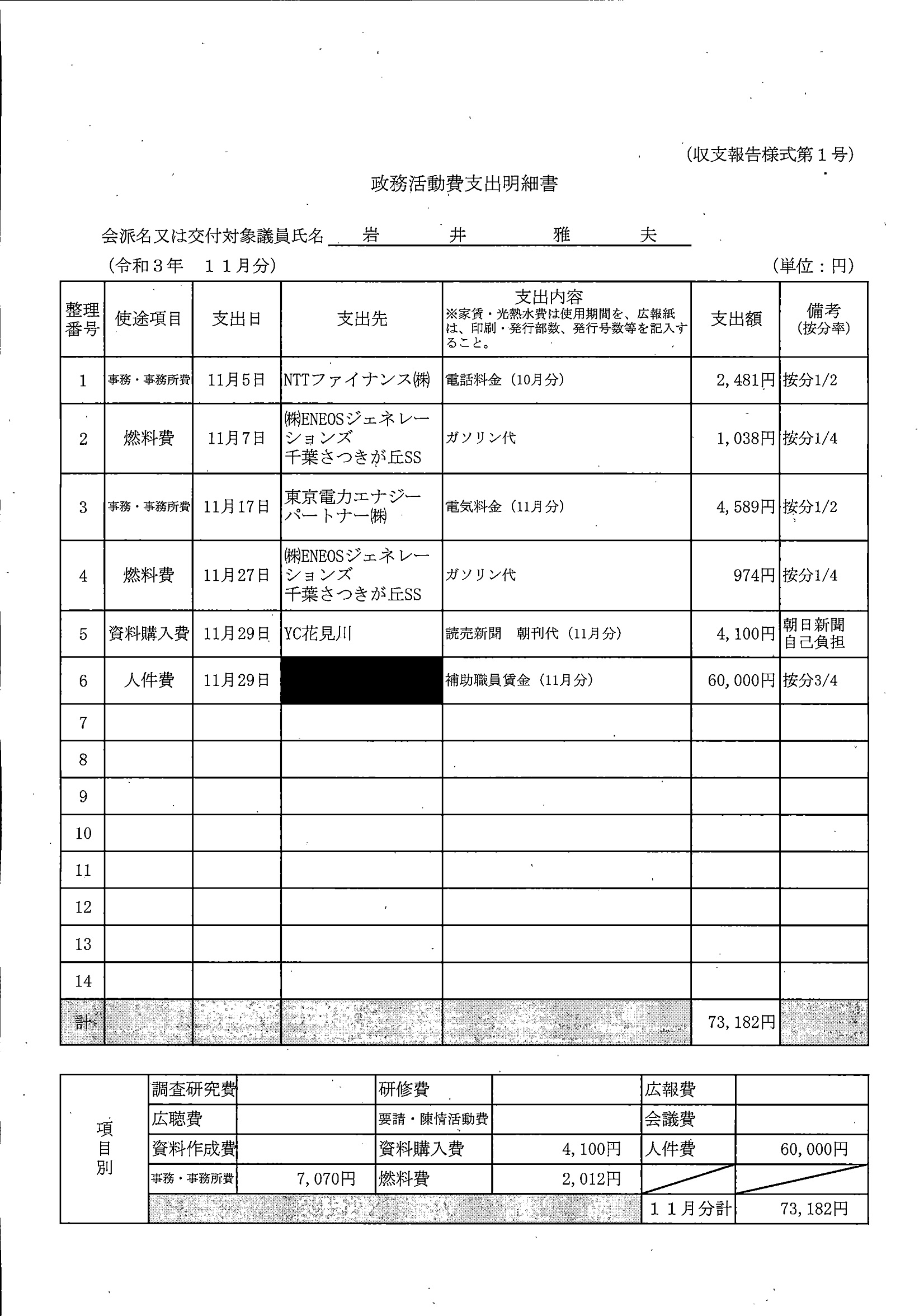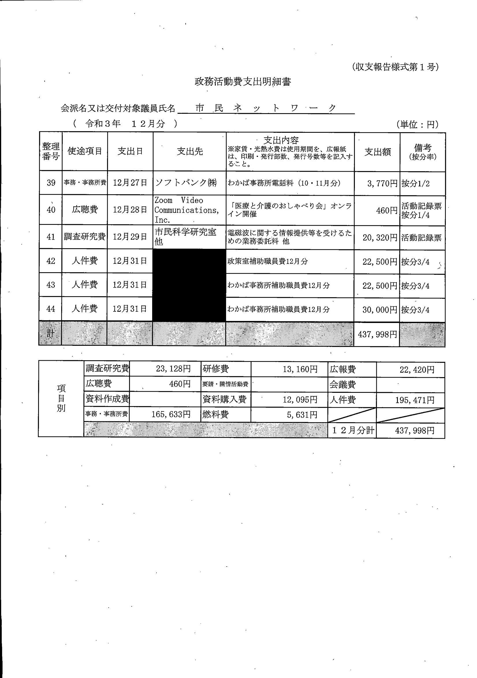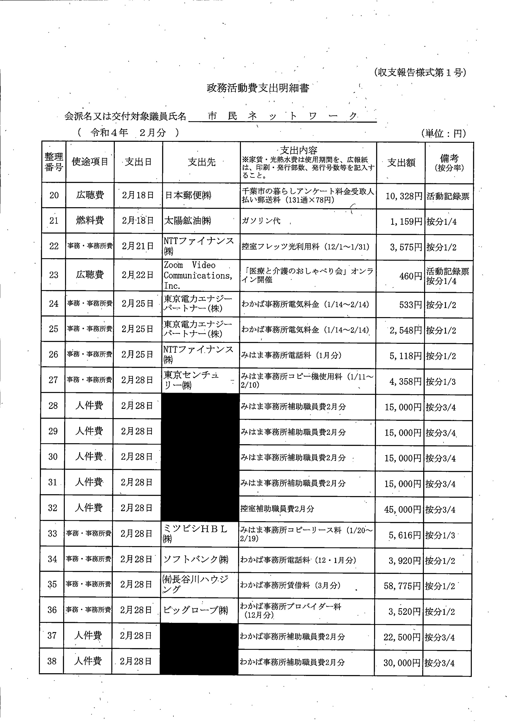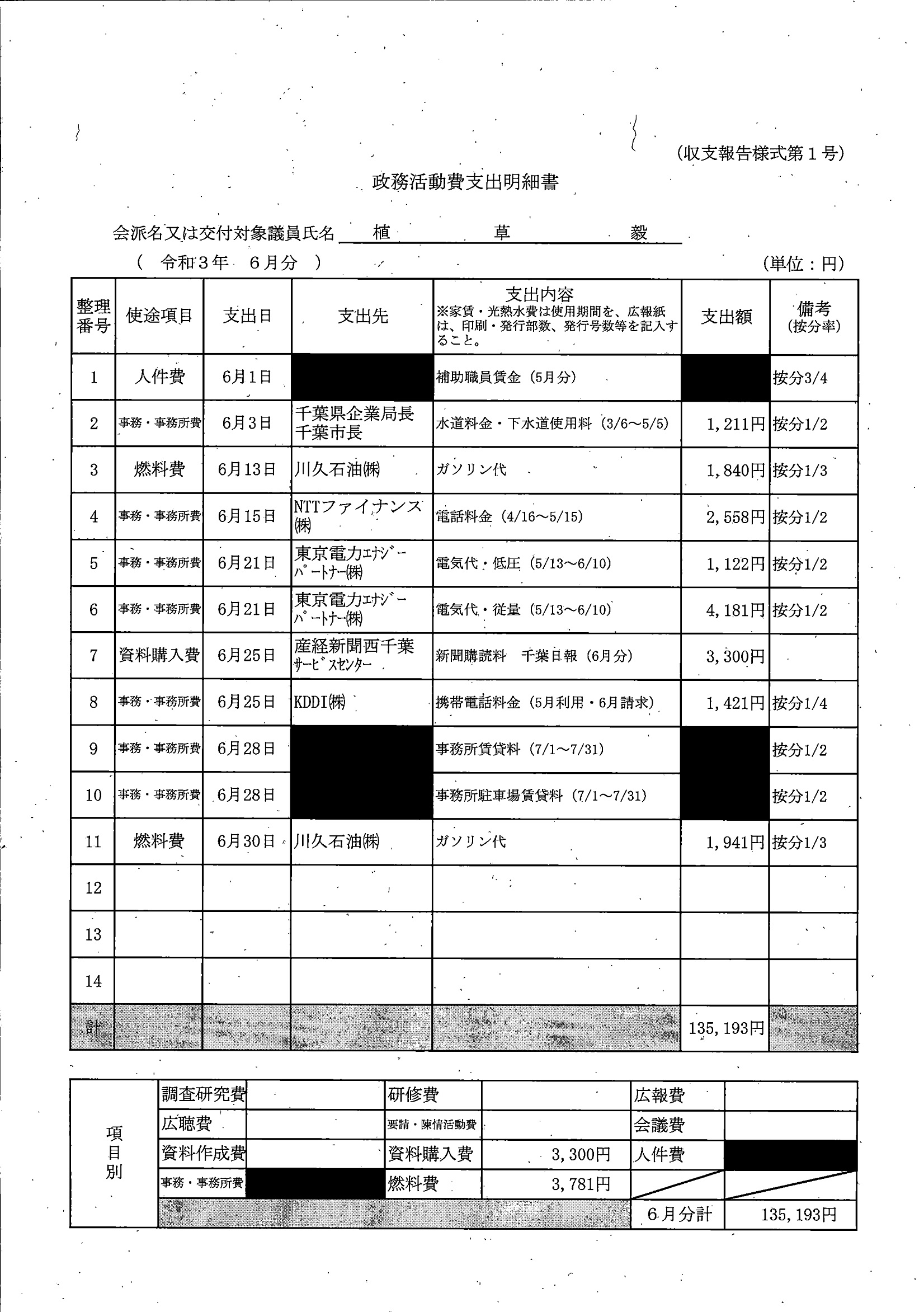 千葉市議会トップページ > 広報・情報公開 > 政務活動費 > 令和3年度交付分(政務活動費収支報告書)