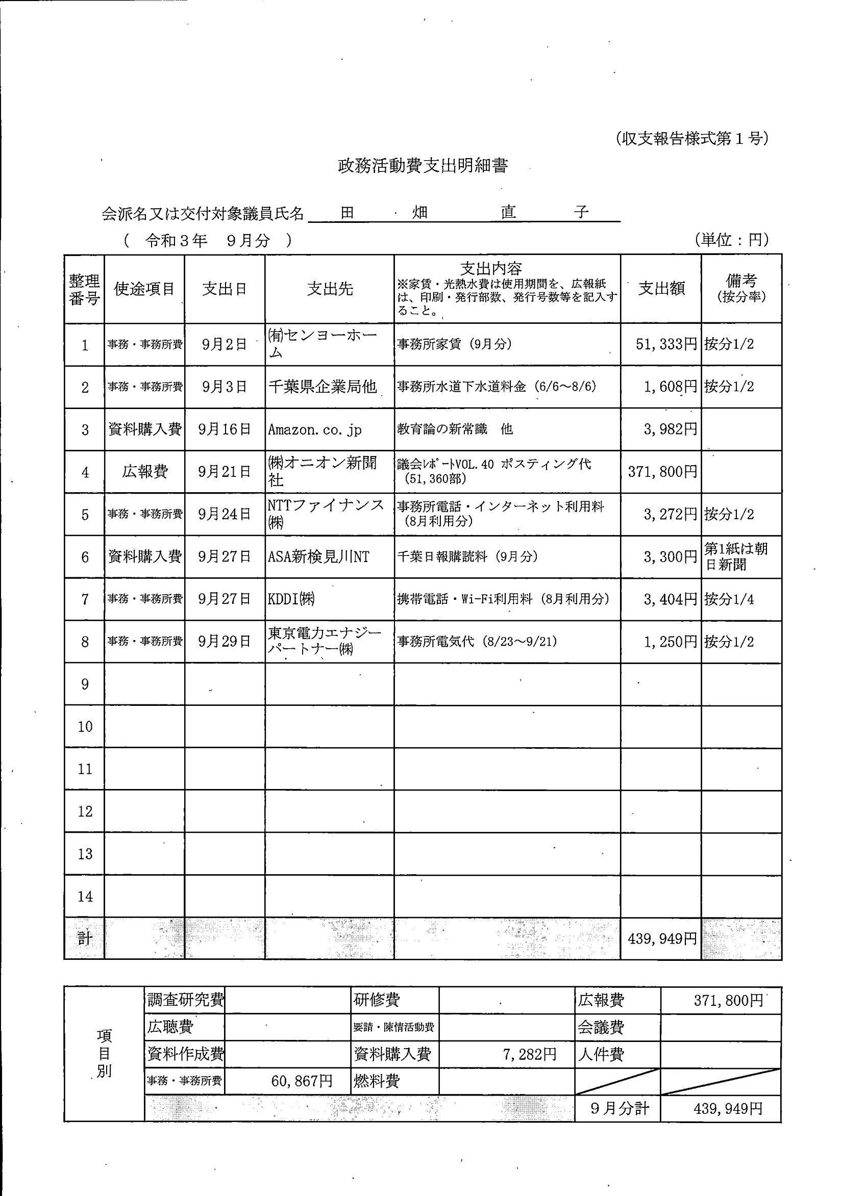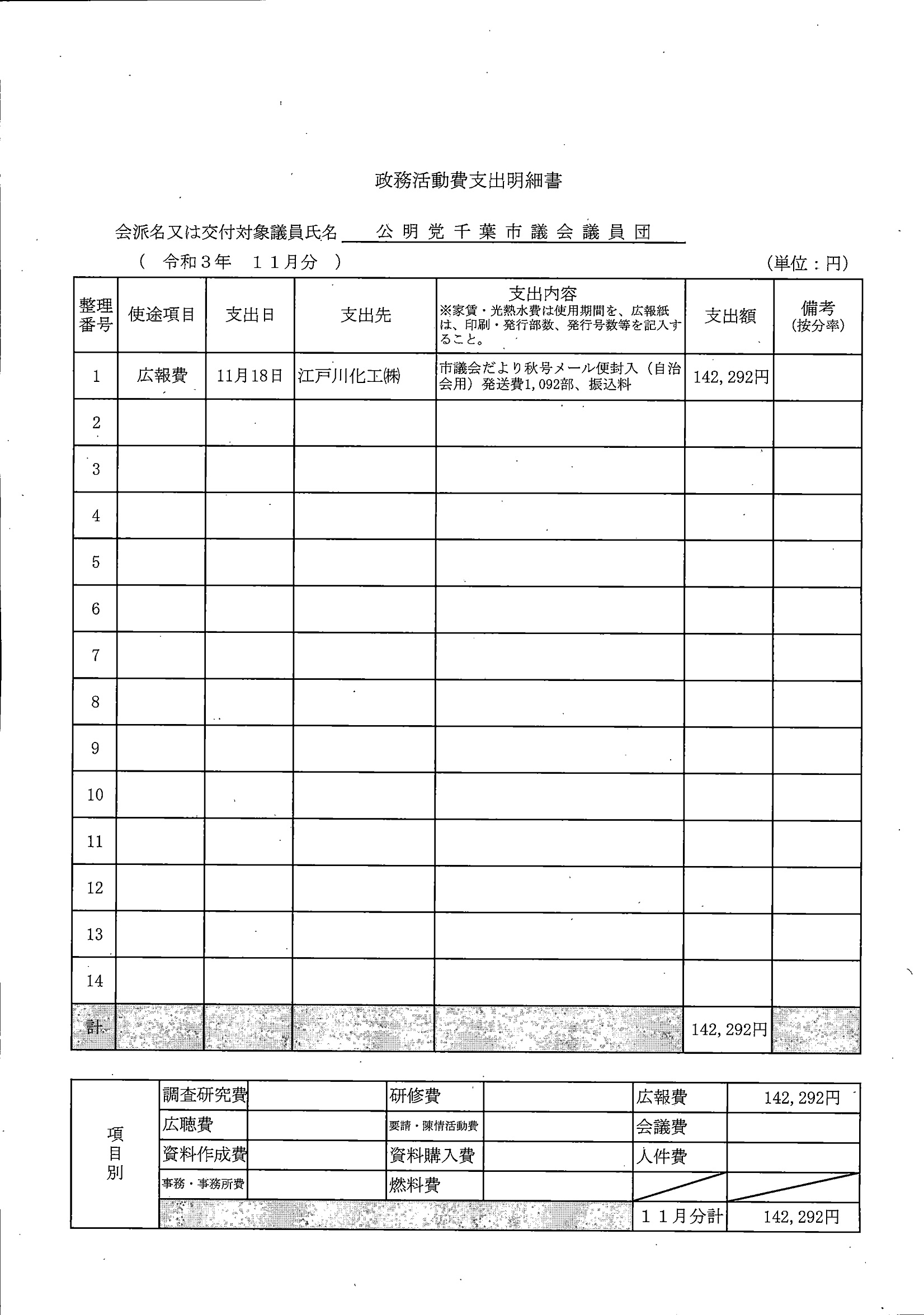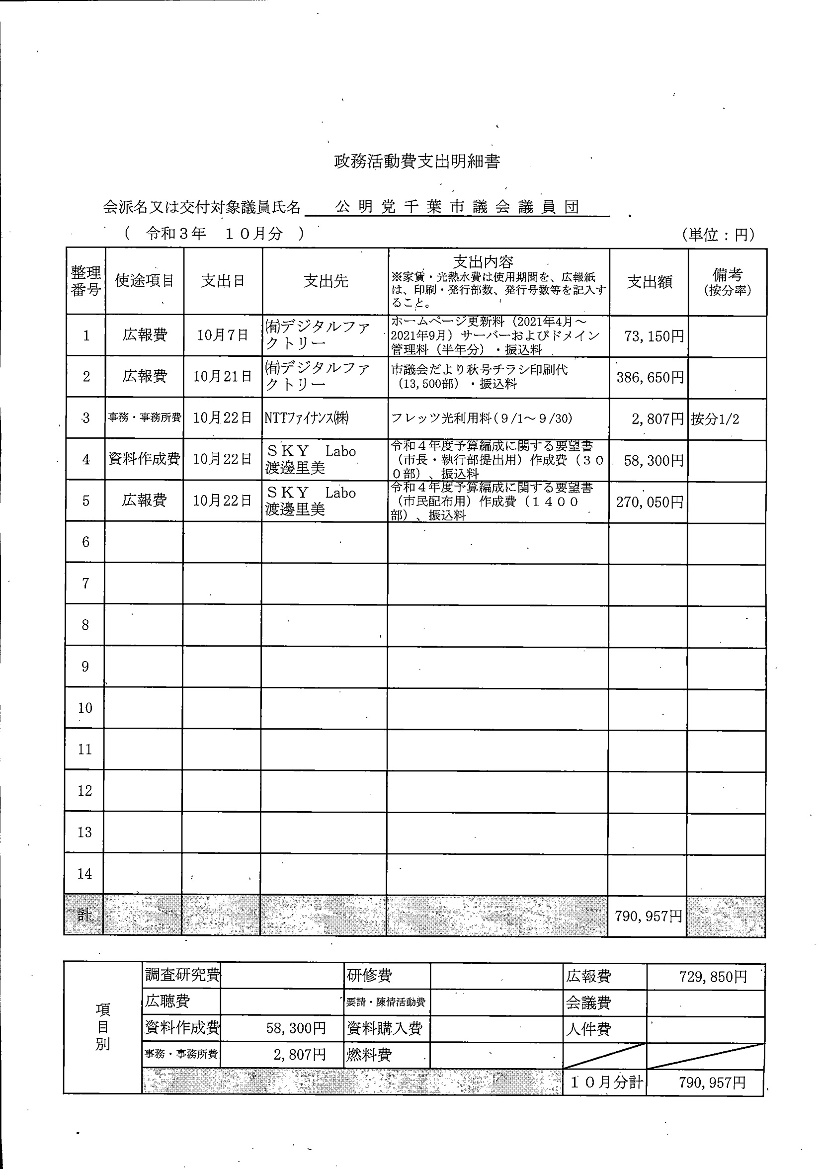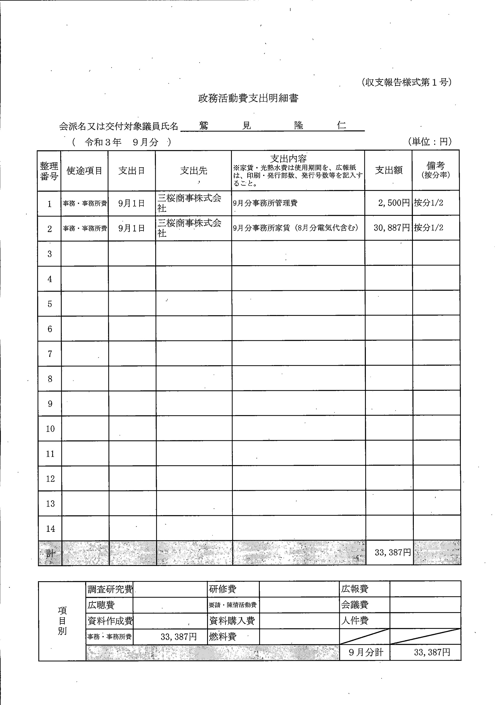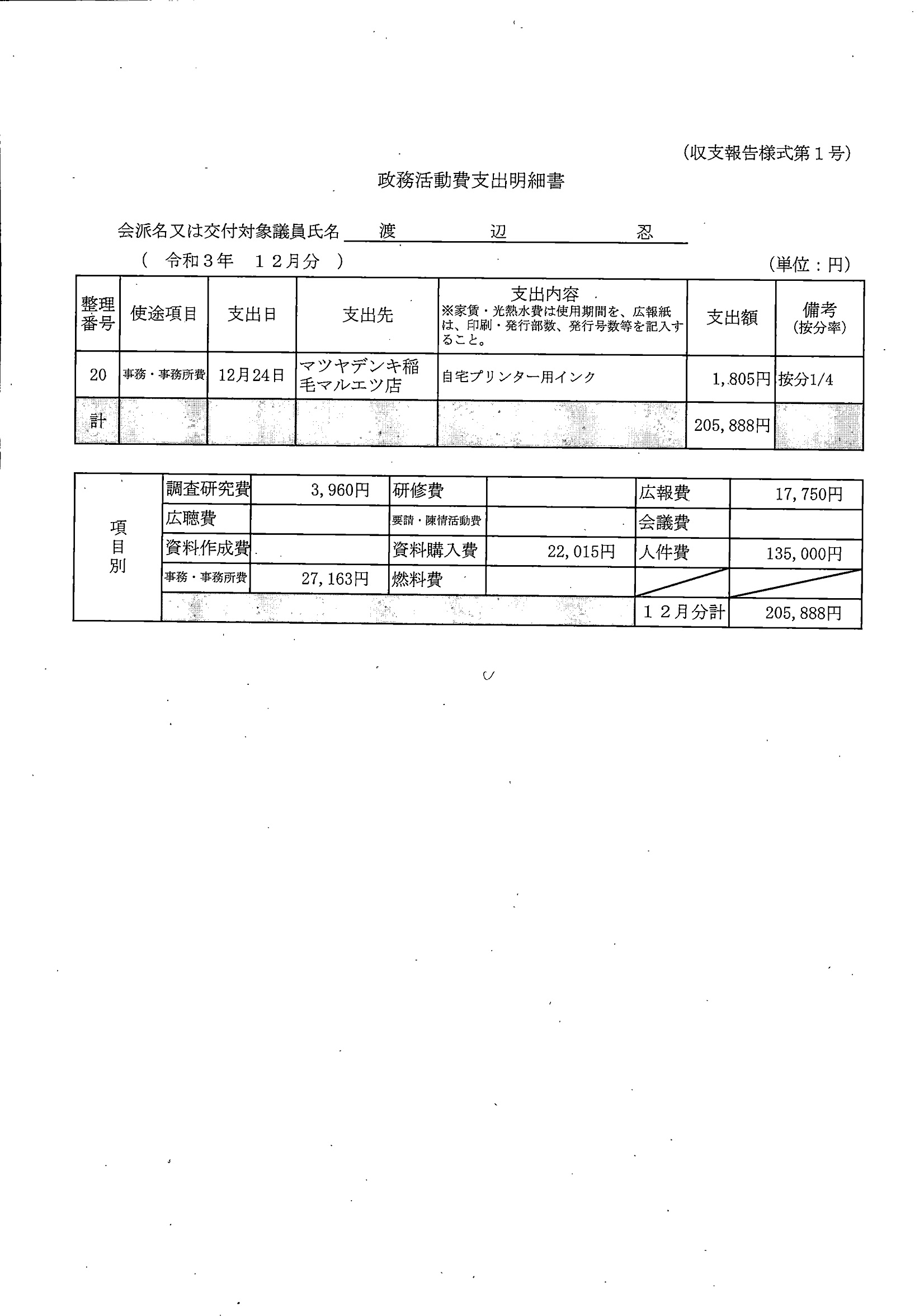 千葉市議会トップページ > 広報・情報公開 > 政務活動費 > 令和3年度交付分(政務活動費収支報告書)