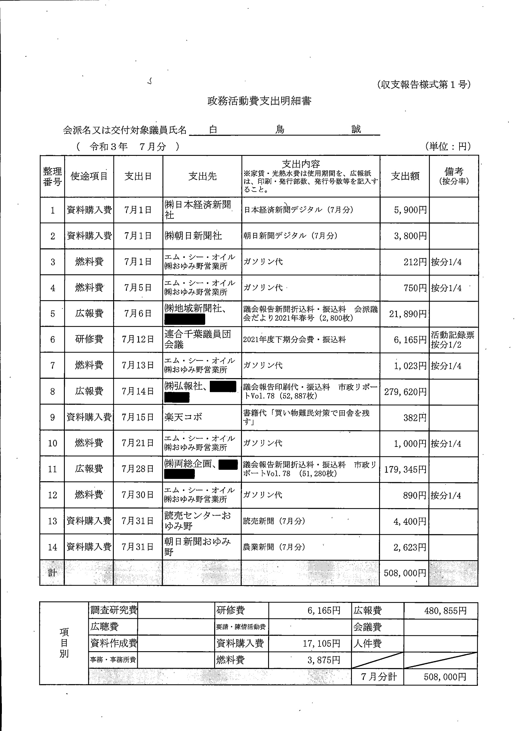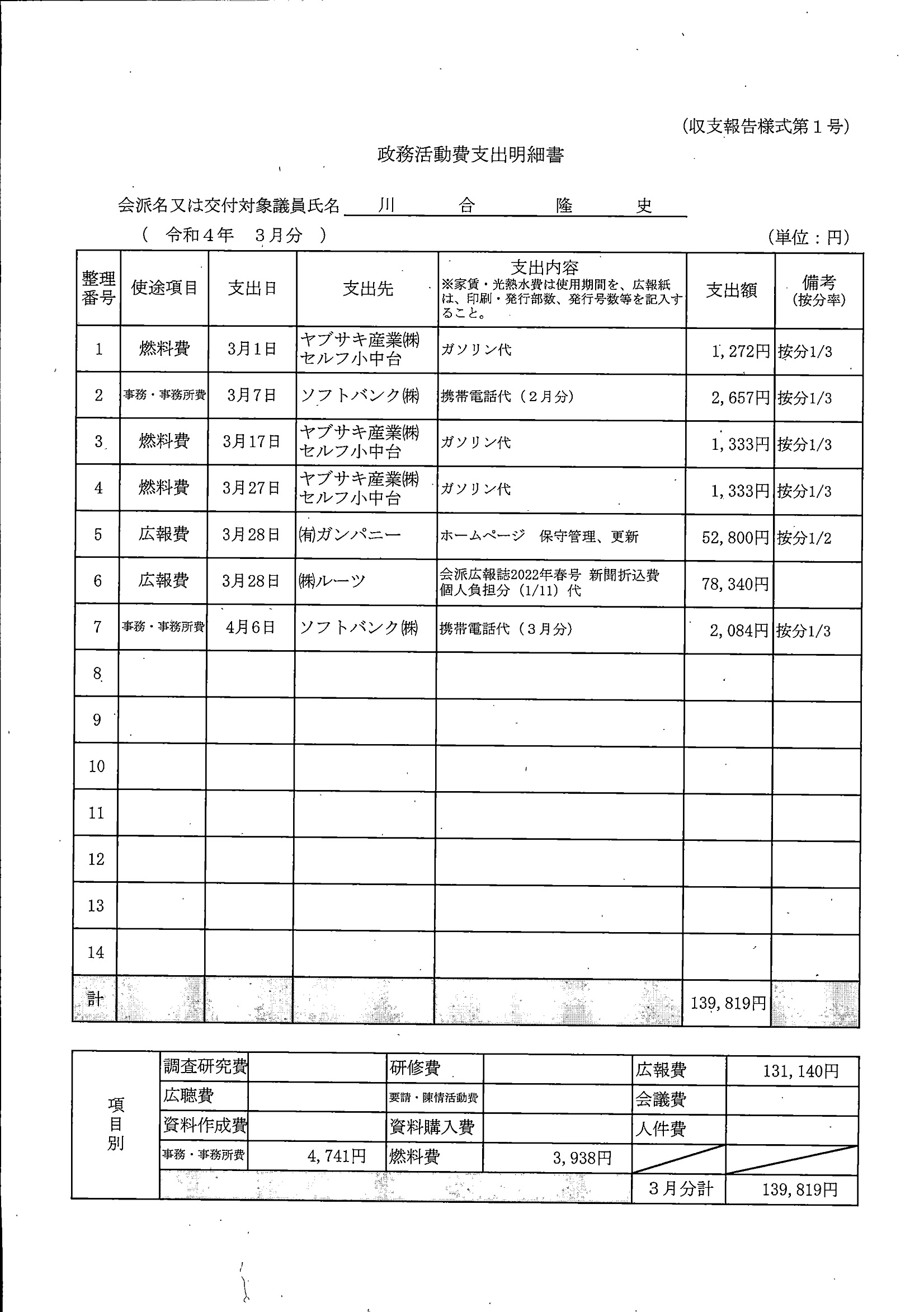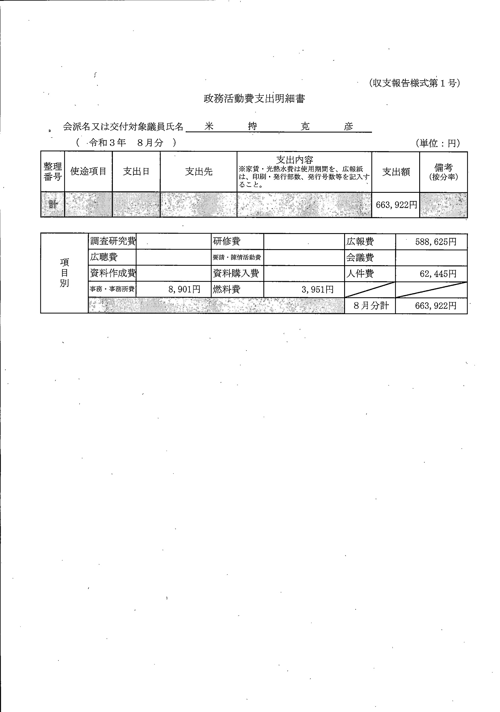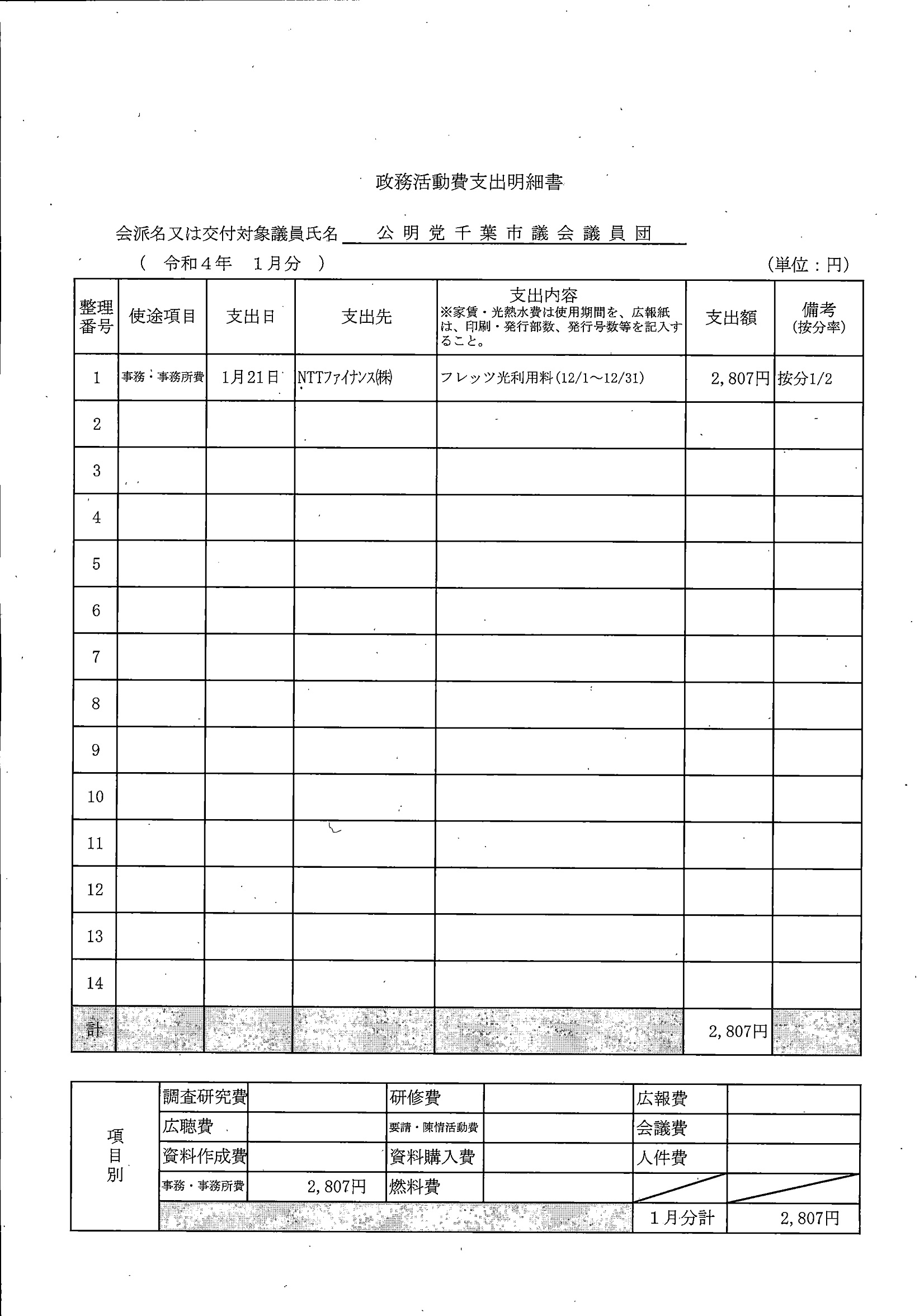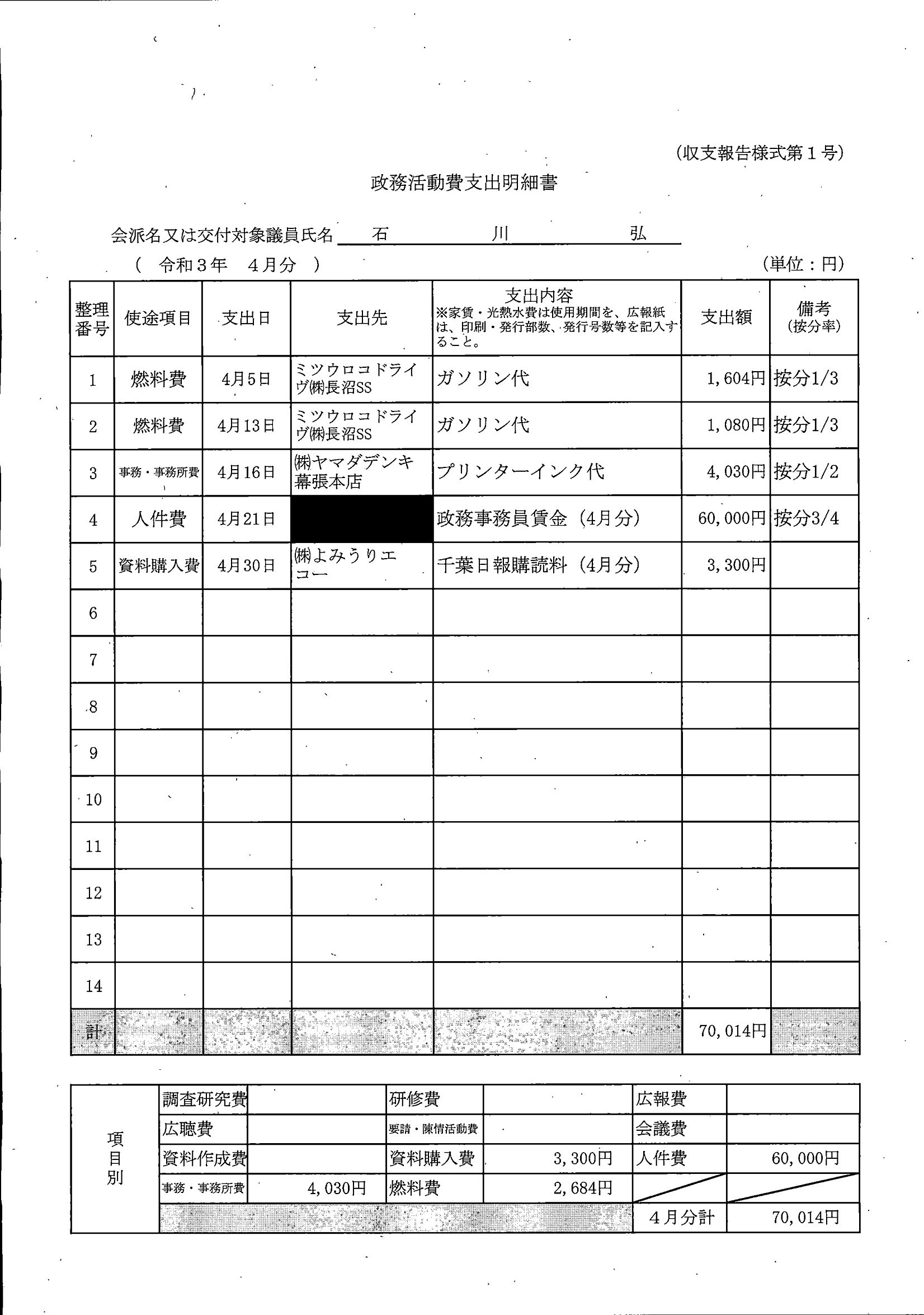 千葉市議会トップページ > 広報・情報公開 > 政務活動費 > 令和3年度交付分(政務活動費収支報告書)