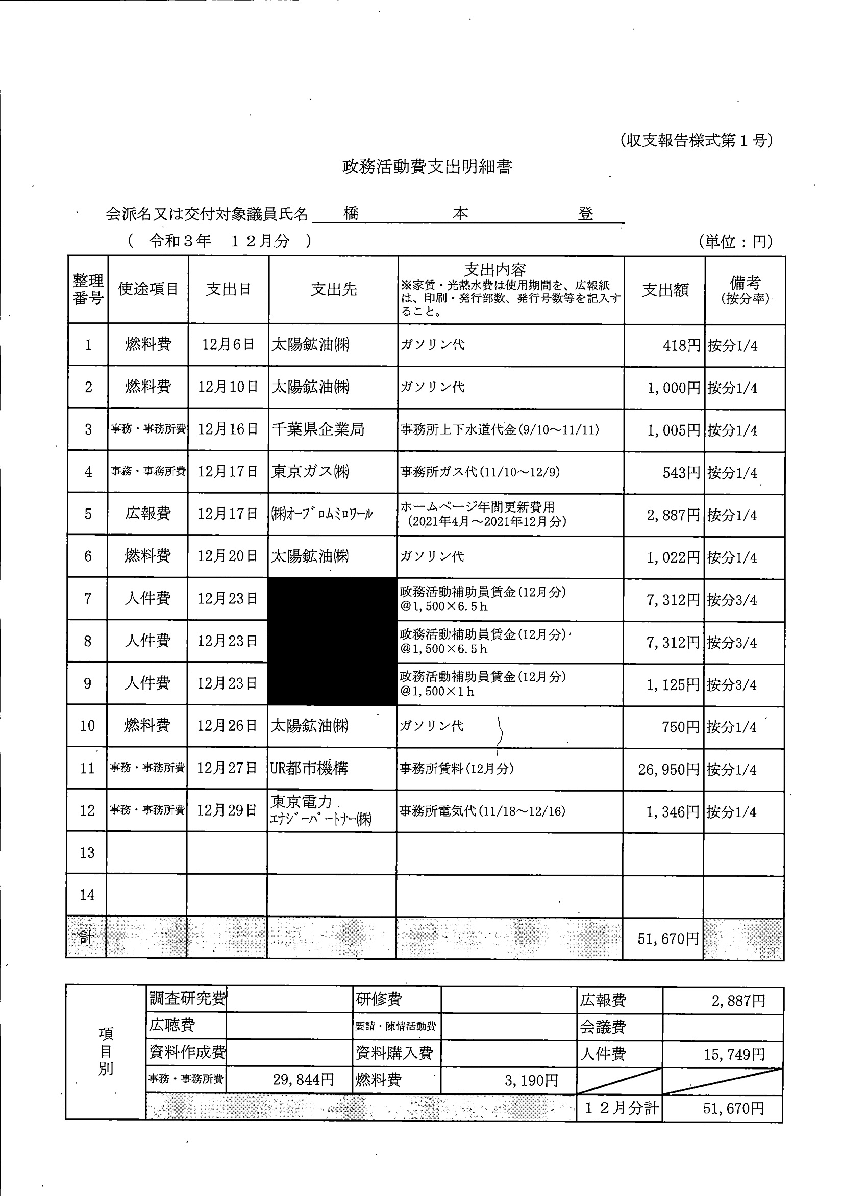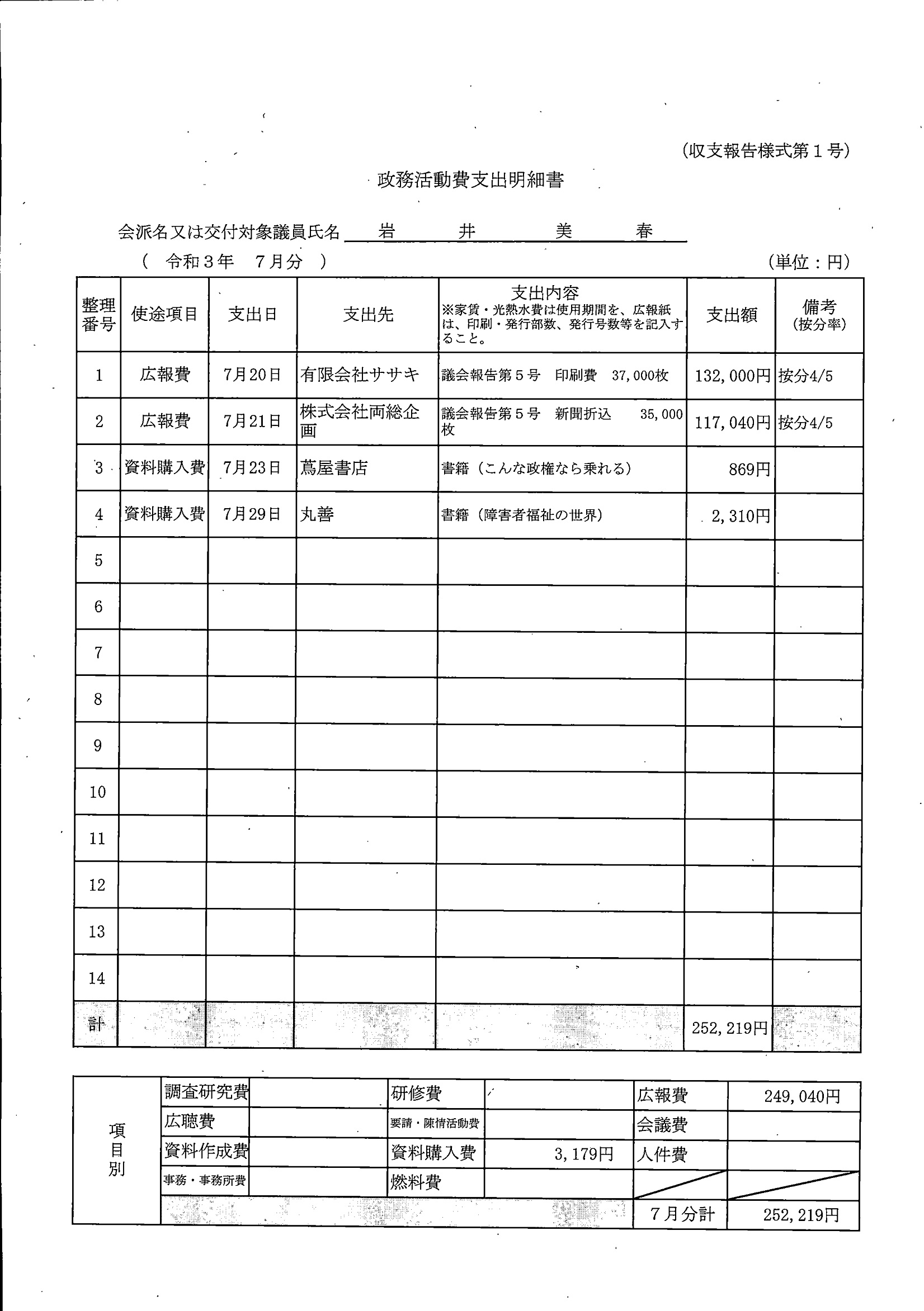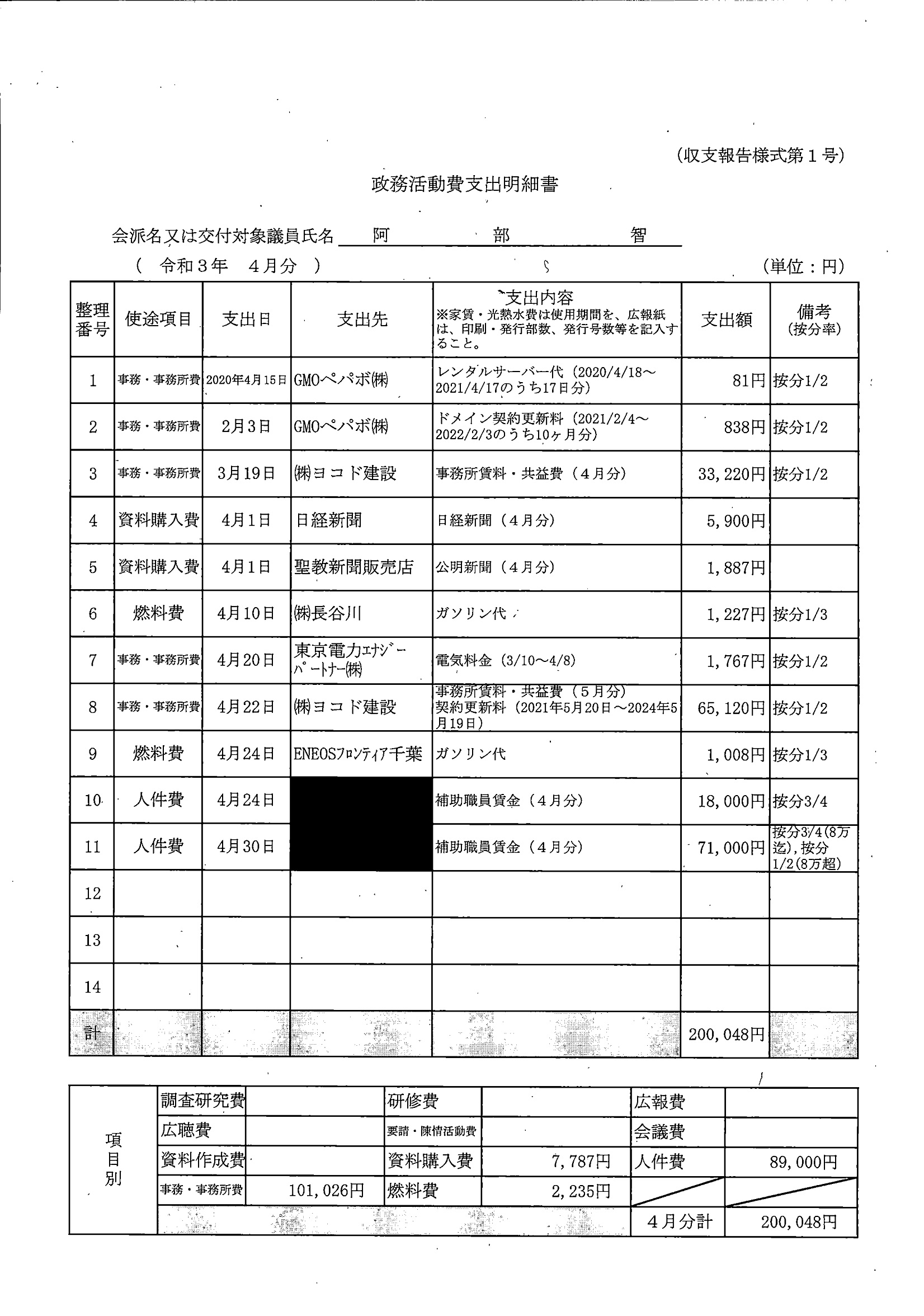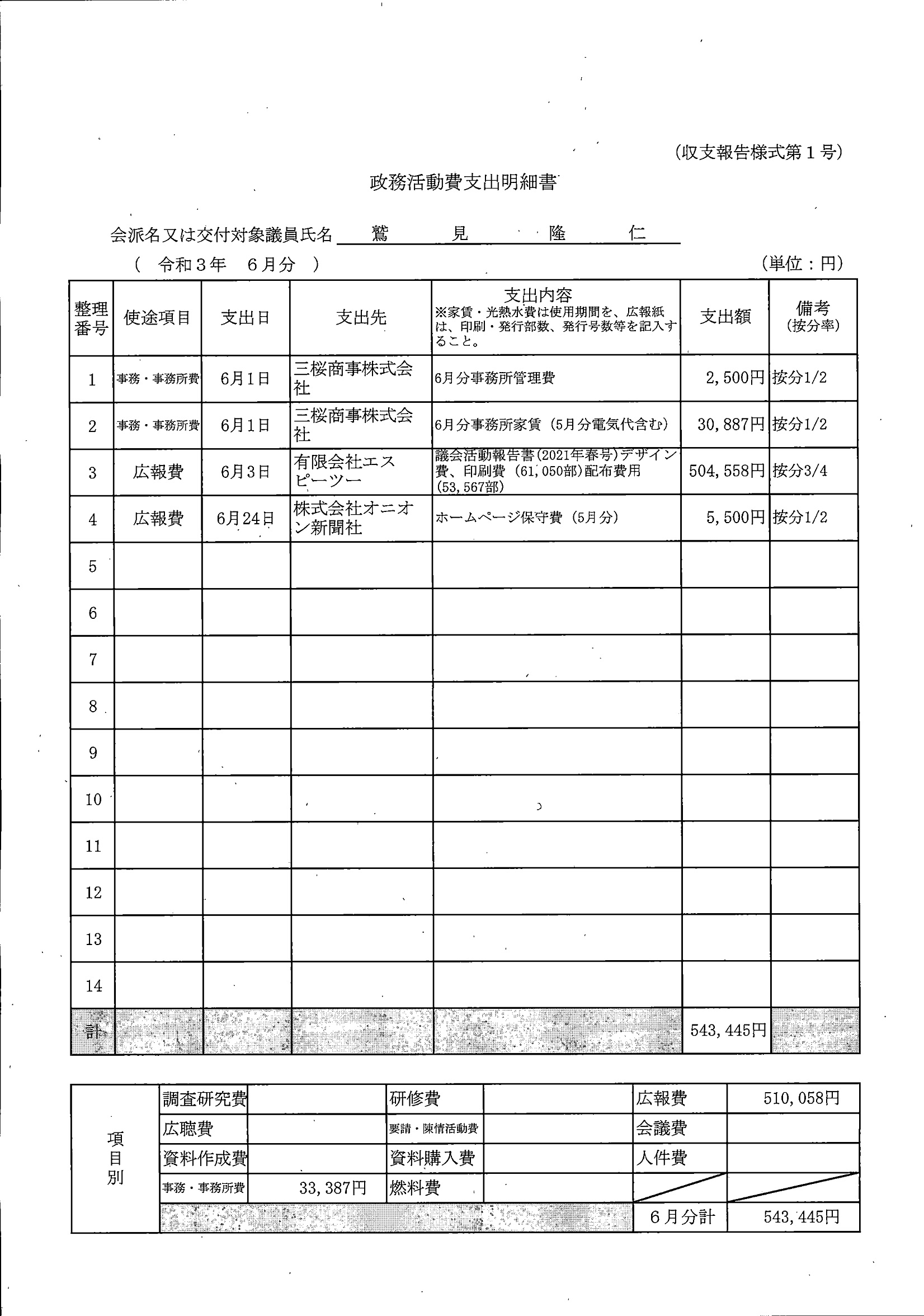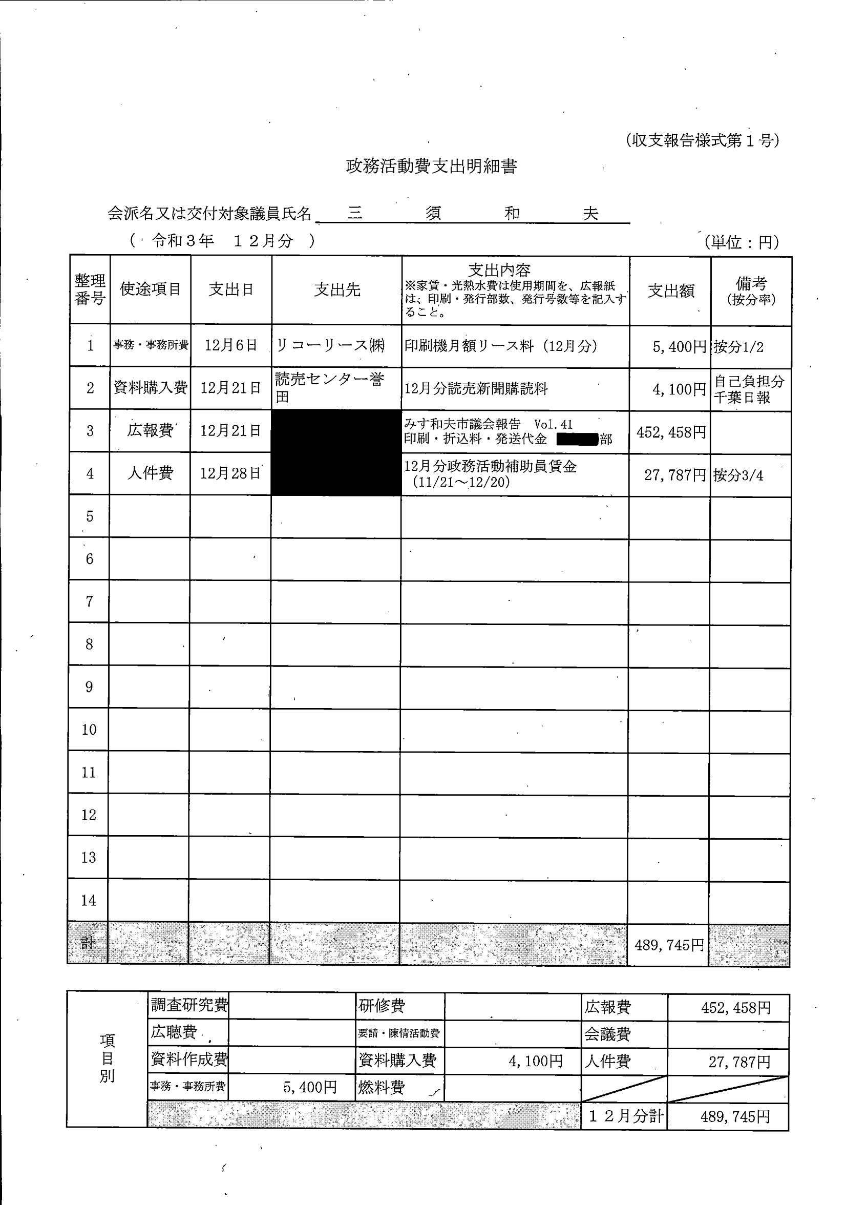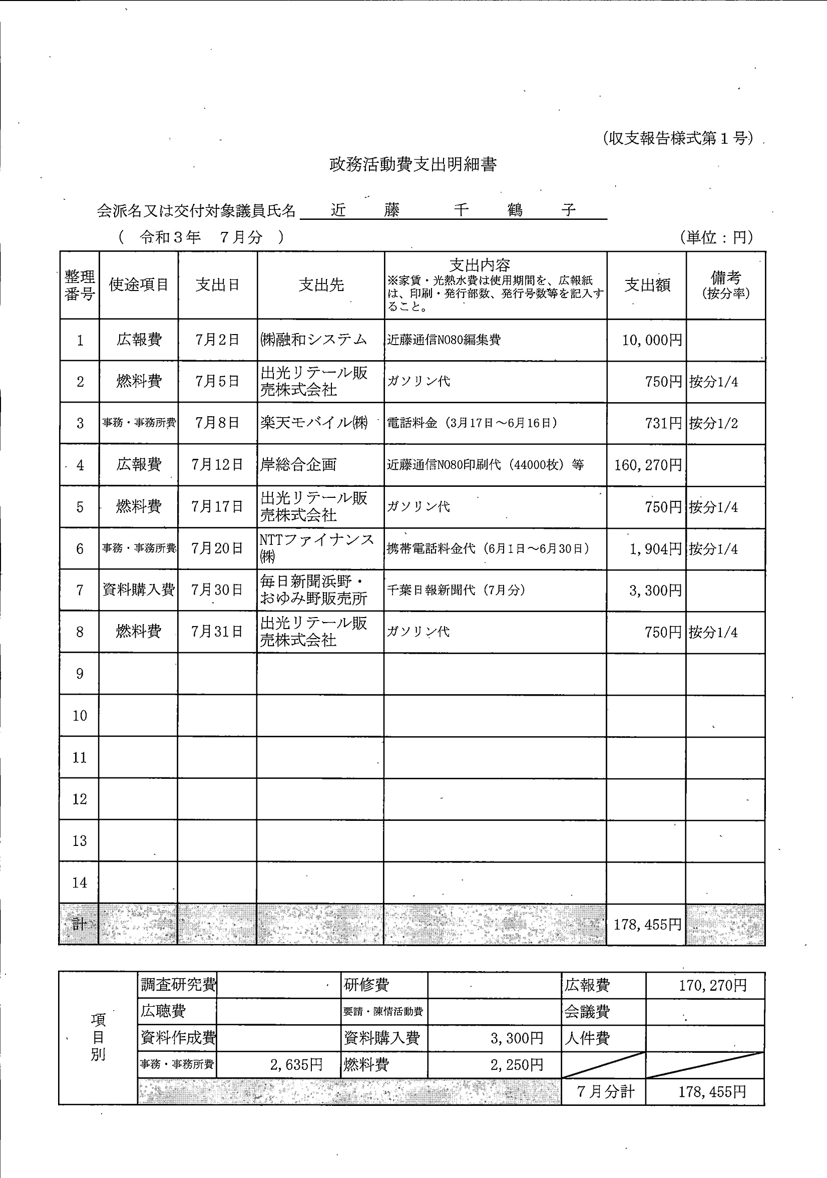 千葉市議会トップページ > 広報・情報公開 > 政務活動費 > 令和3年度交付分(政務活動費収支報告書)