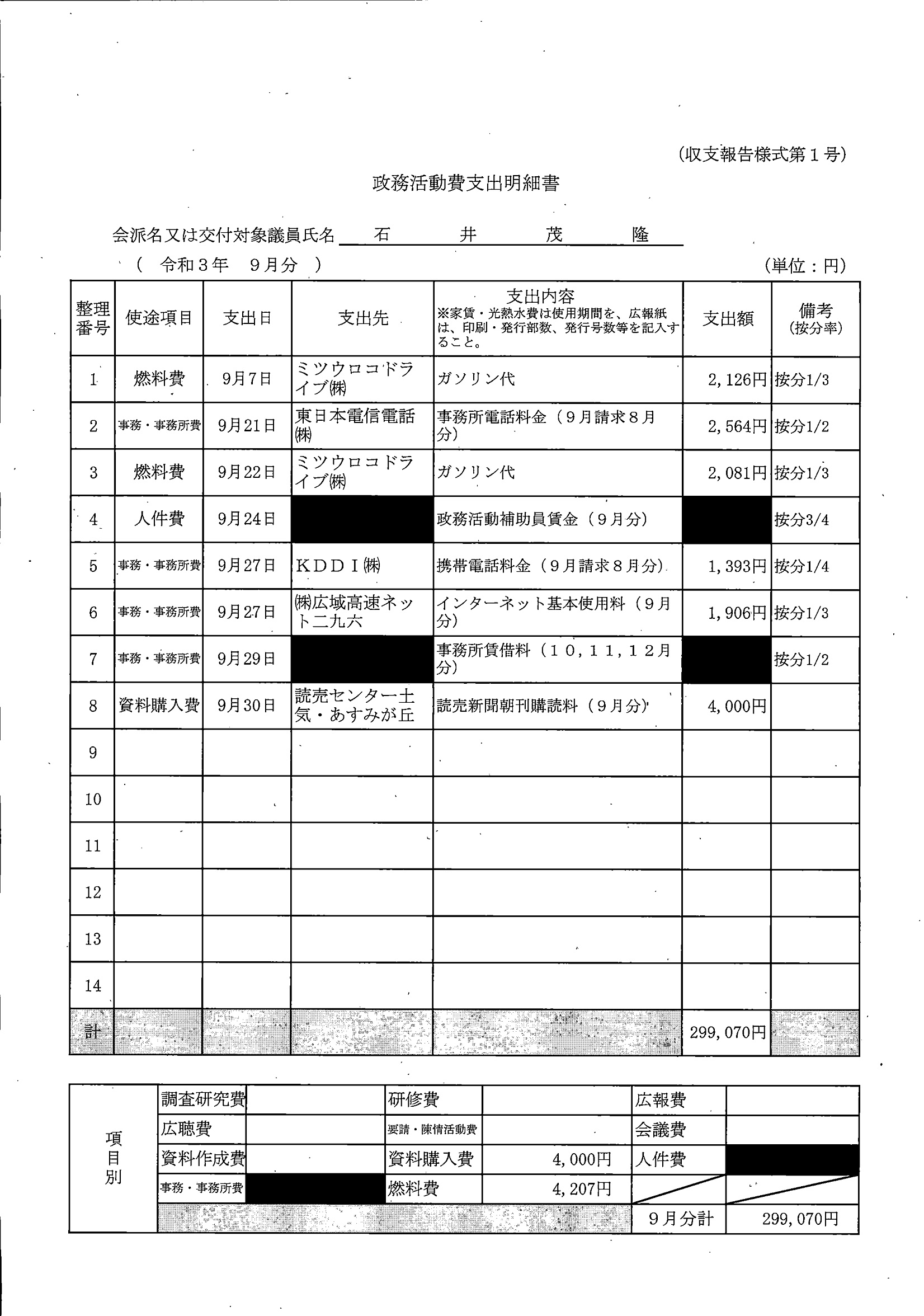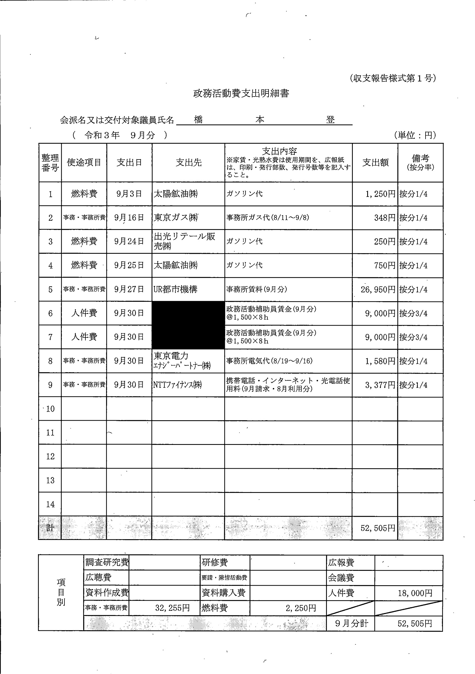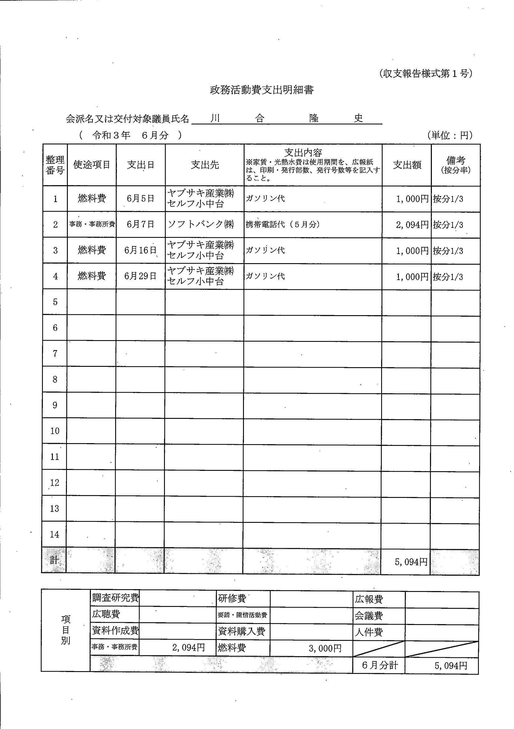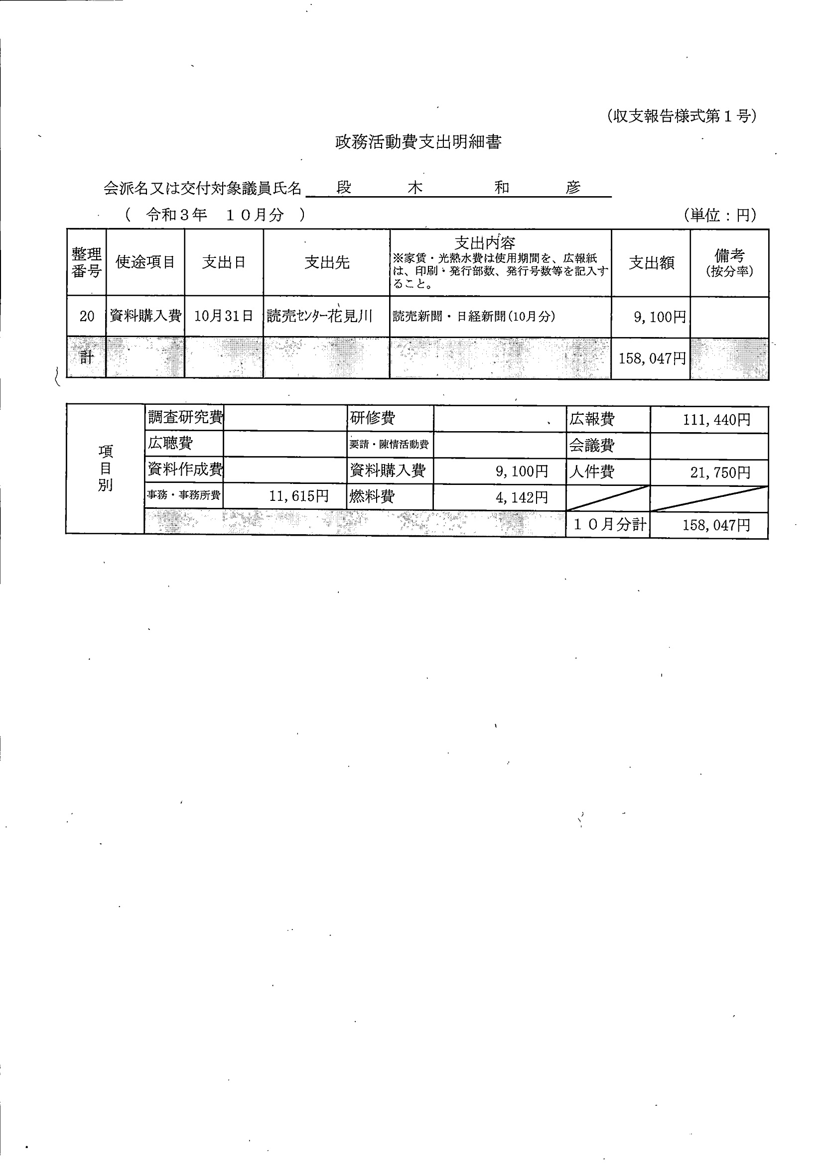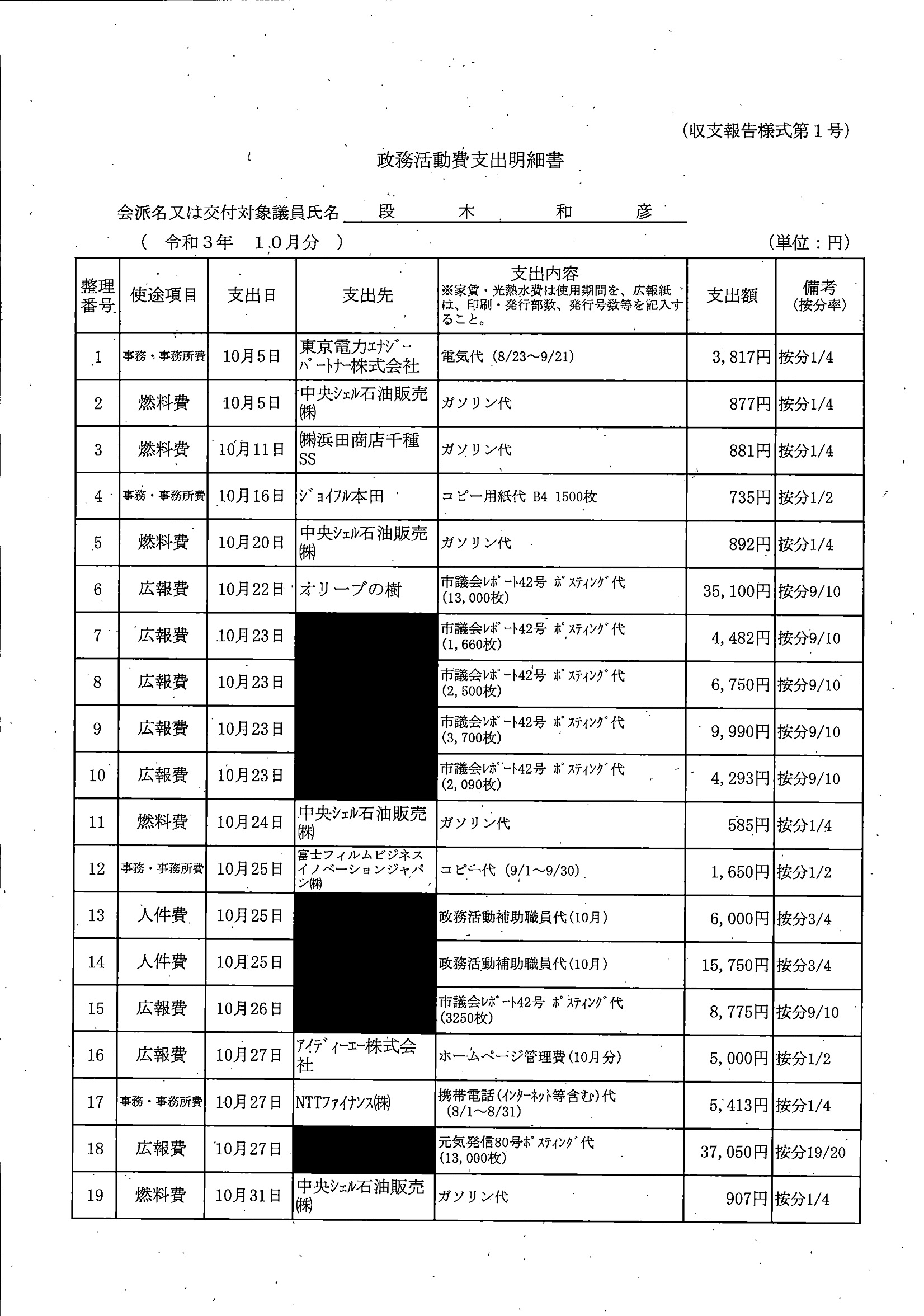 千葉市議会トップページ > 広報・情報公開 > 政務活動費 > 令和3年度交付分(政務活動費収支報告書)