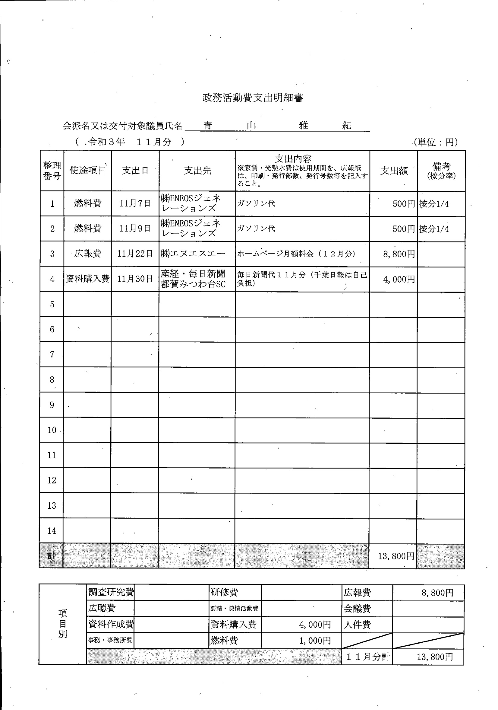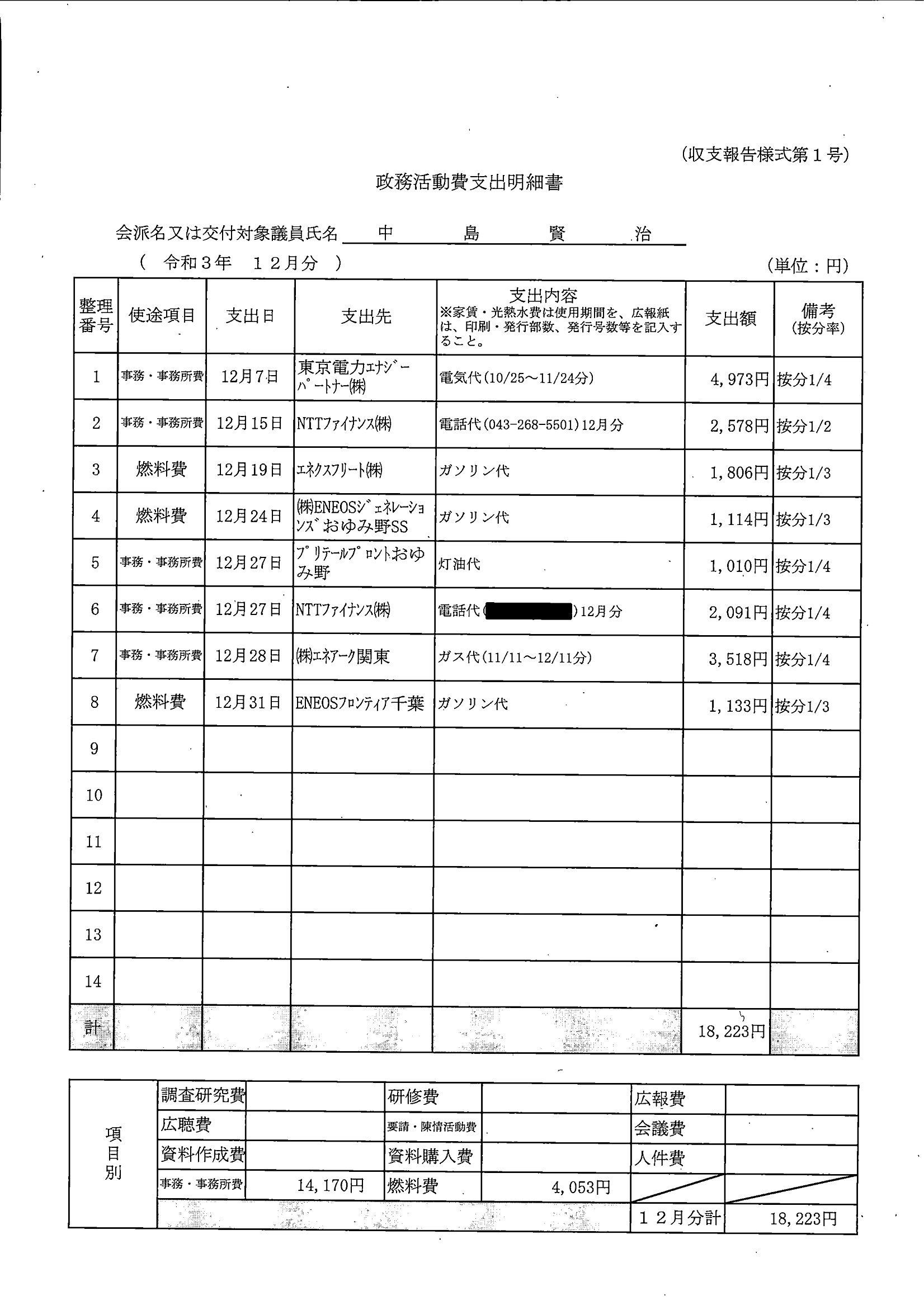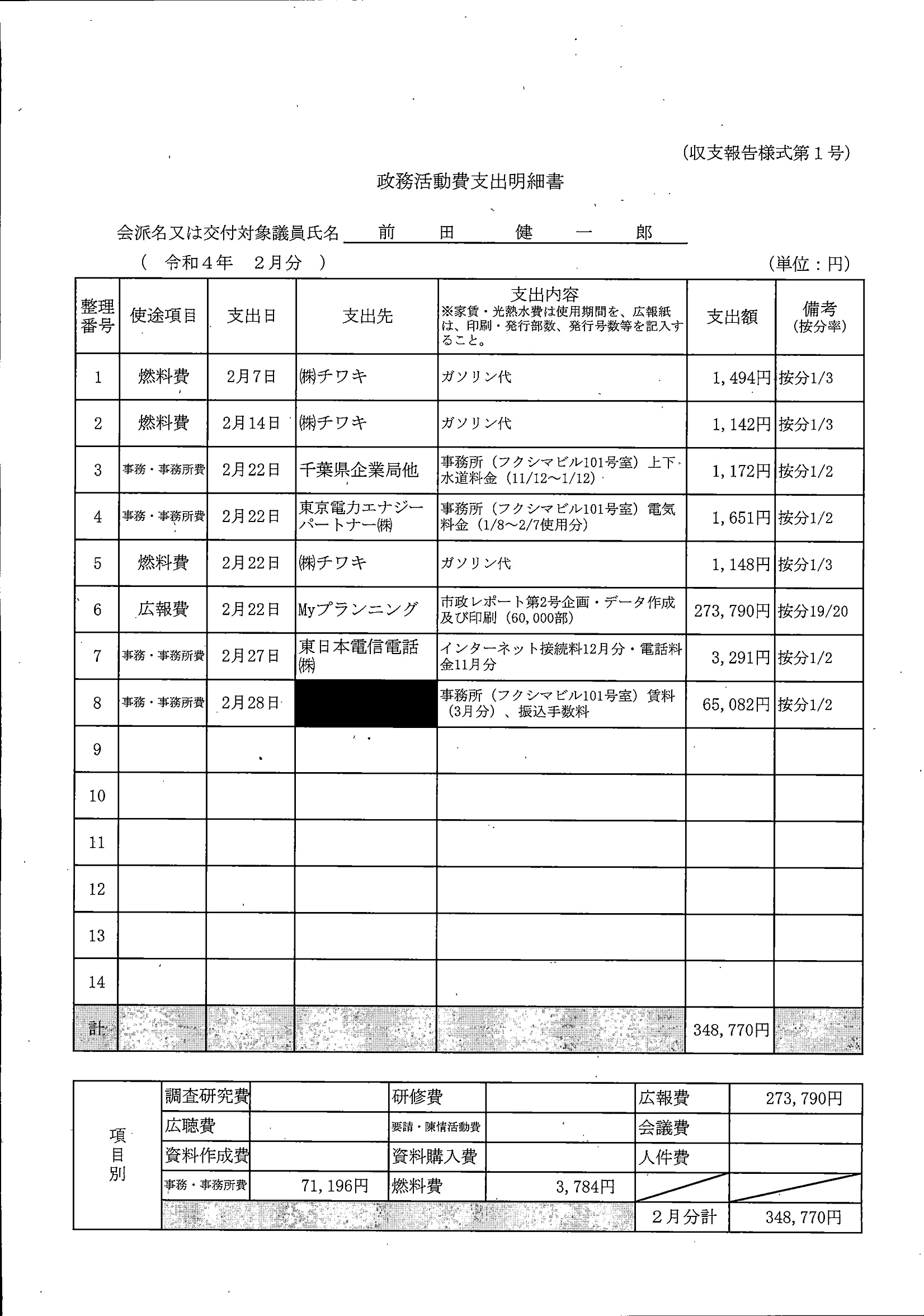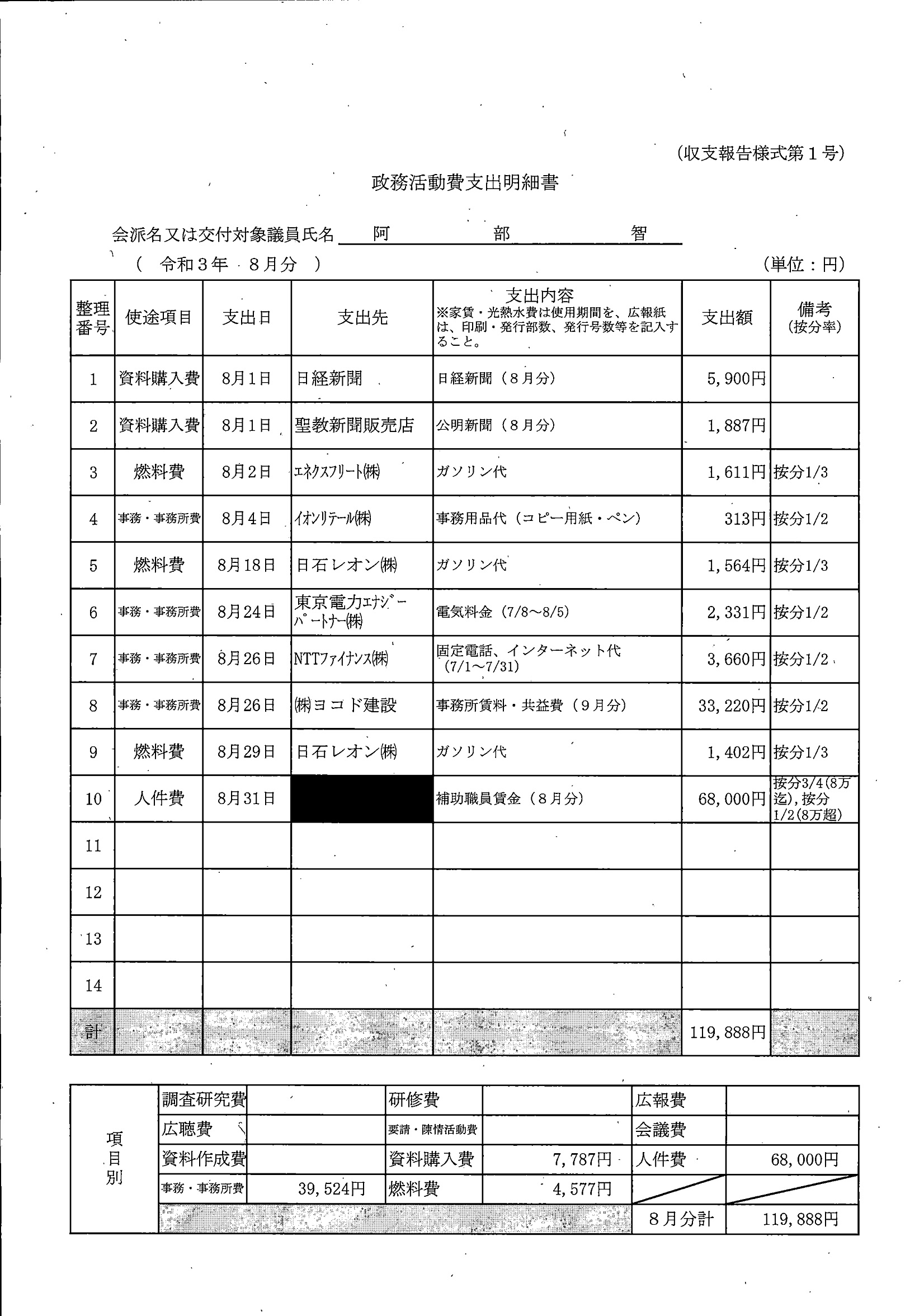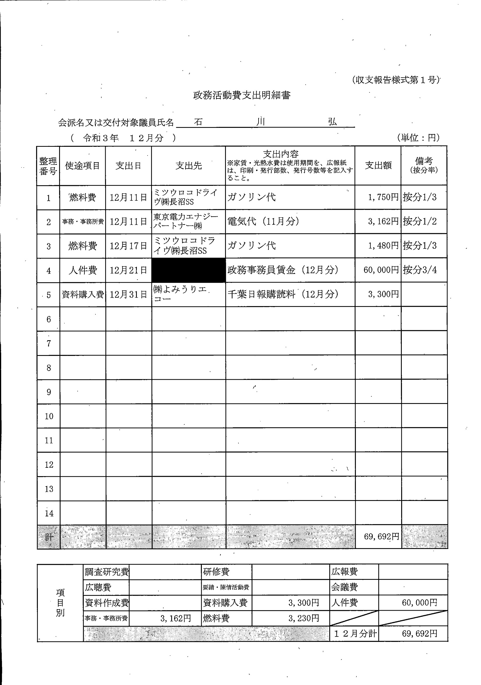 千葉市議会トップページ > 広報・情報公開 > 政務活動費 > 令和3年度交付分(政務活動費収支報告書)