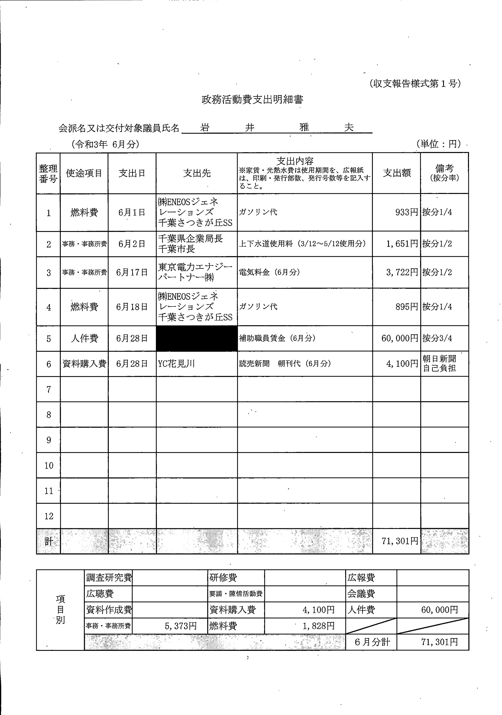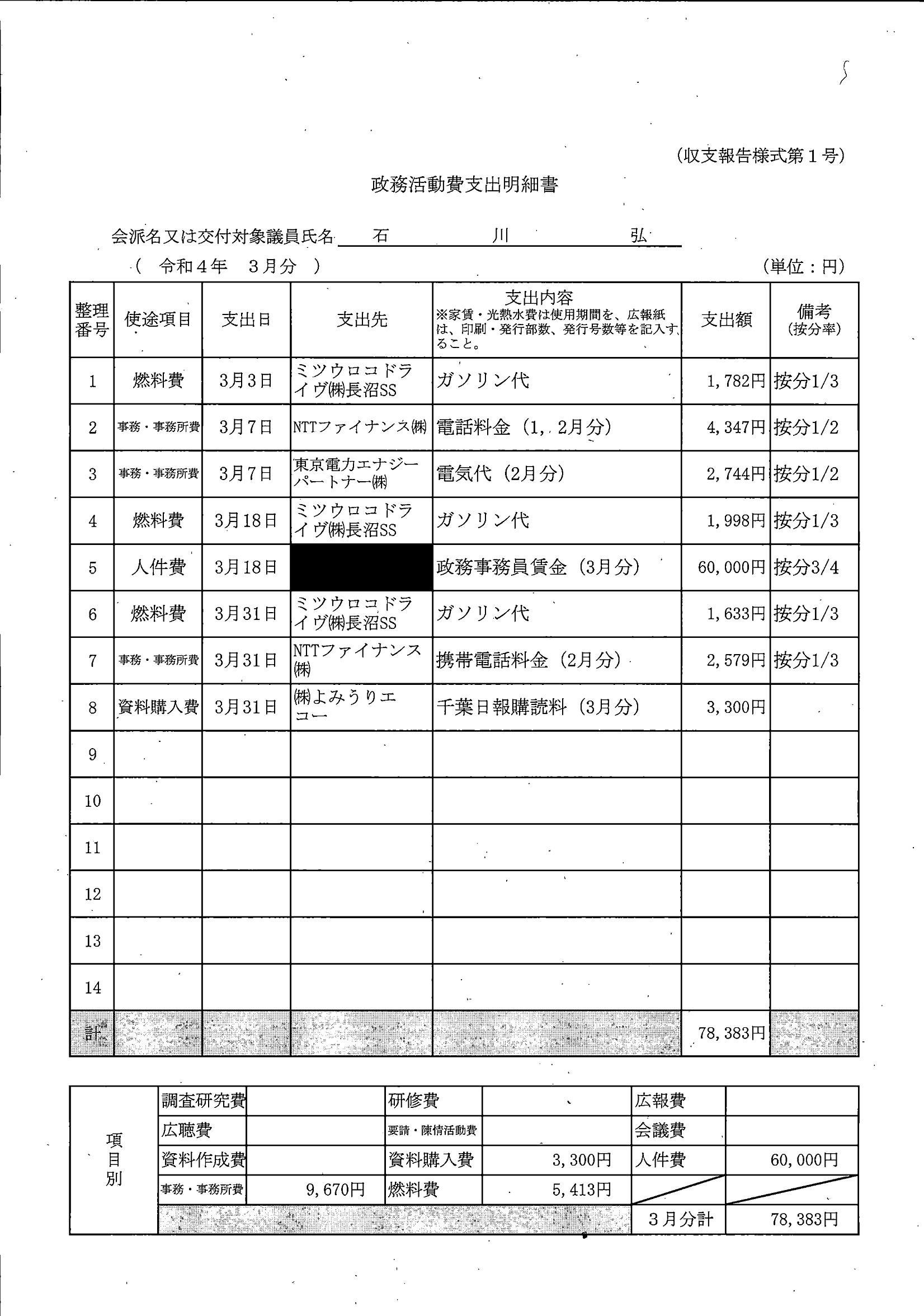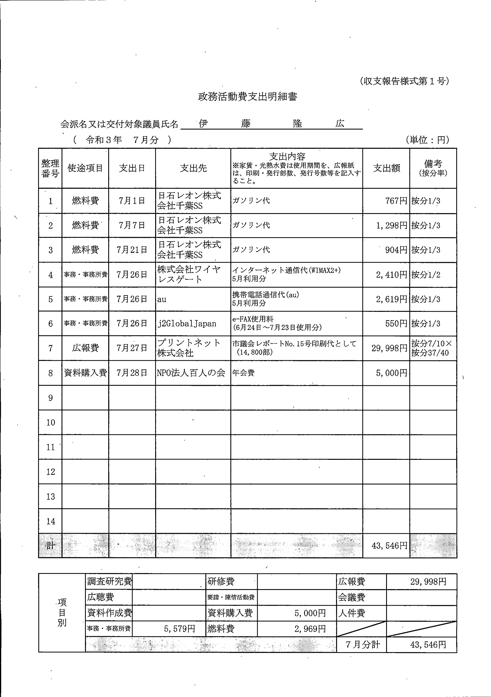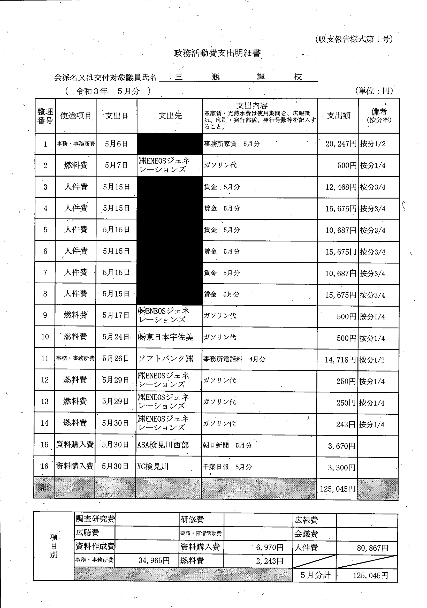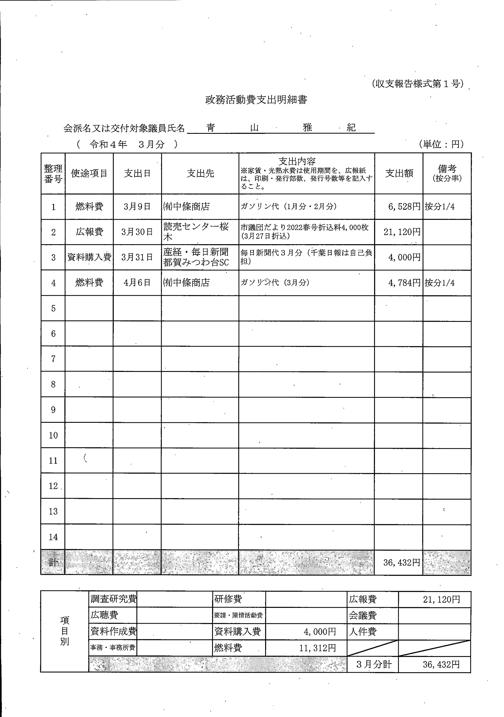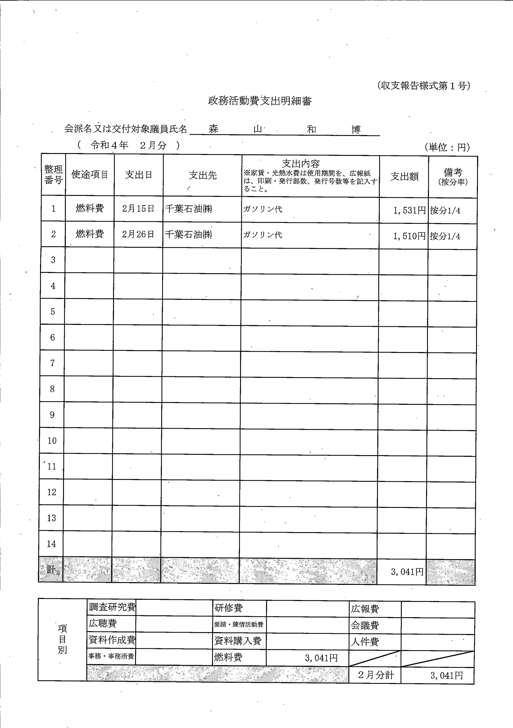 千葉市議会トップページ > 広報・情報公開 > 政務活動費 > 令和3年度交付分(政務活動費収支報告書)