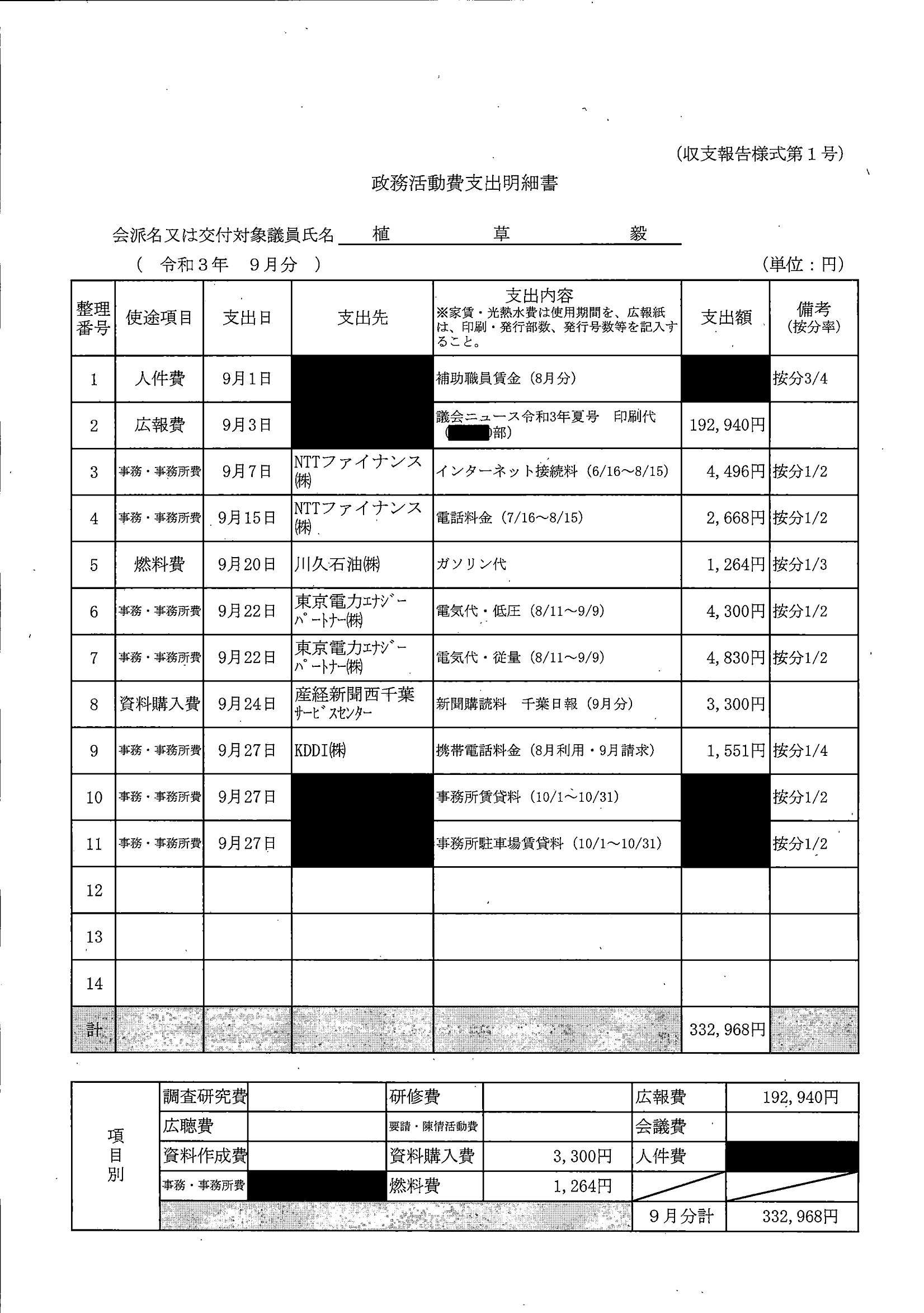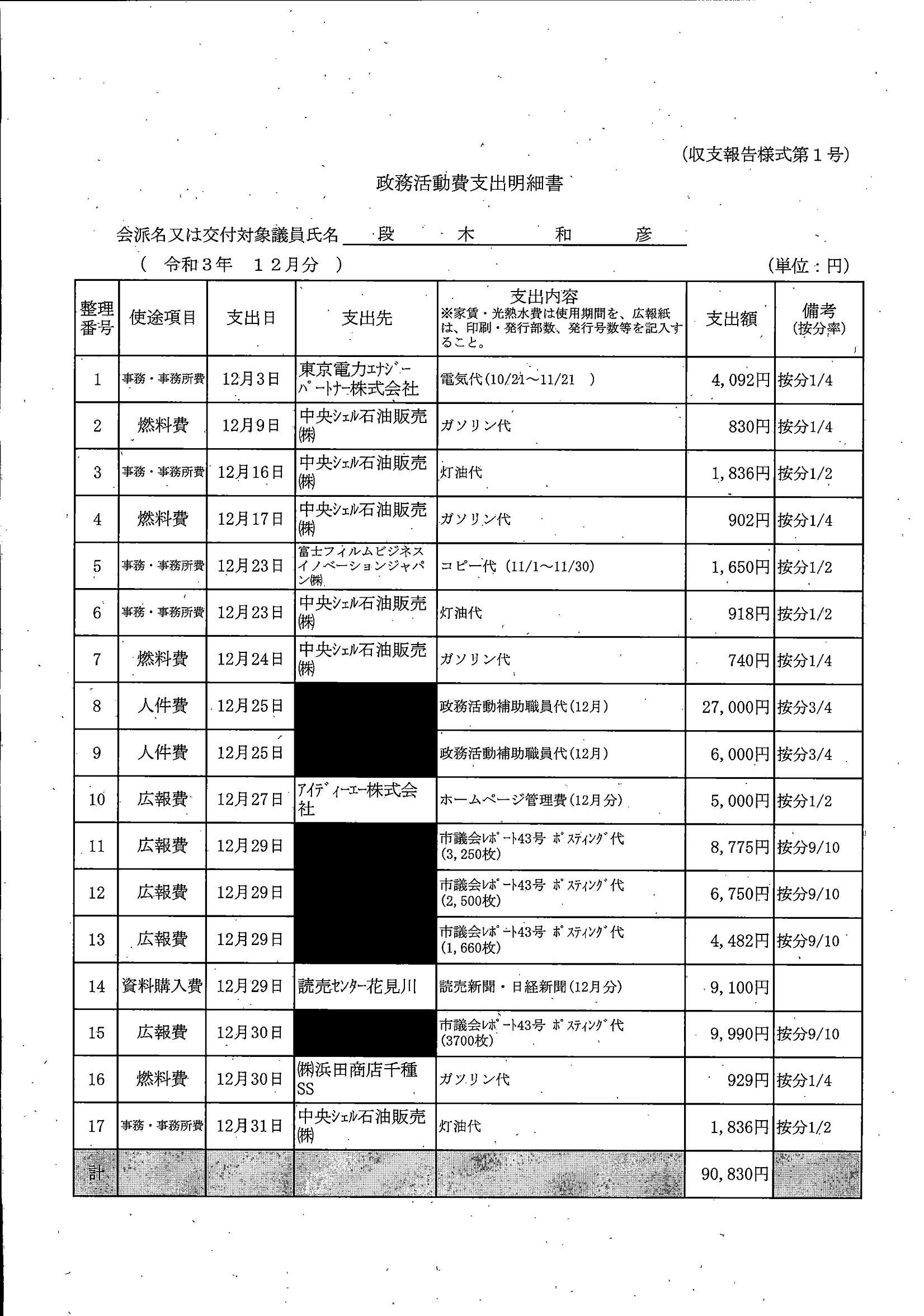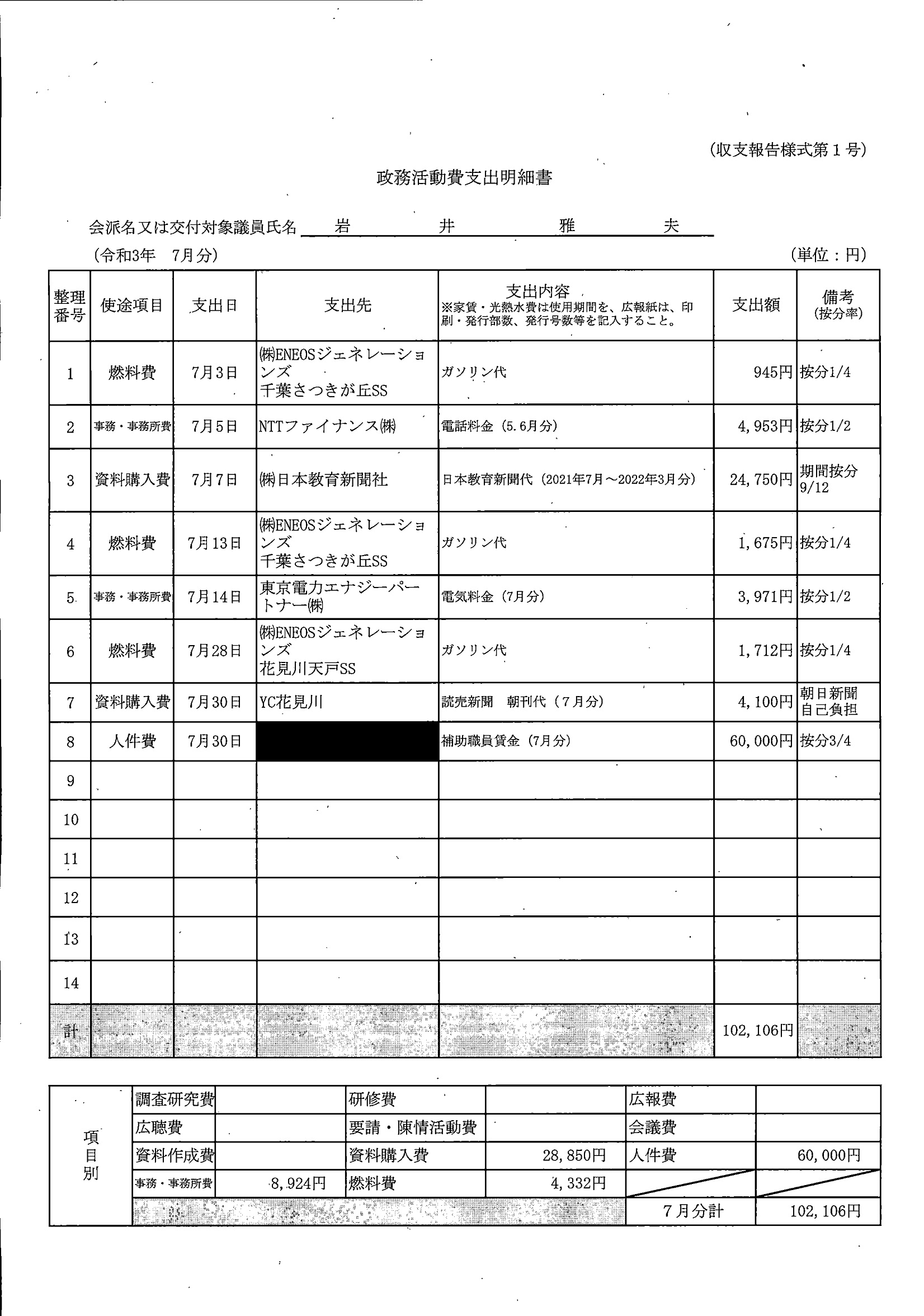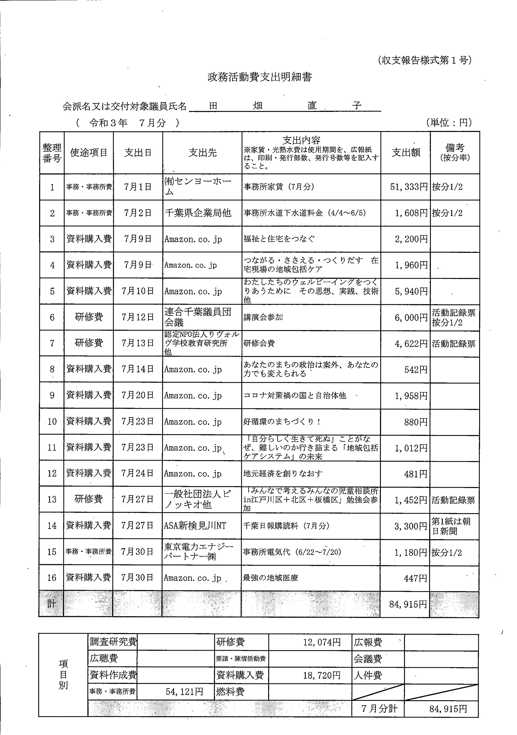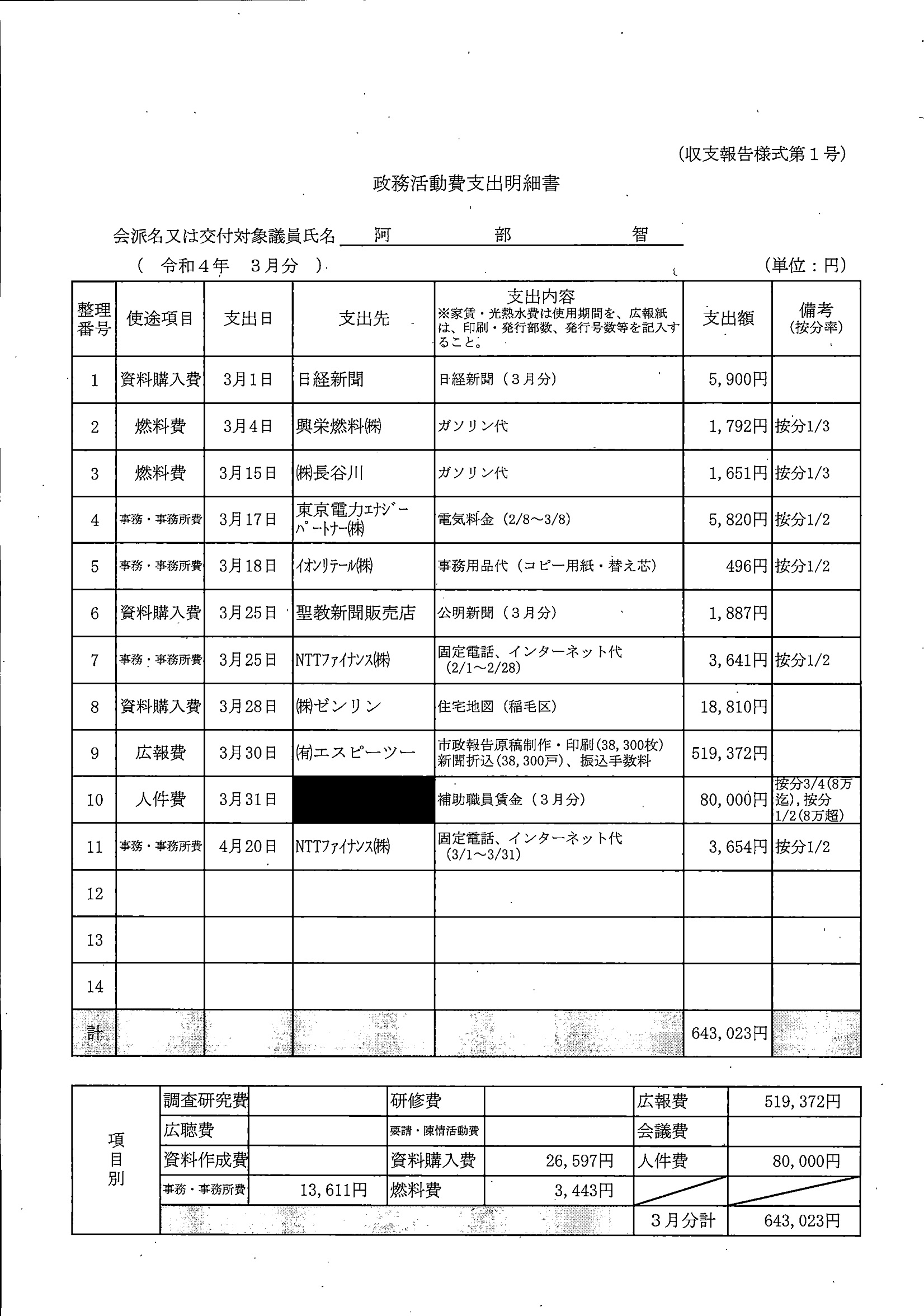 千葉市議会トップページ > 広報・情報公開 > 政務活動費 > 令和3年度交付分(政務活動費収支報告書)