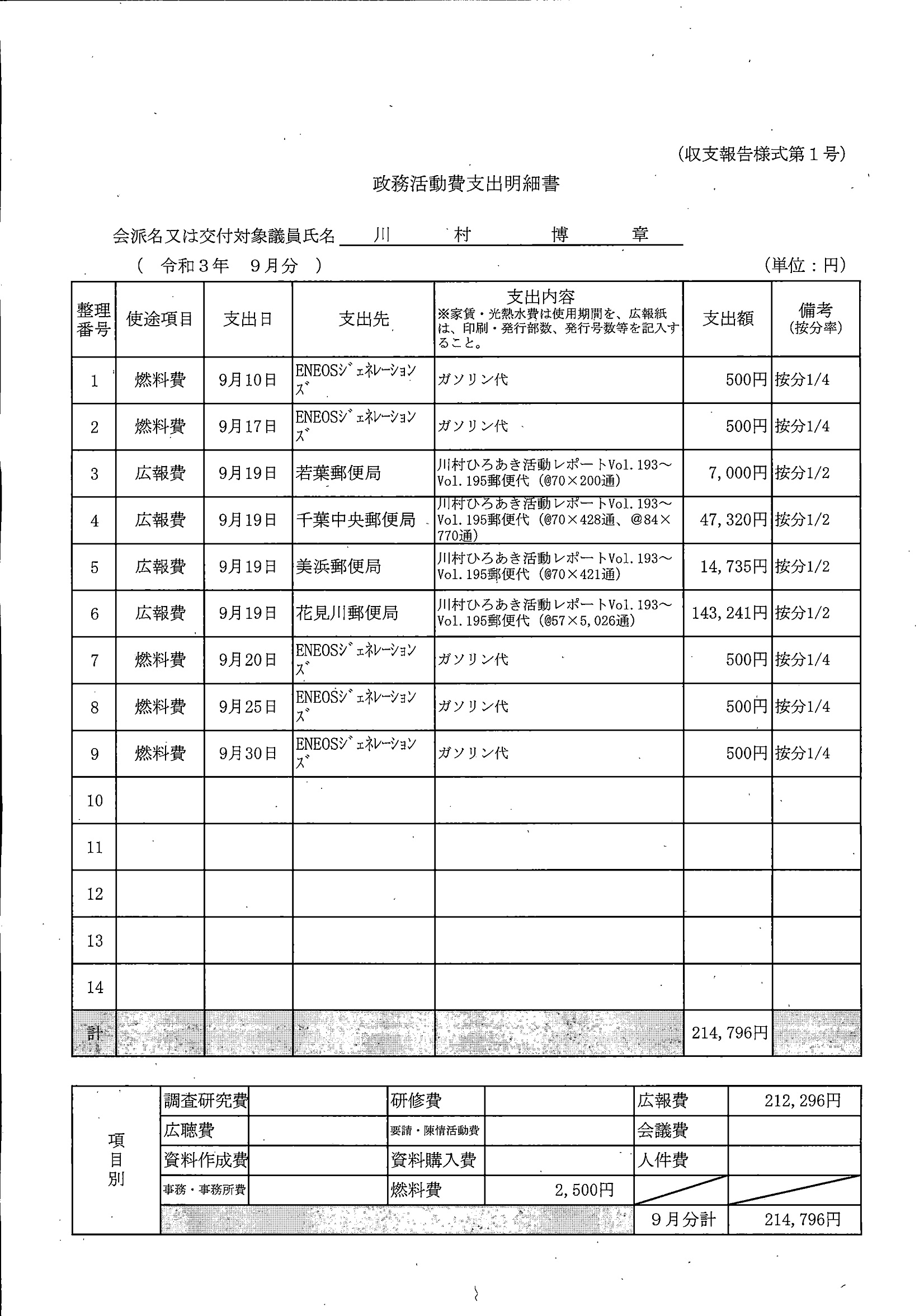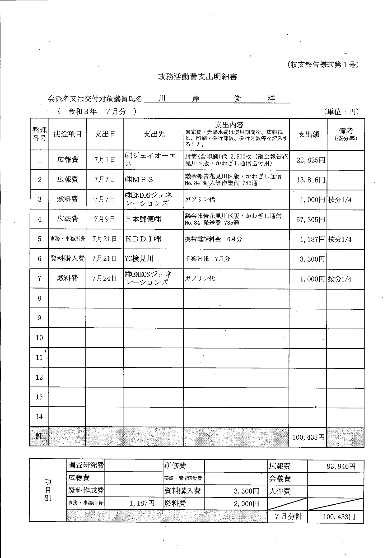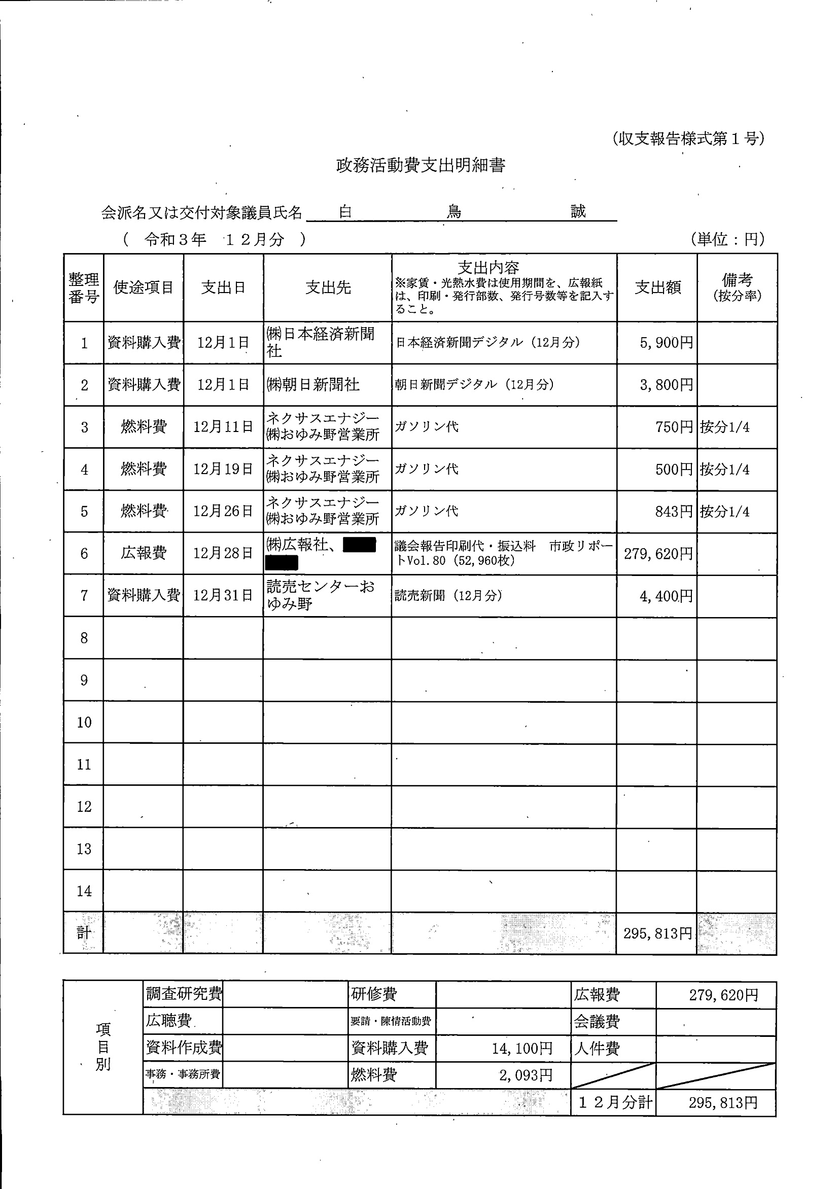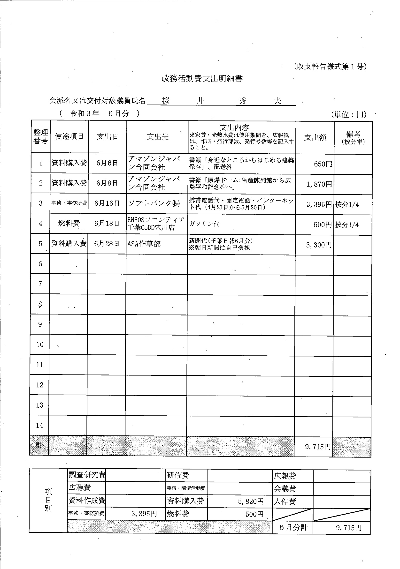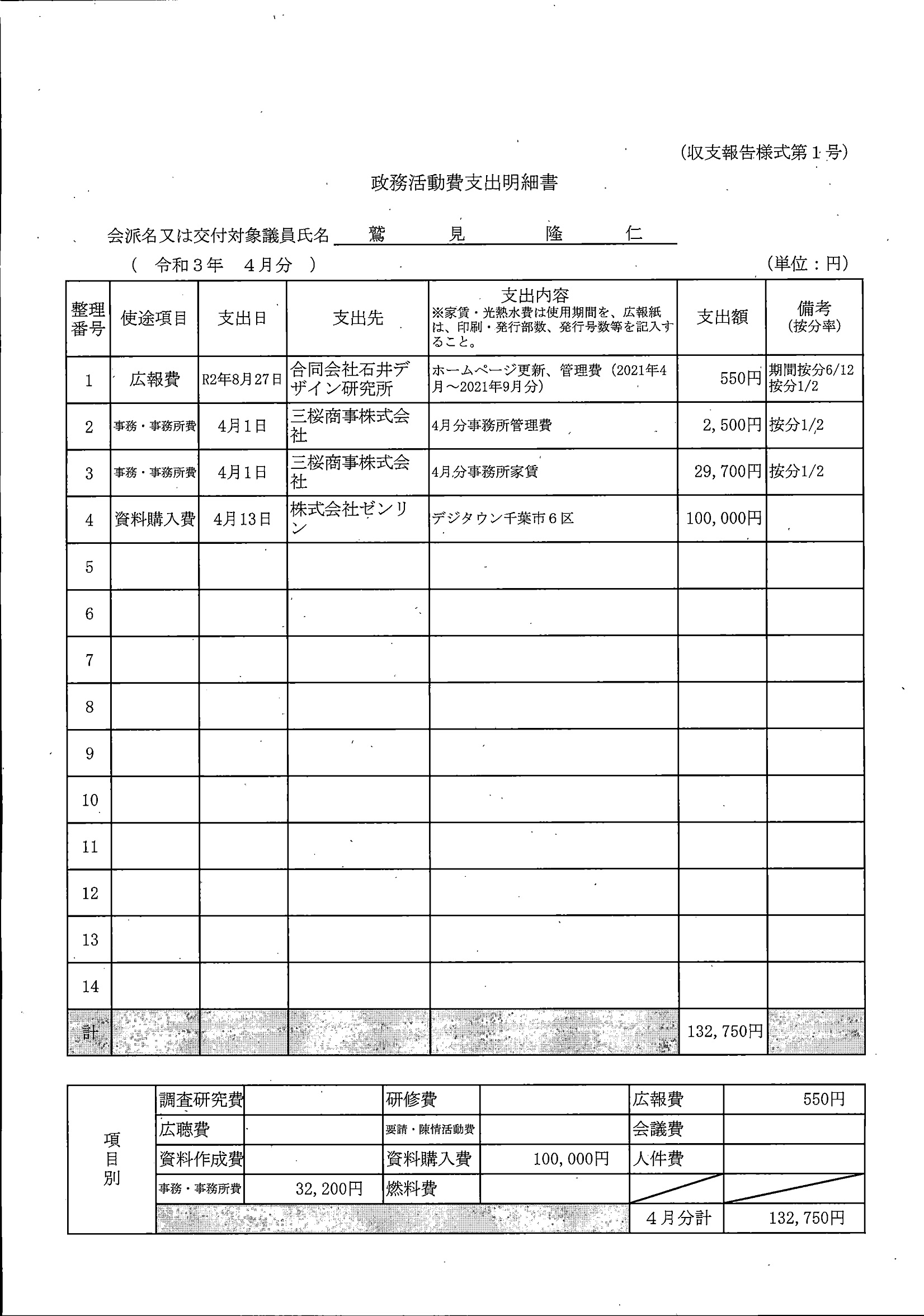千葉市議会トップページ > 広報・情報公開 > 政務活動費 > 令和3年度交付分(政務活動費収支報告書)