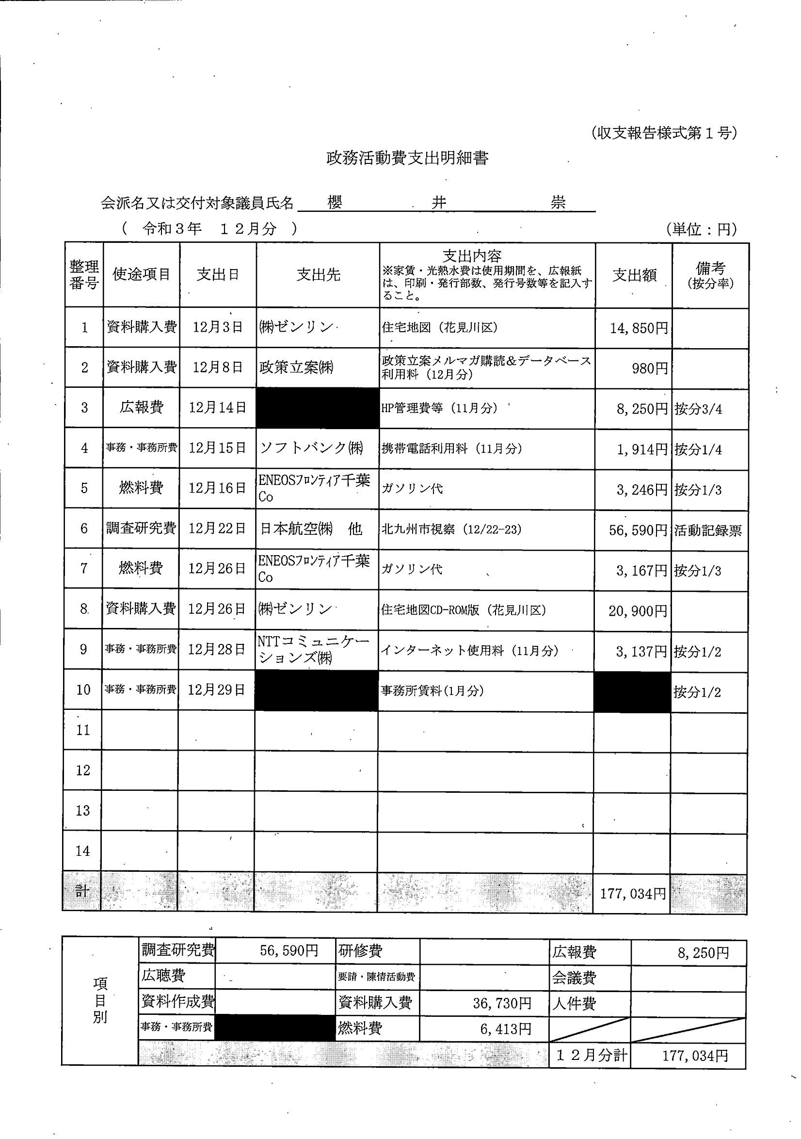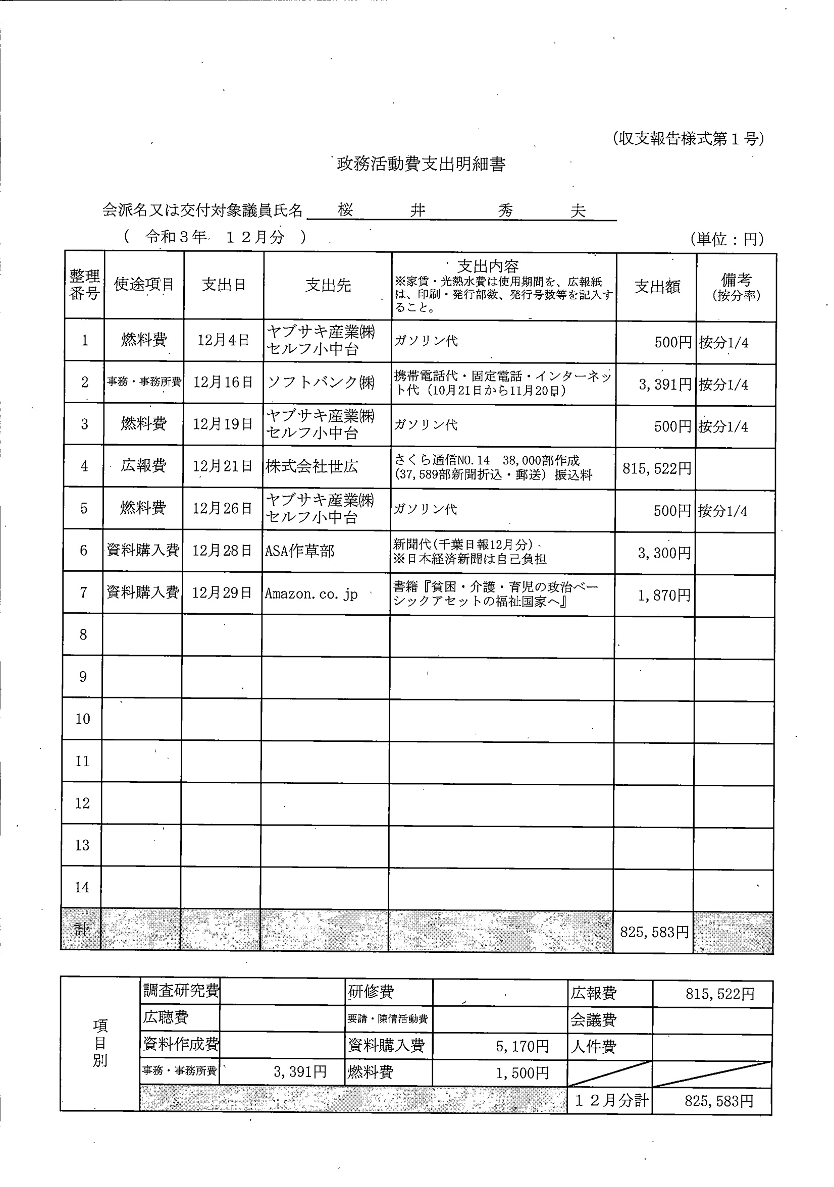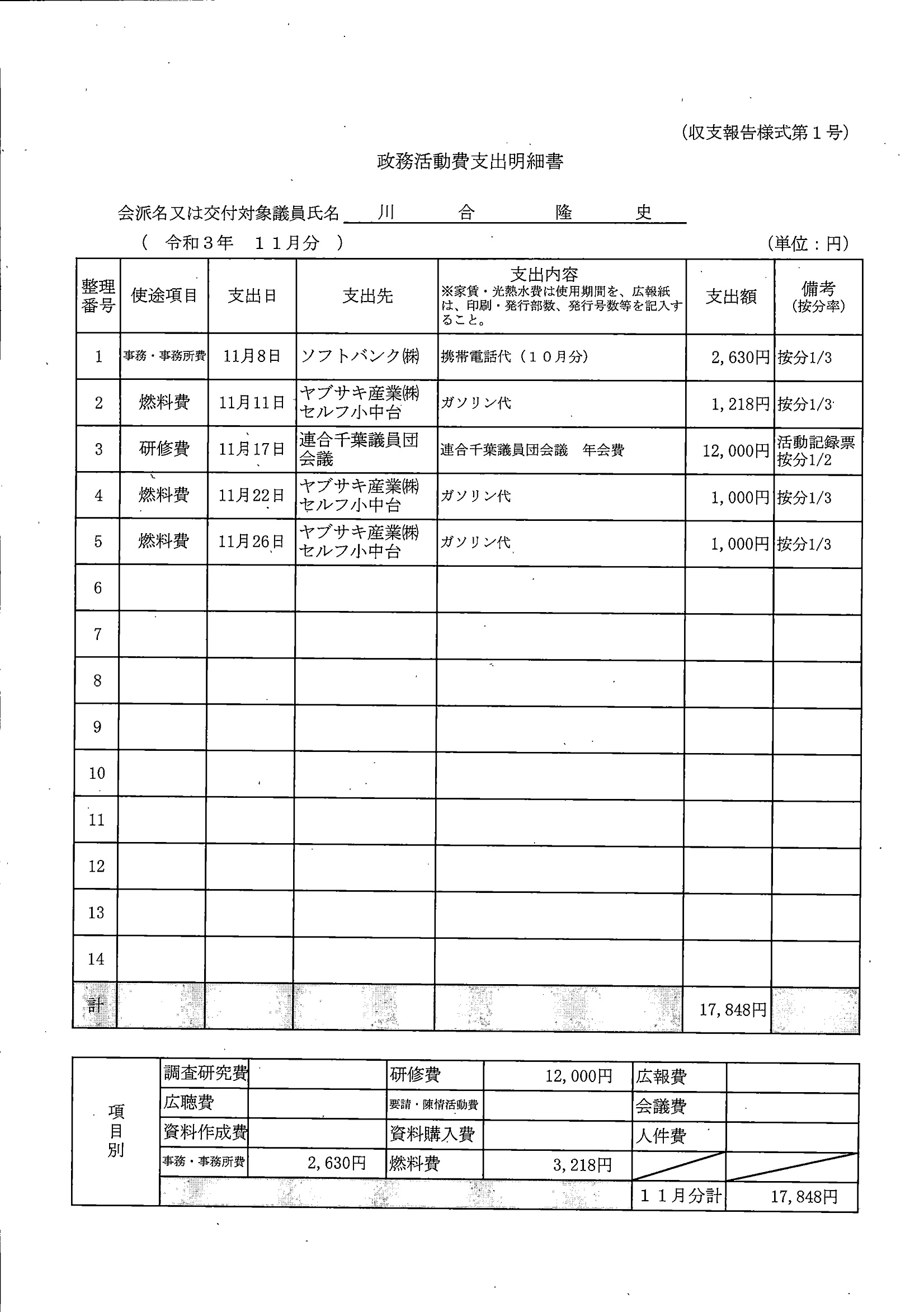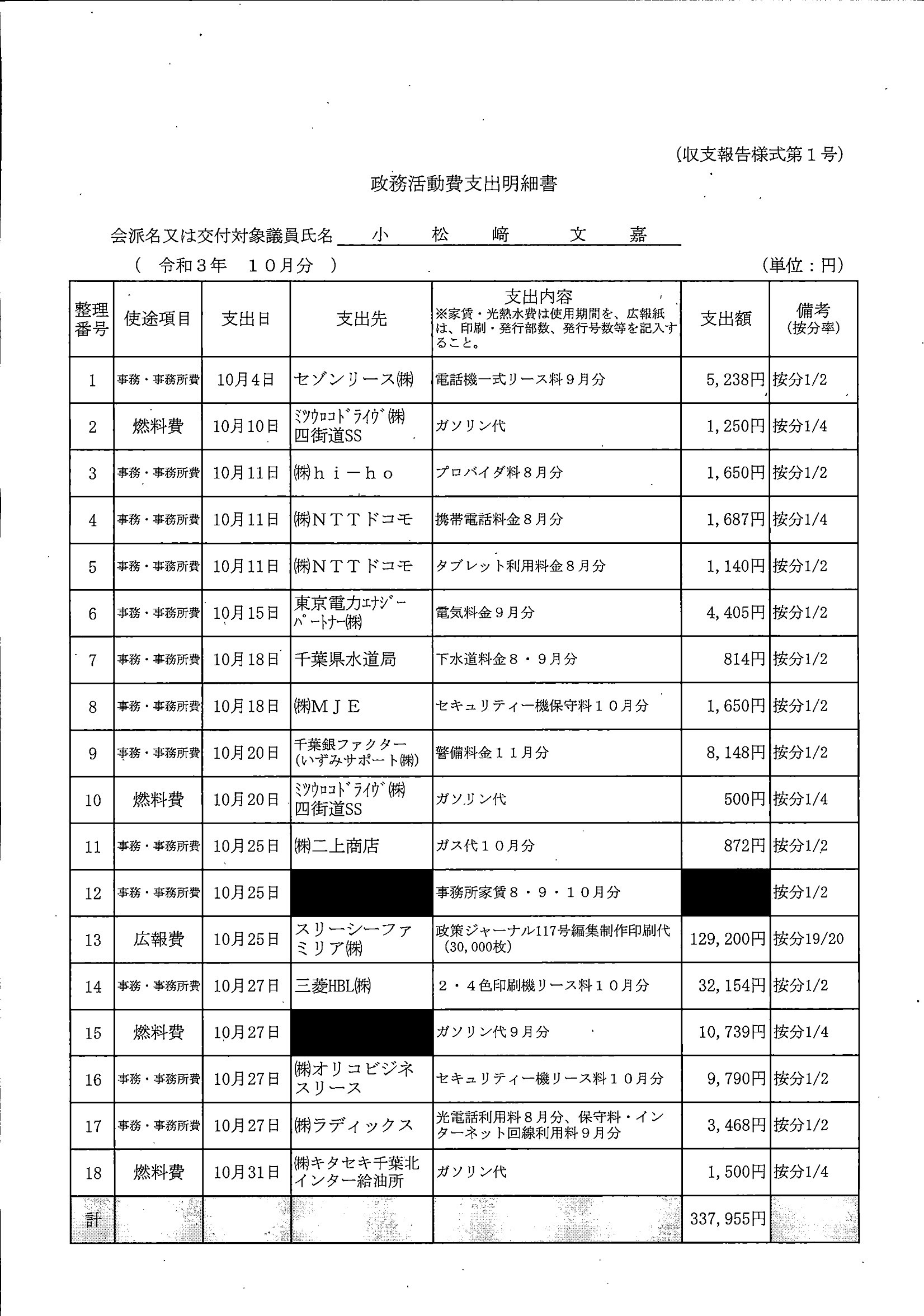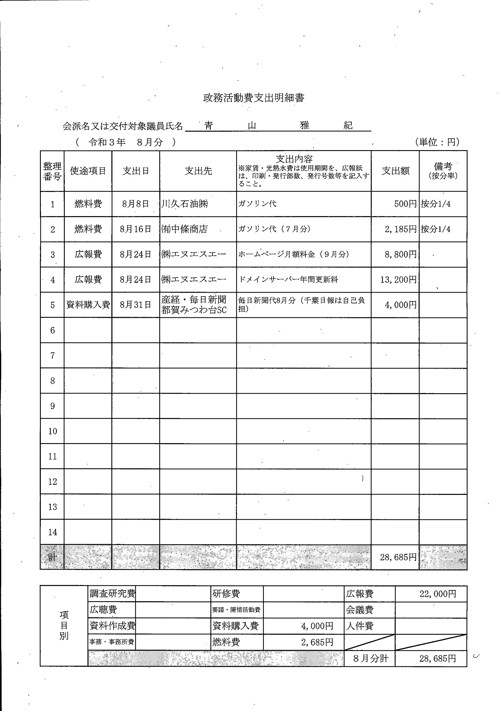 千葉市議会トップページ > 広報・情報公開 > 政務活動費 > 令和3年度交付分(政務活動費収支報告書)