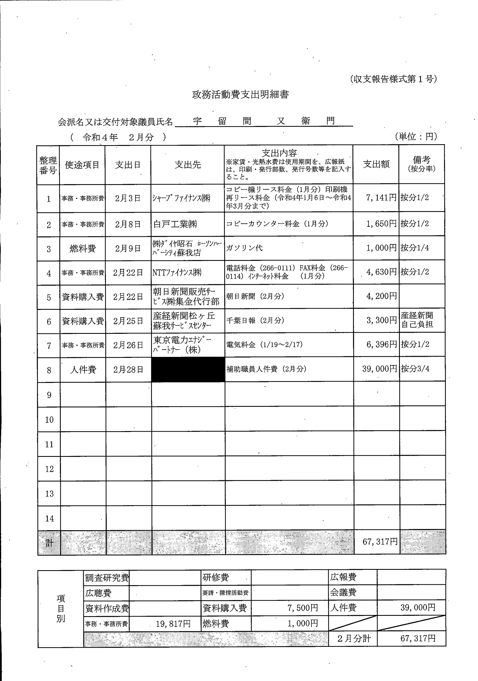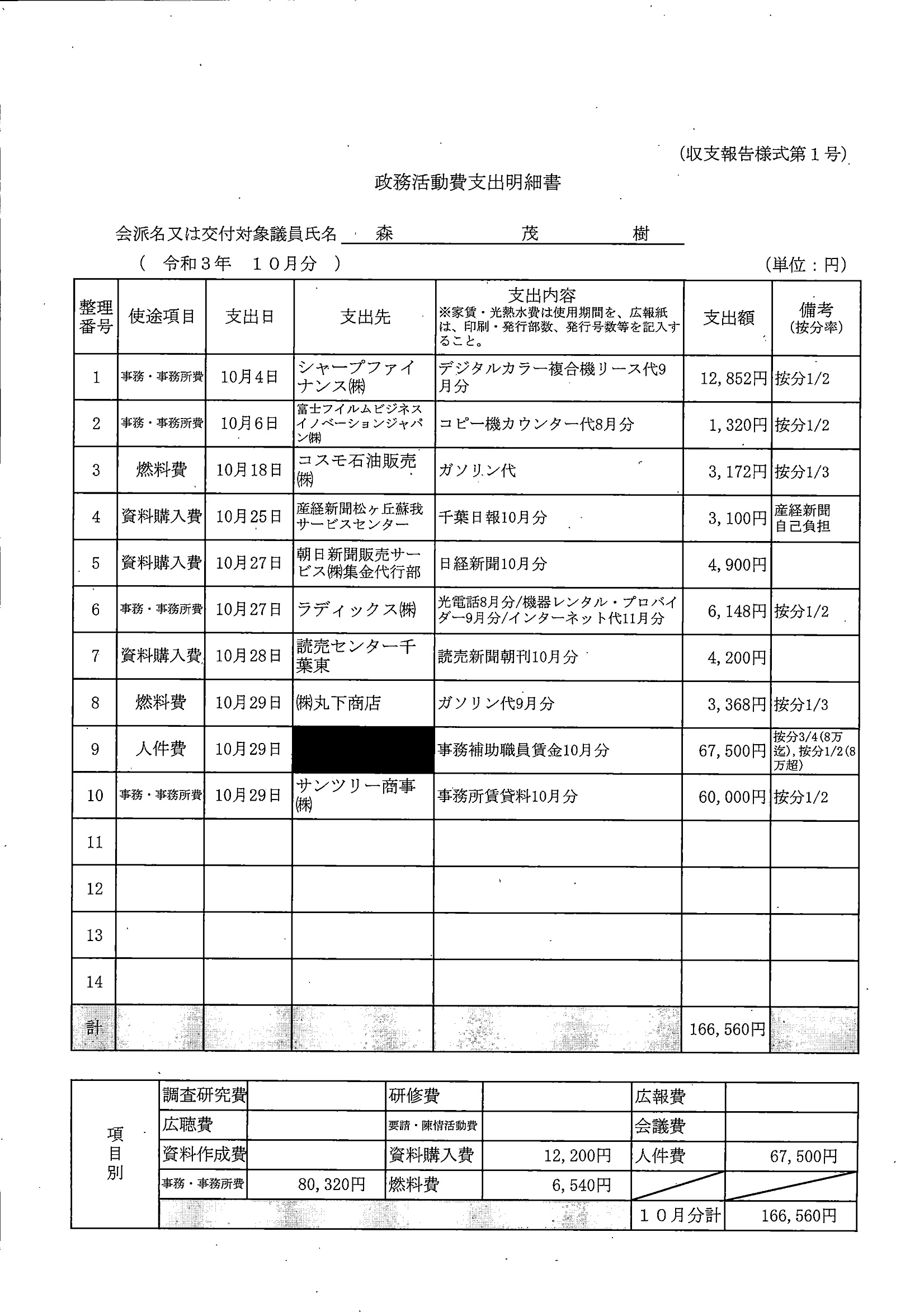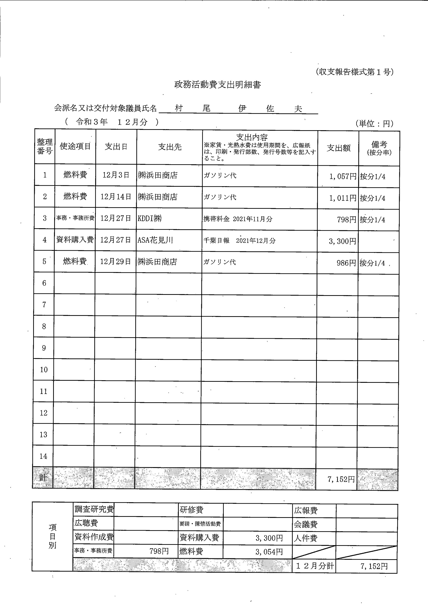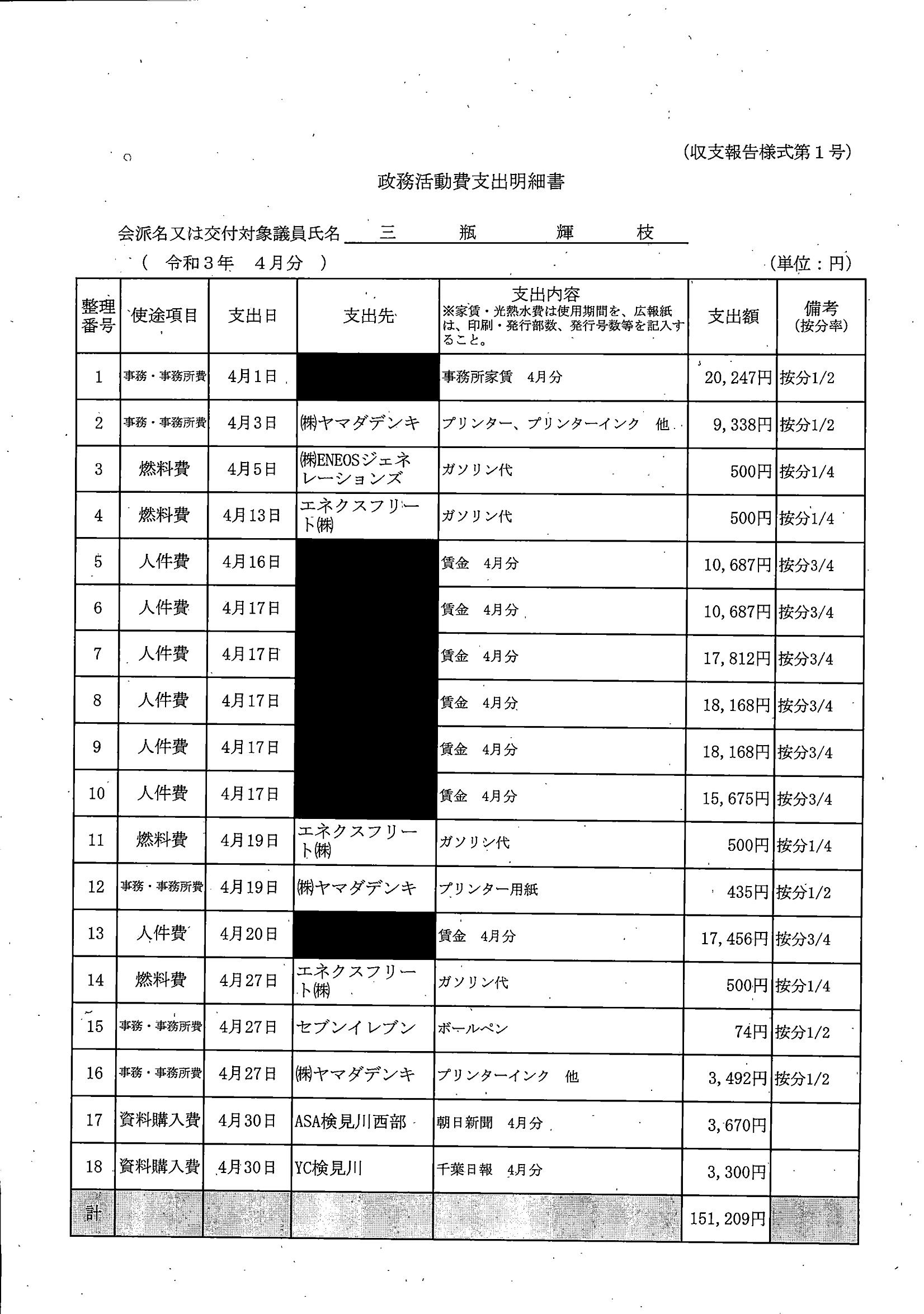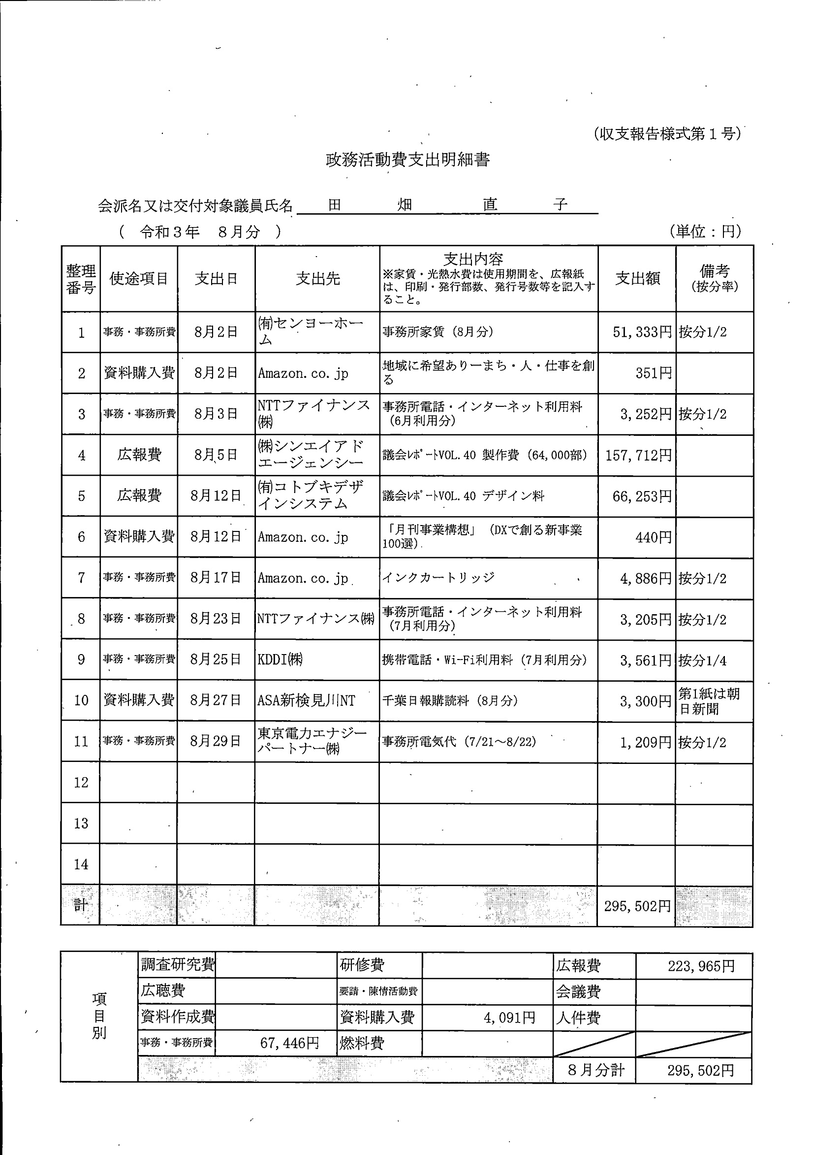 千葉市議会トップページ > 広報・情報公開 > 政務活動費 > 令和3年度交付分(政務活動費収支報告書)