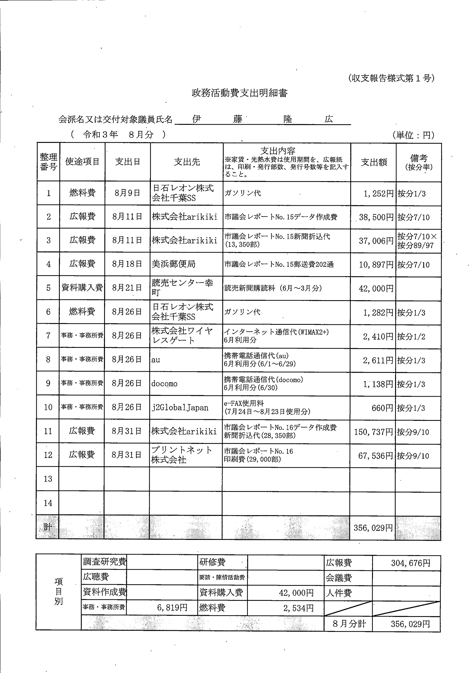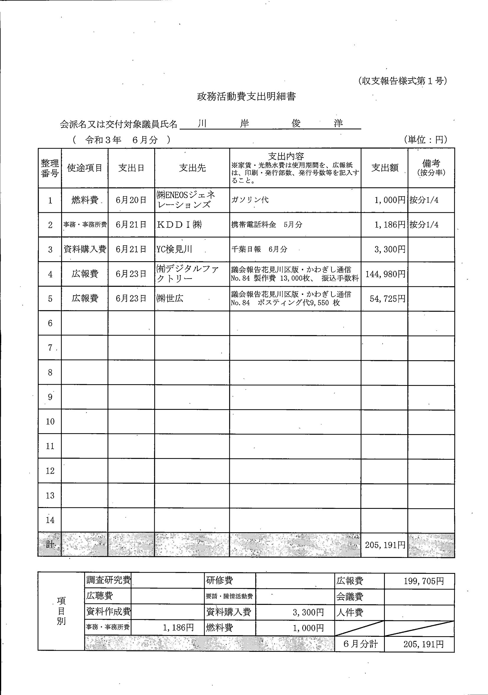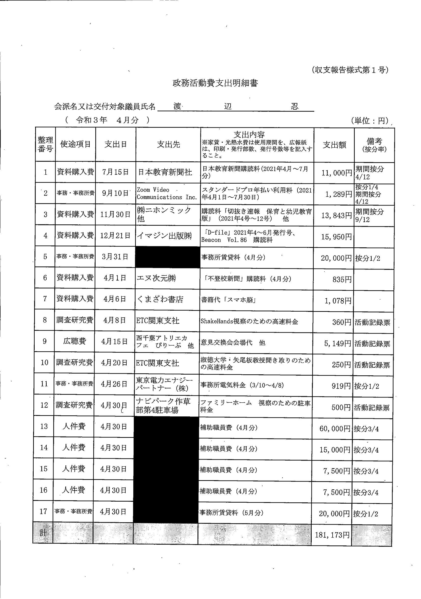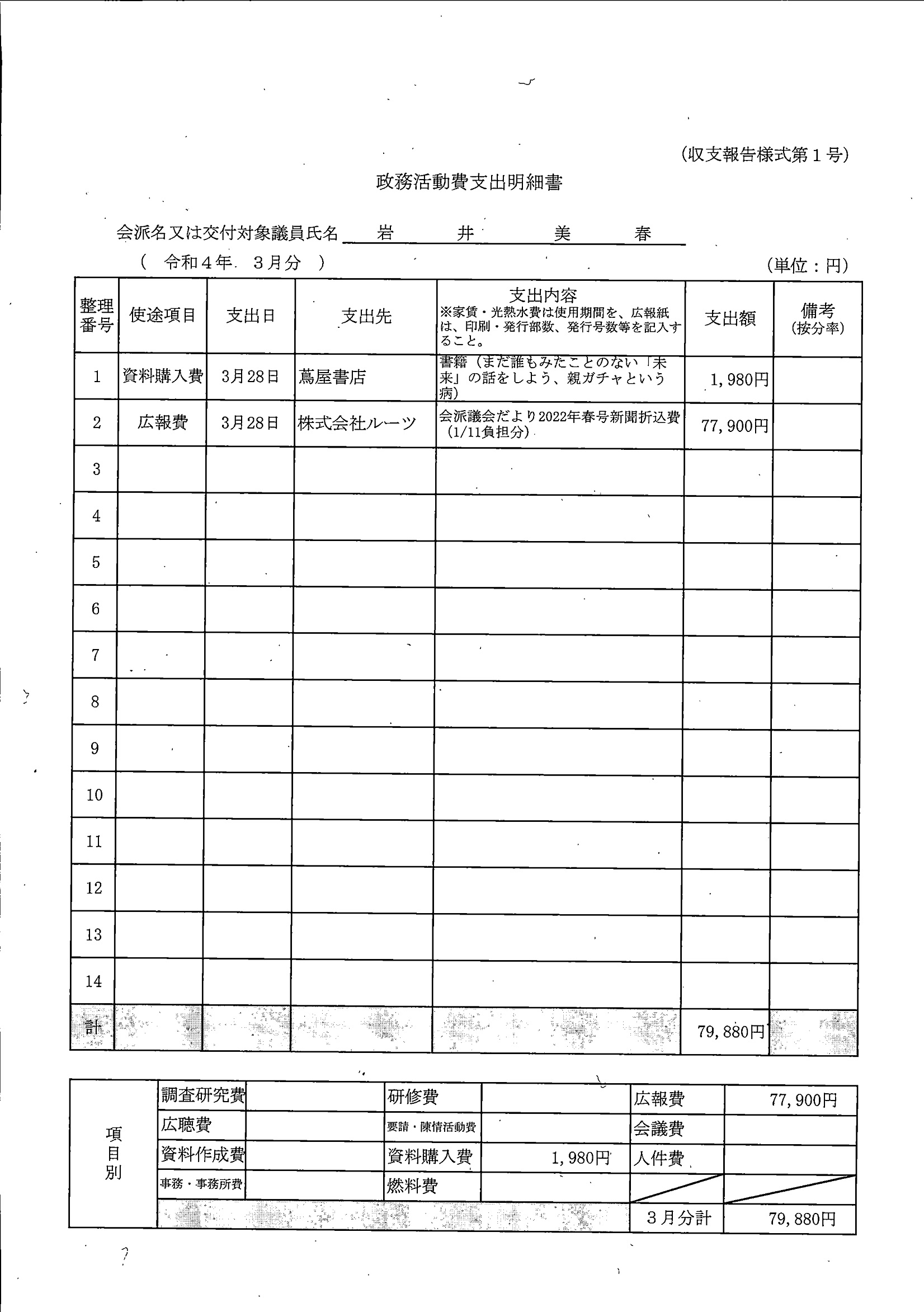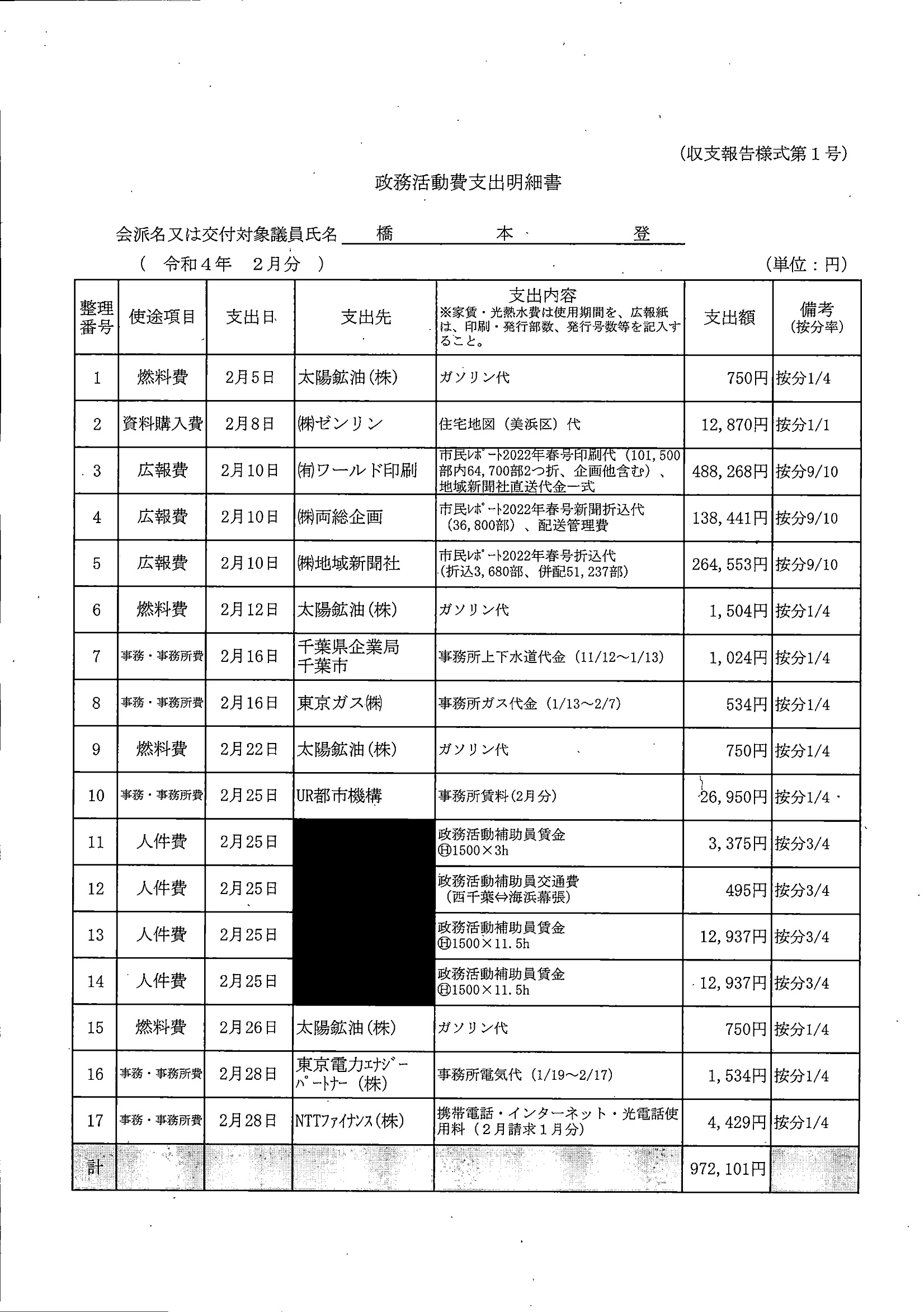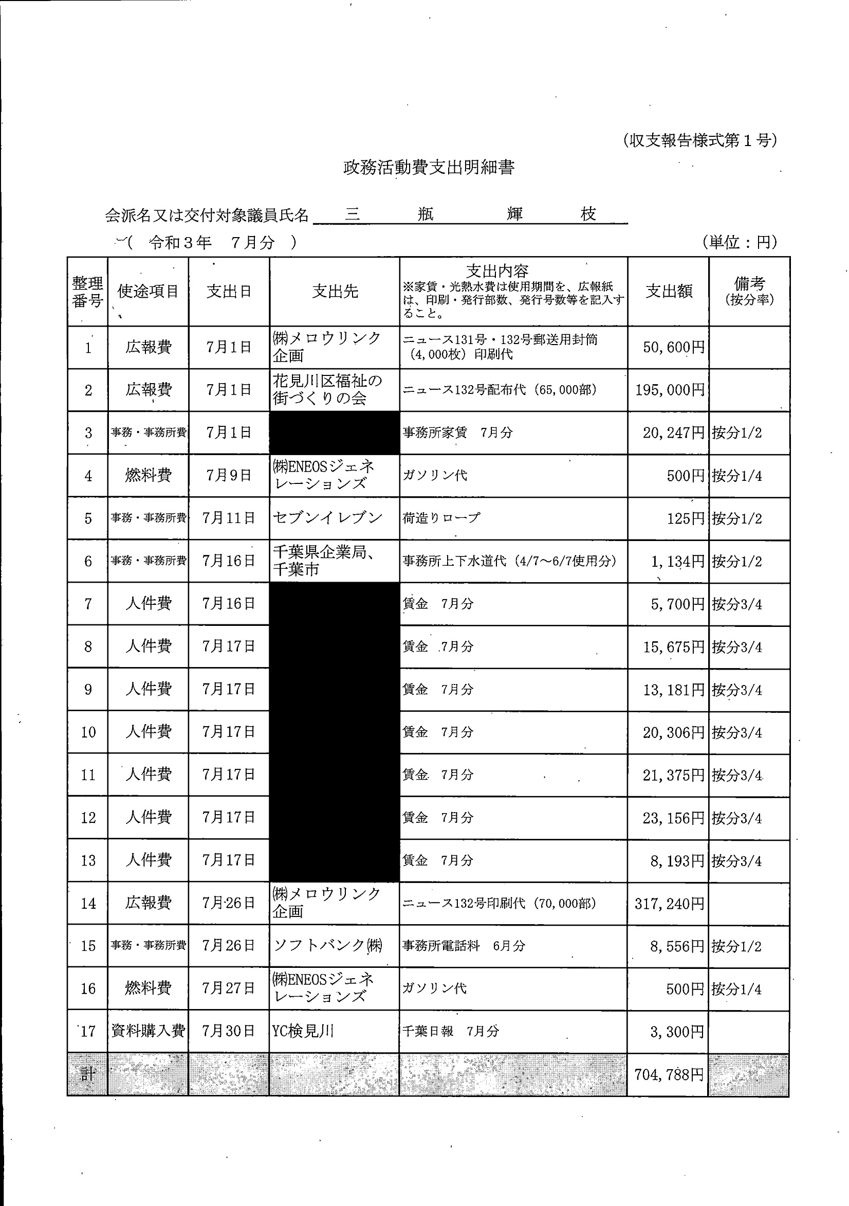 千葉市議会トップページ > 広報・情報公開 > 政務活動費 > 令和3年度交付分(政務活動費収支報告書)