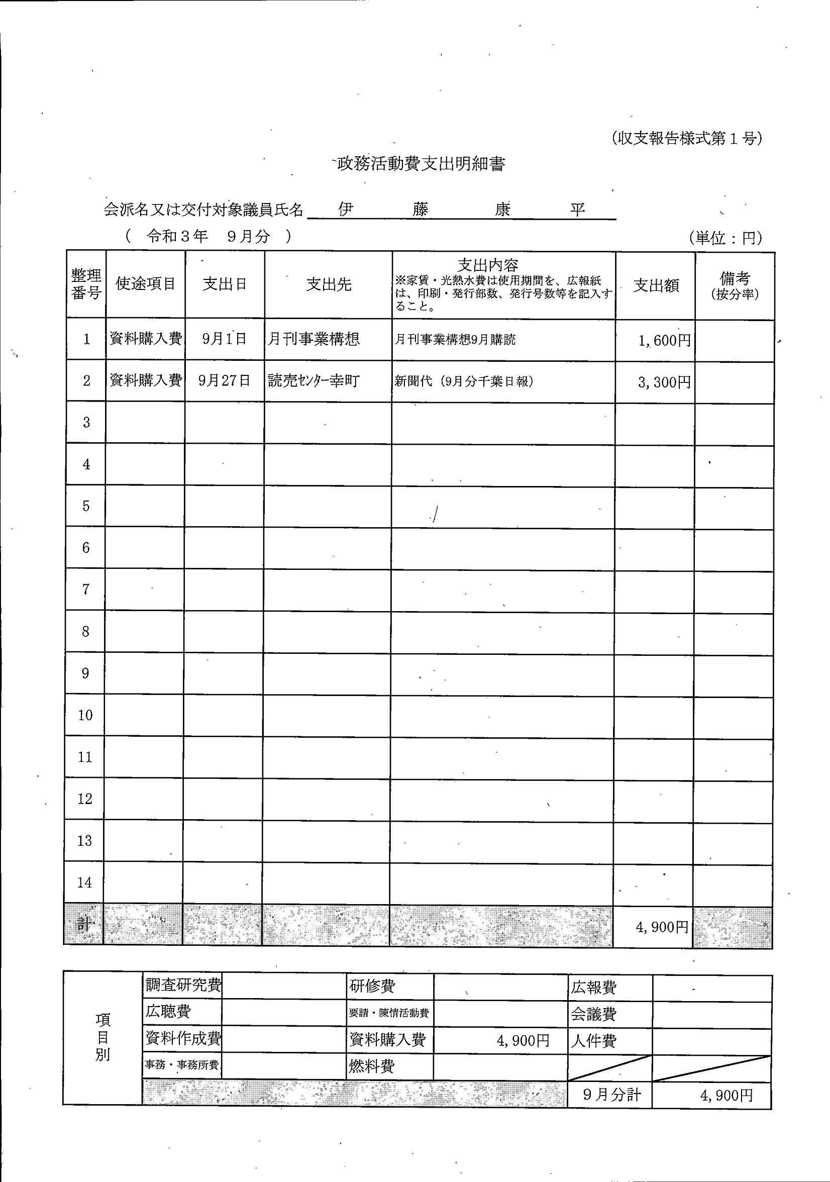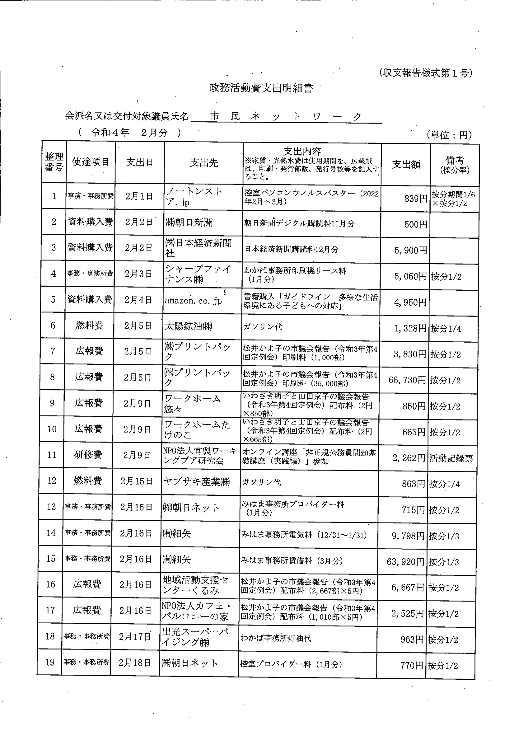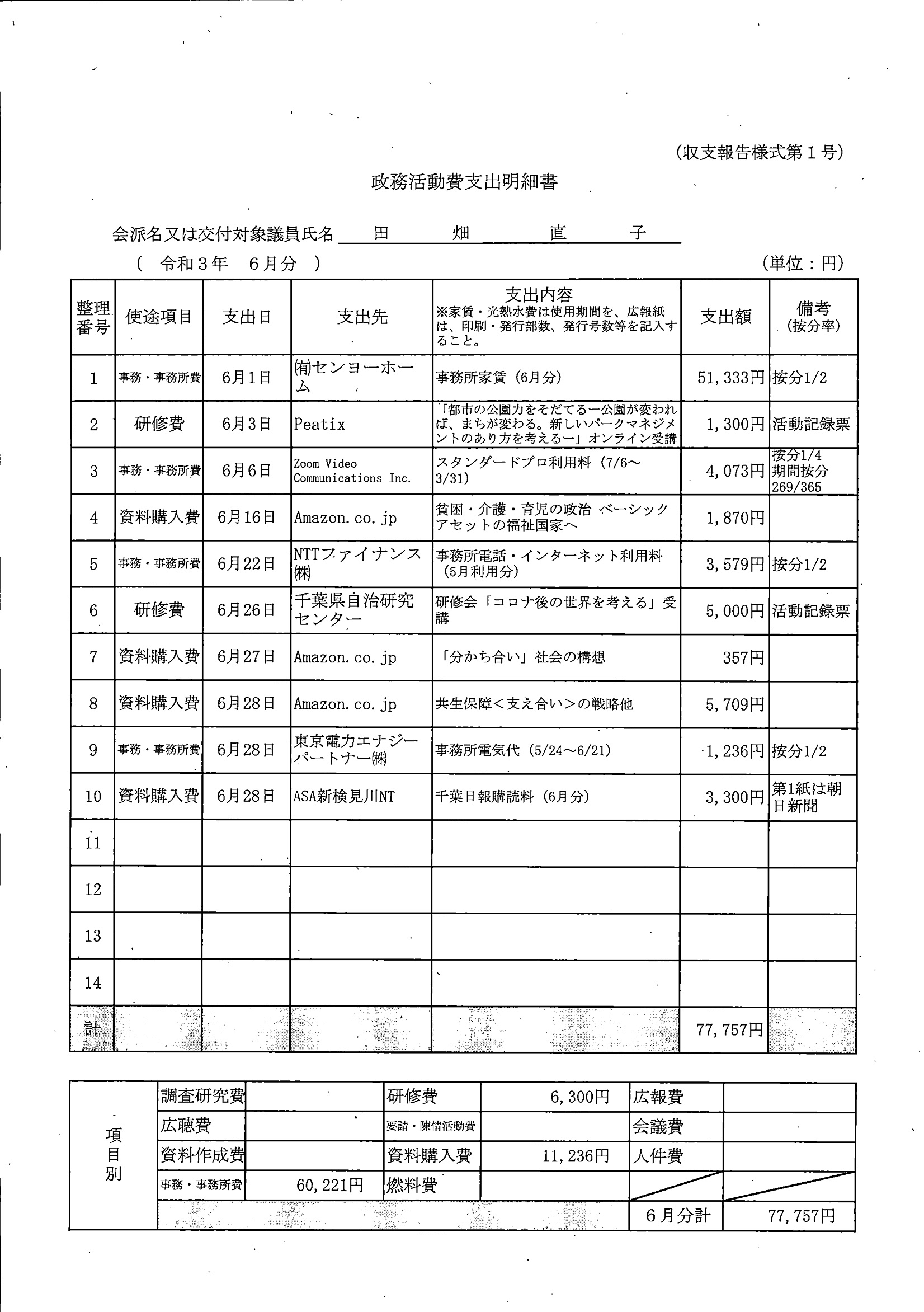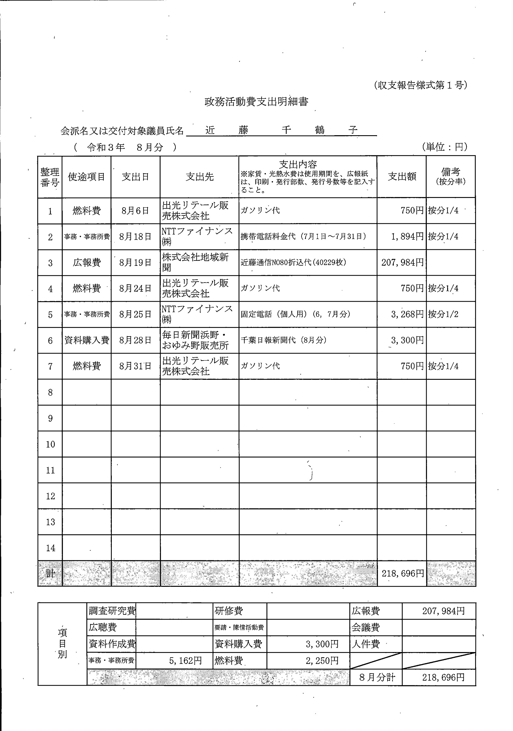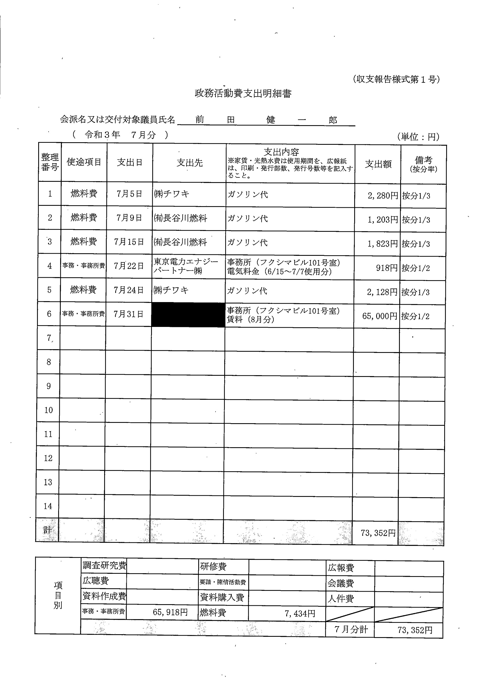 千葉市議会トップページ > 広報・情報公開 > 政務活動費 > 令和3年度交付分(政務活動費収支報告書)