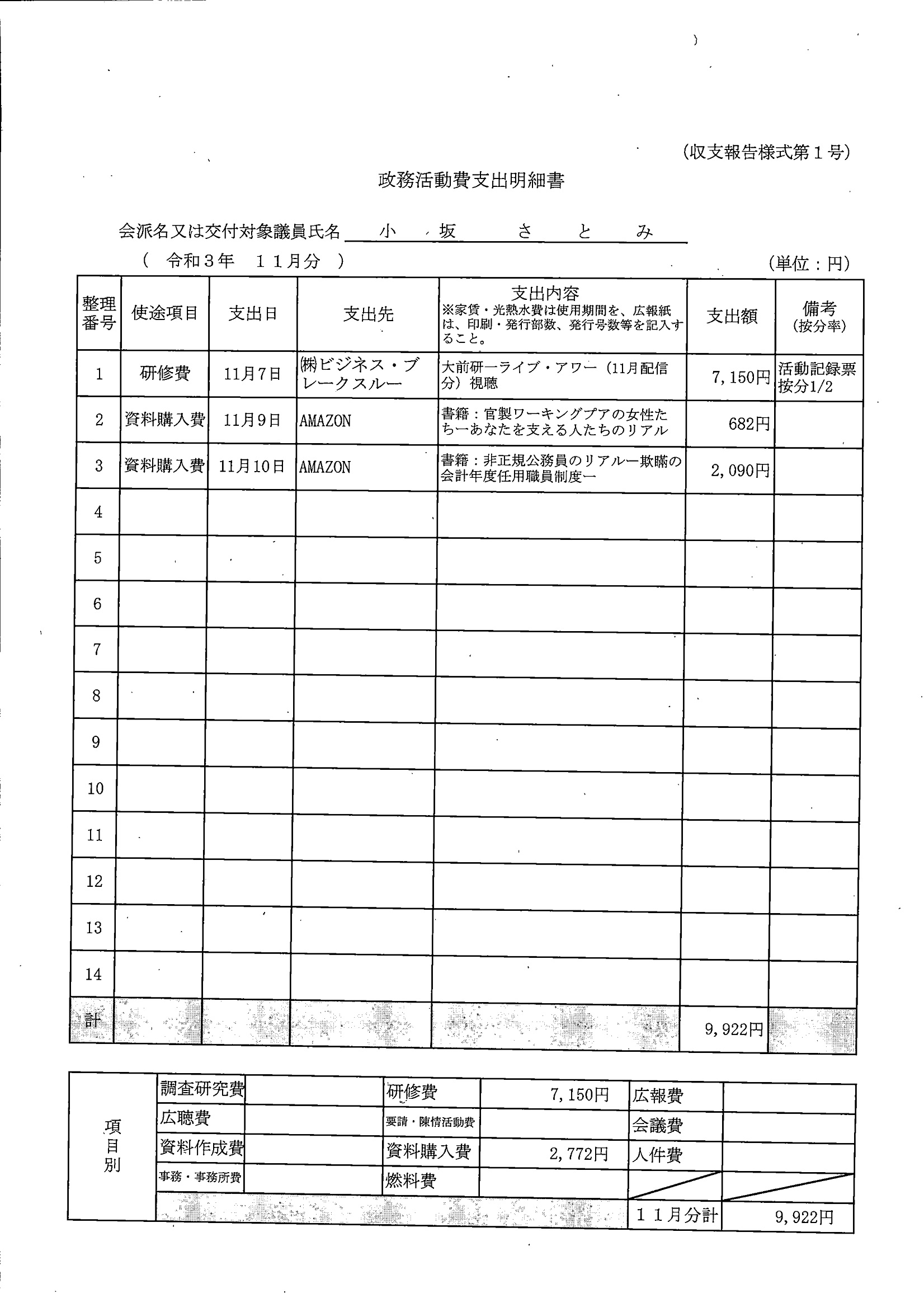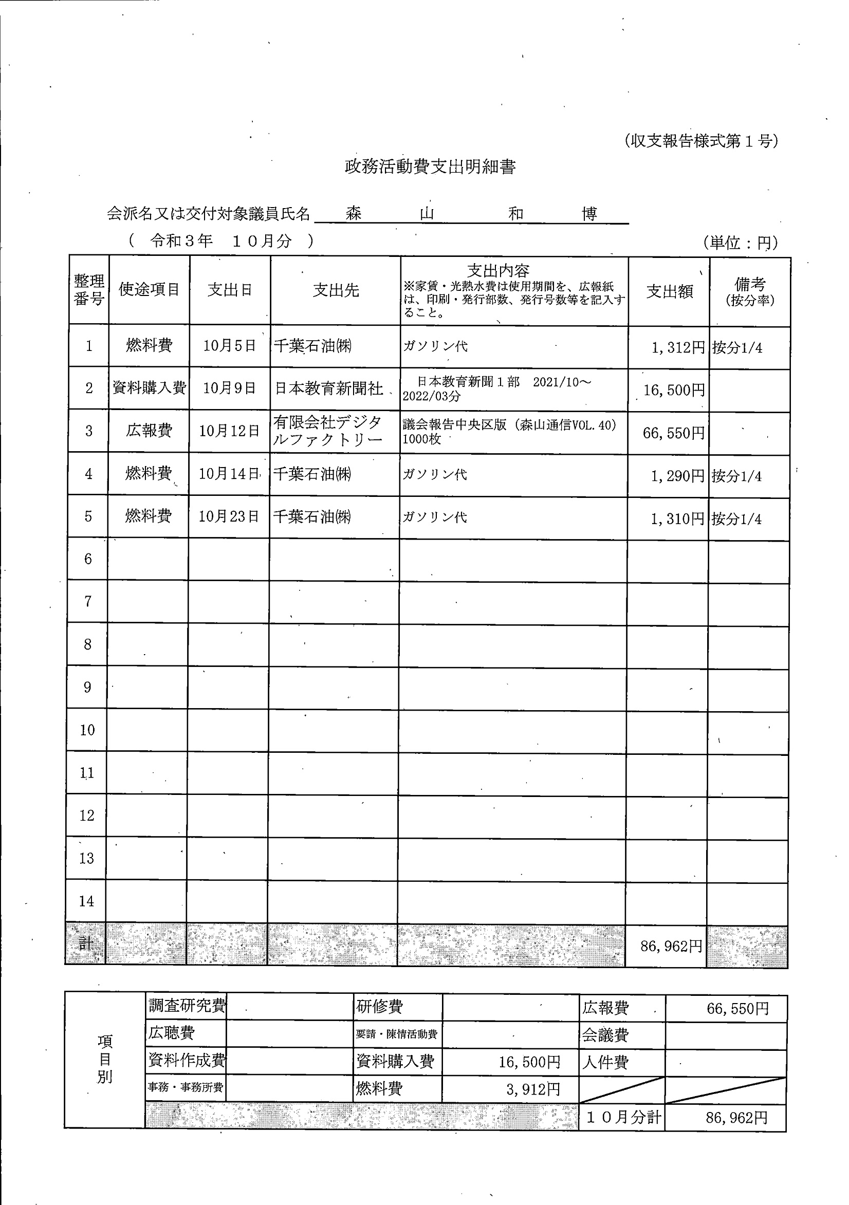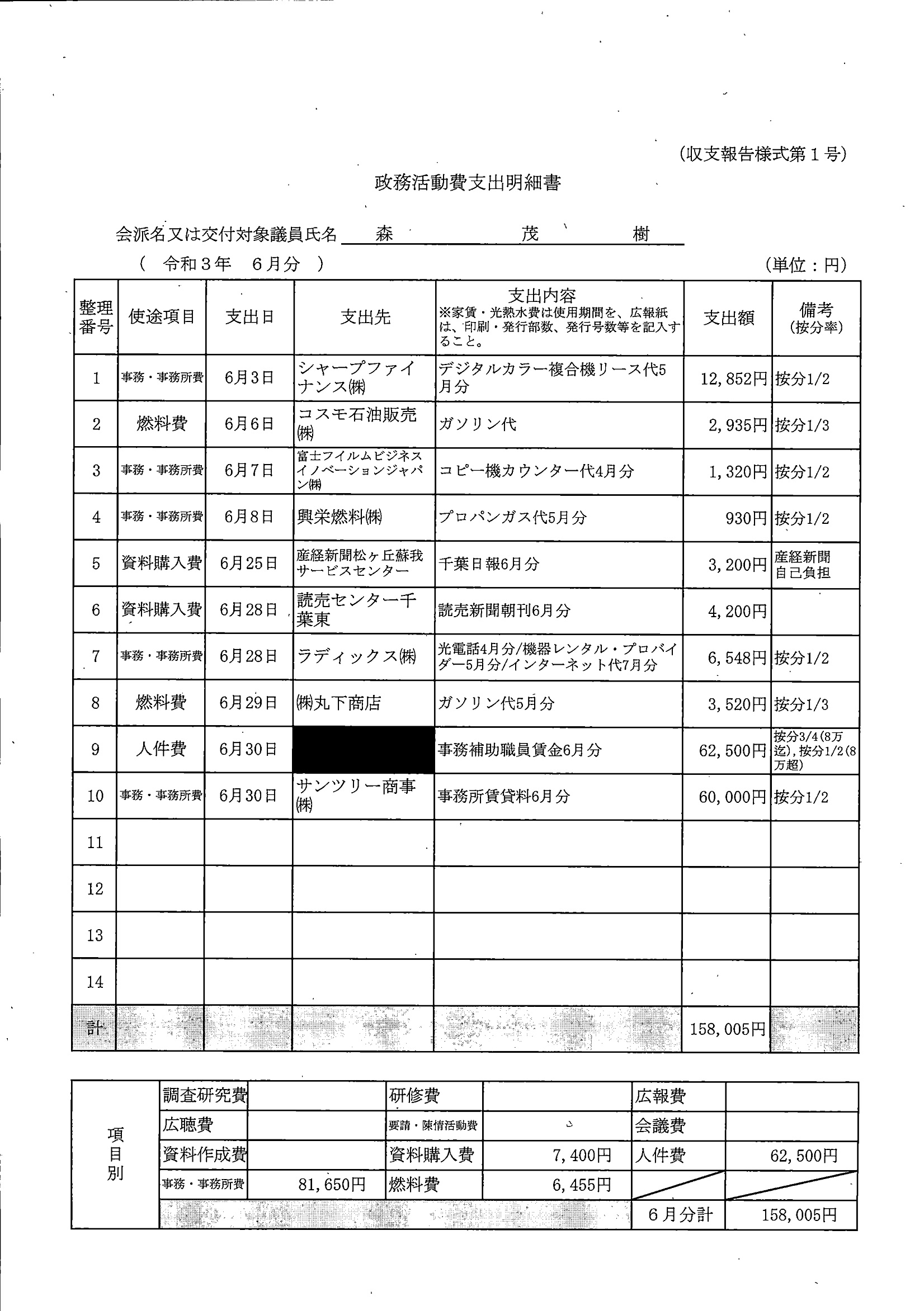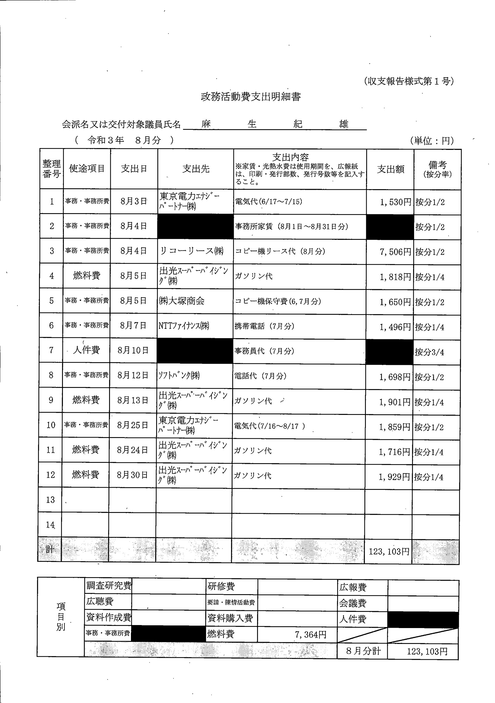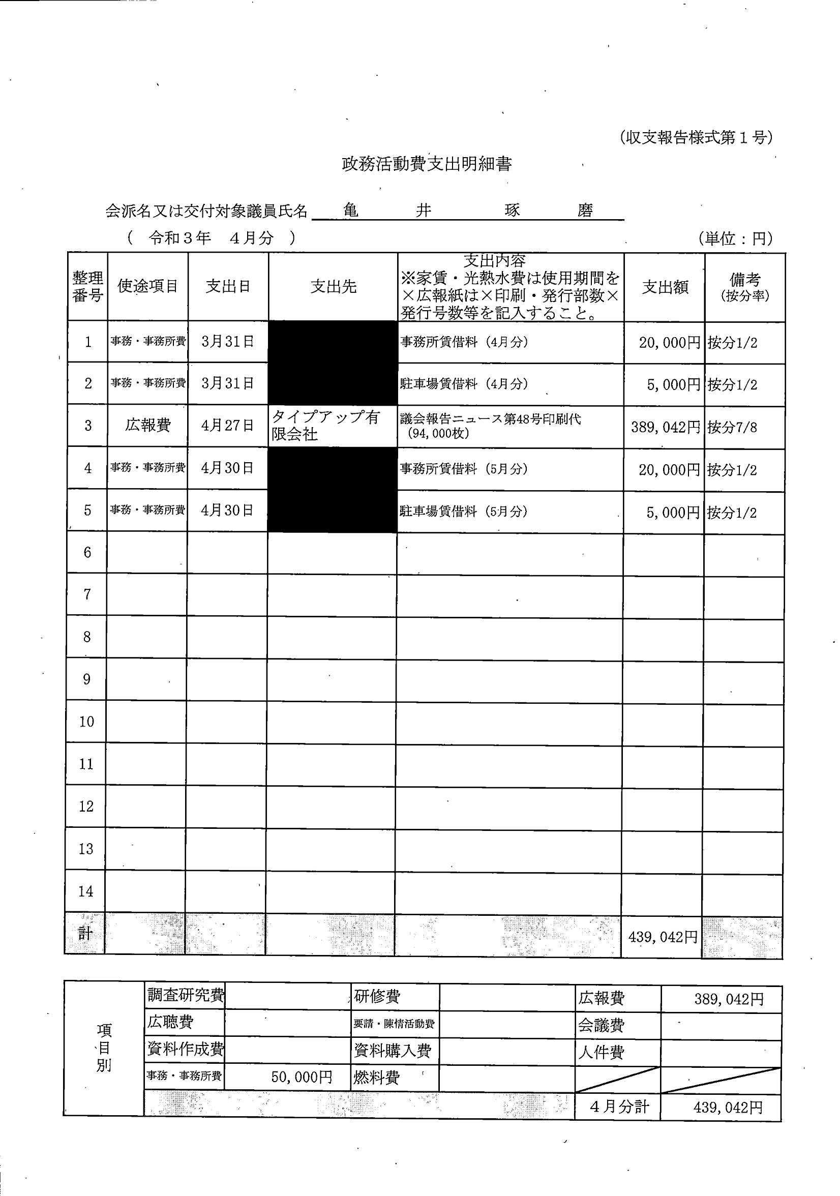 千葉市議会トップページ > 広報・情報公開 > 政務活動費 > 令和3年度交付分(政務活動費収支報告書)