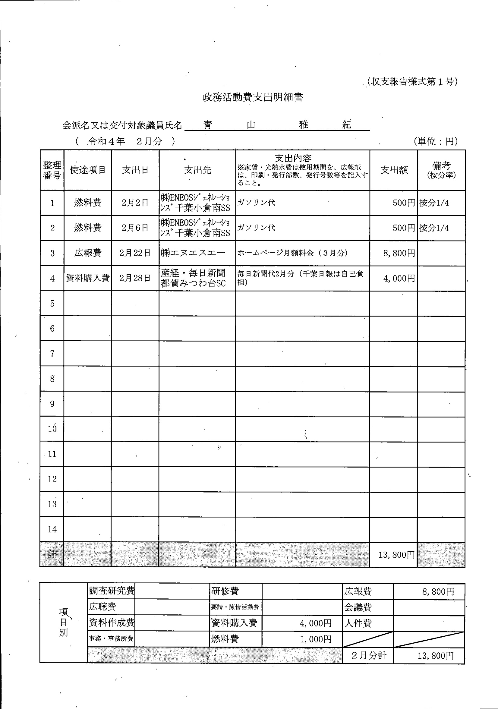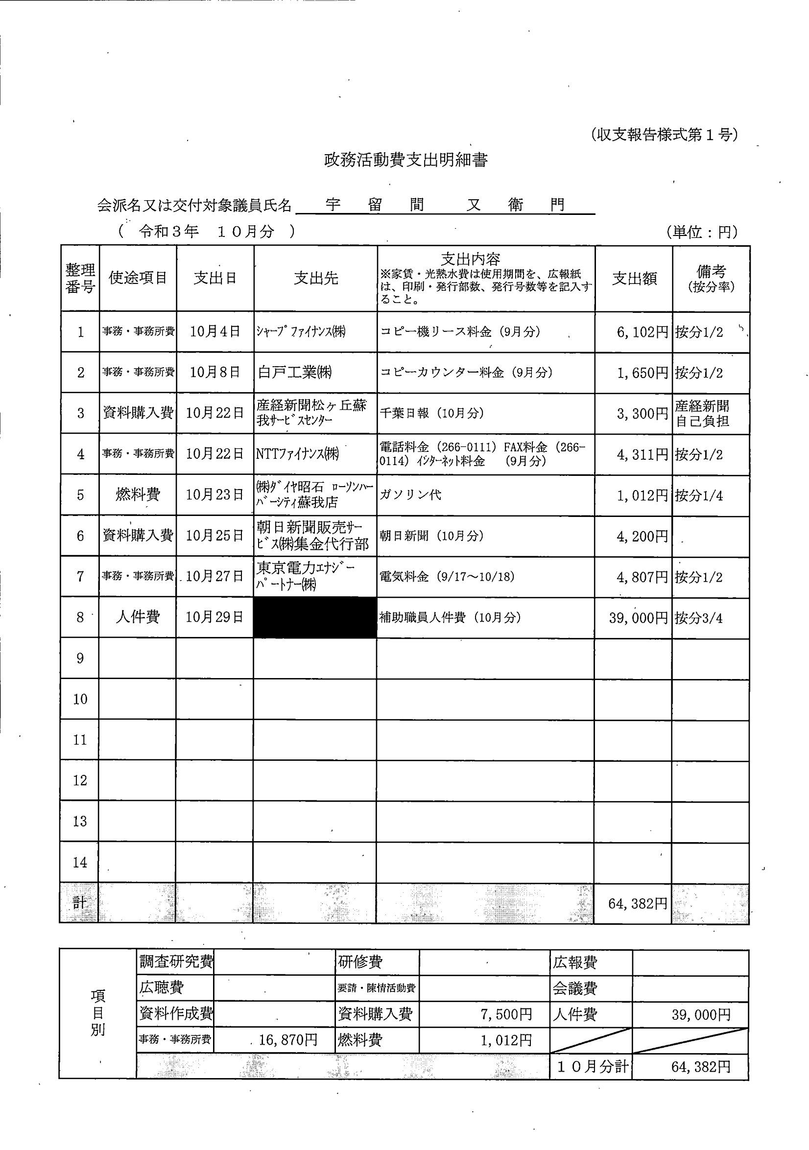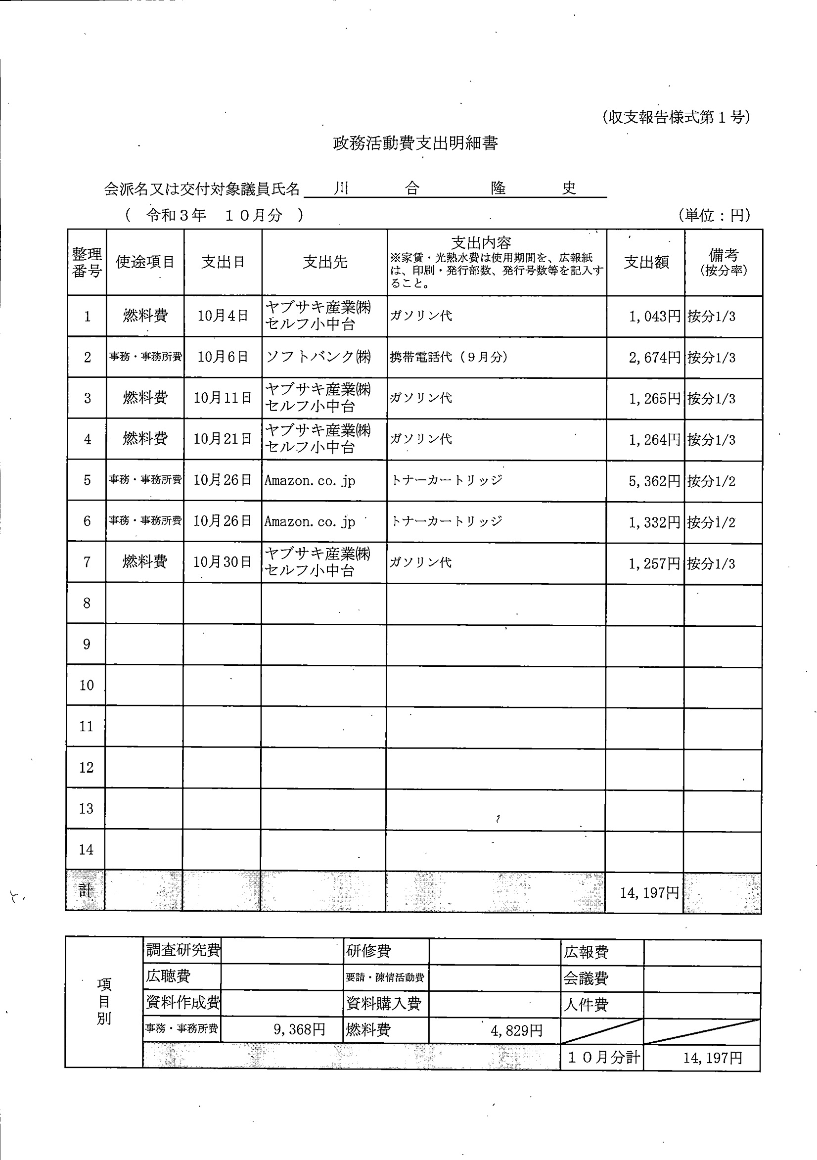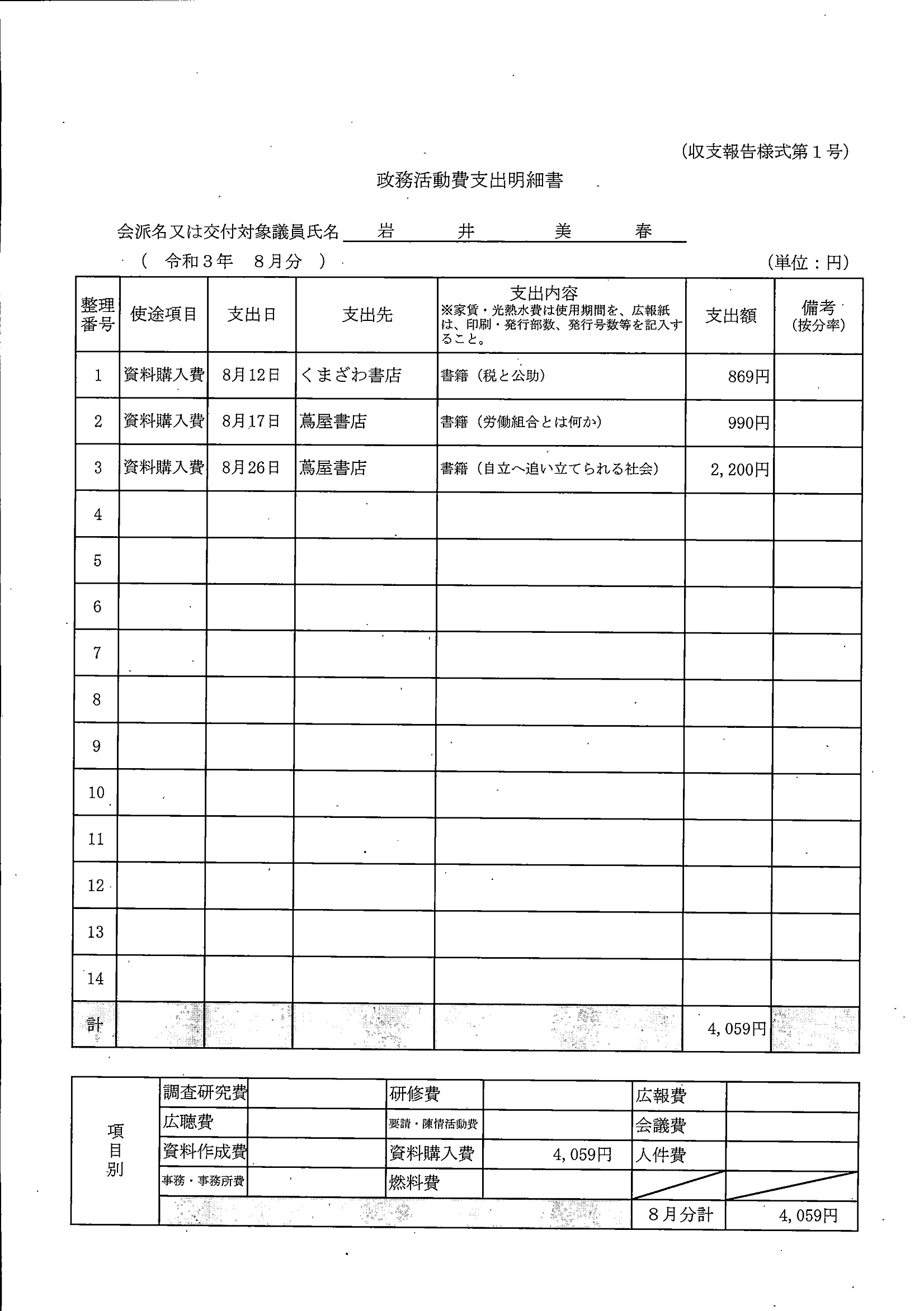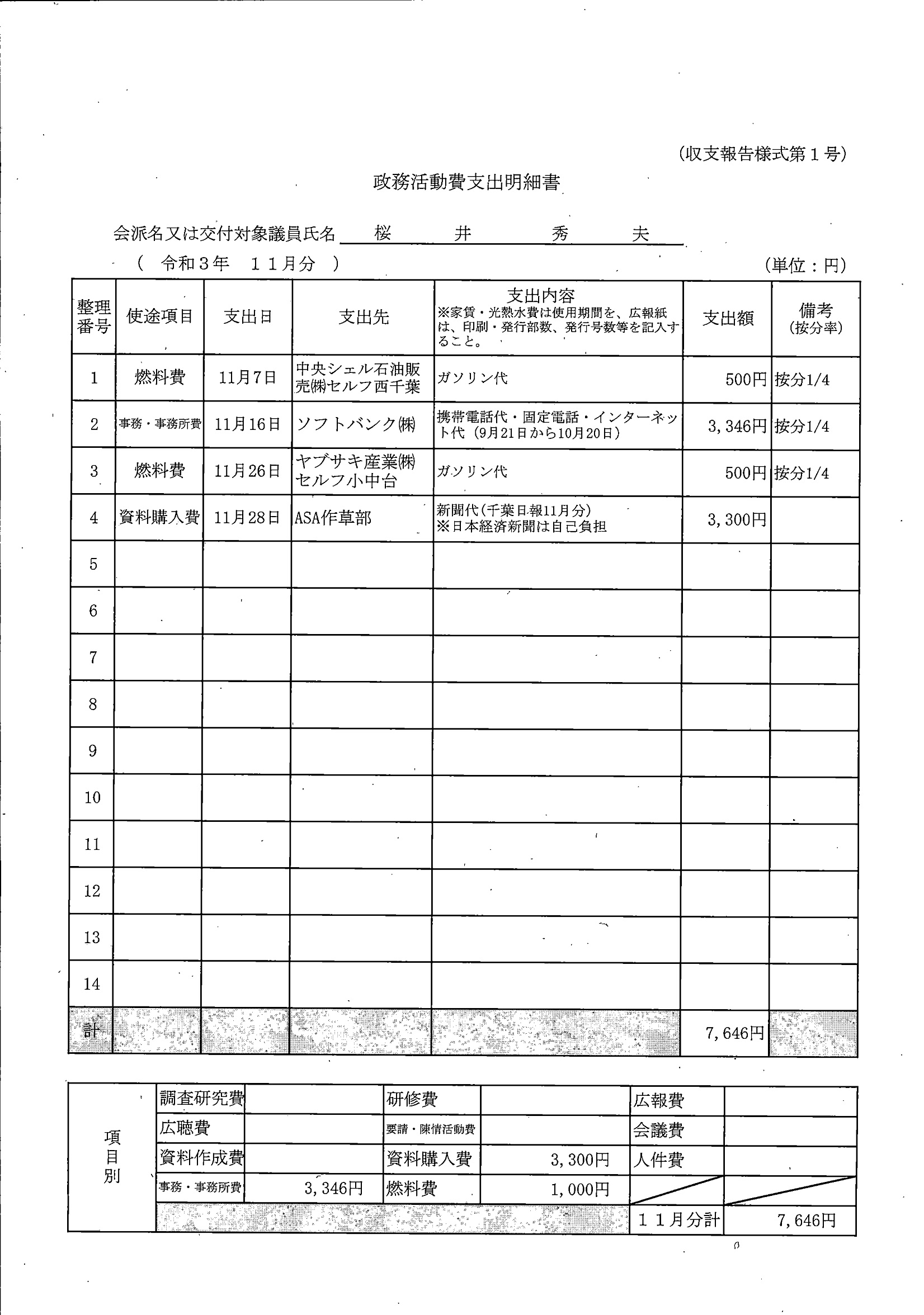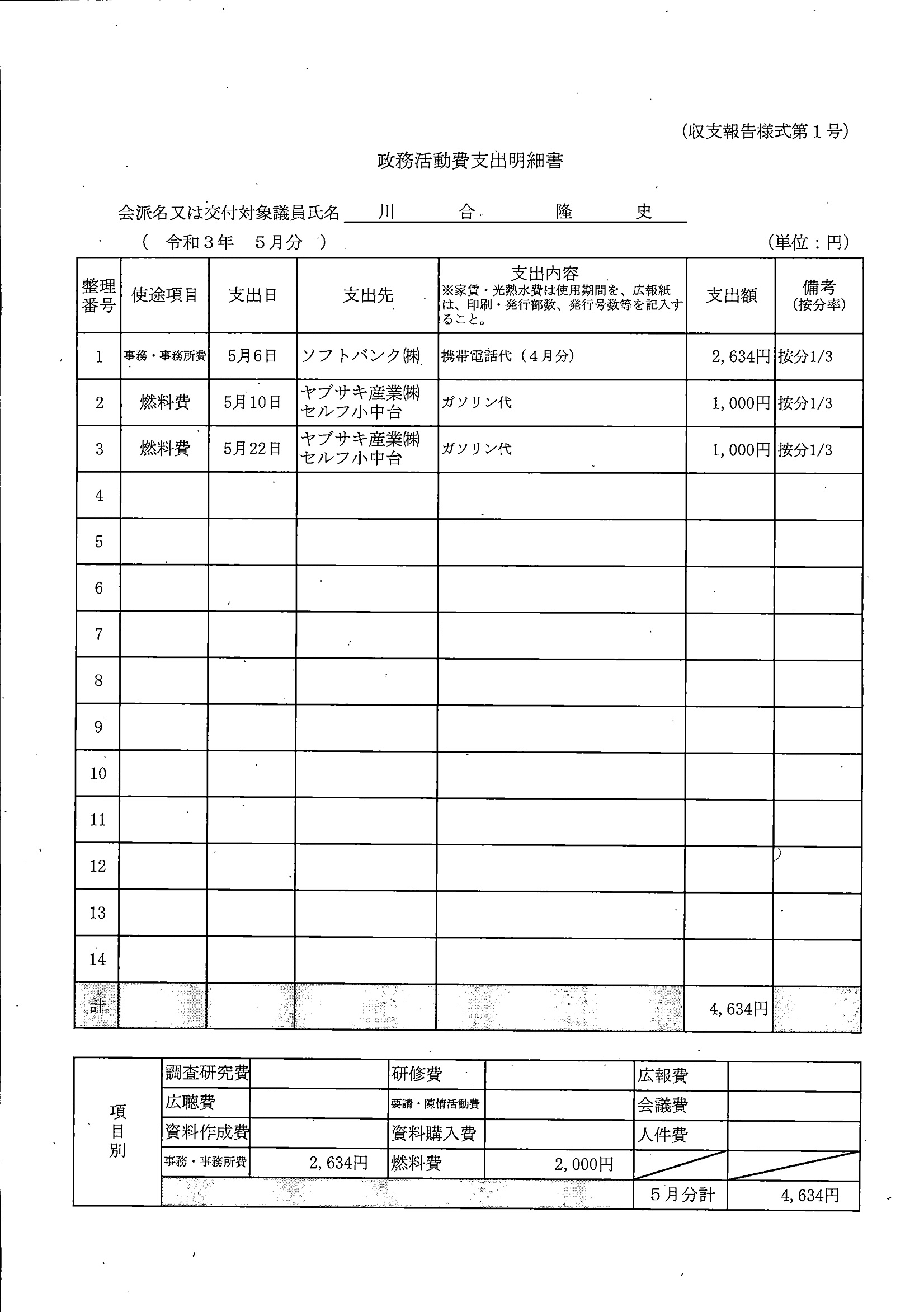 千葉市議会トップページ > 広報・情報公開 > 政務活動費 > 令和3年度交付分(政務活動費収支報告書)