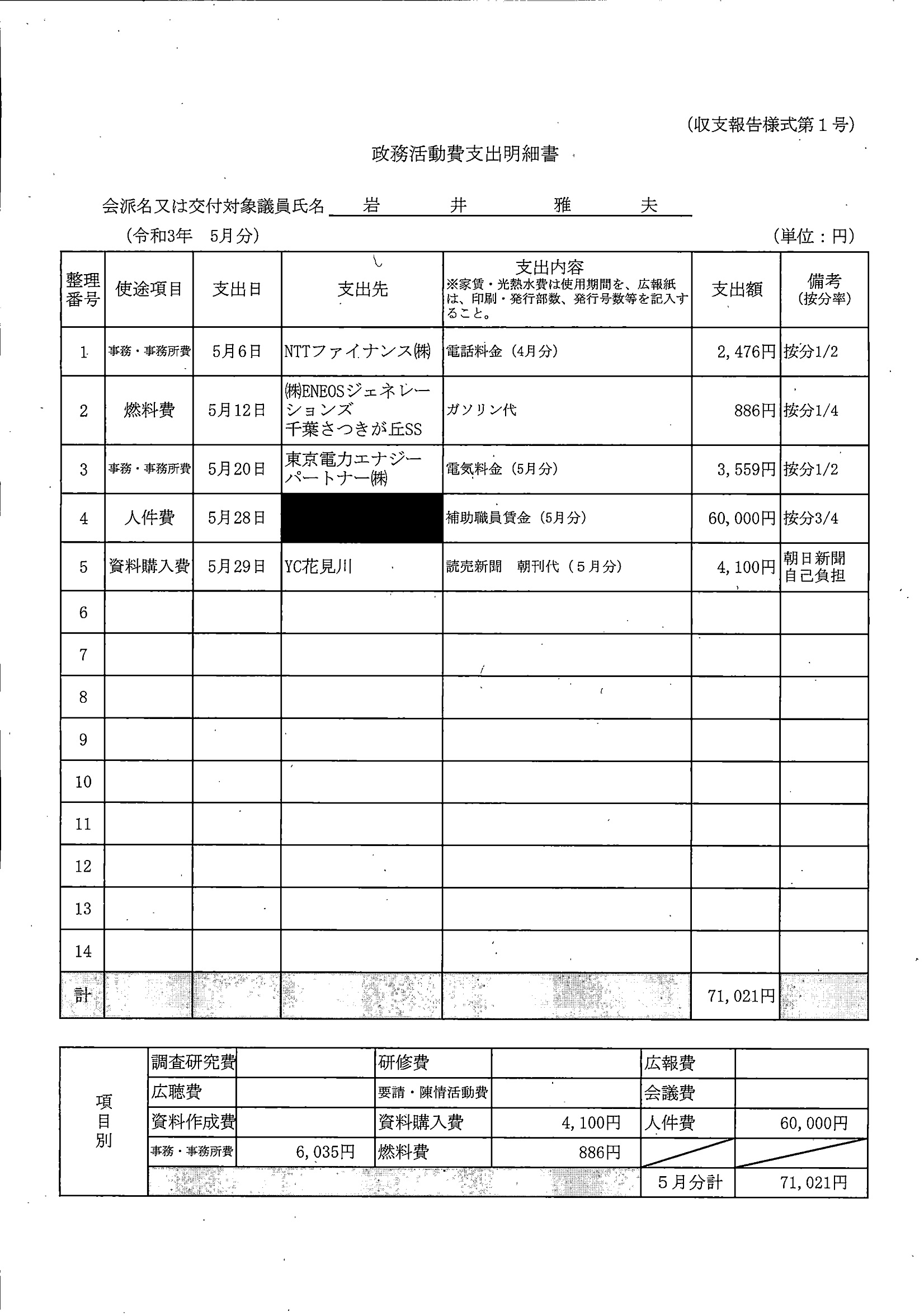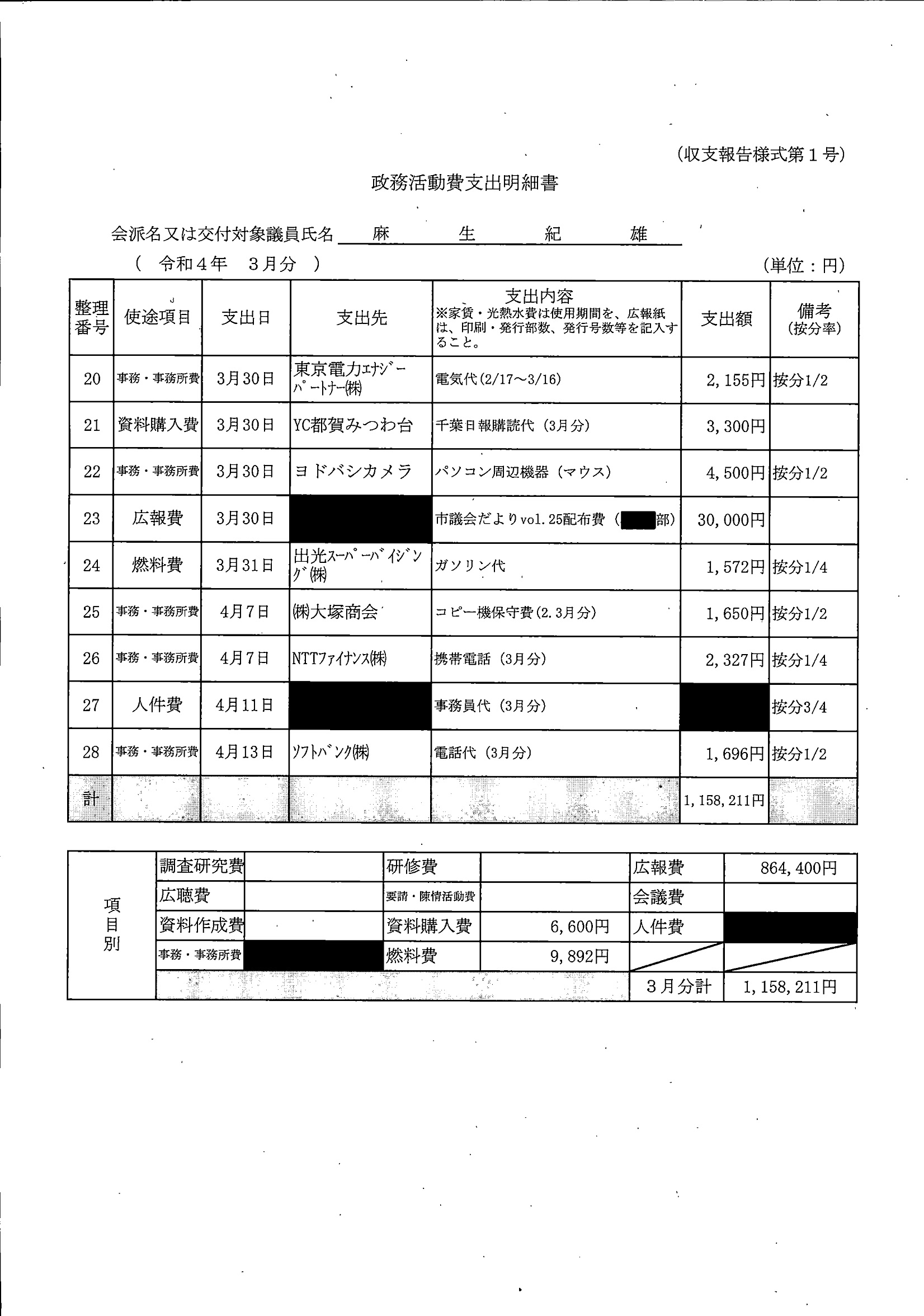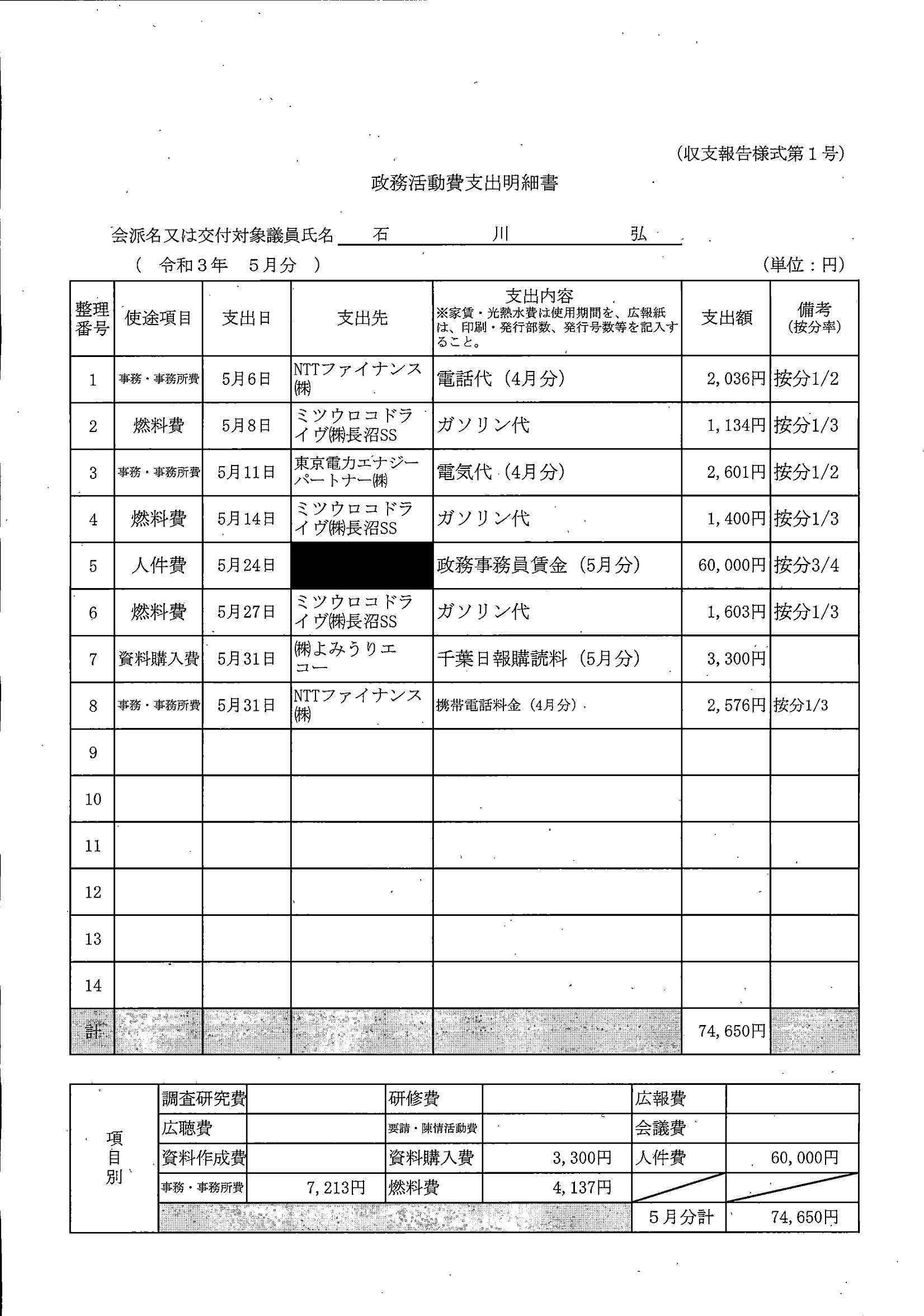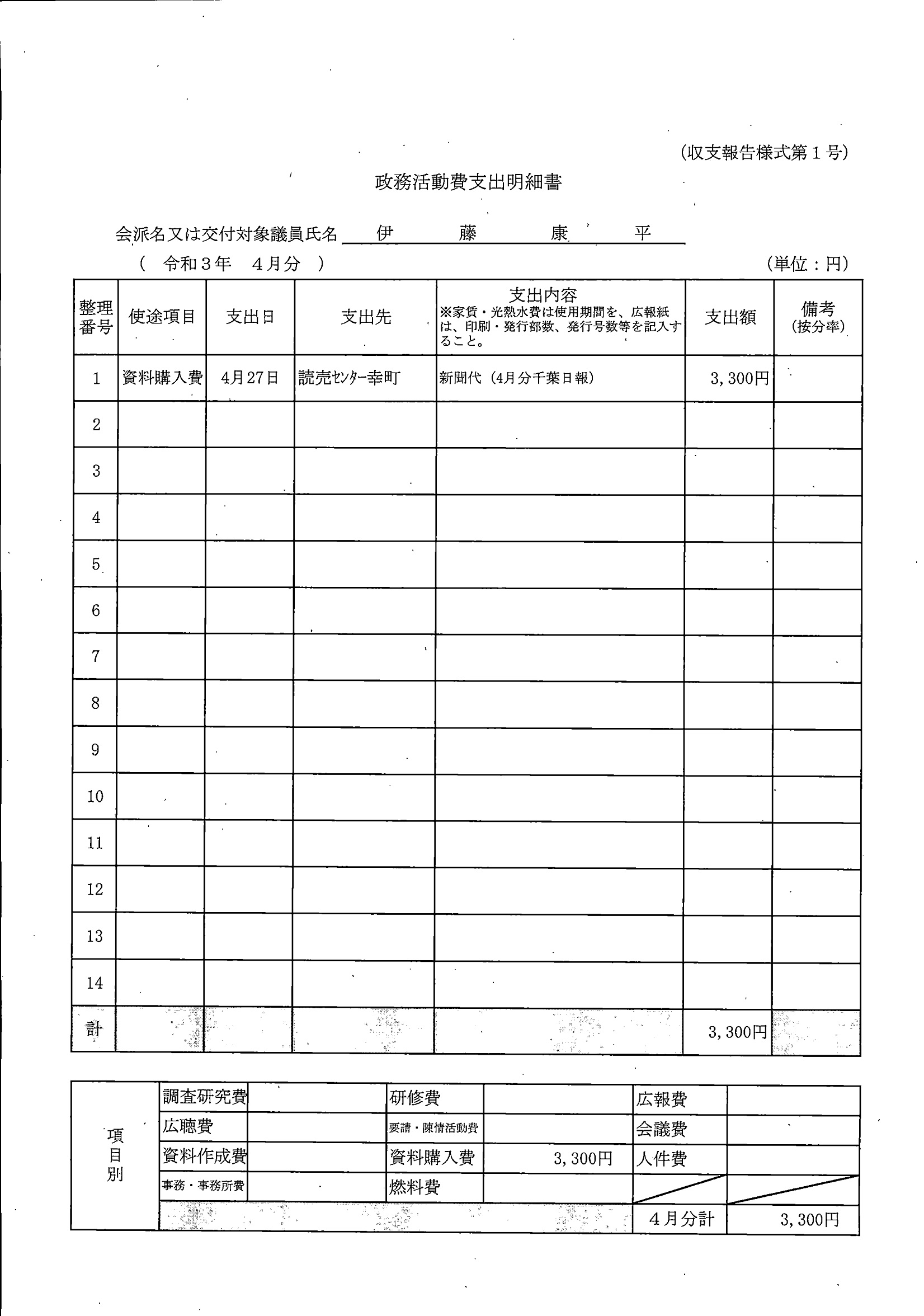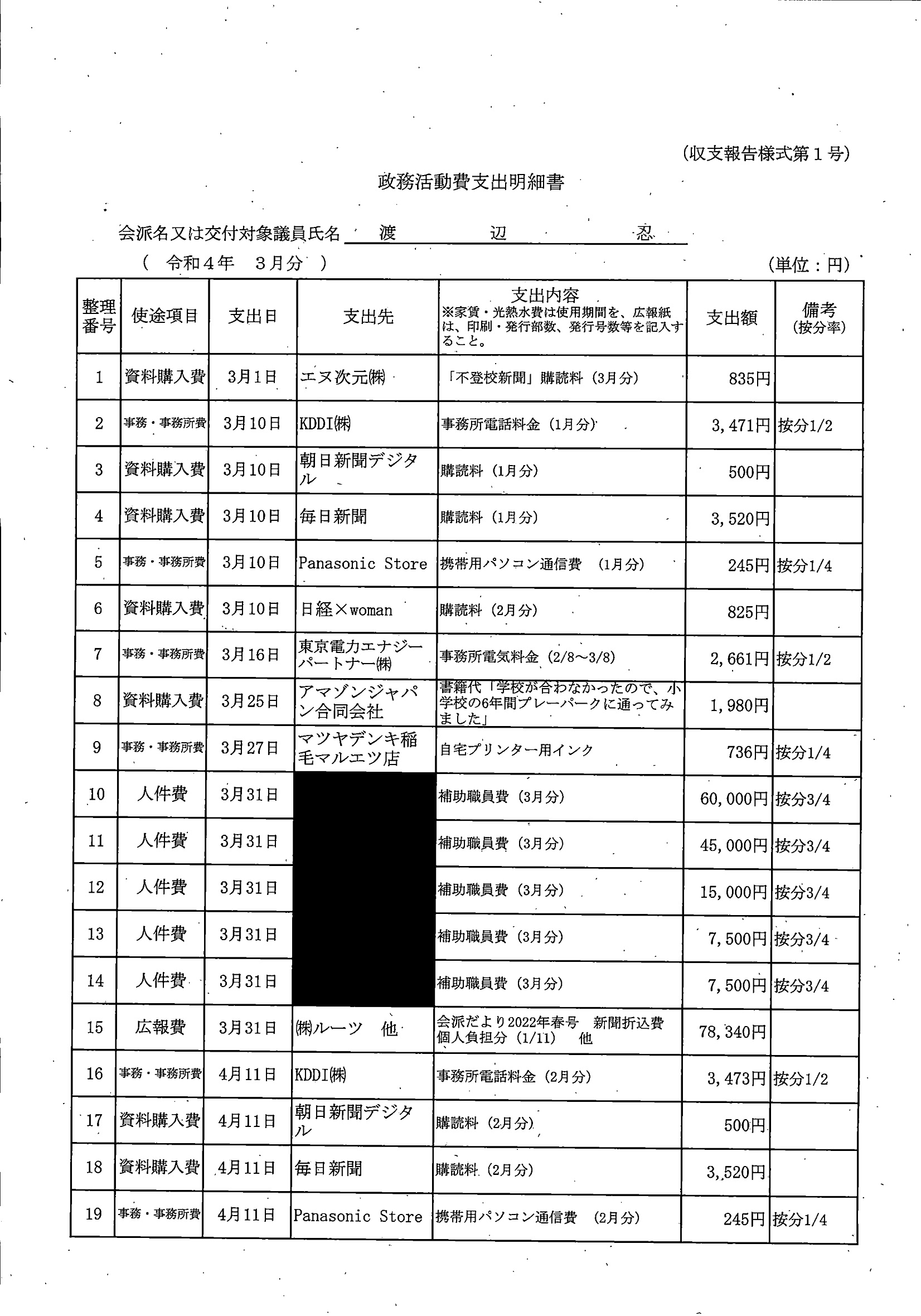 千葉市議会トップページ > 広報・情報公開 > 政務活動費 > 令和3年度交付分(政務活動費収支報告書)