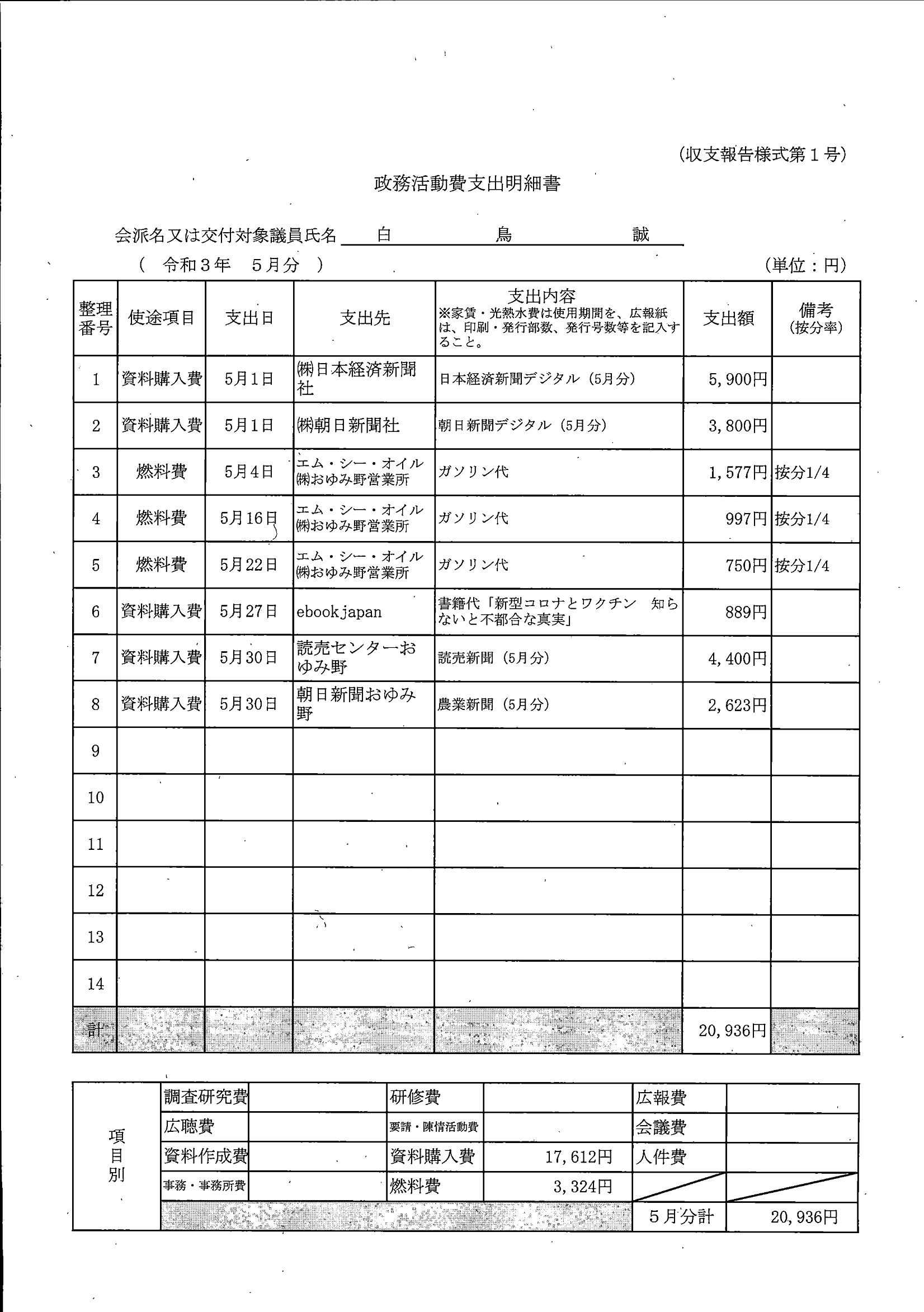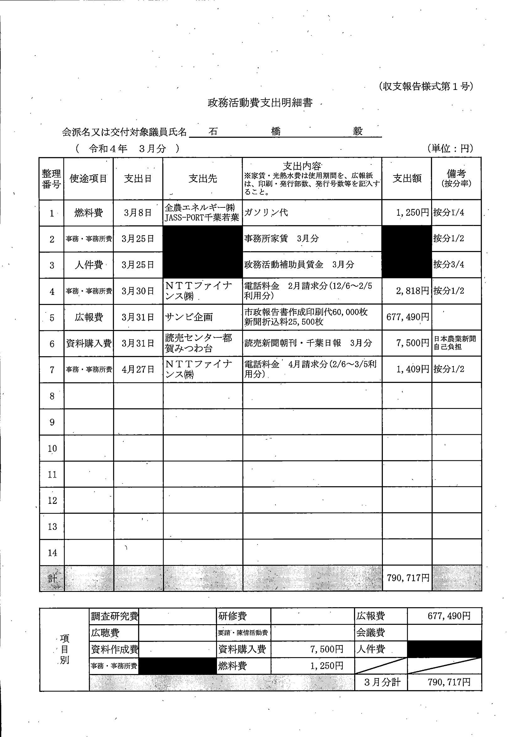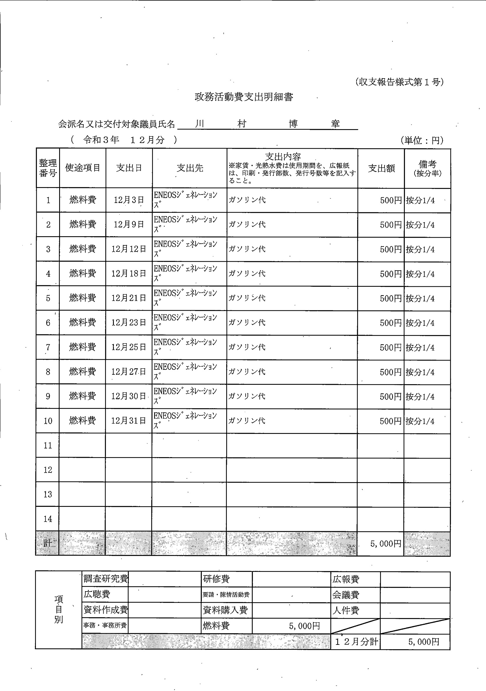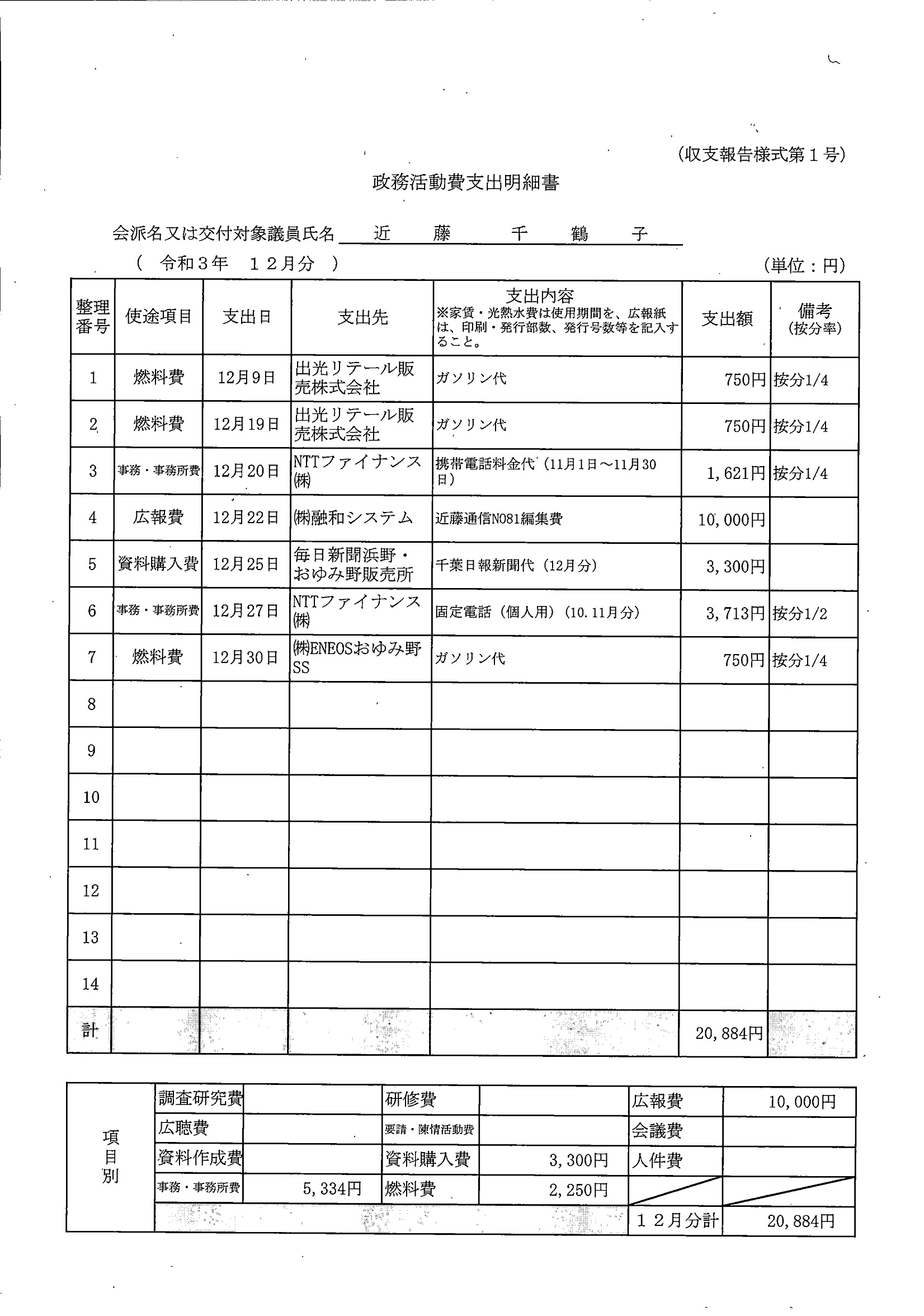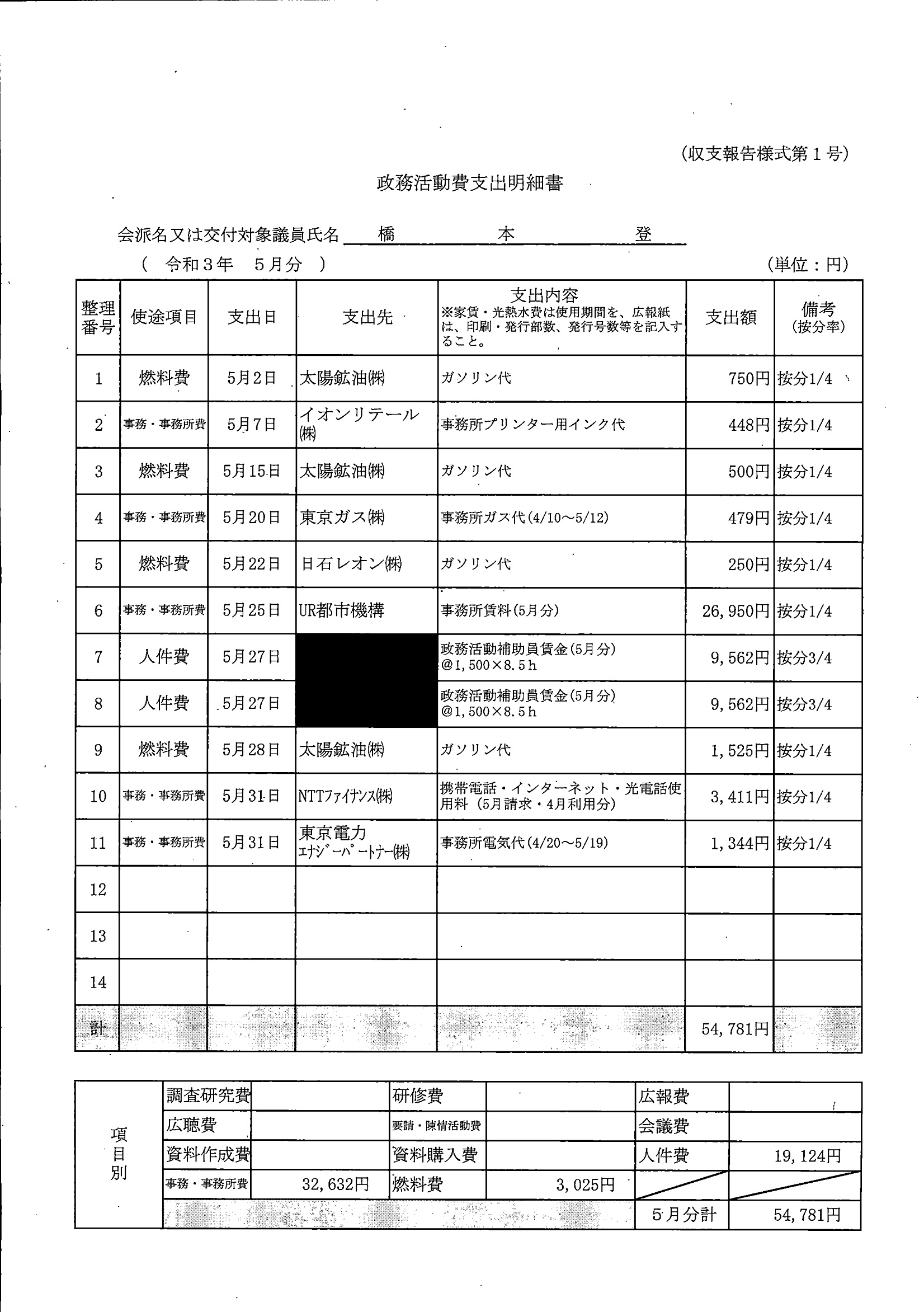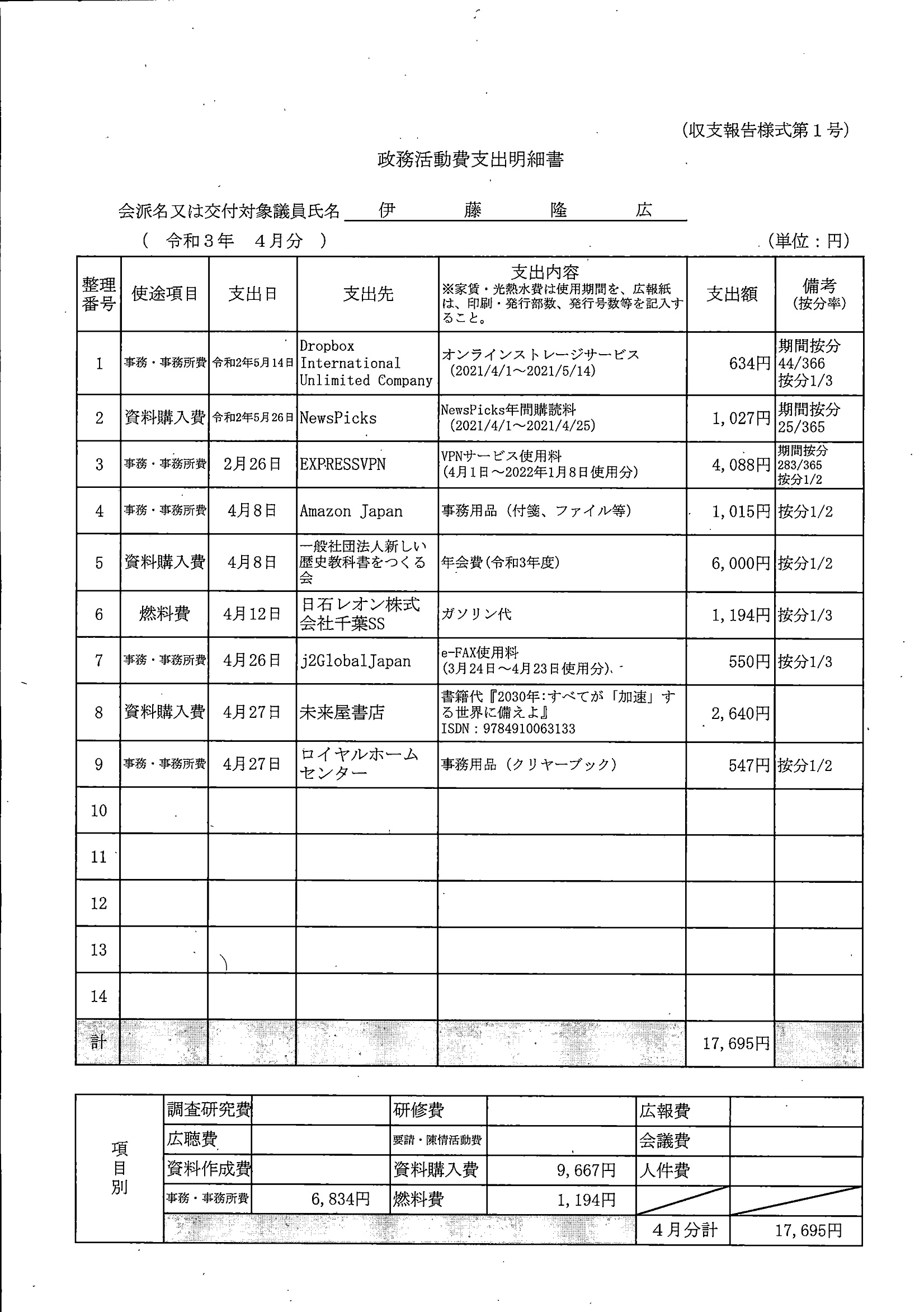 千葉市議会トップページ > 広報・情報公開 > 政務活動費 > 令和3年度交付分(政務活動費収支報告書)