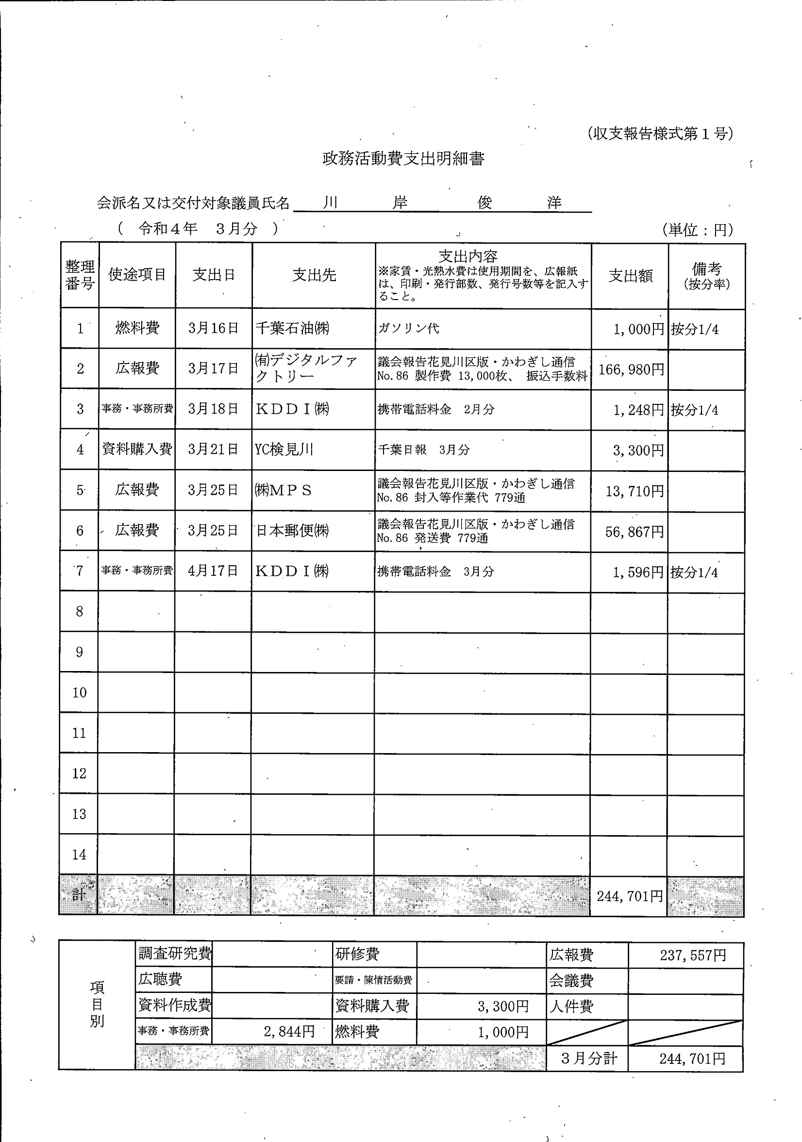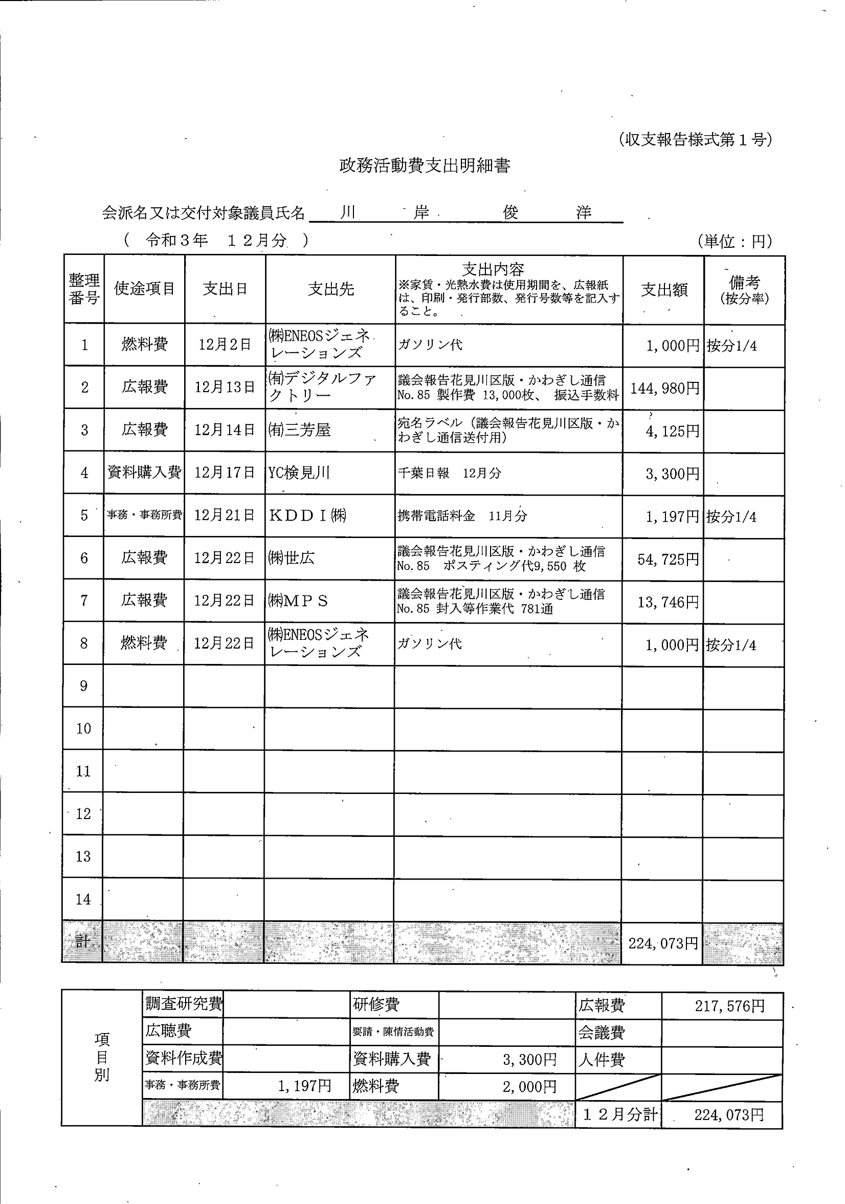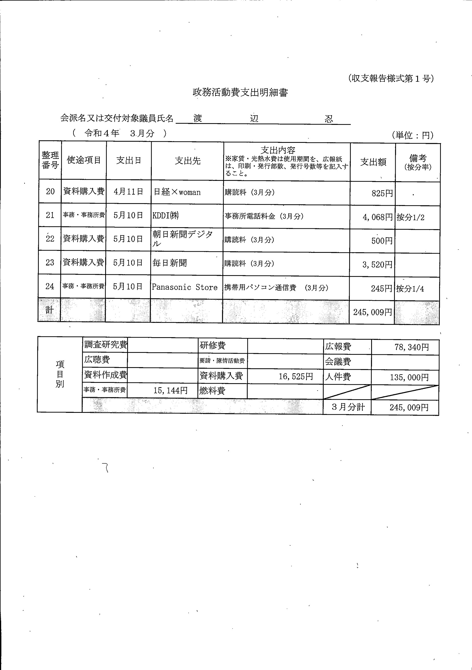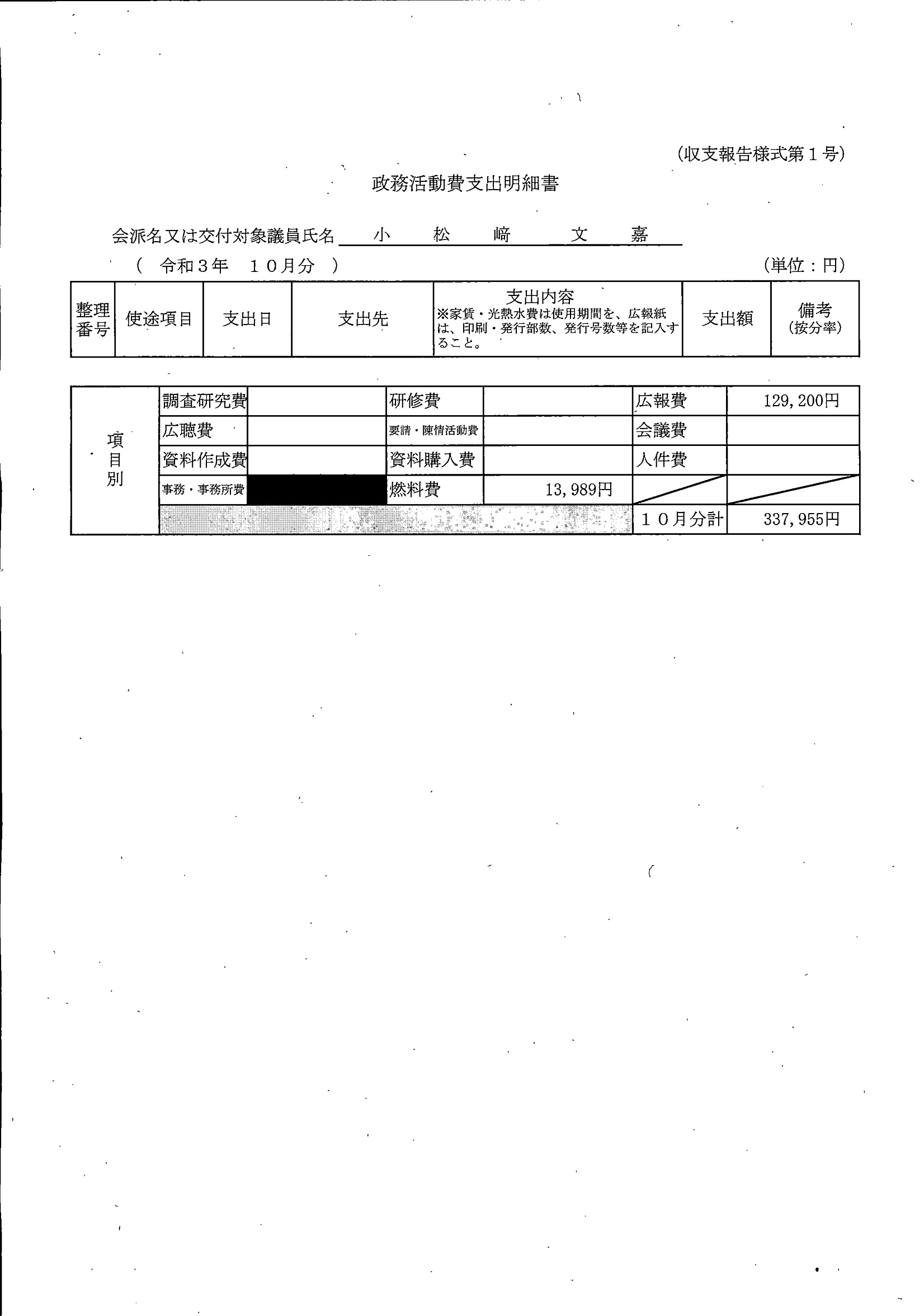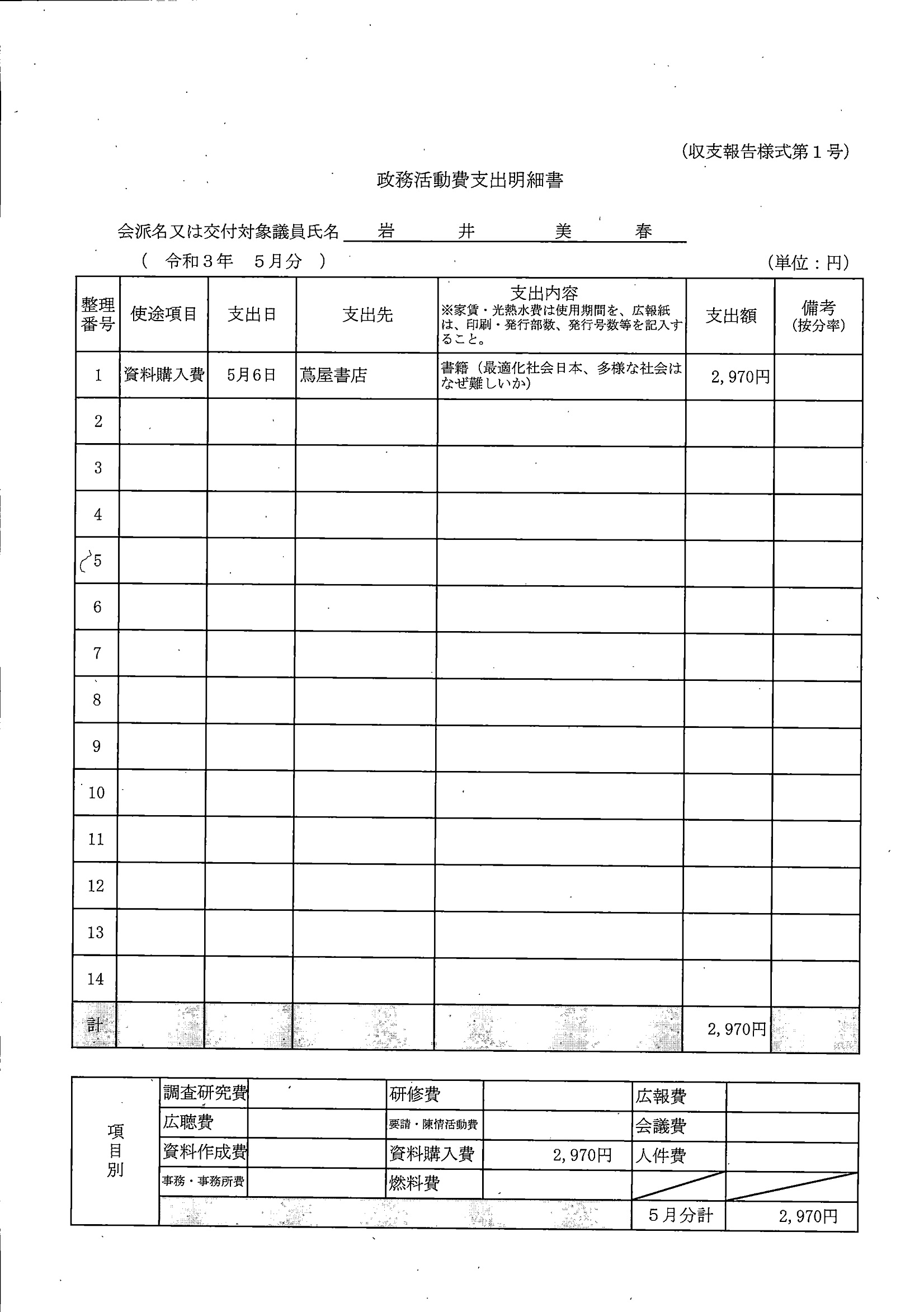 千葉市議会トップページ > 広報・情報公開 > 政務活動費 > 令和3年度交付分(政務活動費収支報告書)
