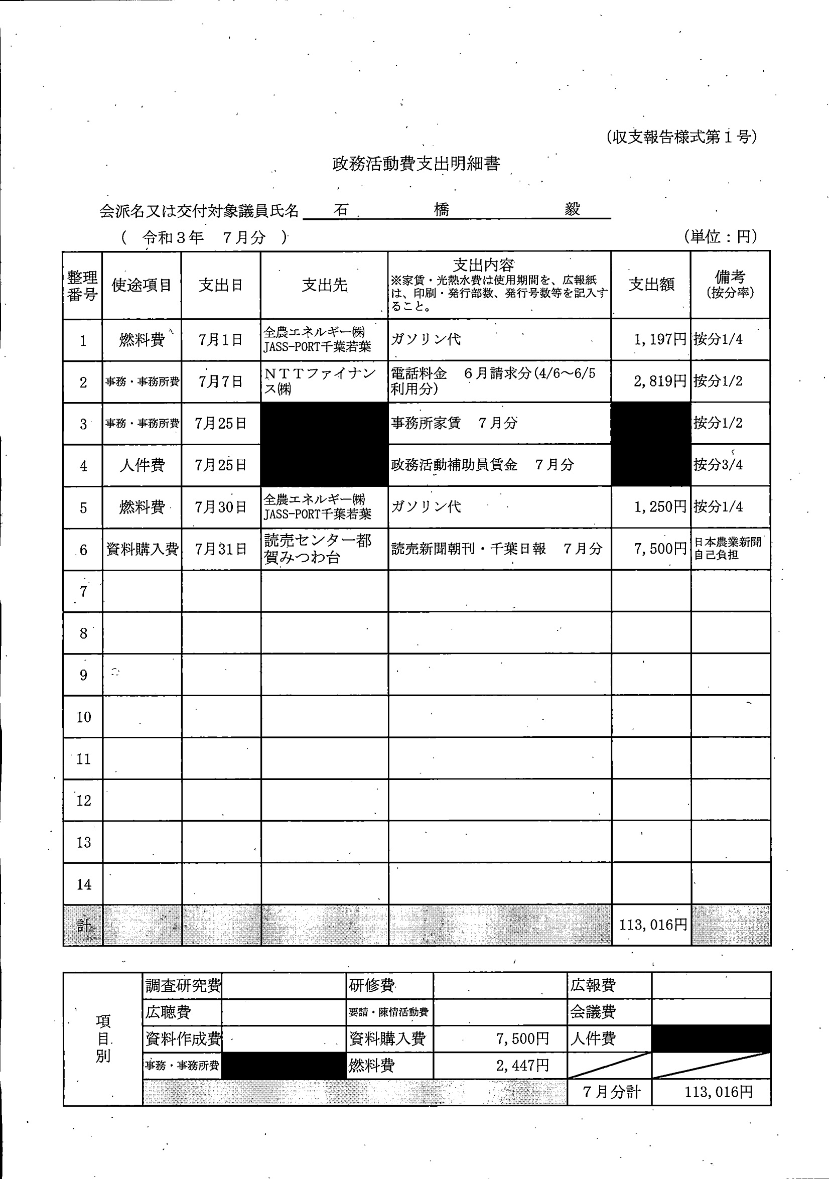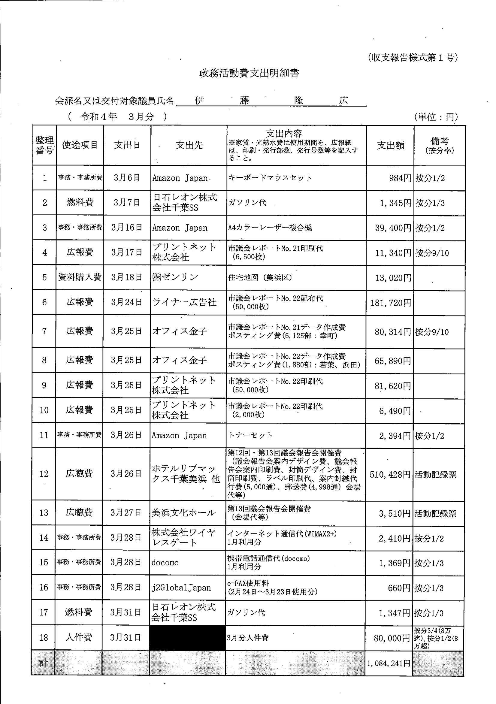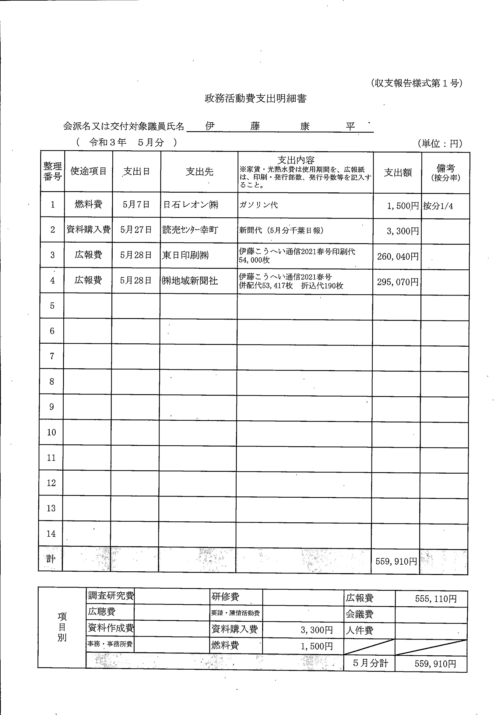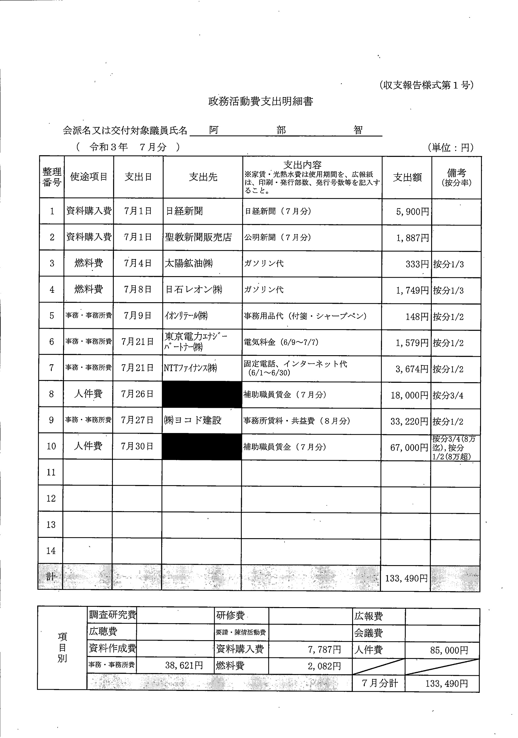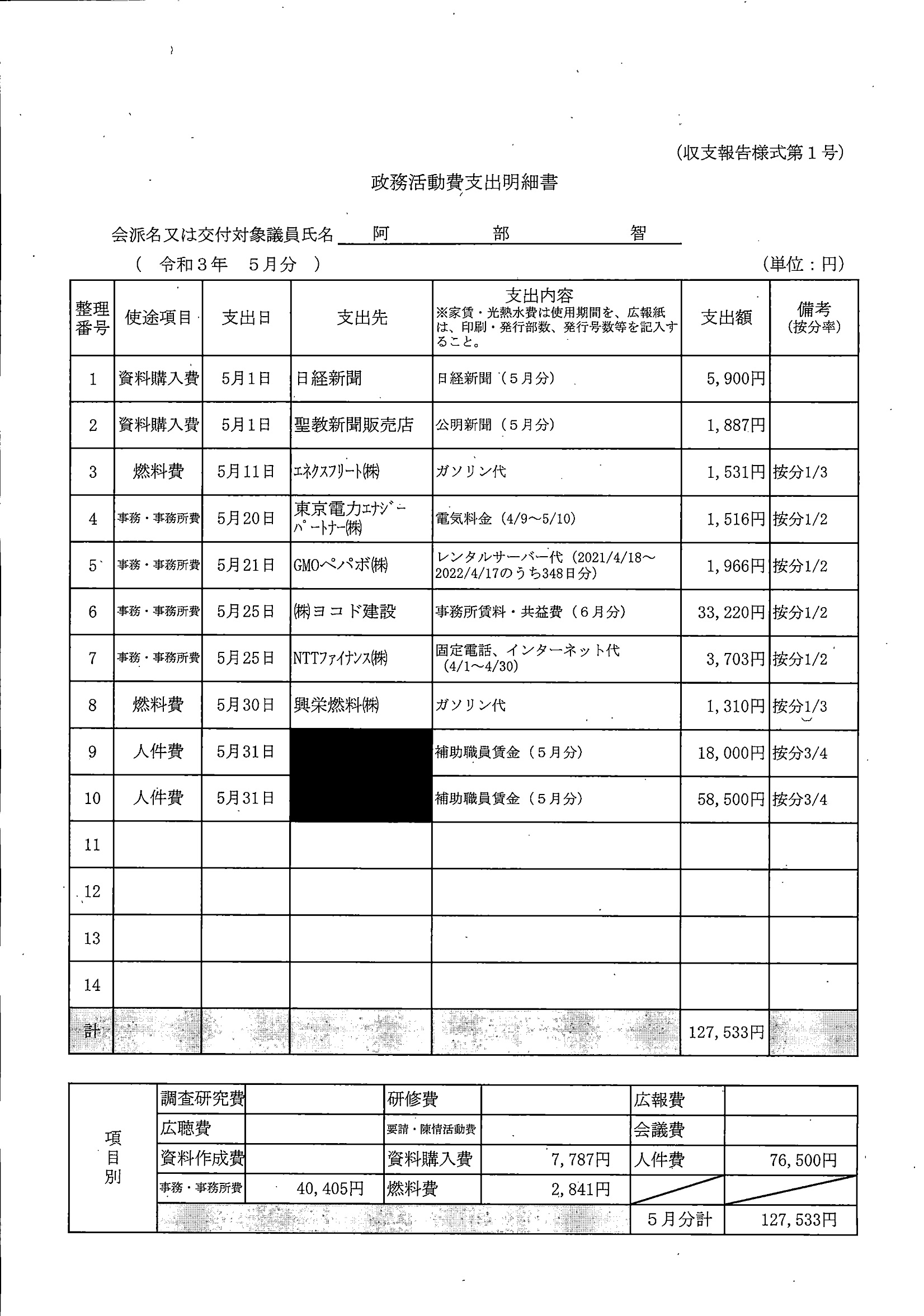 千葉市議会トップページ > 広報・情報公開 > 政務活動費 > 令和3年度交付分(政務活動費収支報告書)