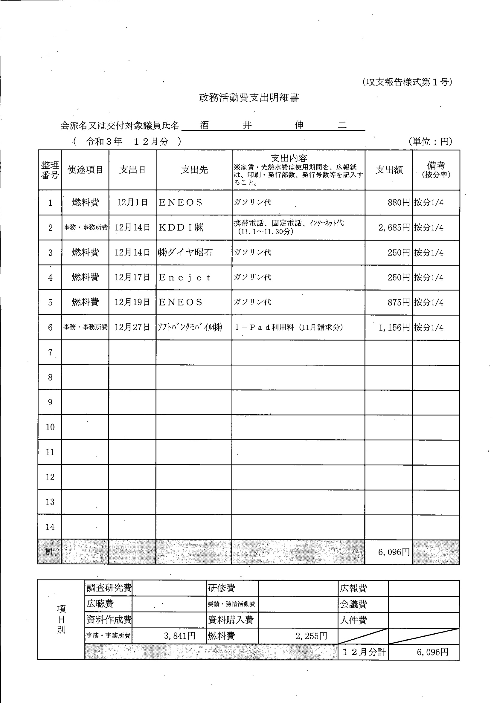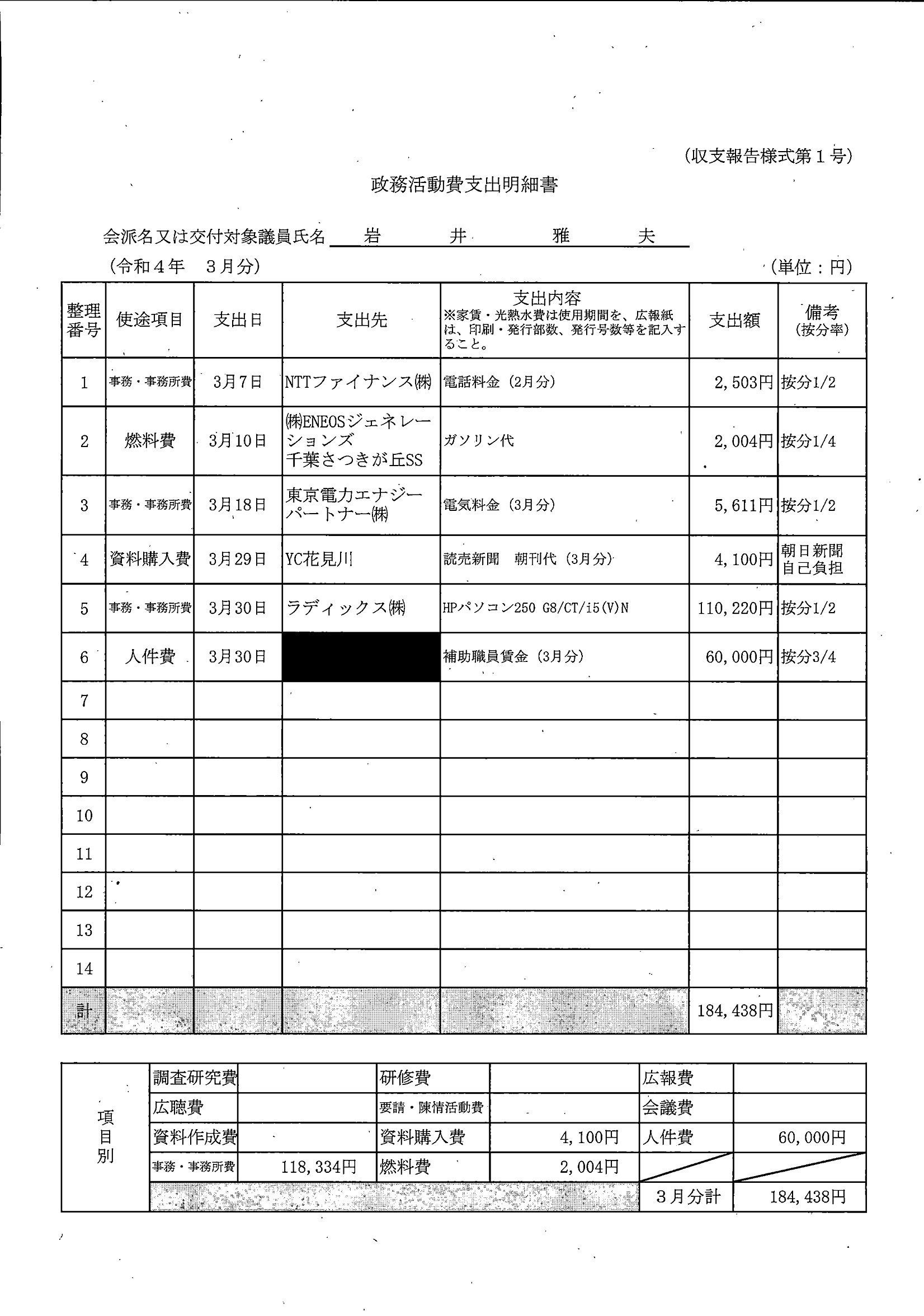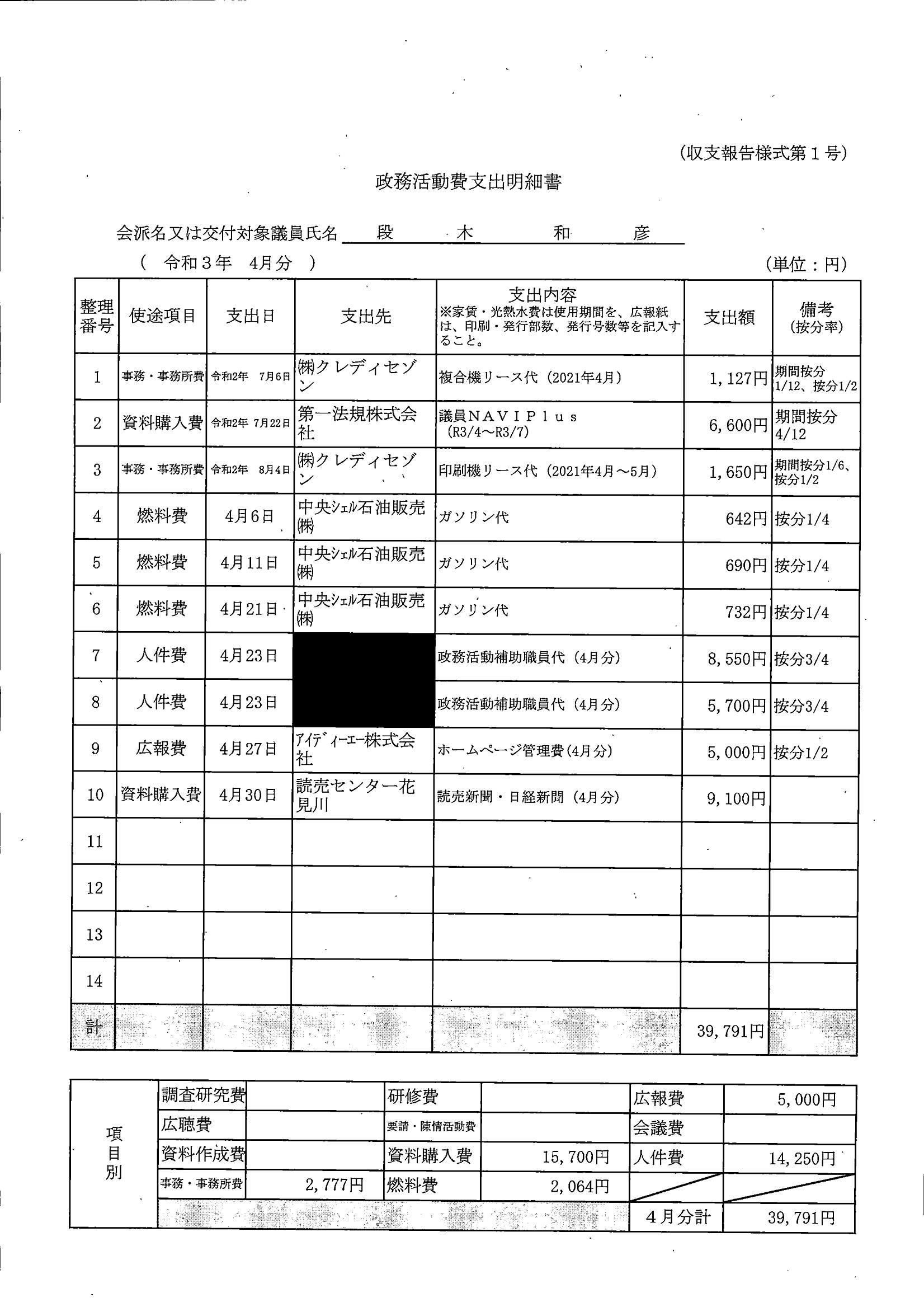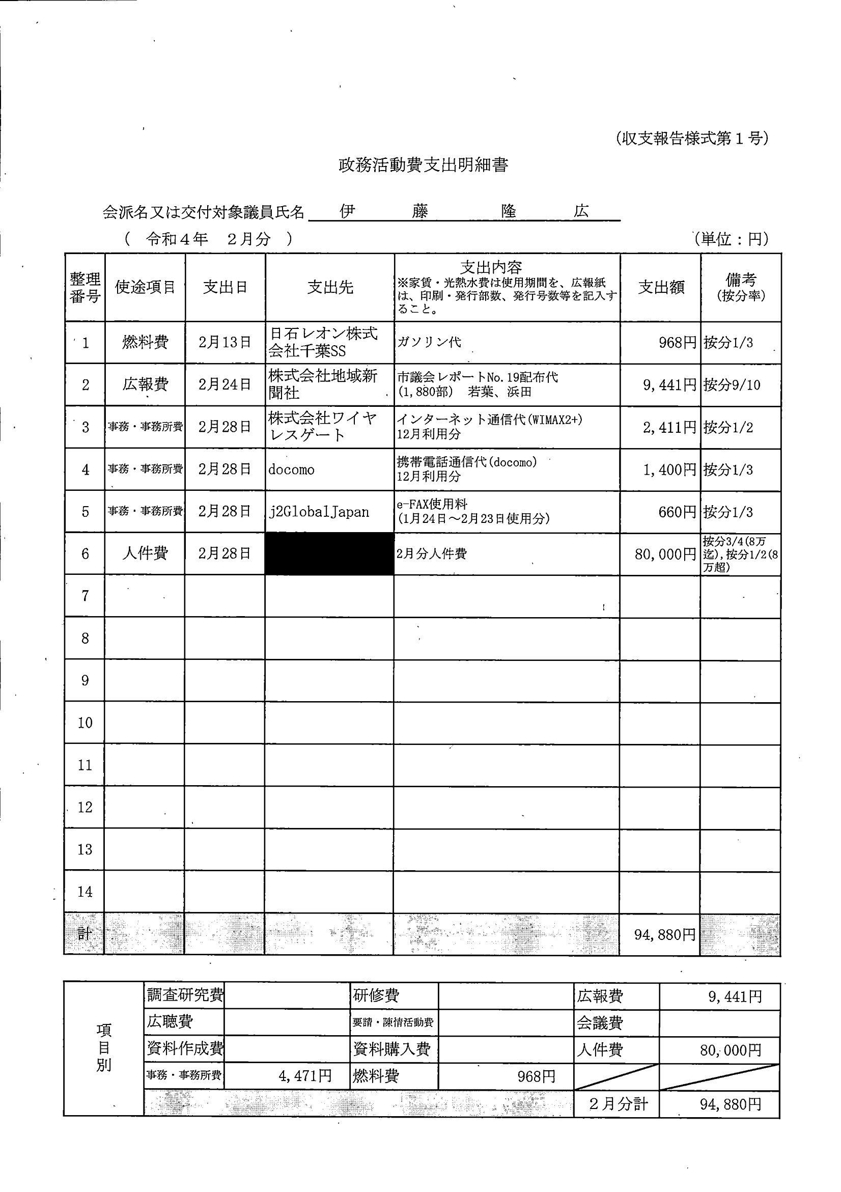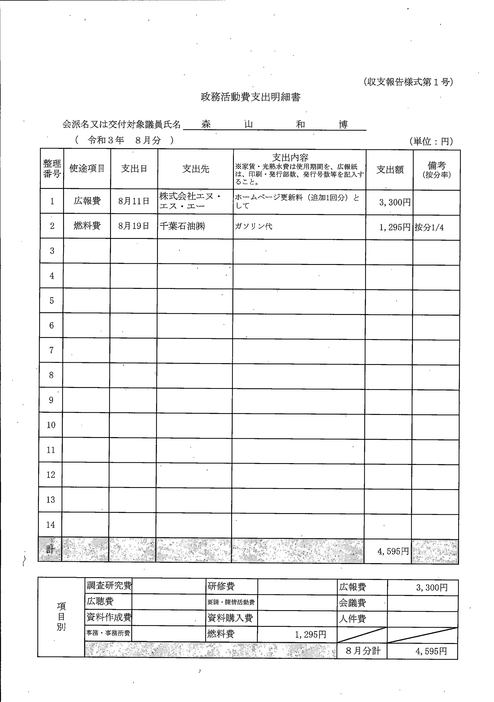 千葉市議会トップページ > 広報・情報公開 > 政務活動費 > 令和3年度交付分(政務活動費収支報告書)