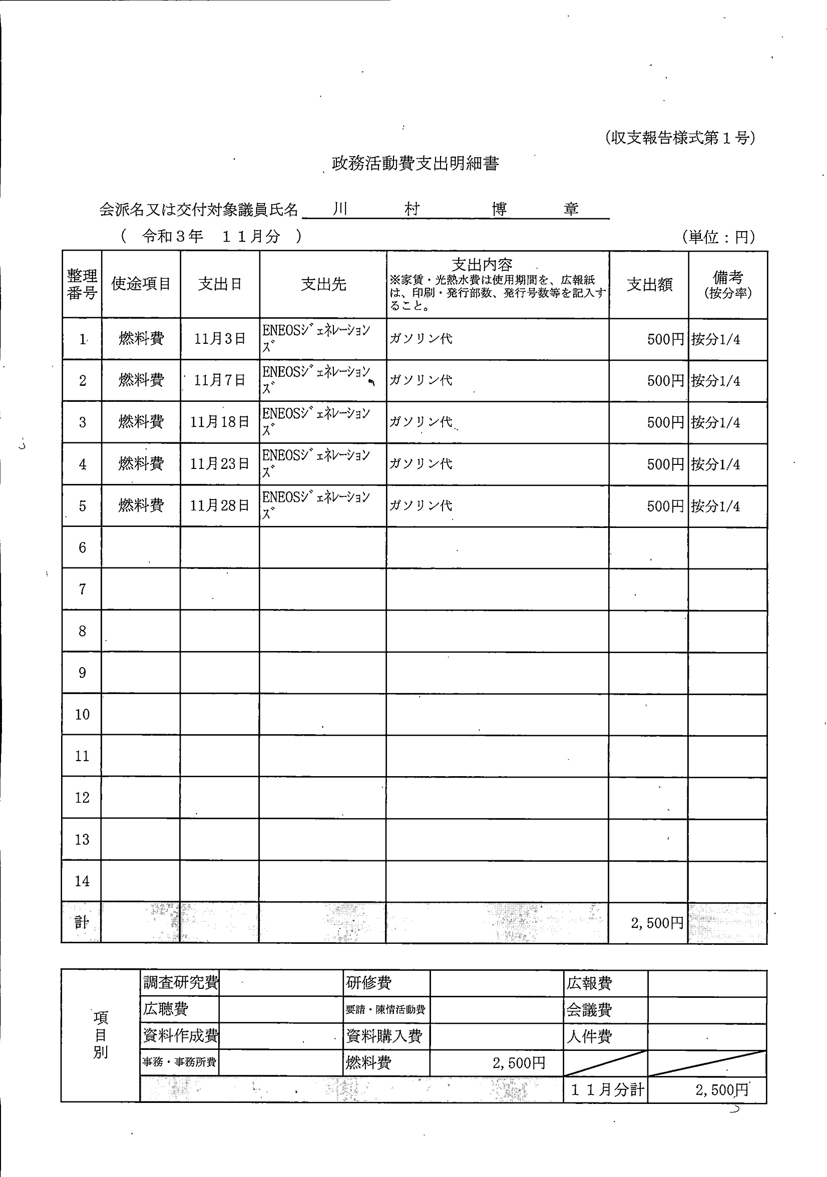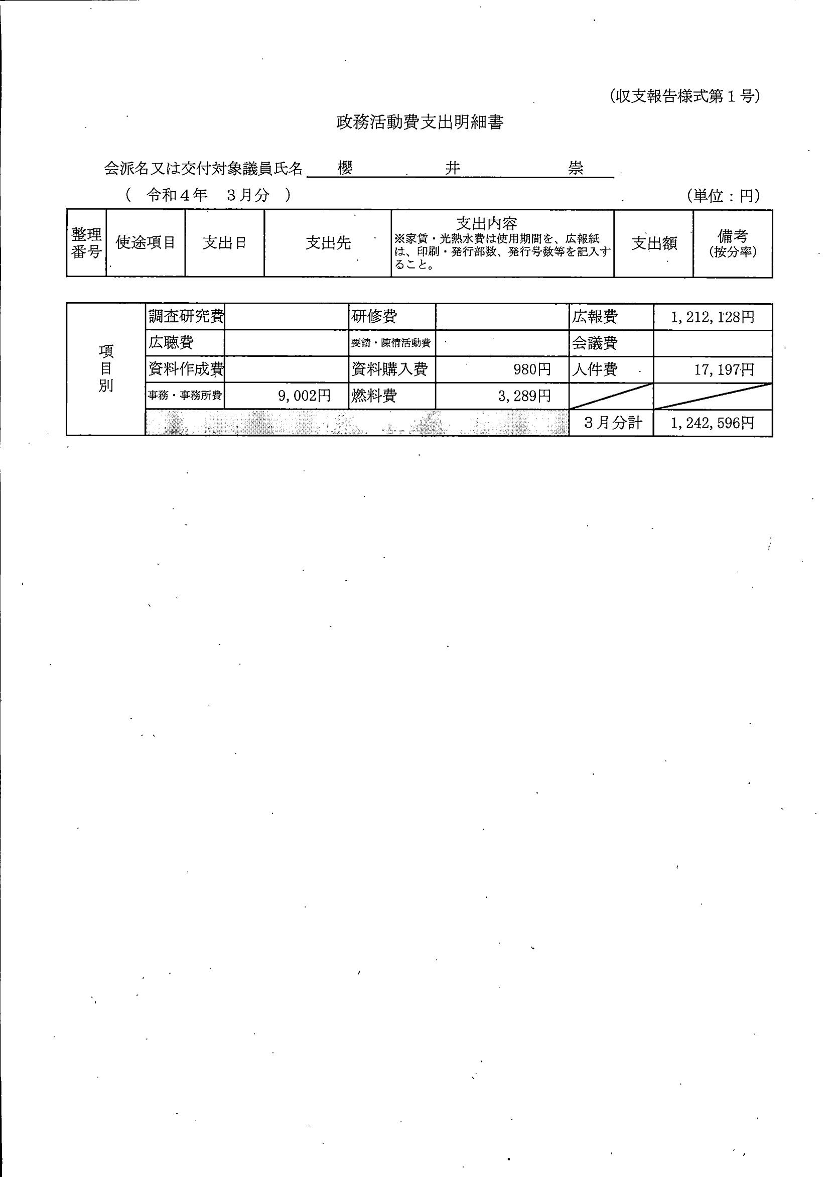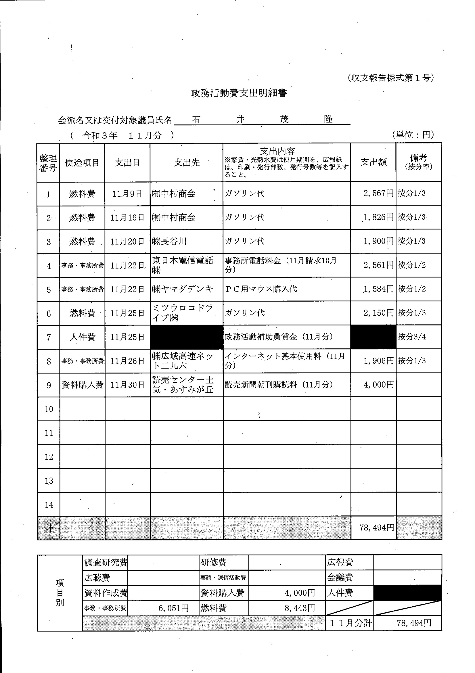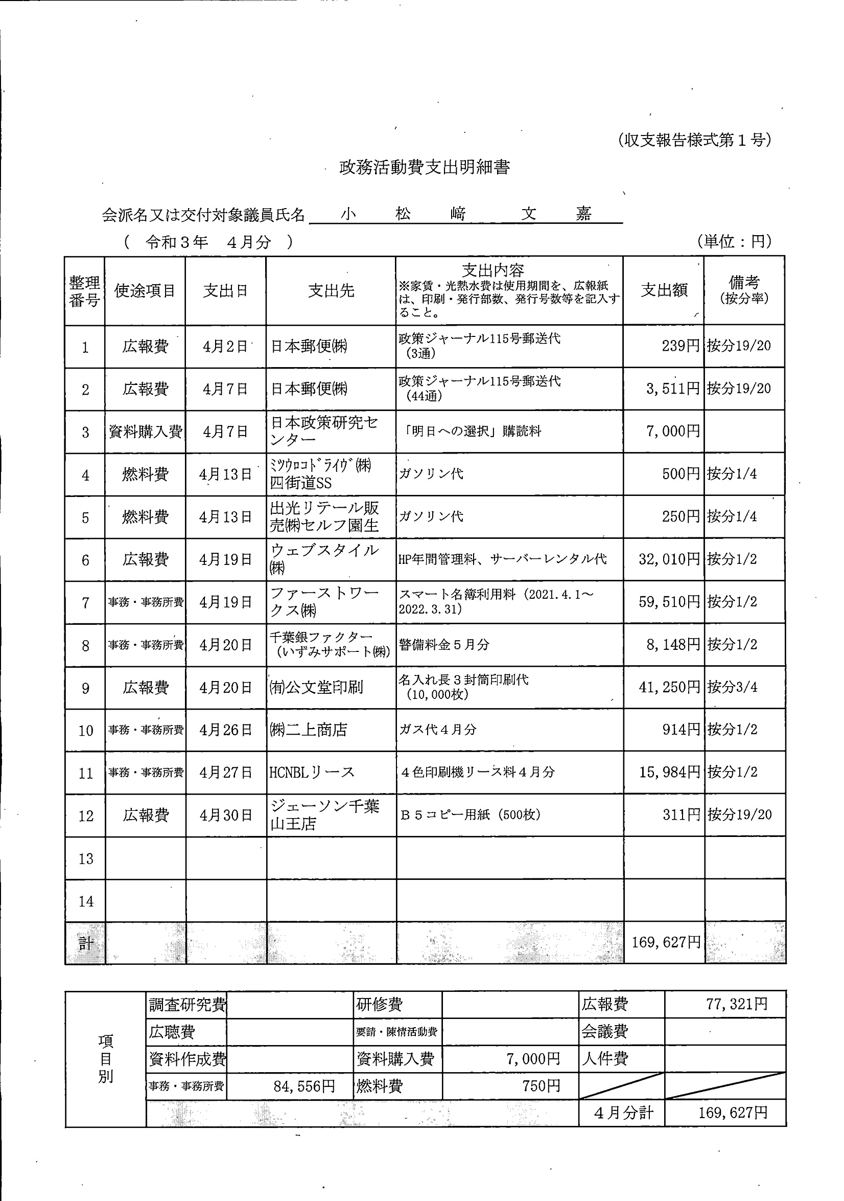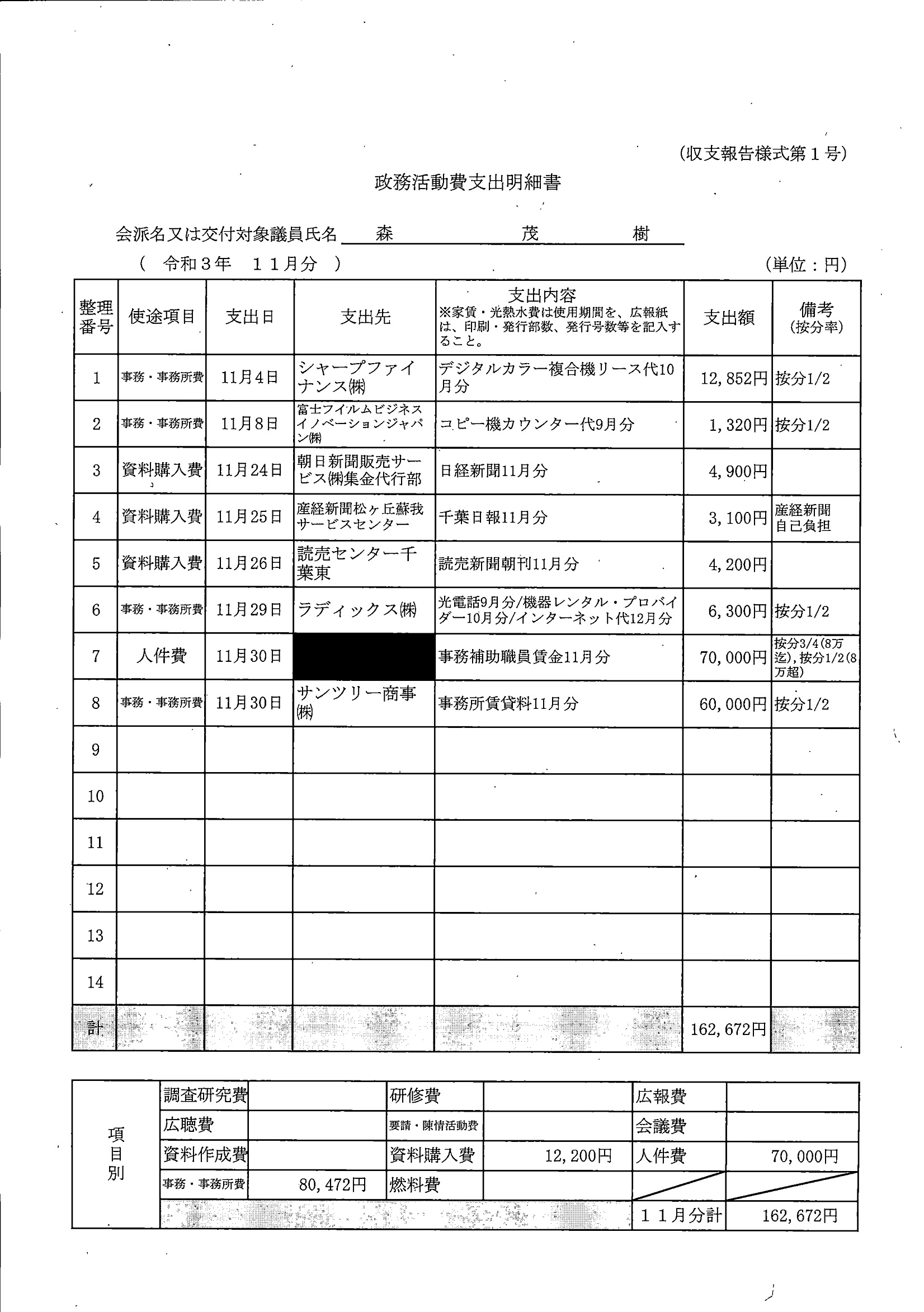 千葉市議会トップページ > 広報・情報公開 > 政務活動費 > 令和3年度交付分(政務活動費収支報告書)
