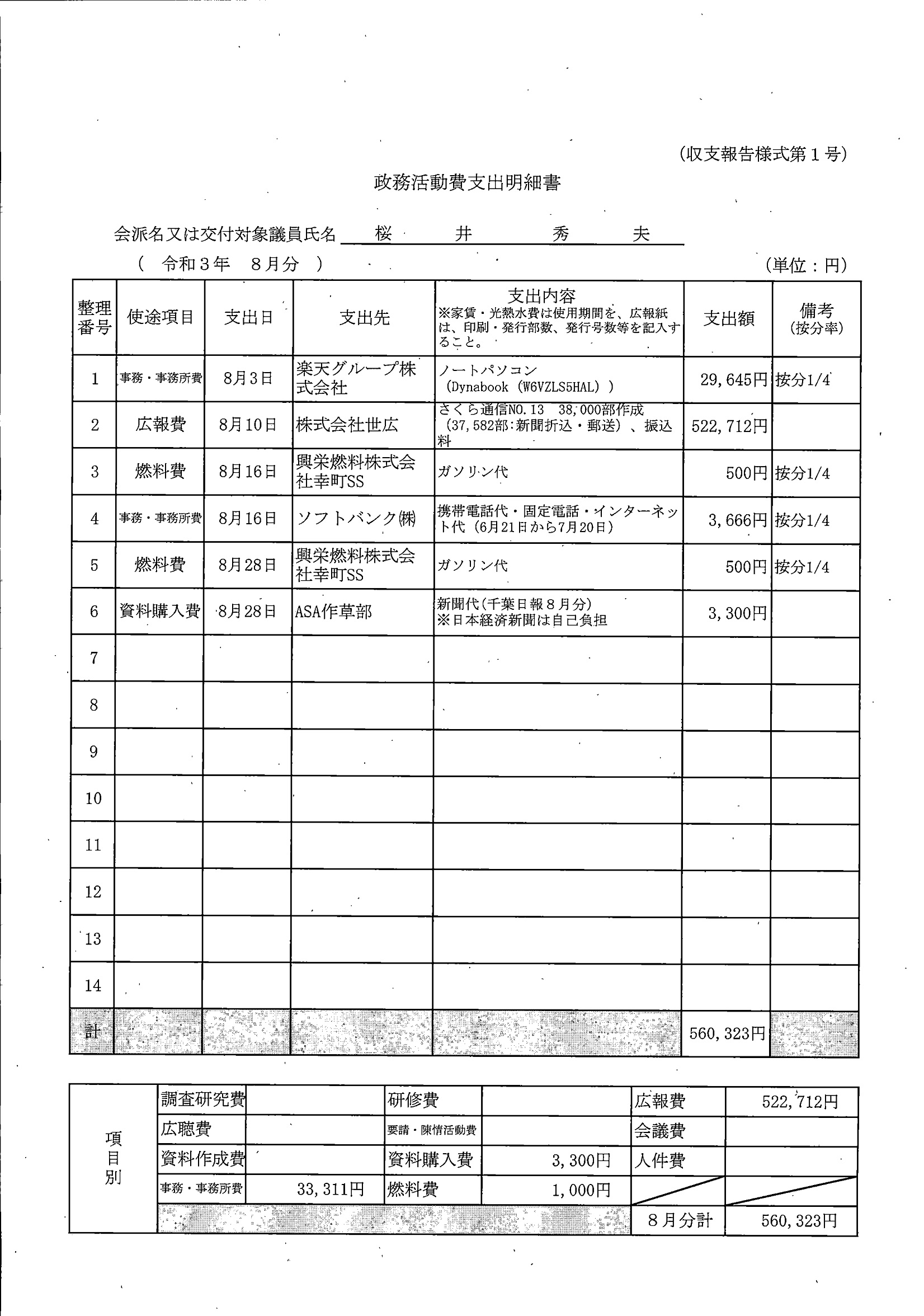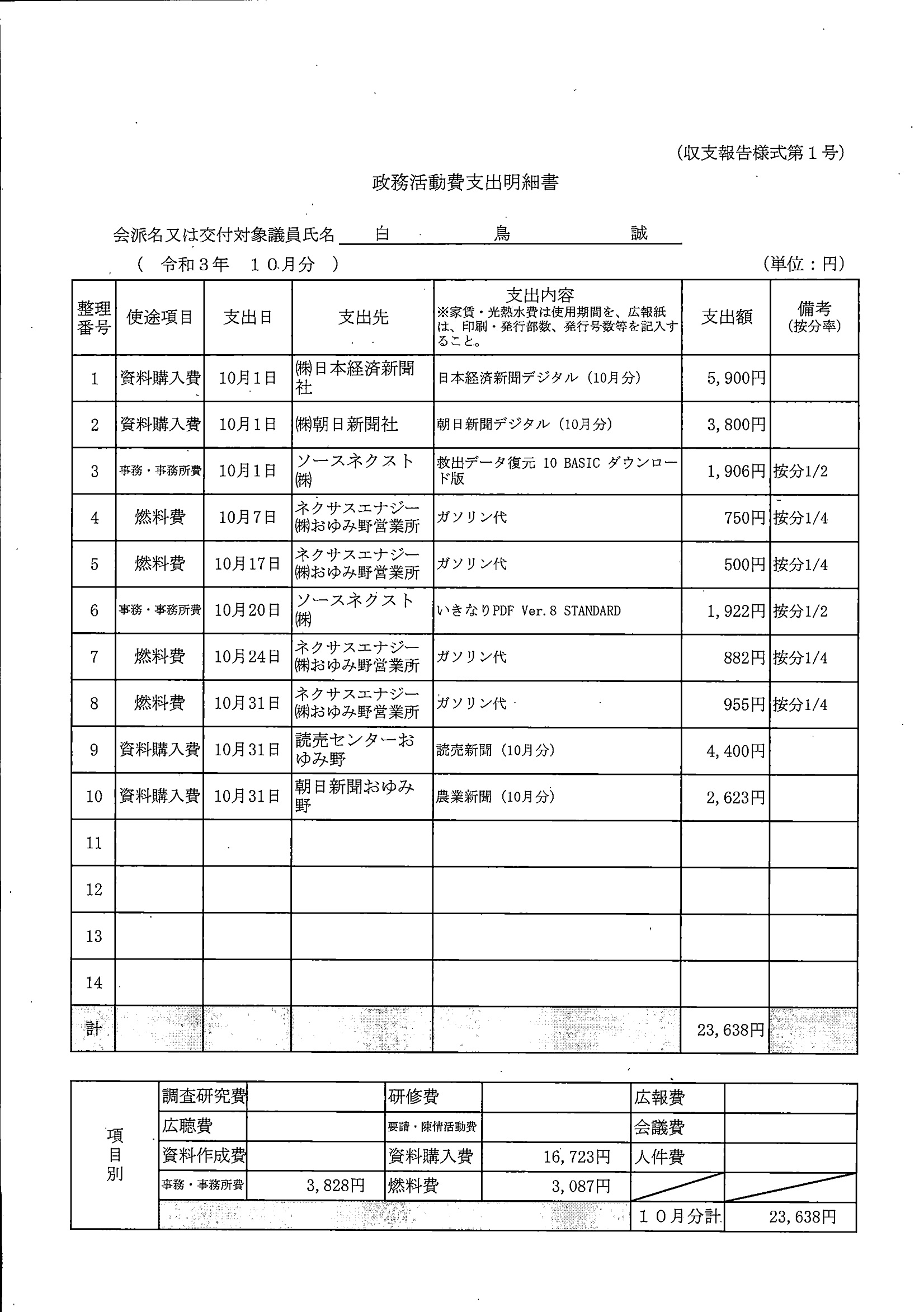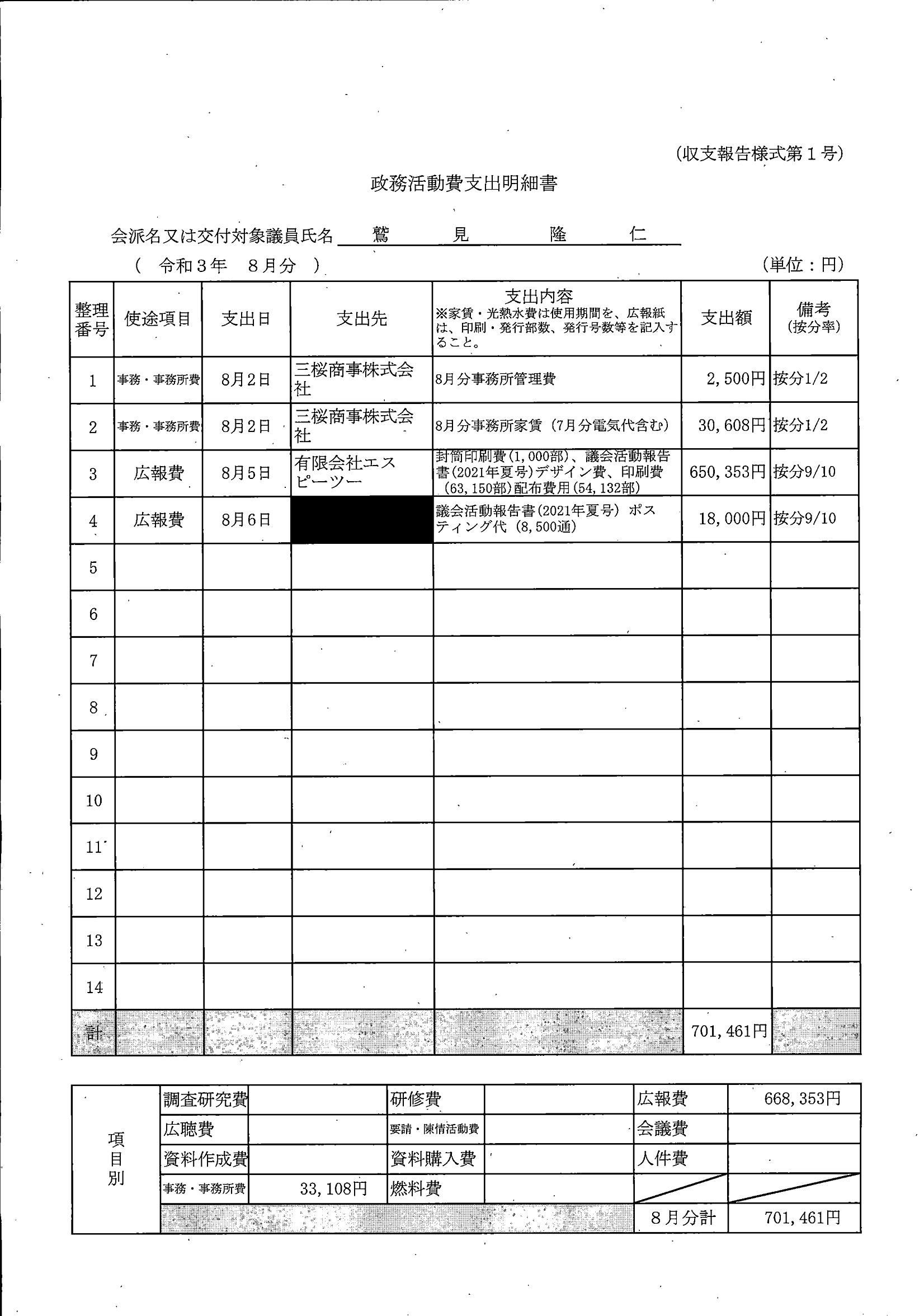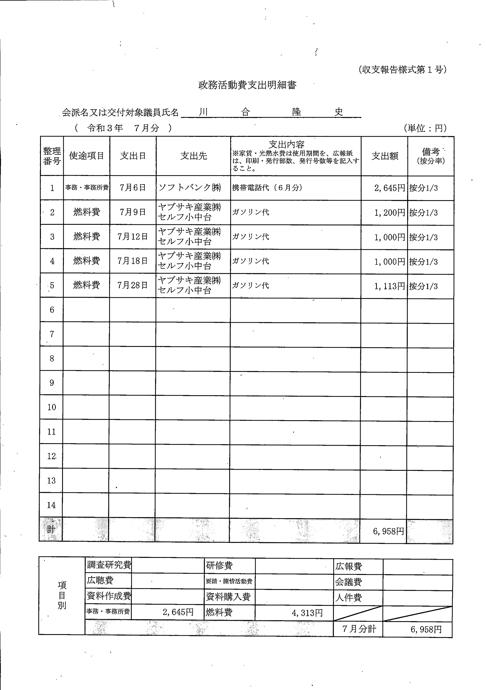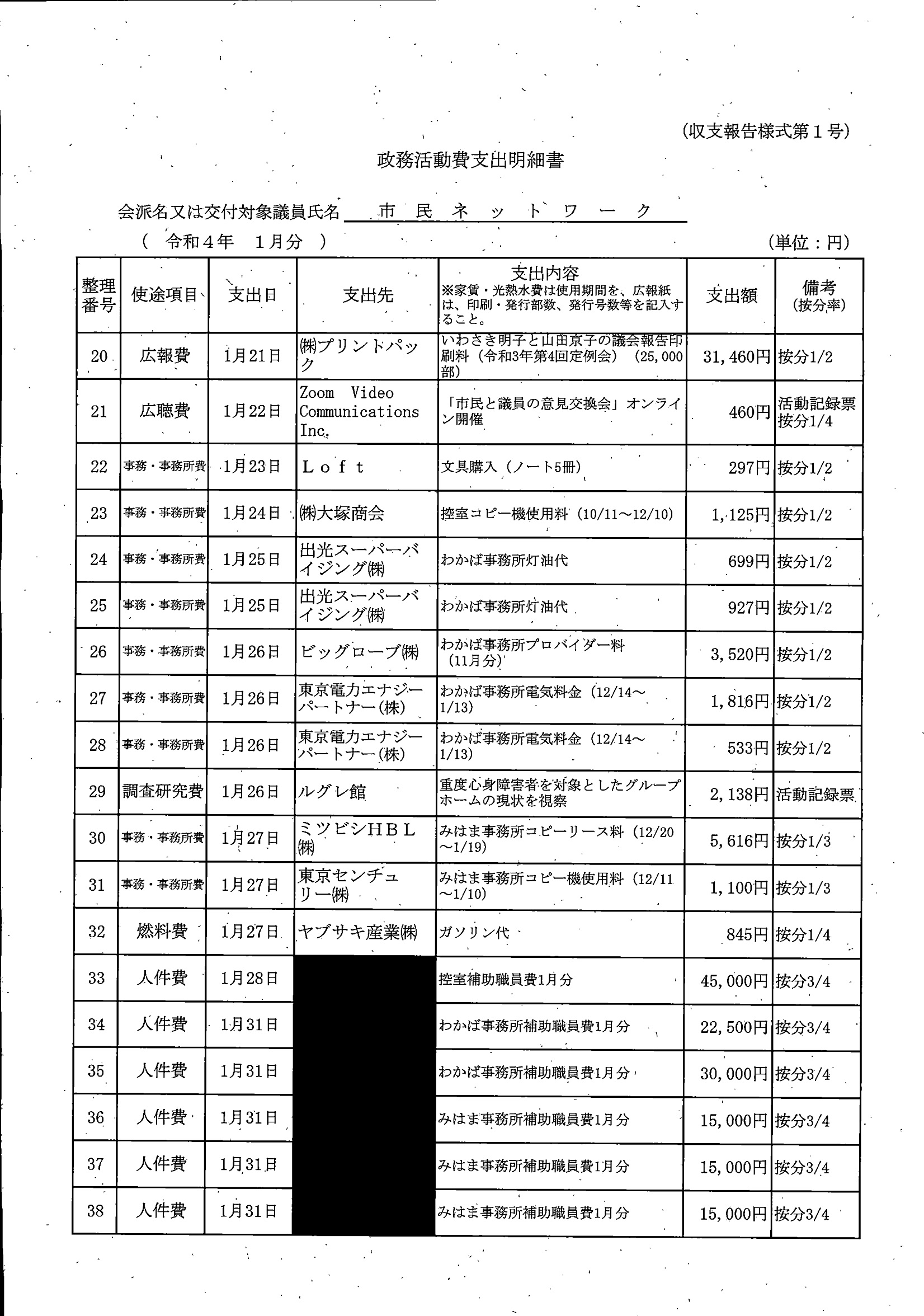 千葉市議会トップページ > 広報・情報公開 > 政務活動費 > 令和3年度交付分(政務活動費収支報告書)