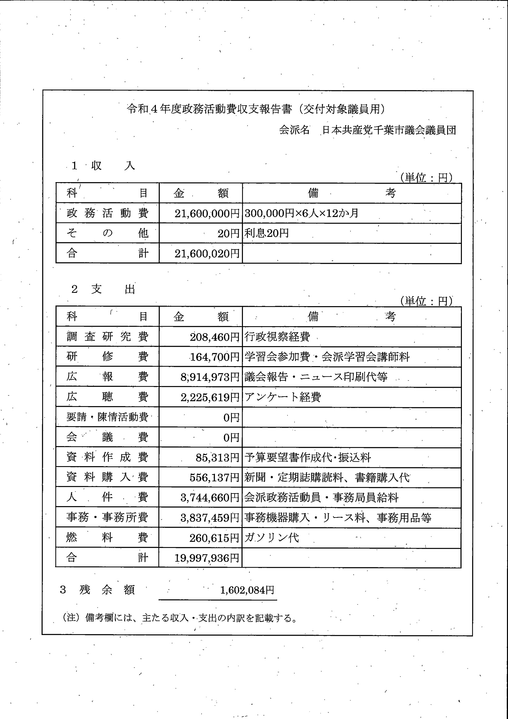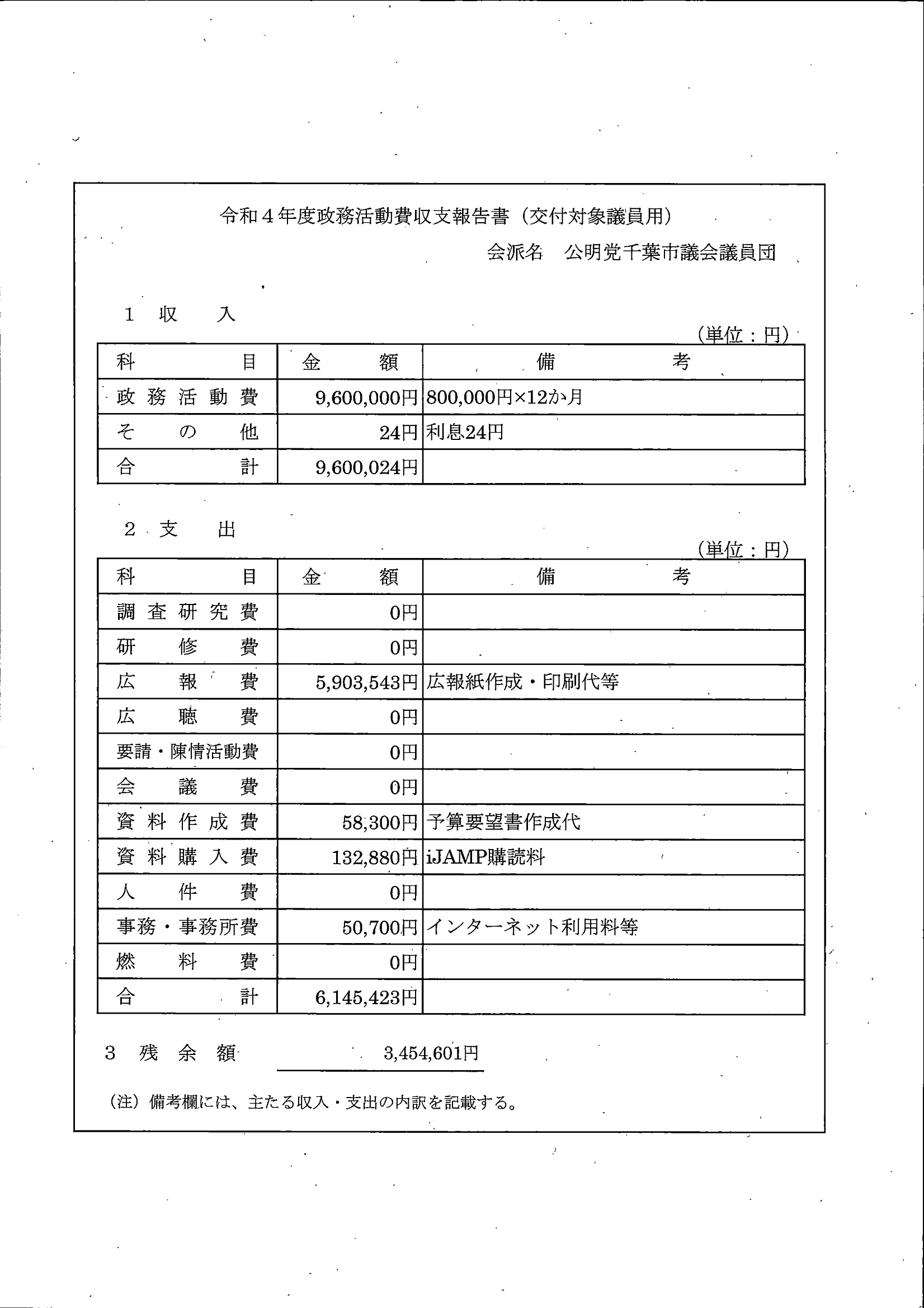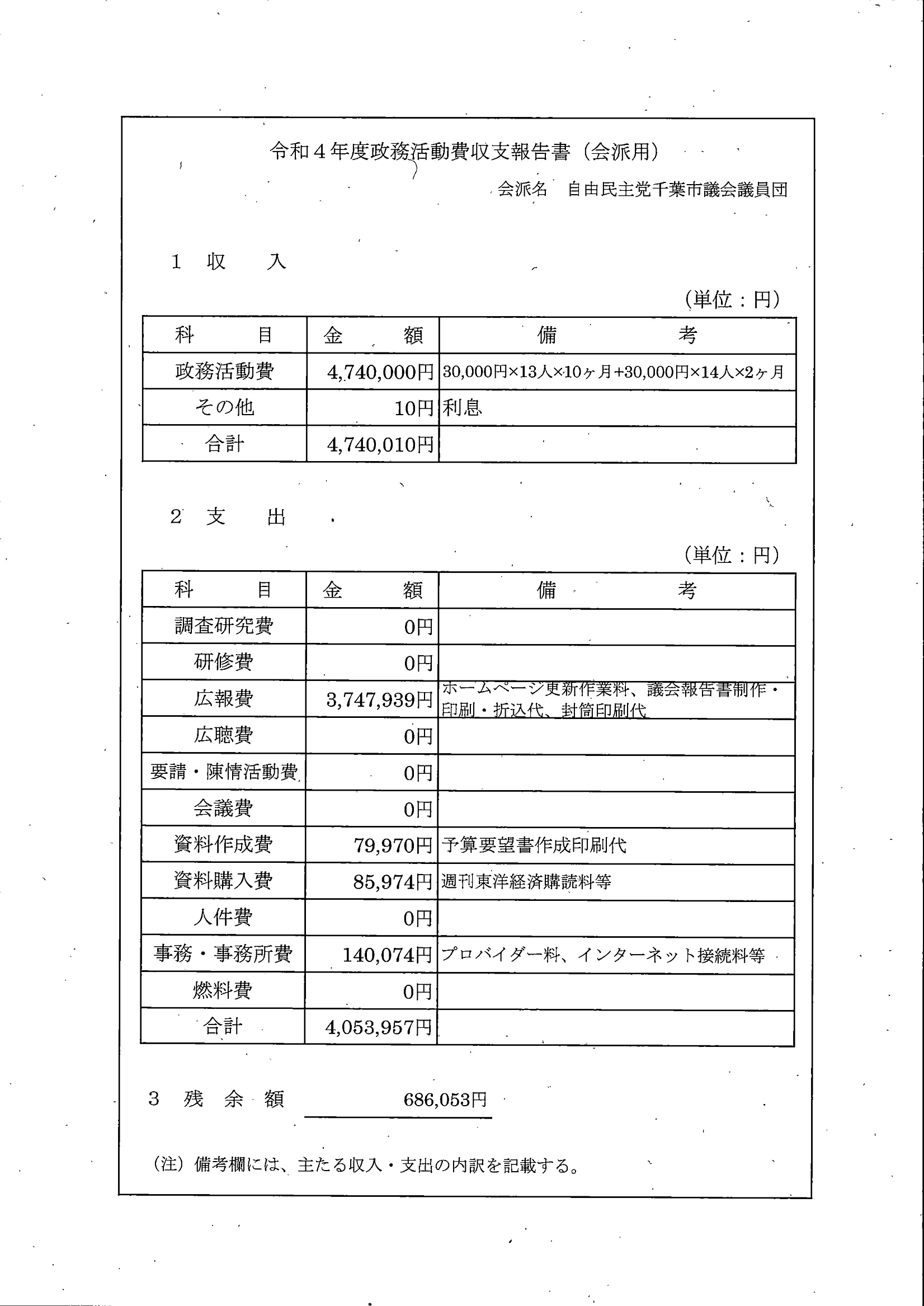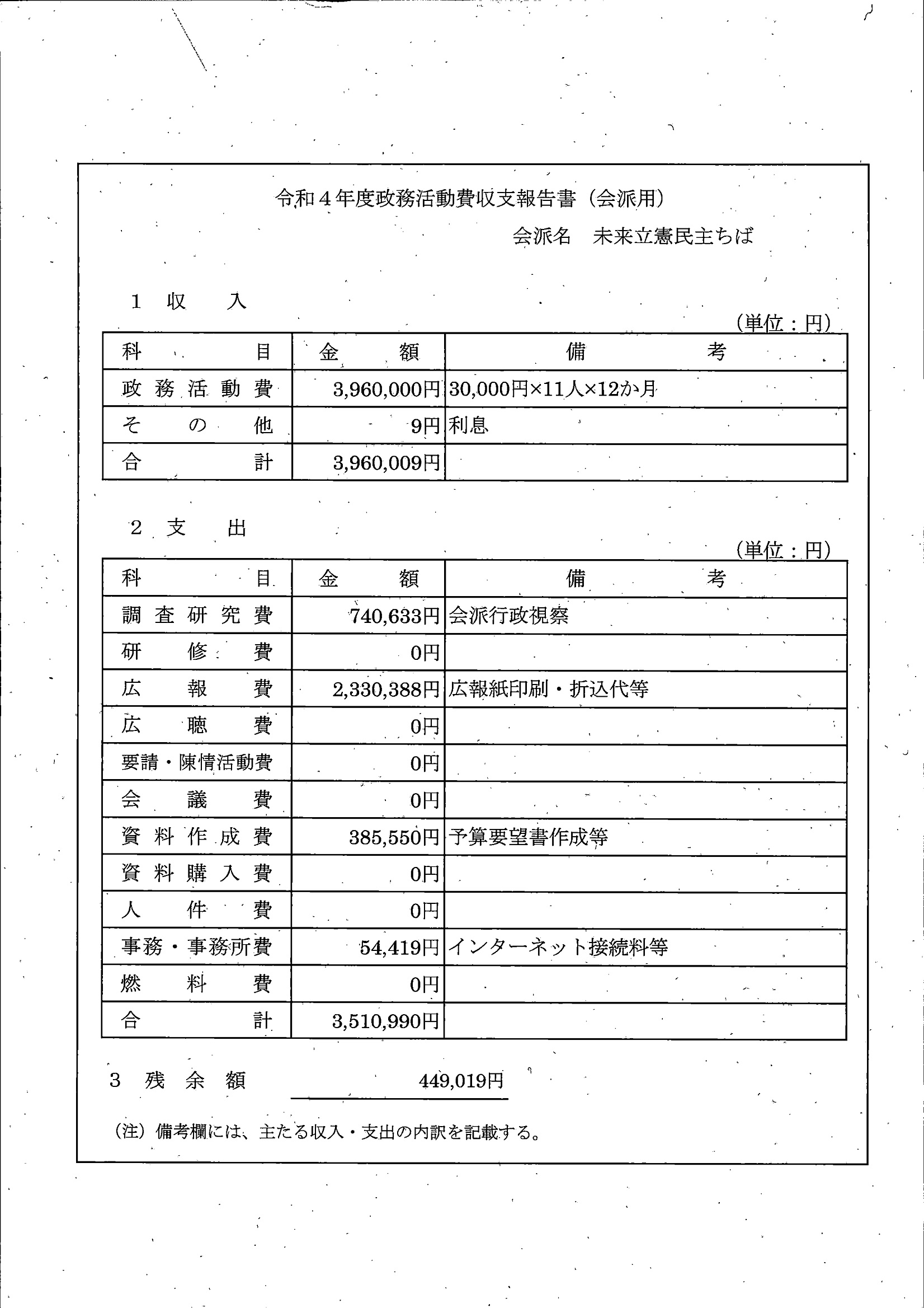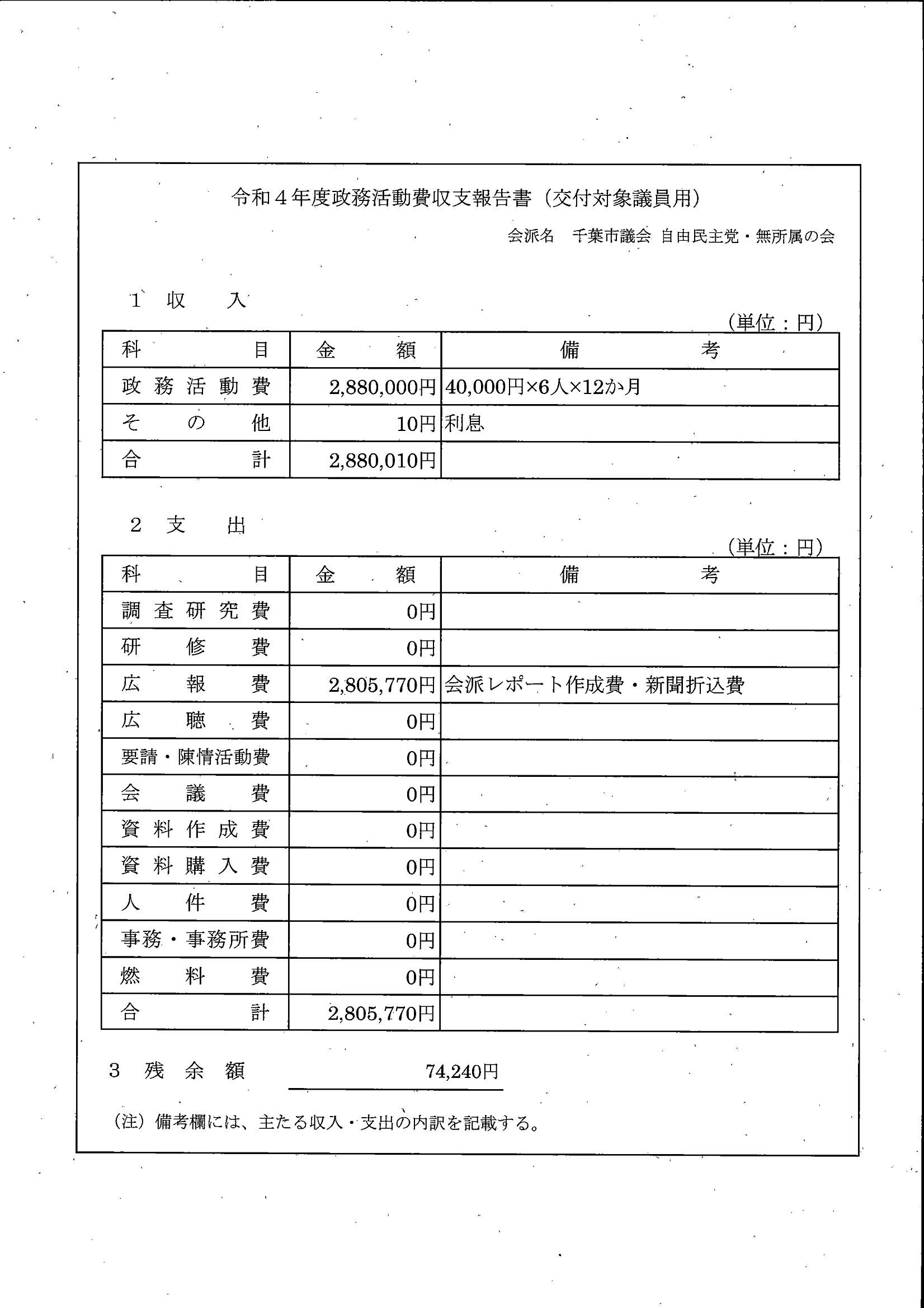 千葉市議会トップページ > 広報・情報公開 > 政務活動費 > 令和4年度交付分(政務活動費収支報告書)