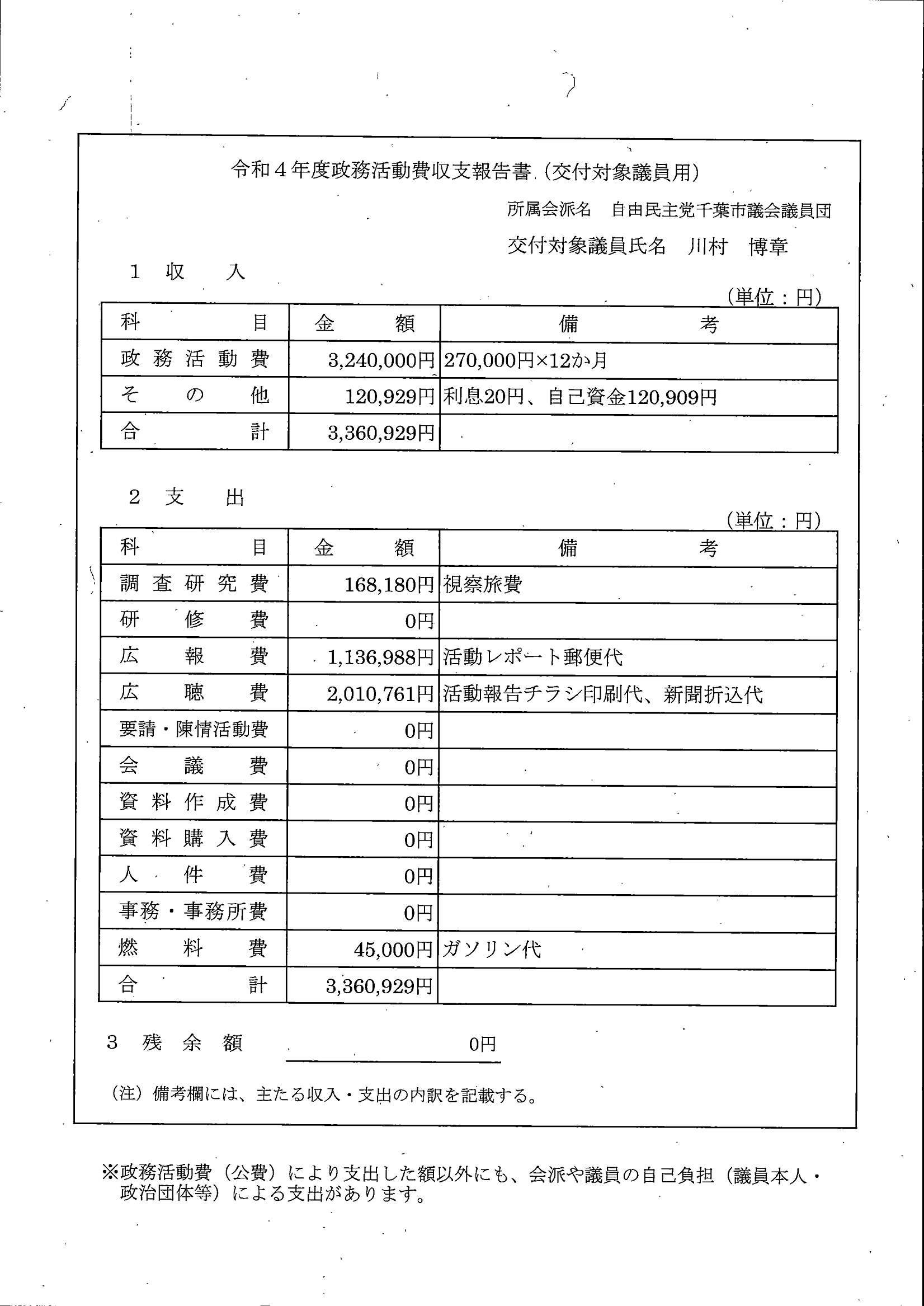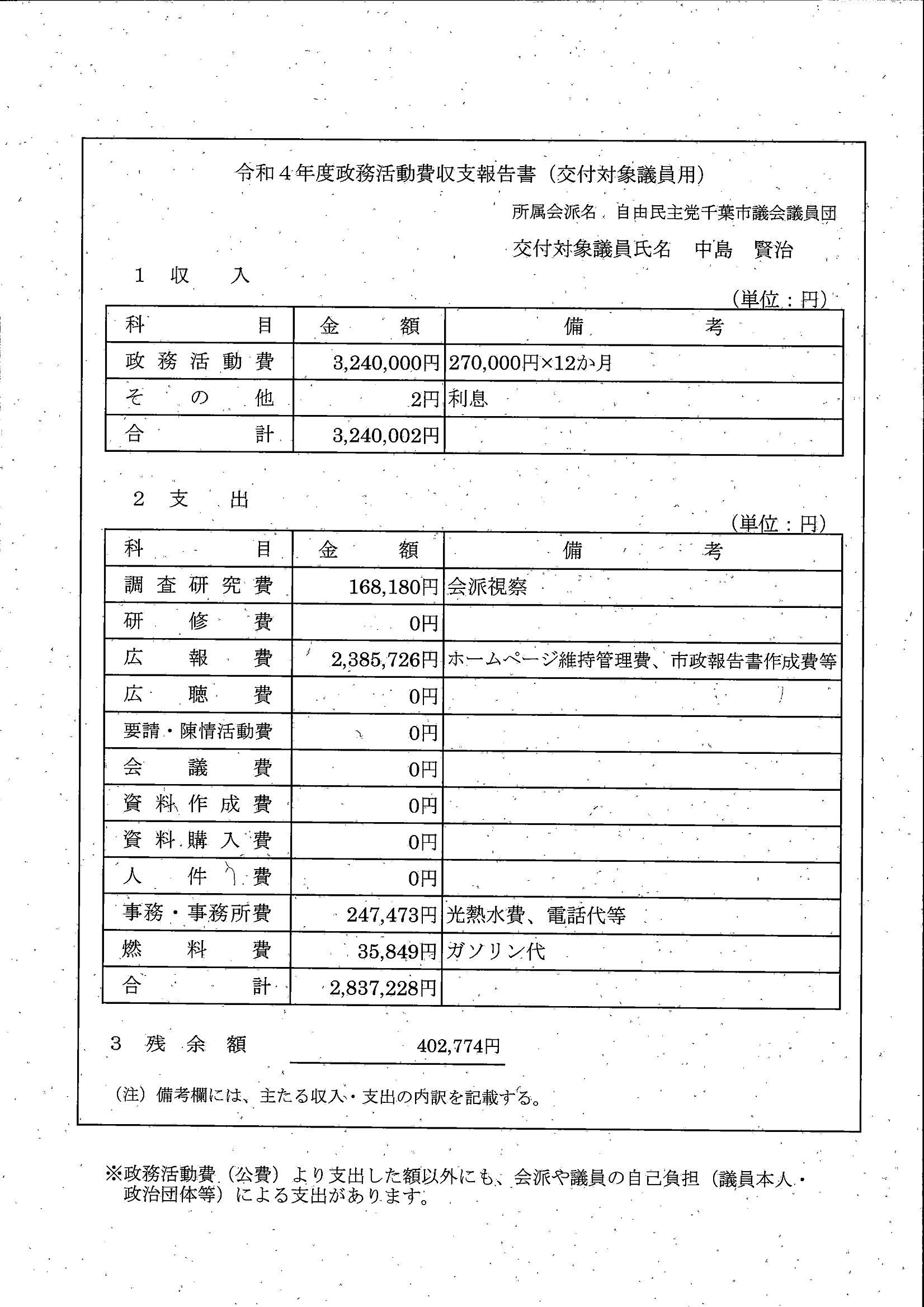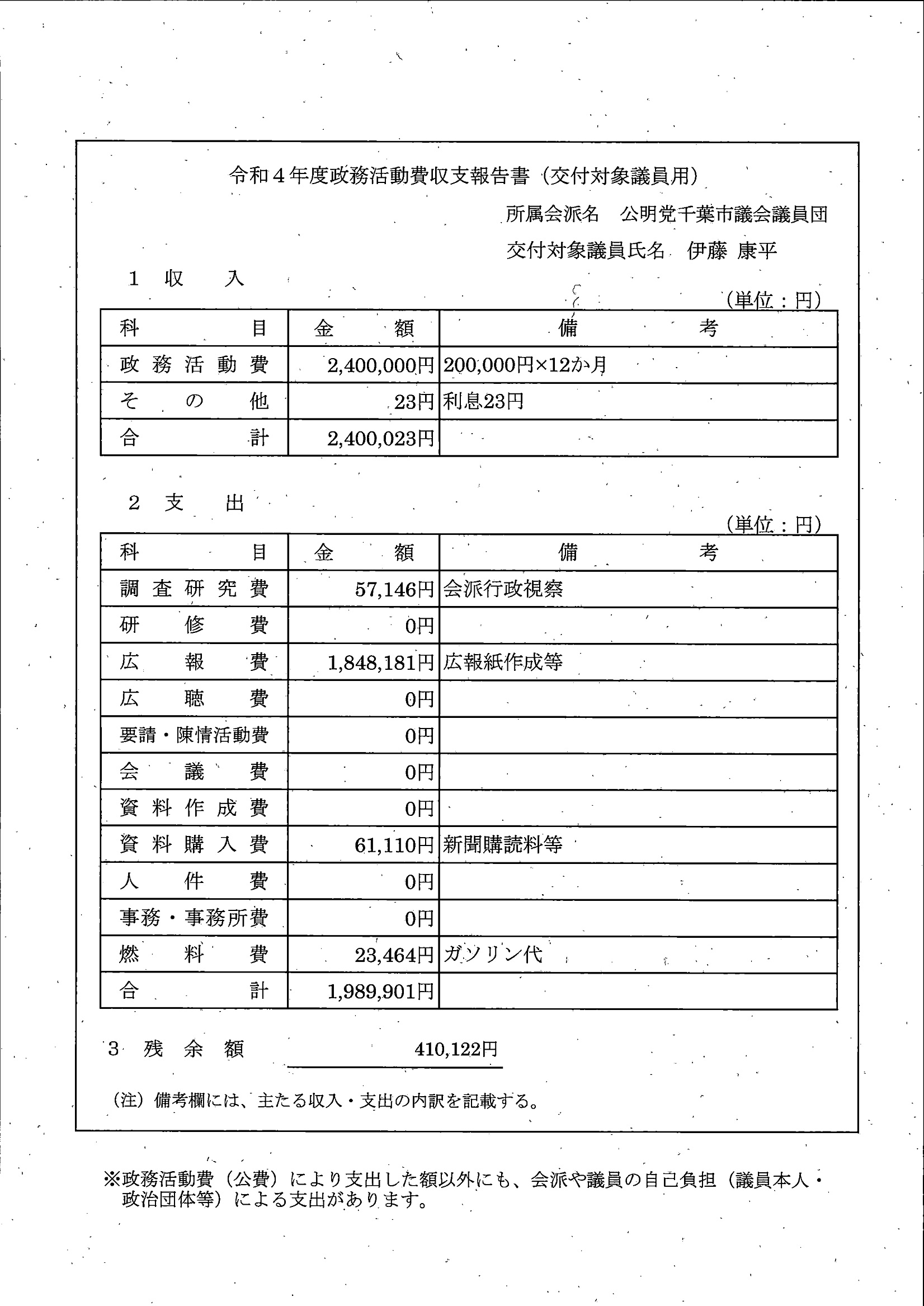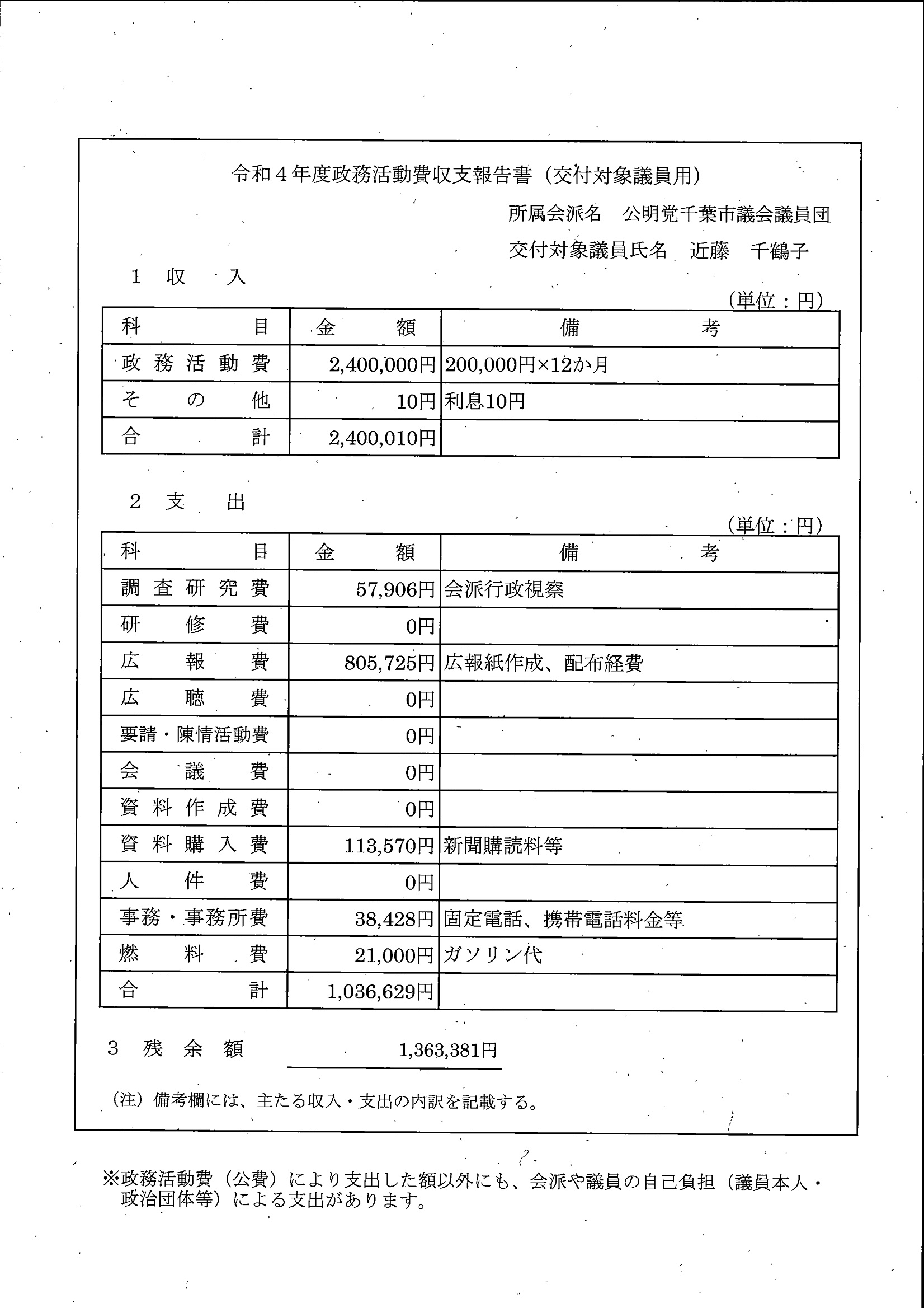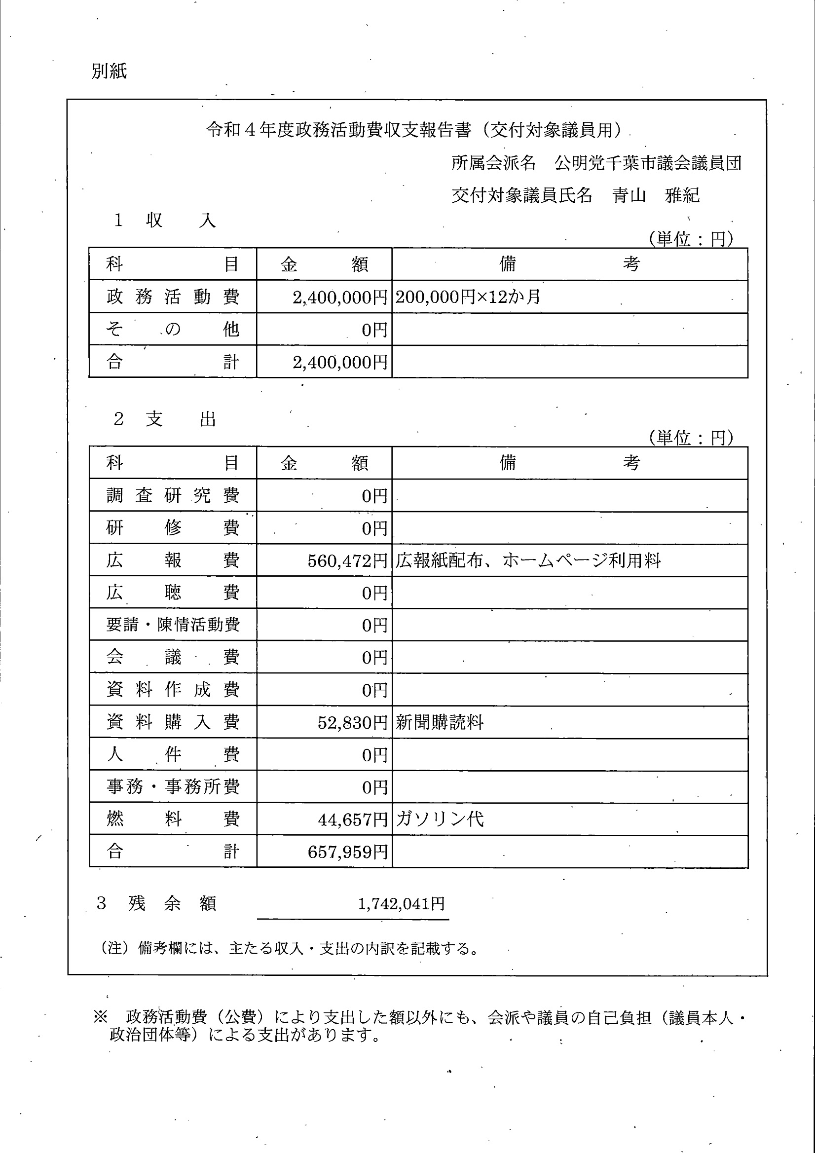 千葉市議会トップページ > 広報・情報公開 > 政務活動費 > 令和4年度交付分(政務活動費収支報告書)
