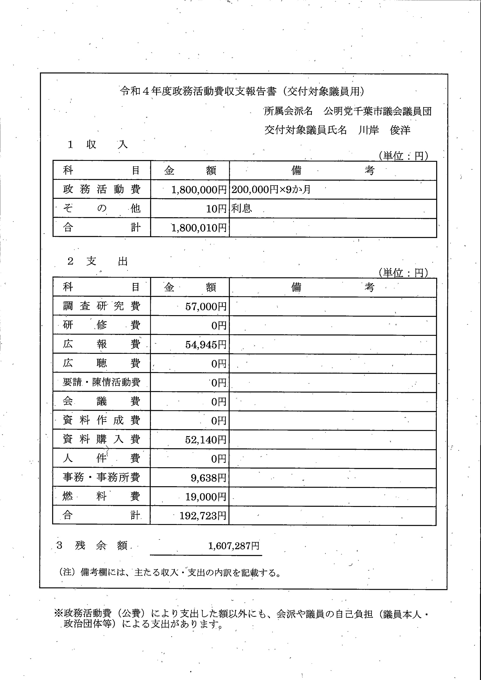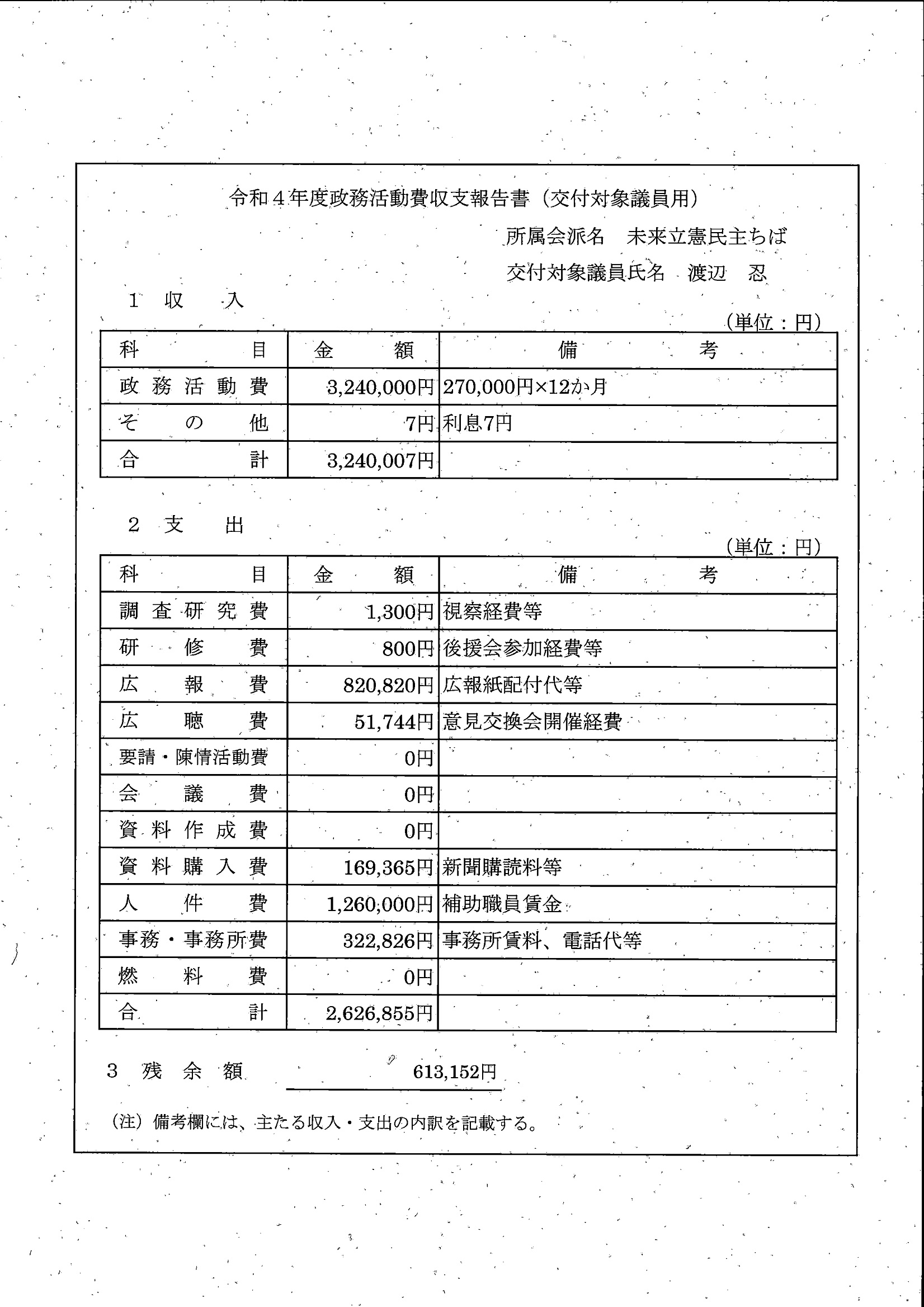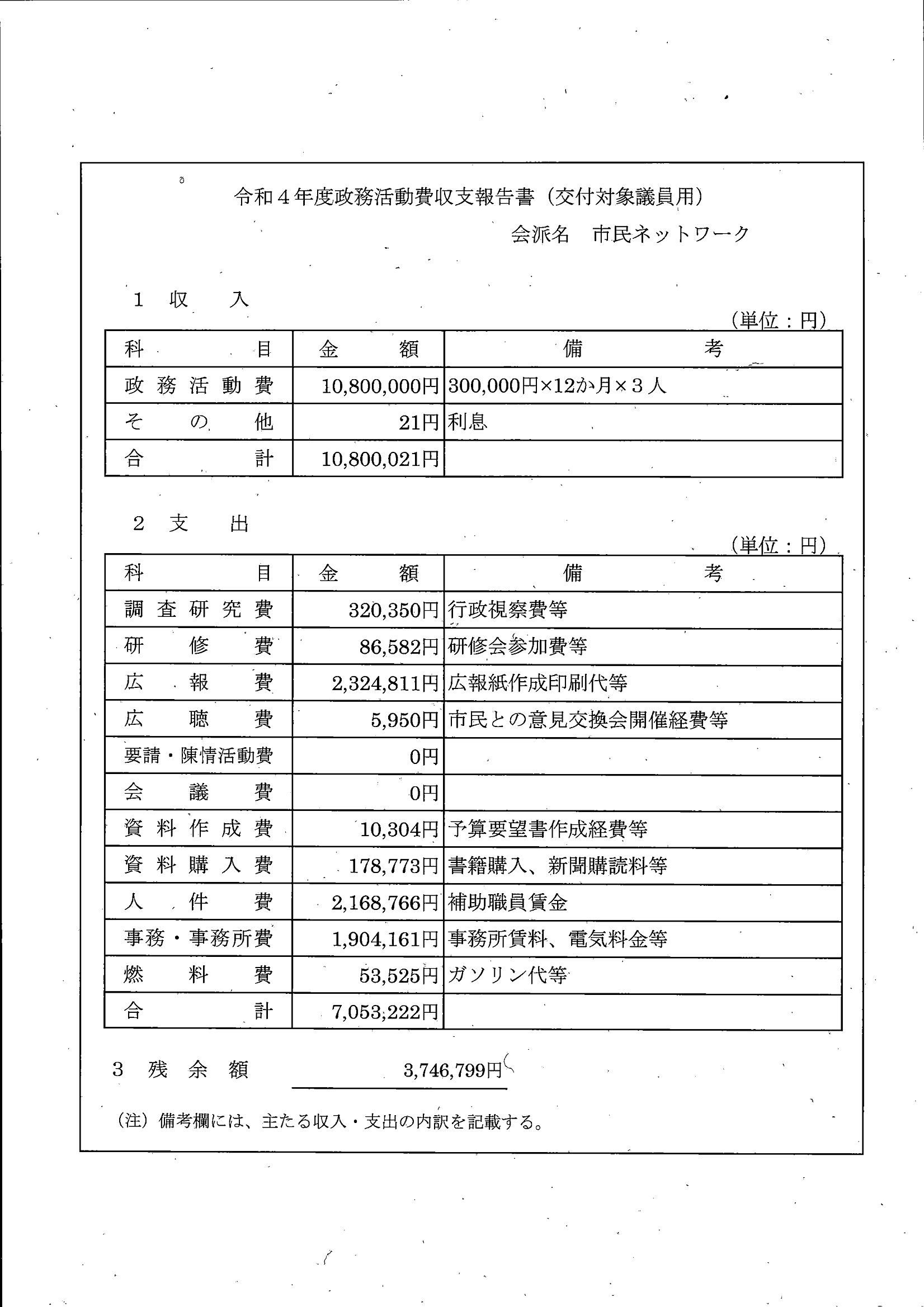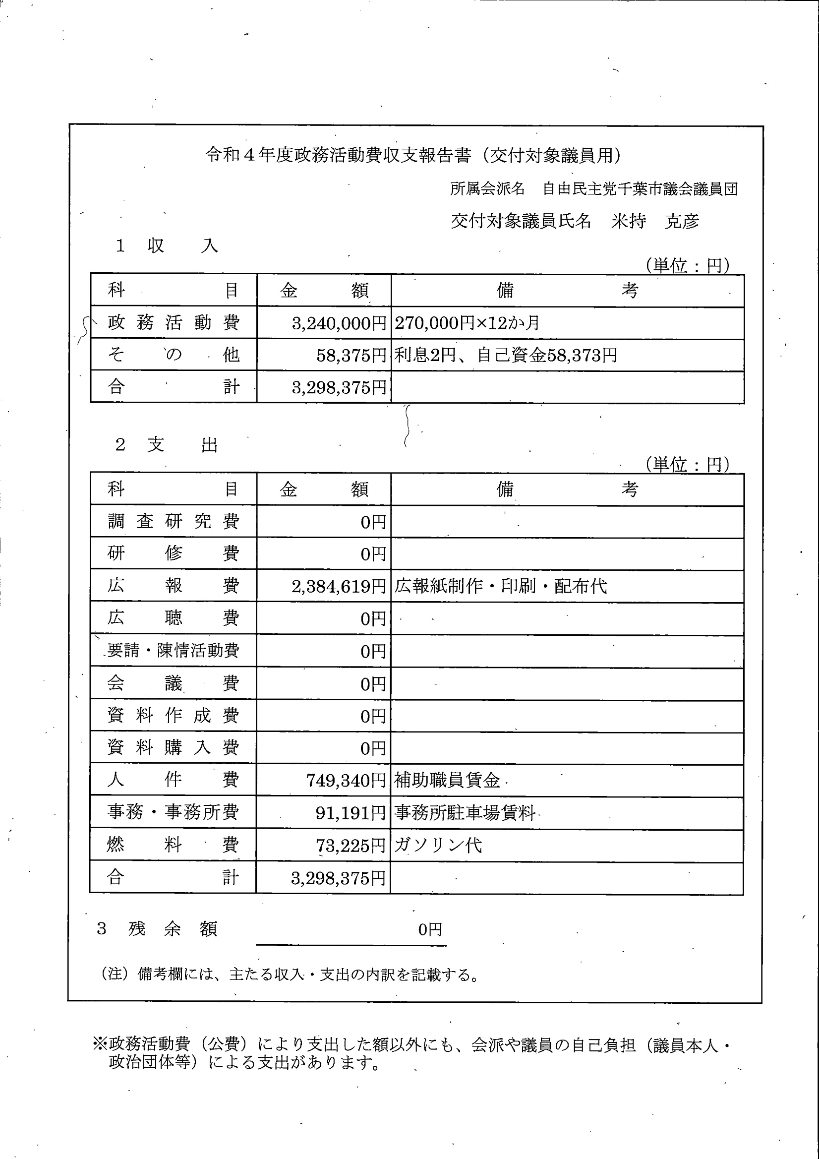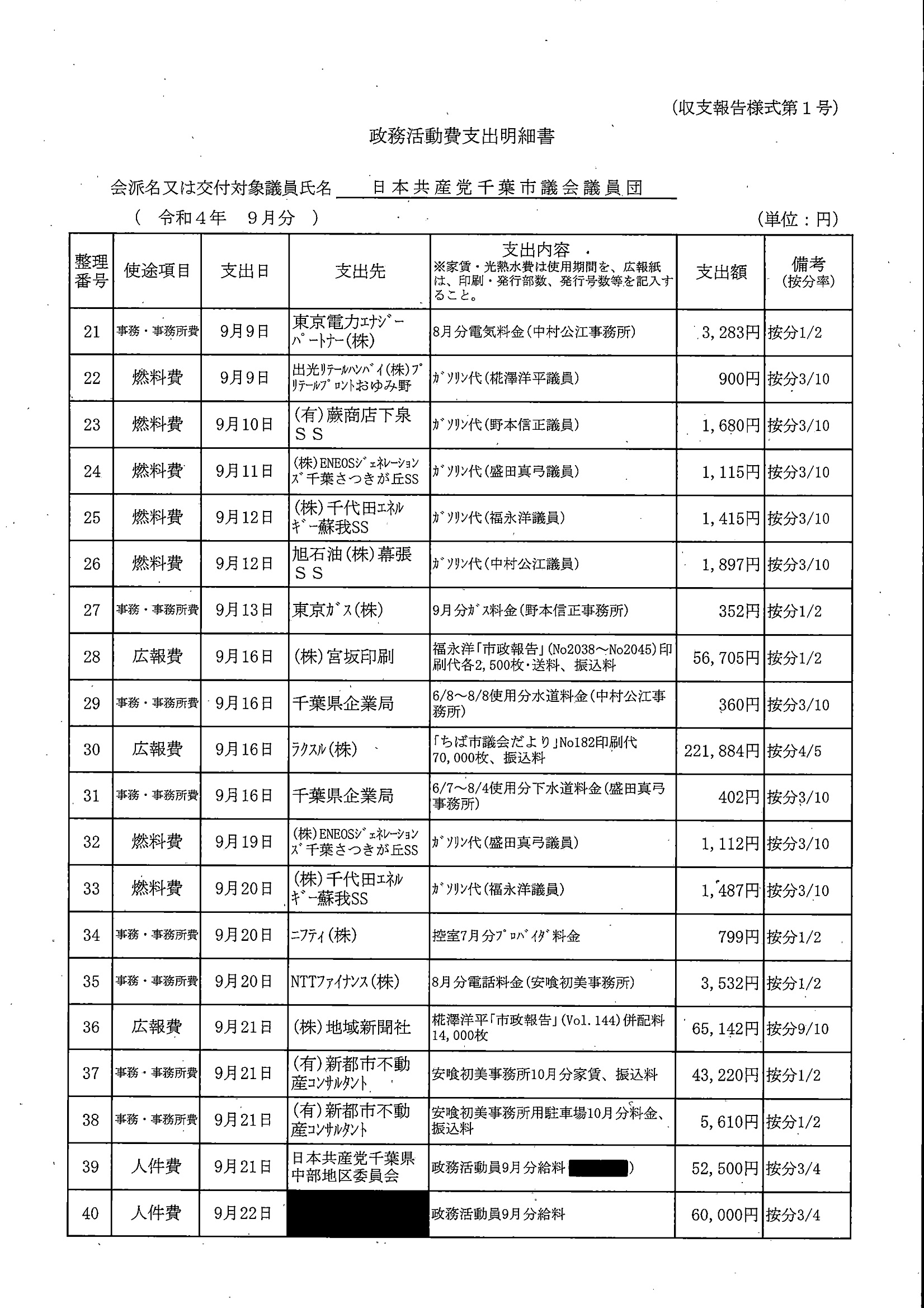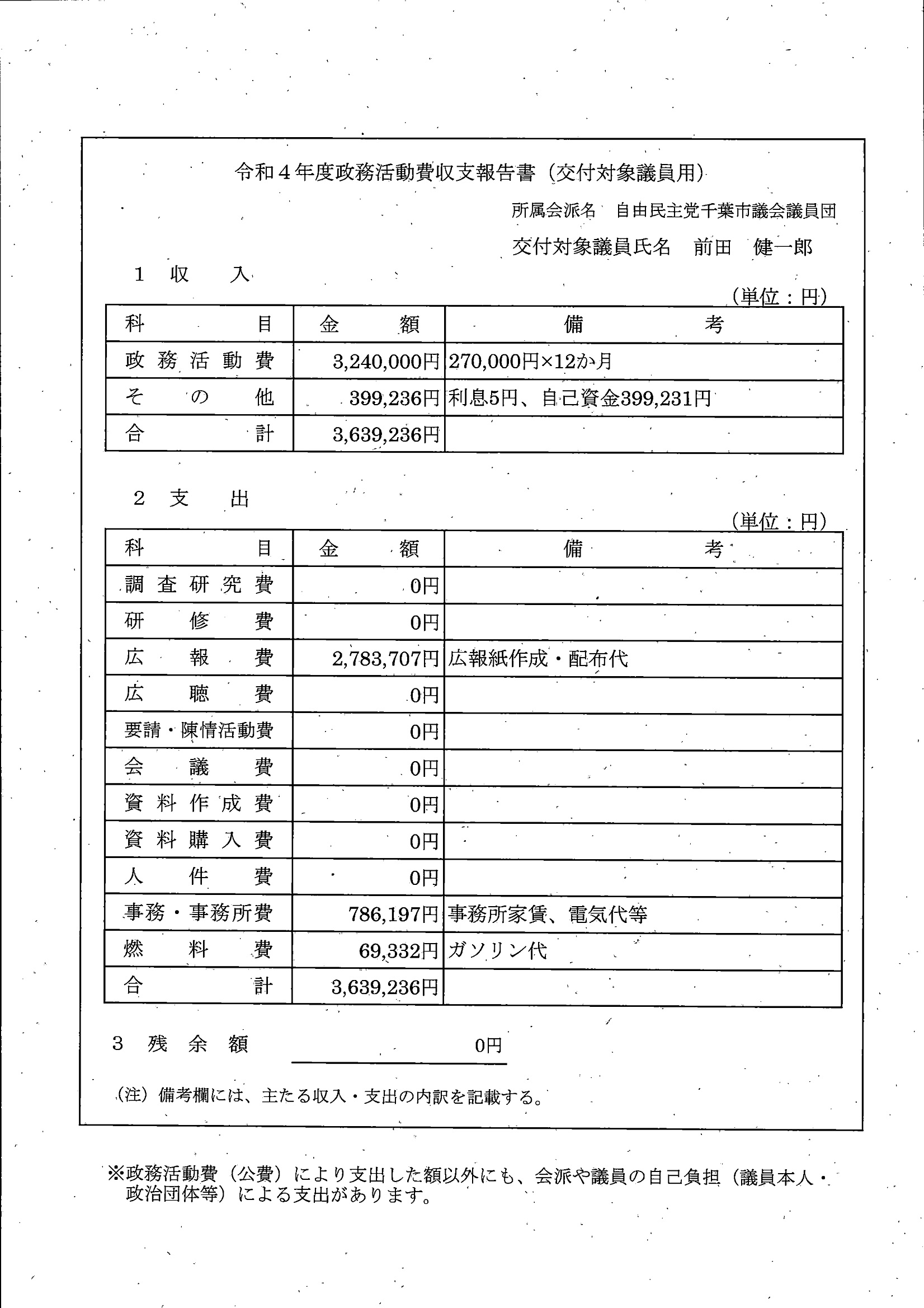 千葉市議会トップページ > 広報・情報公開 > 政務活動費 > 令和4年度交付分(政務活動費収支報告書)