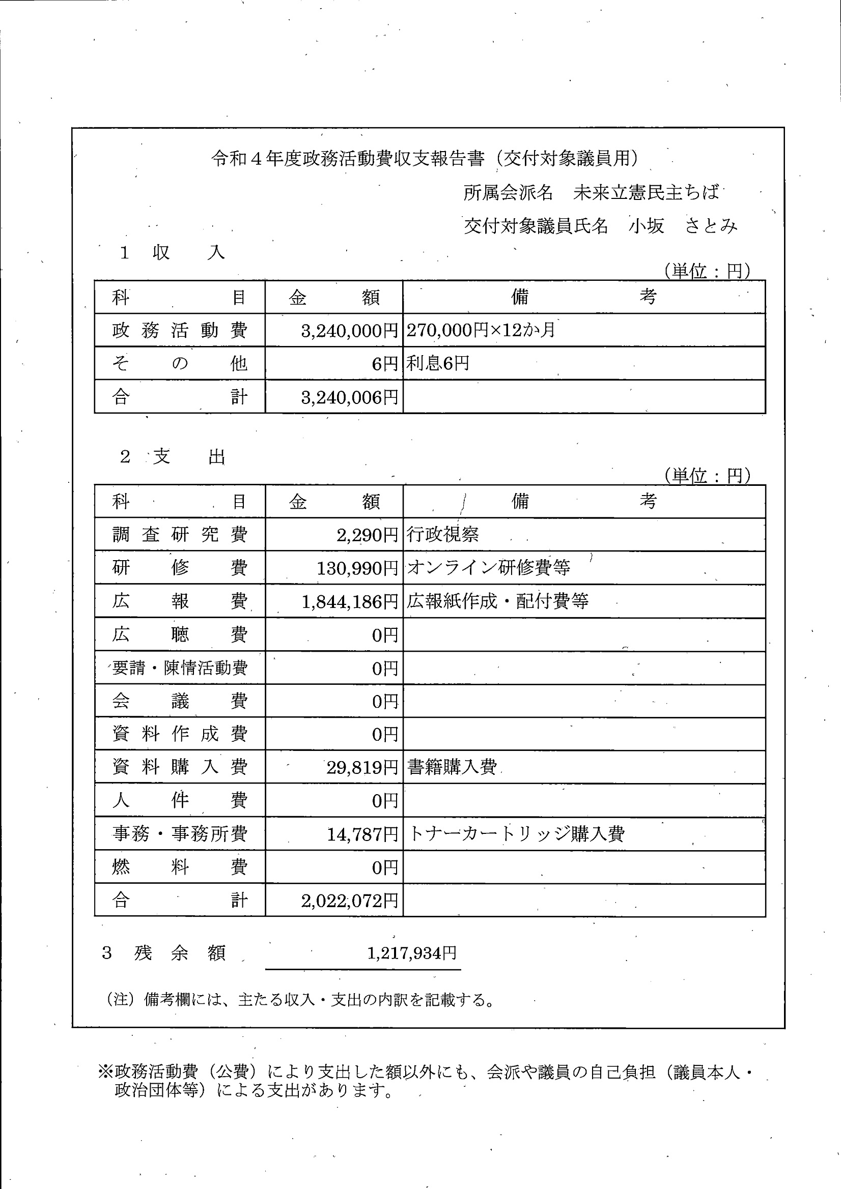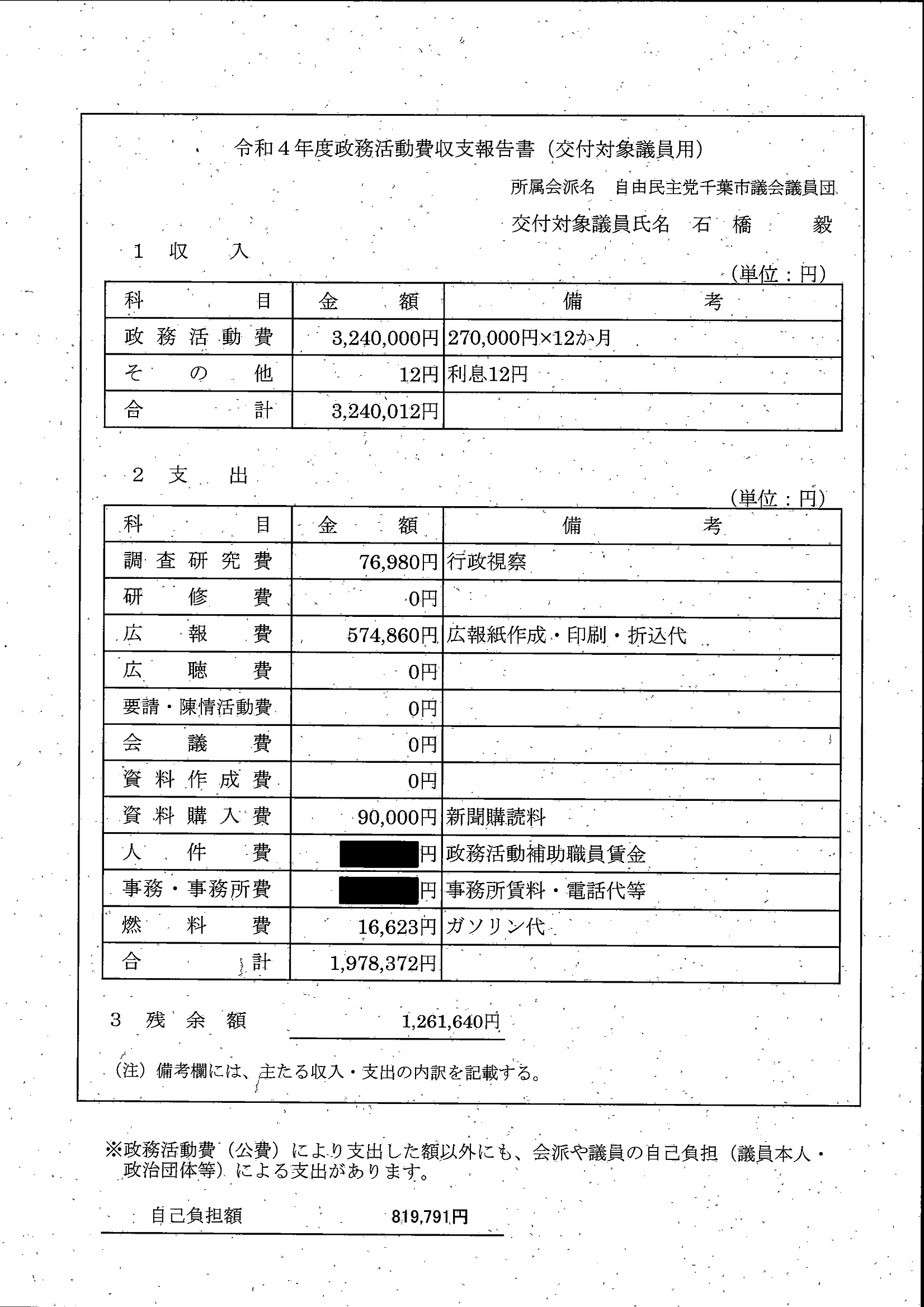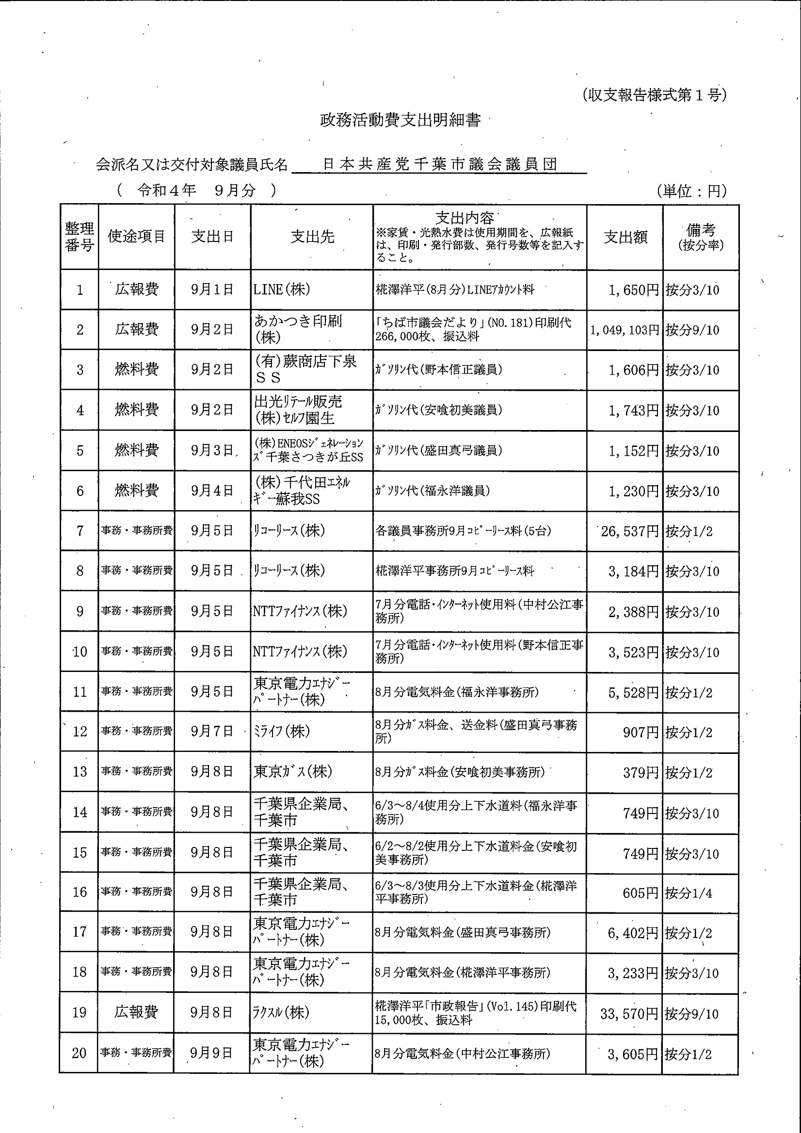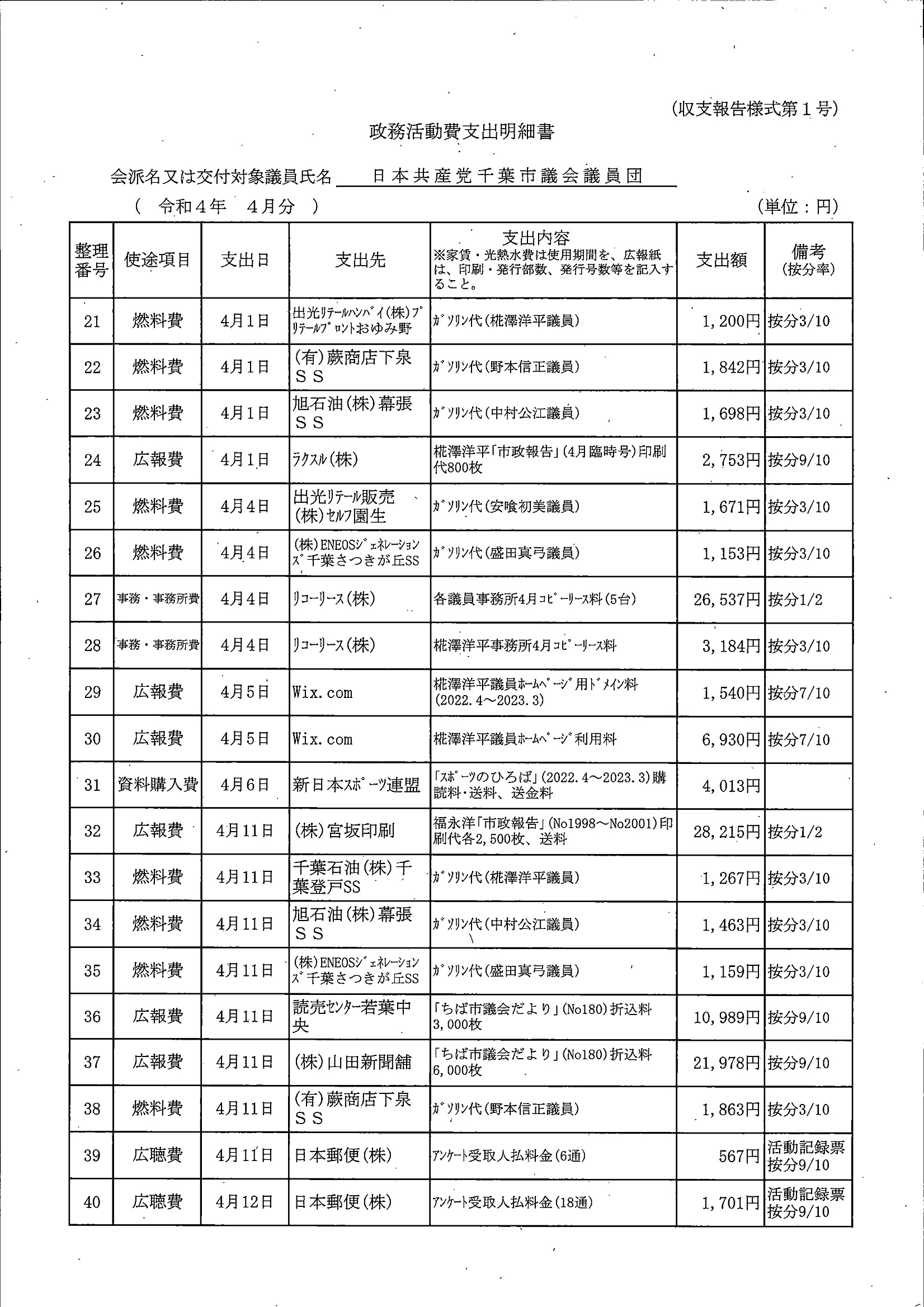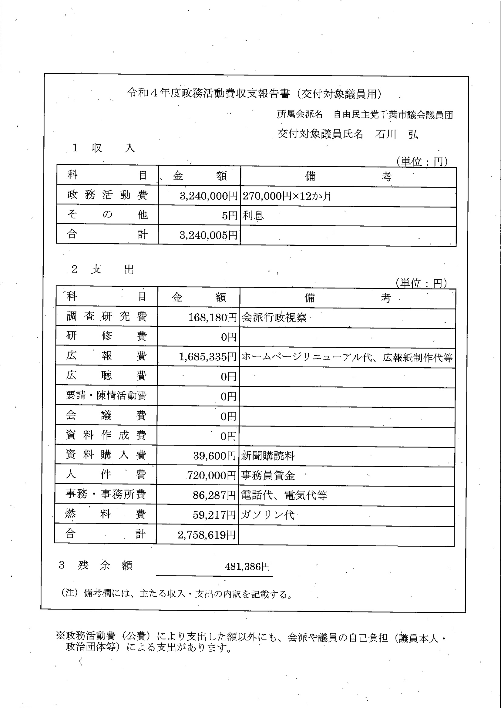 千葉市議会トップページ > 広報・情報公開 > 政務活動費 > 令和4年度交付分(政務活動費収支報告書)