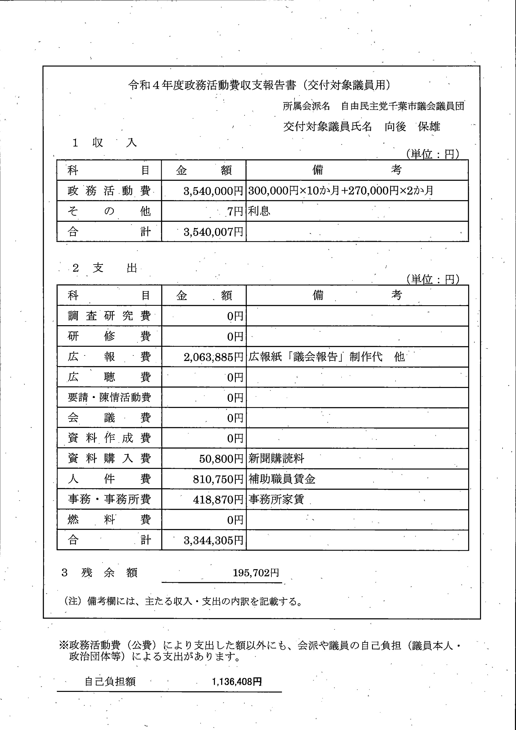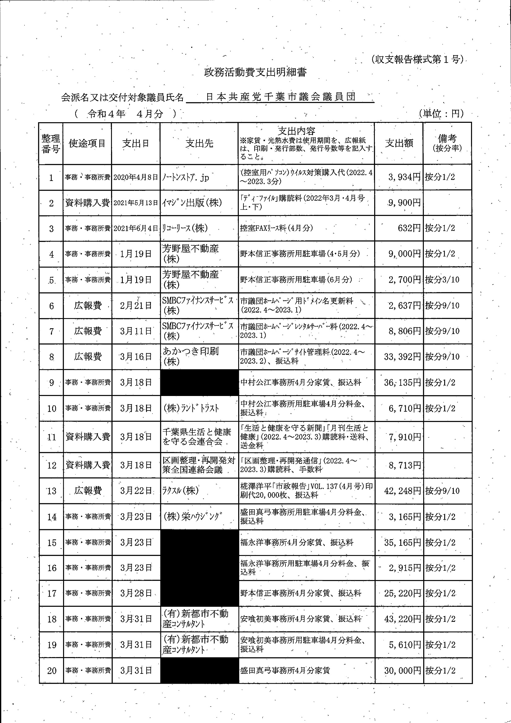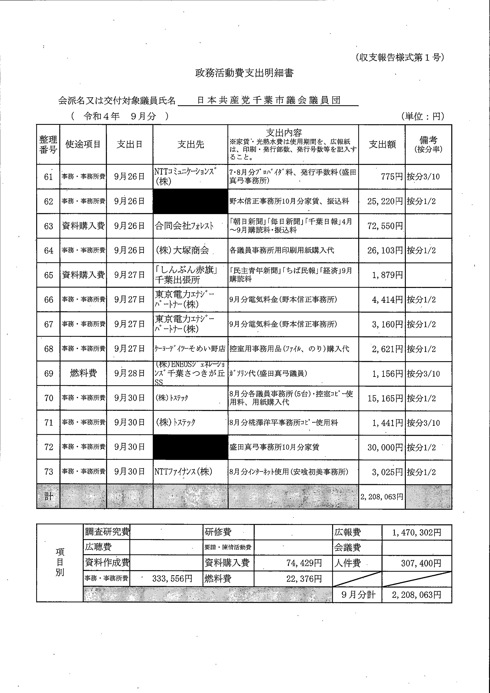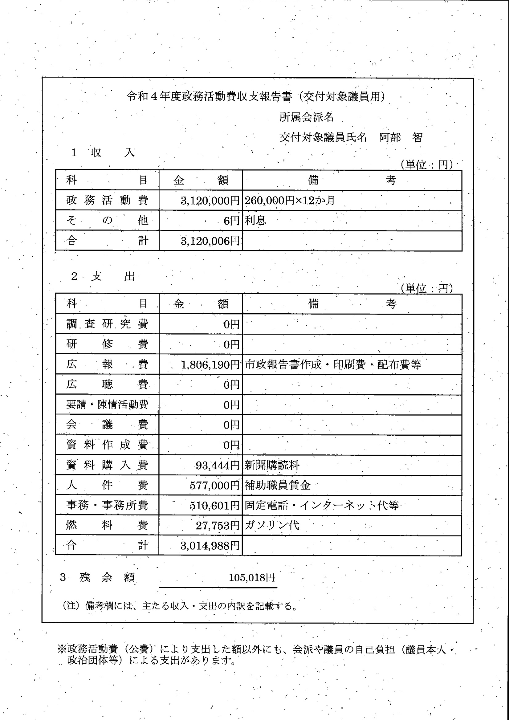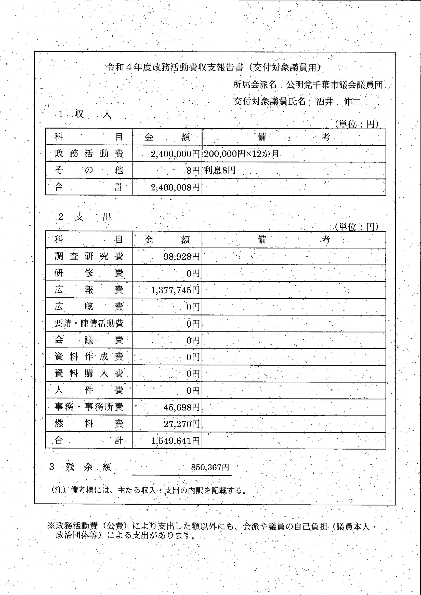 千葉市議会トップページ > 広報・情報公開 > 政務活動費 > 令和4年度交付分(政務活動費収支報告書)