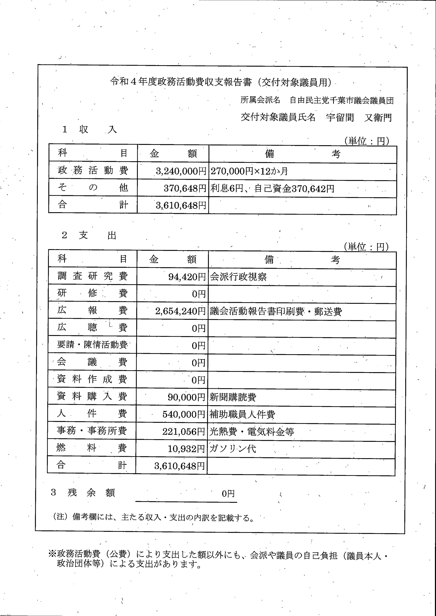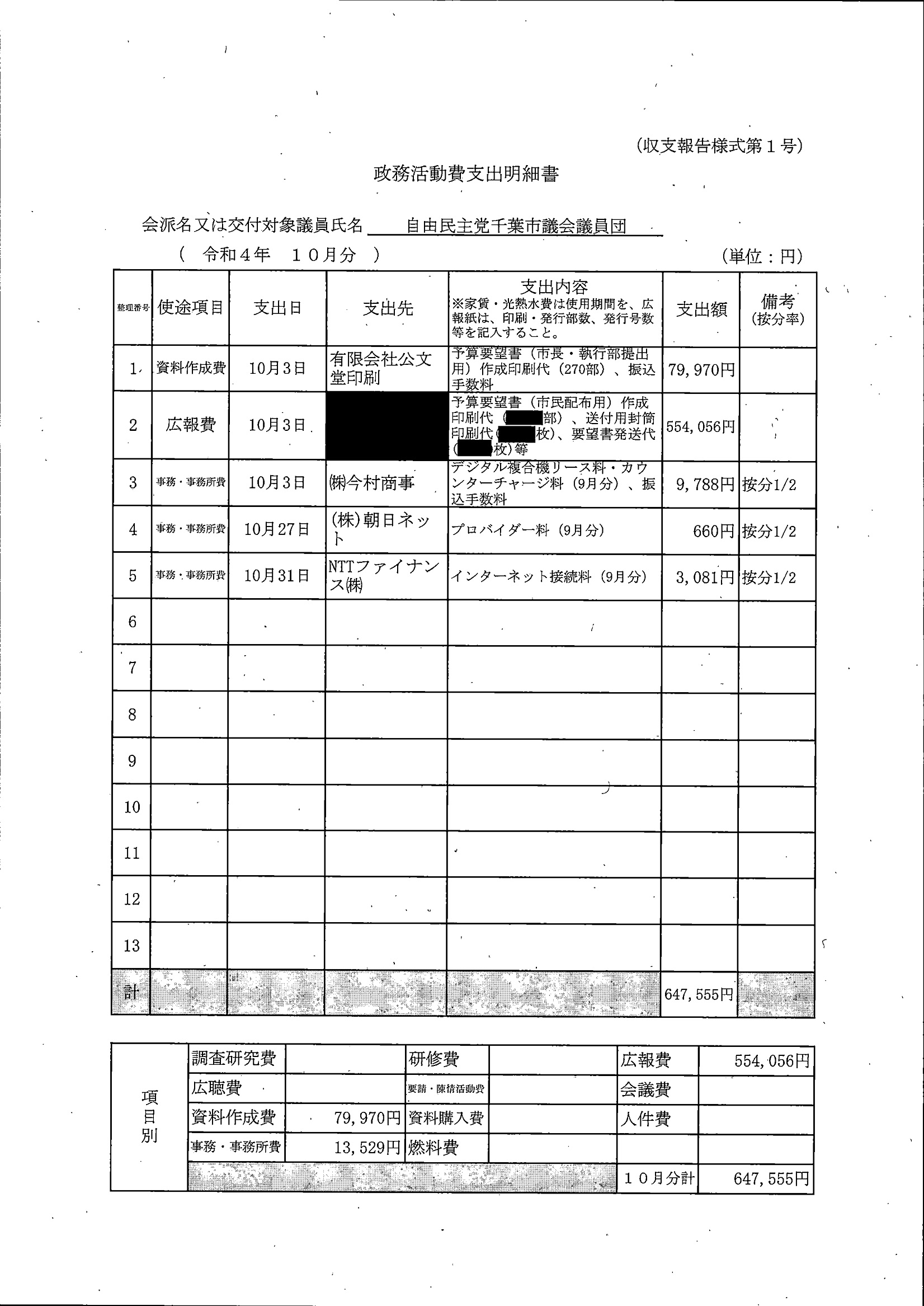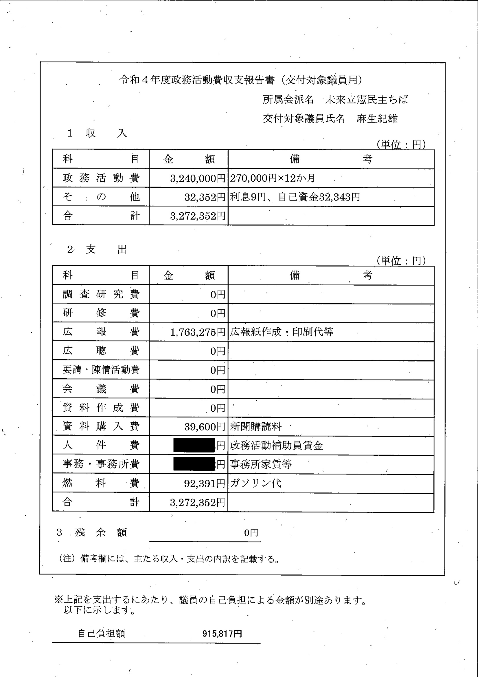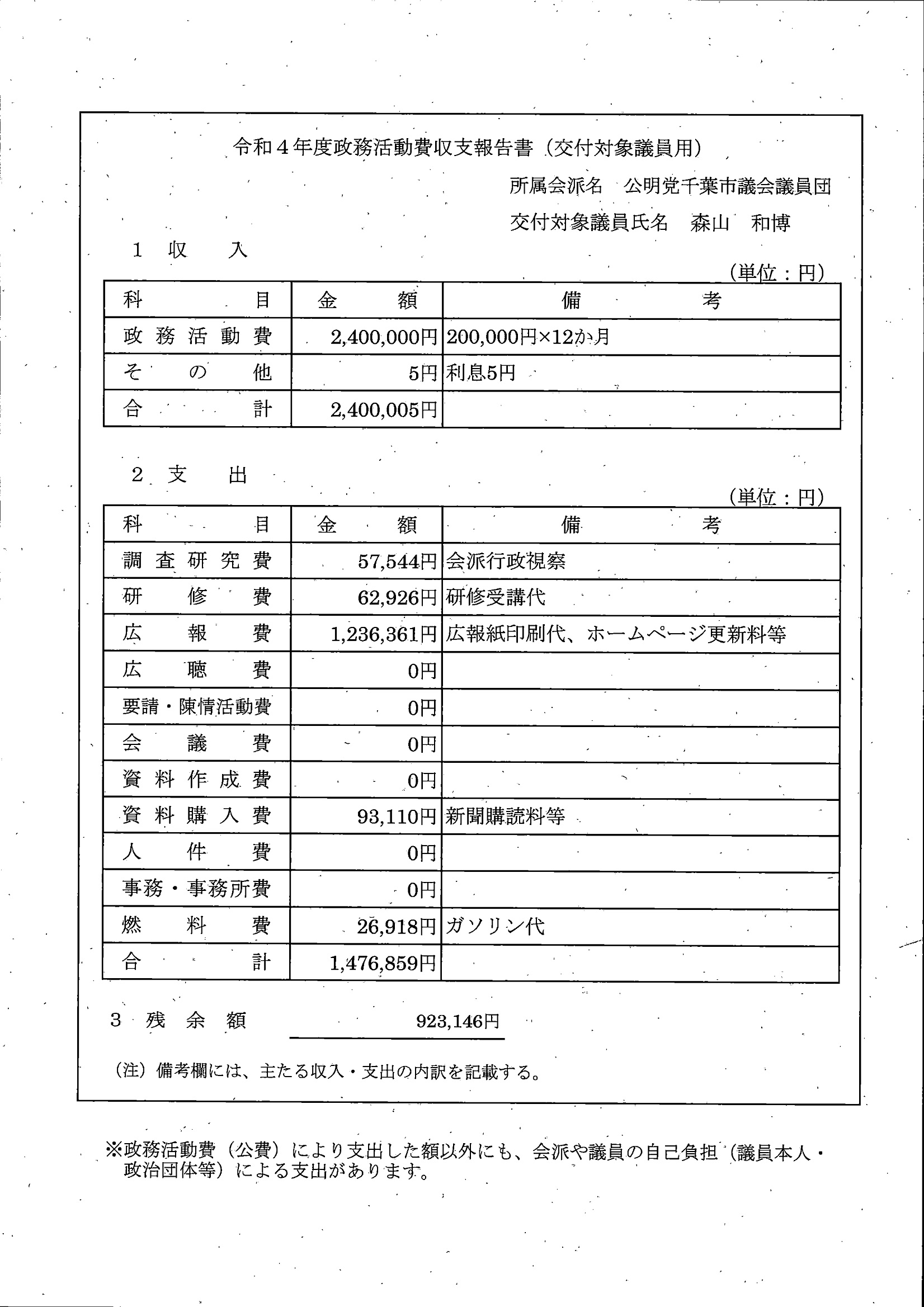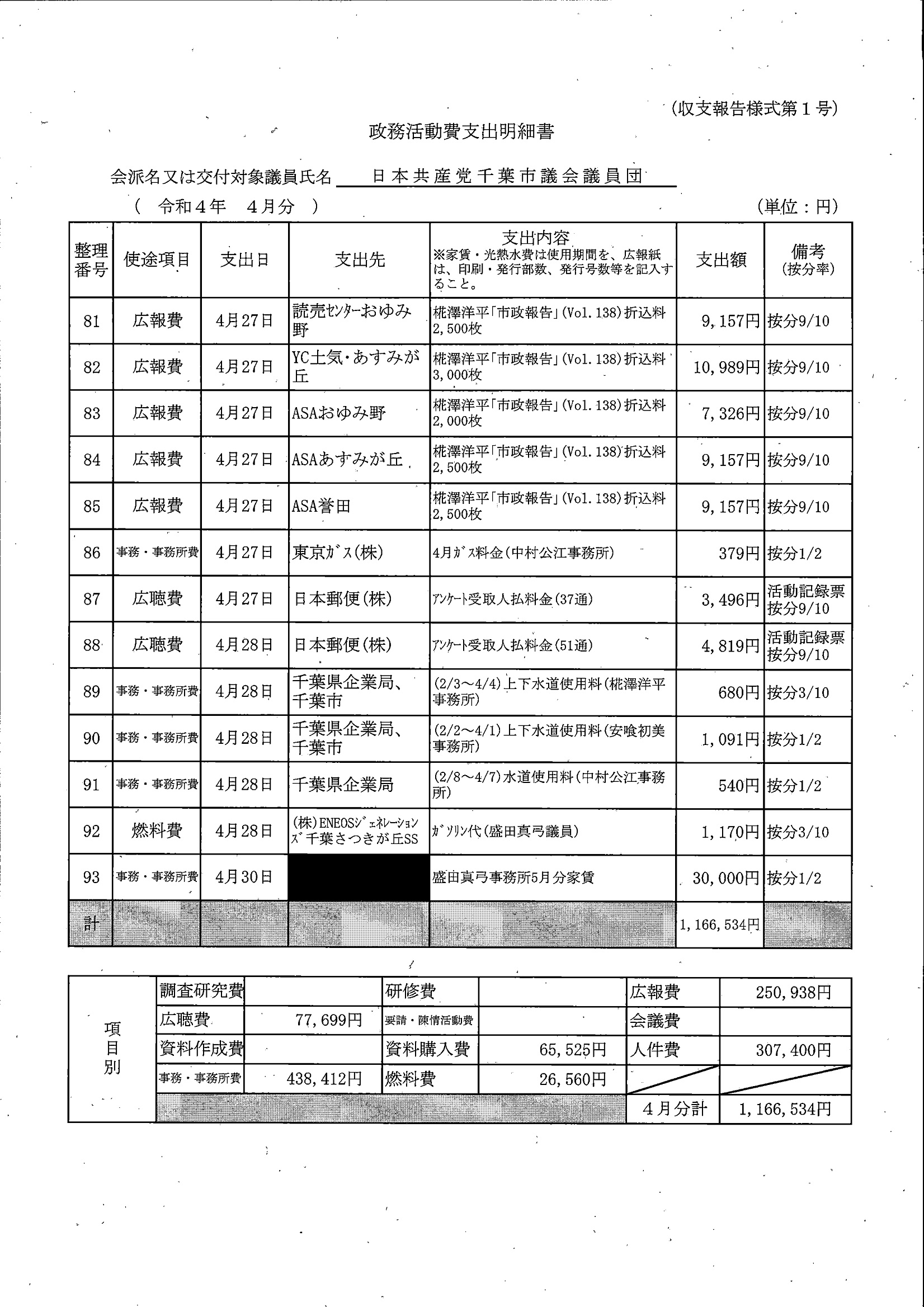 千葉市議会トップページ > 広報・情報公開 > 政務活動費 > 令和4年度交付分(政務活動費収支報告書)