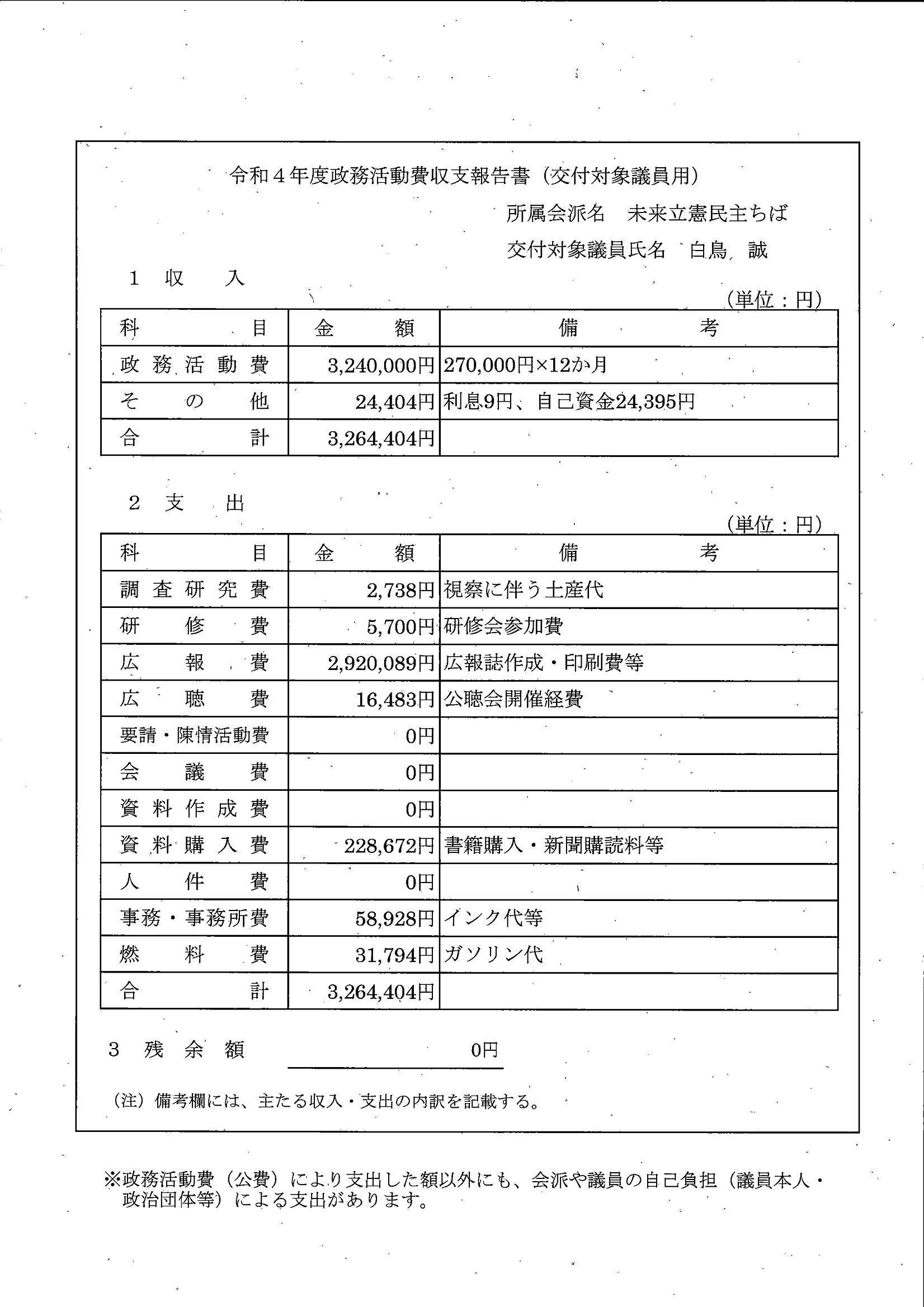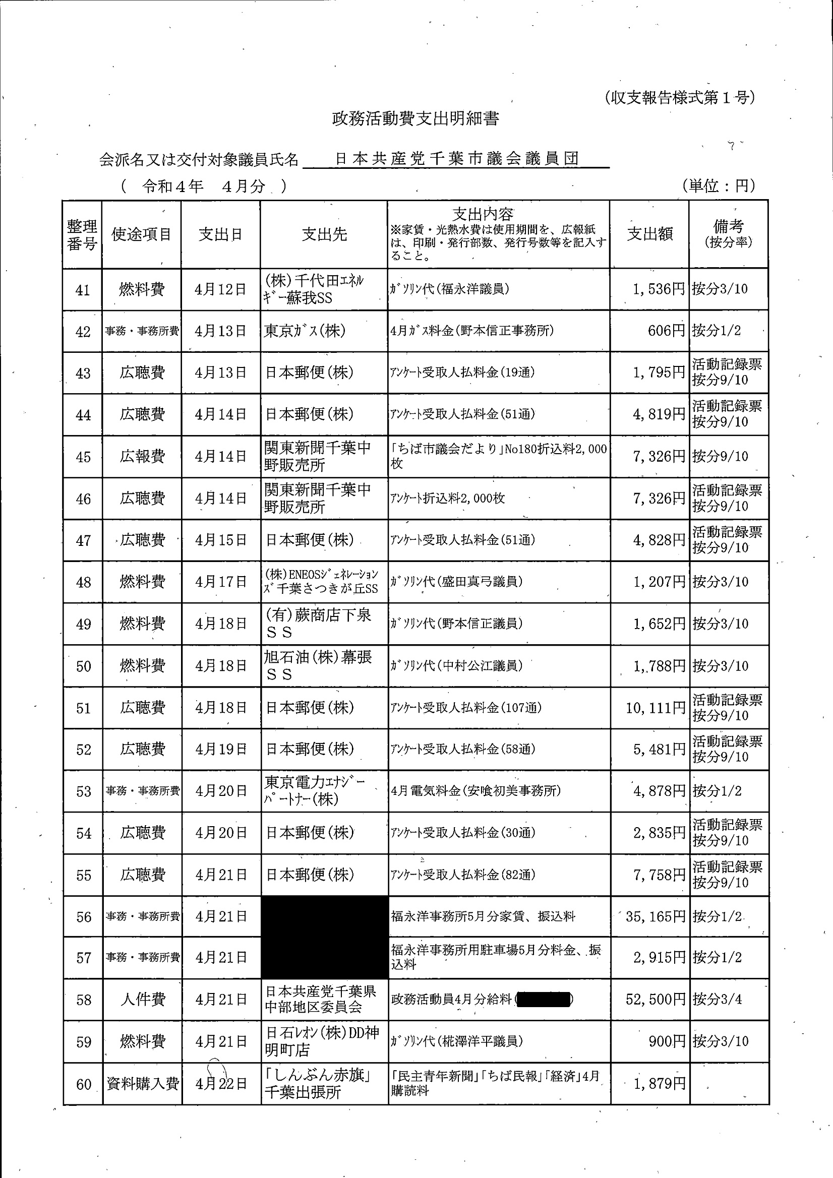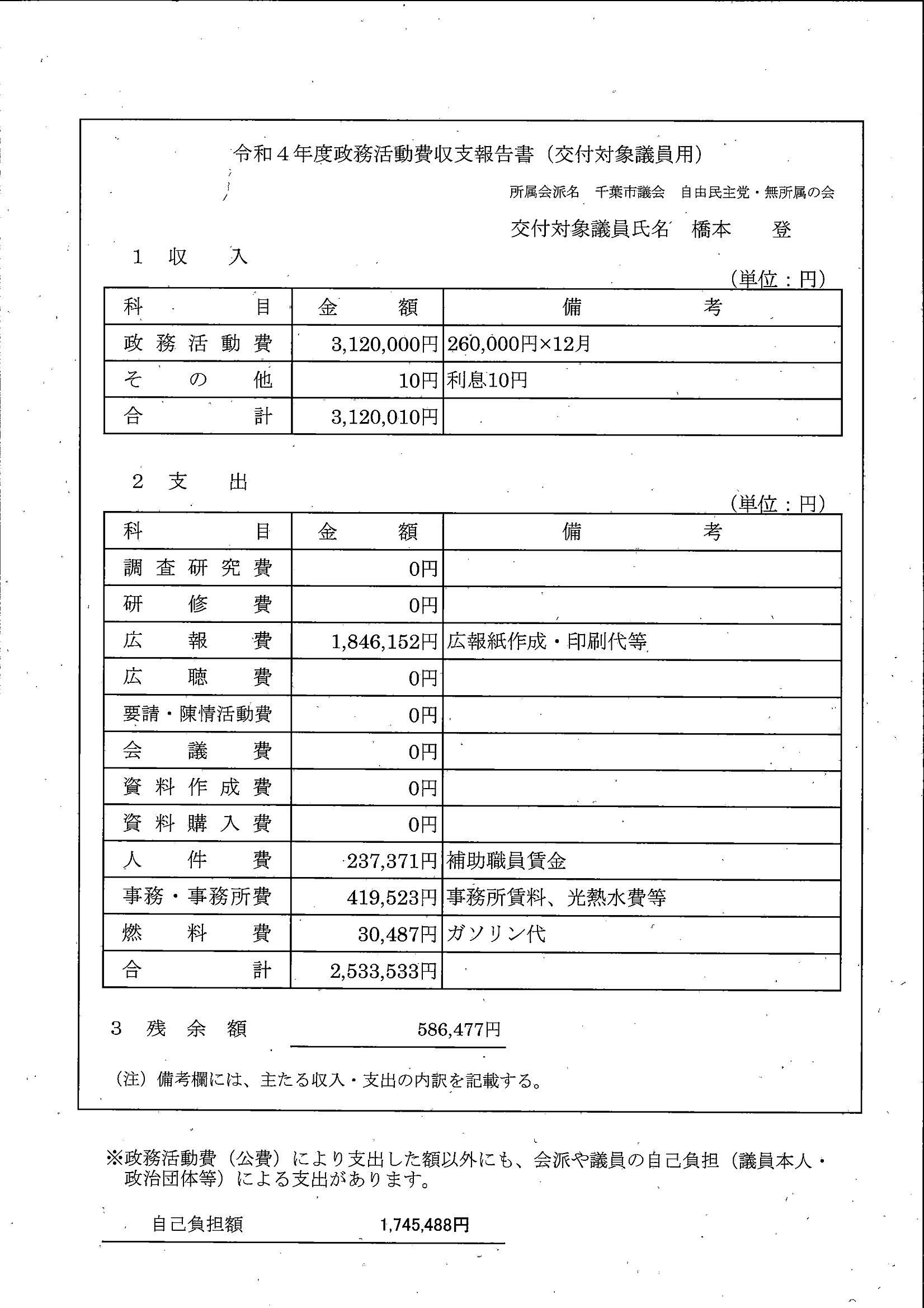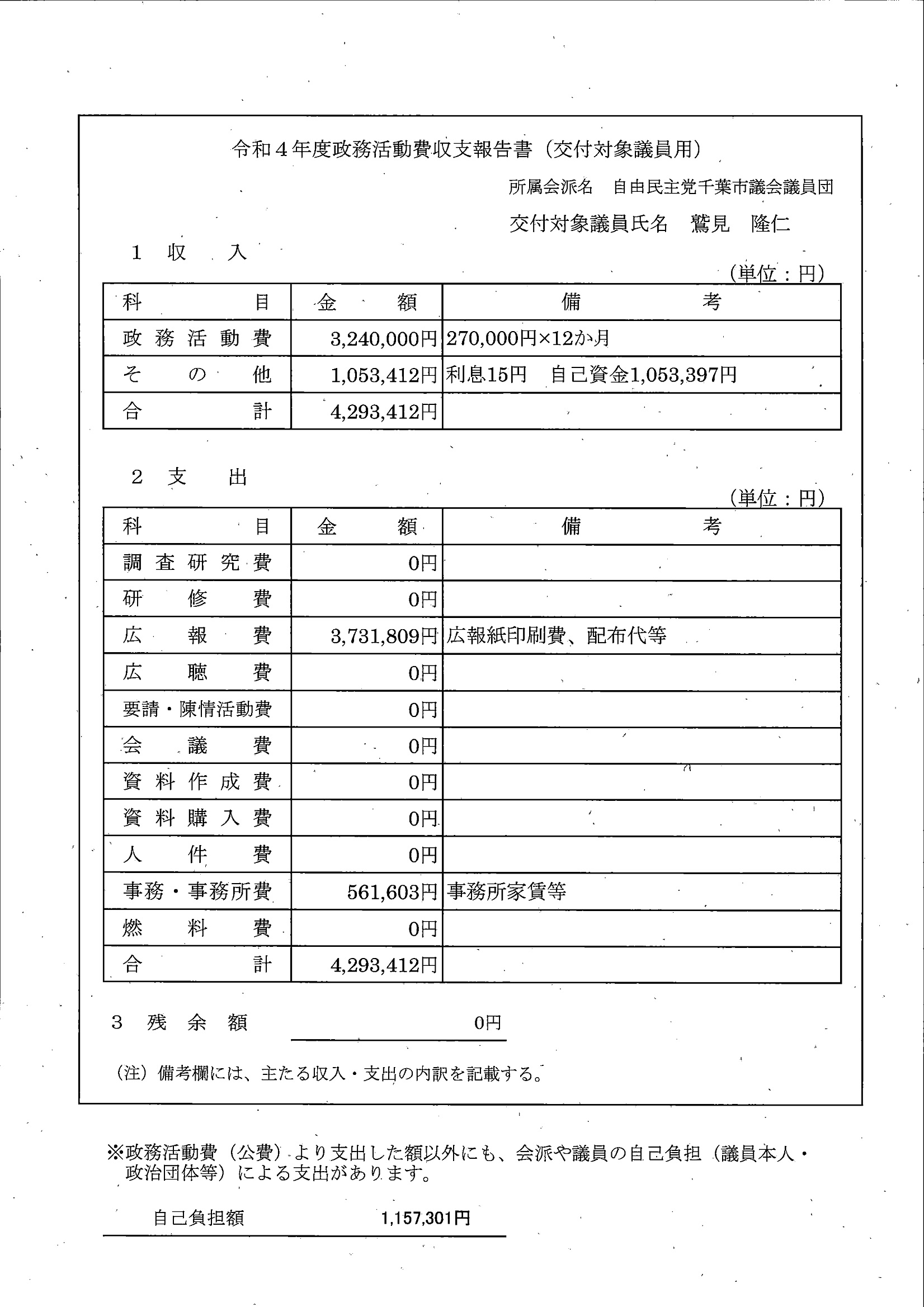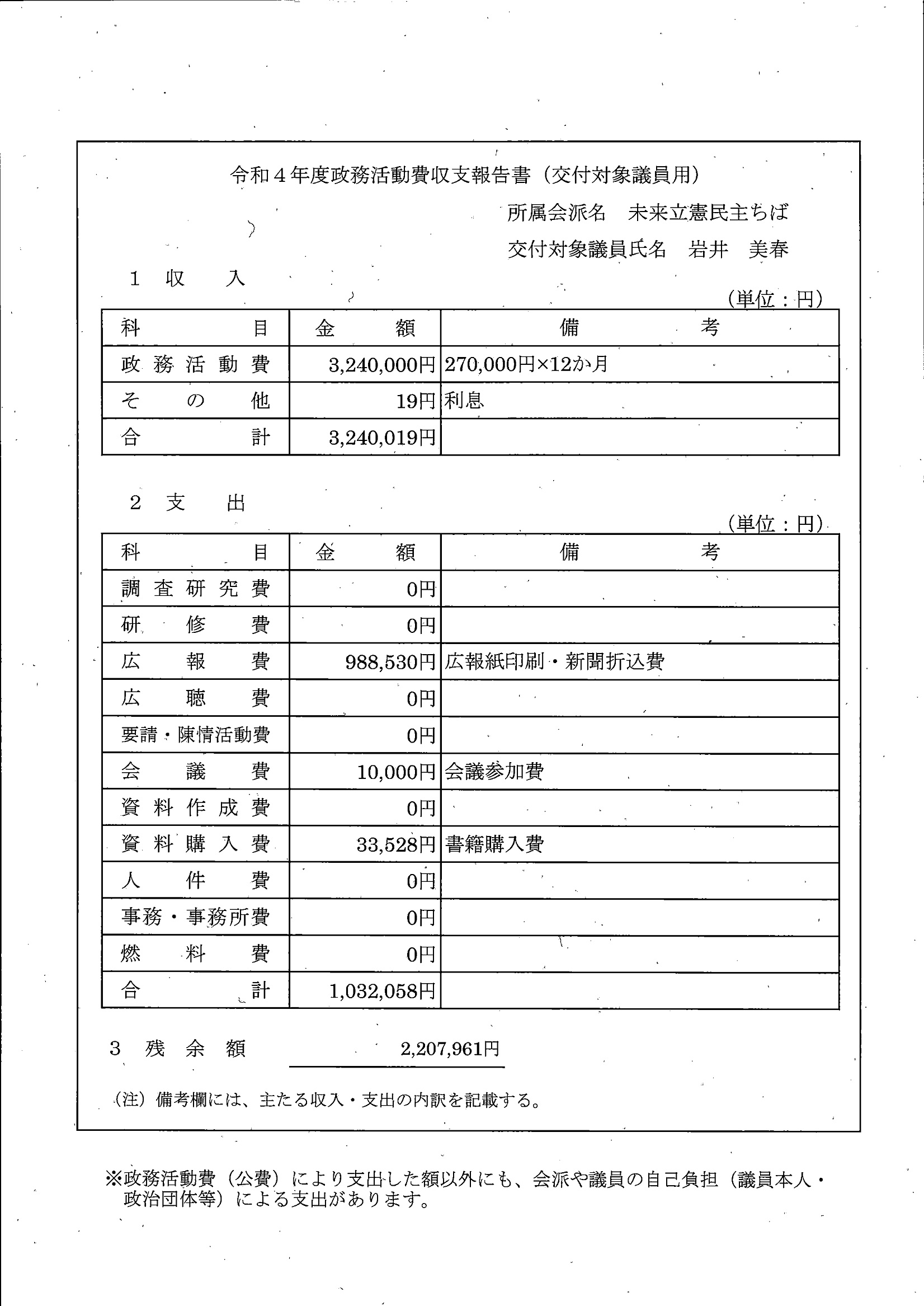 千葉市議会トップページ > 広報・情報公開 > 政務活動費 > 令和4年度交付分(政務活動費収支報告書)