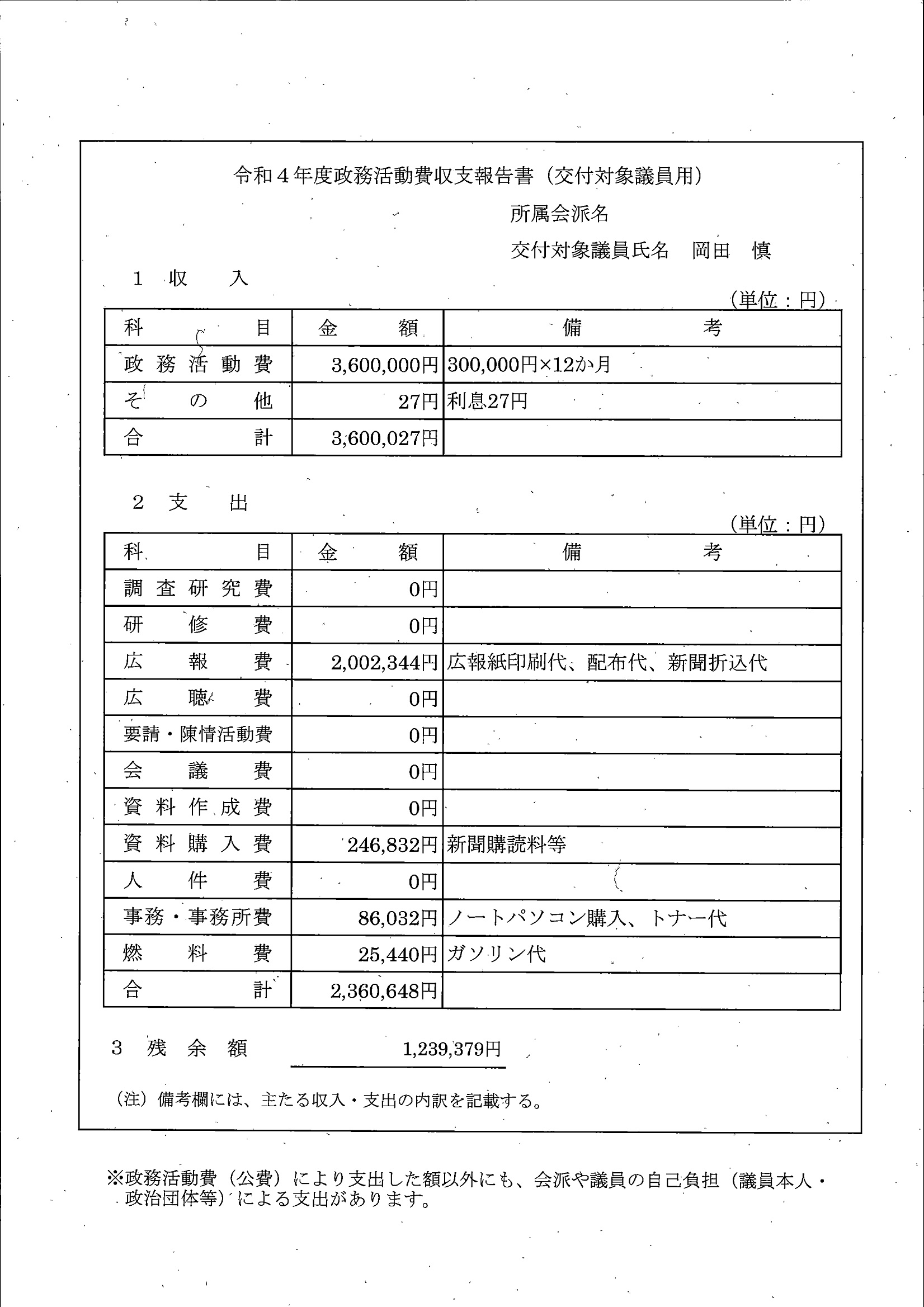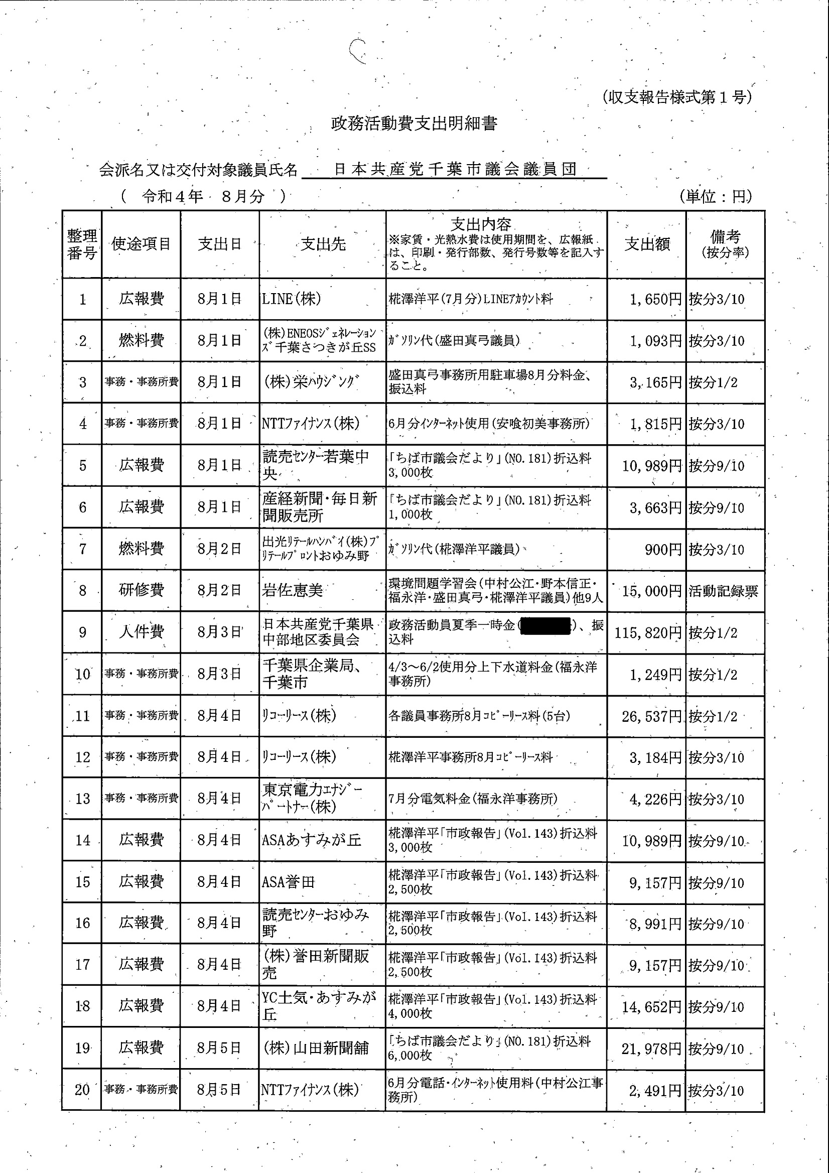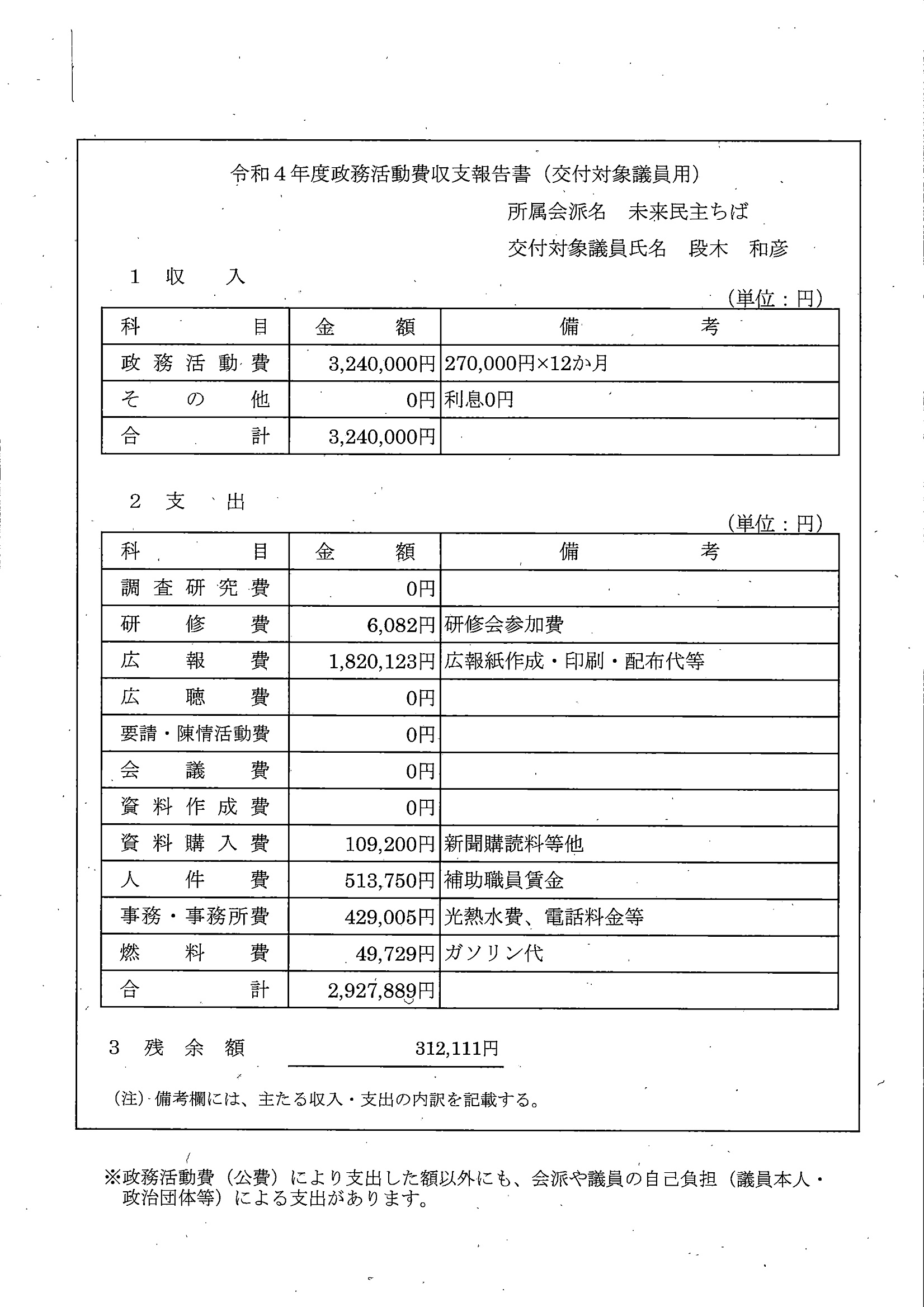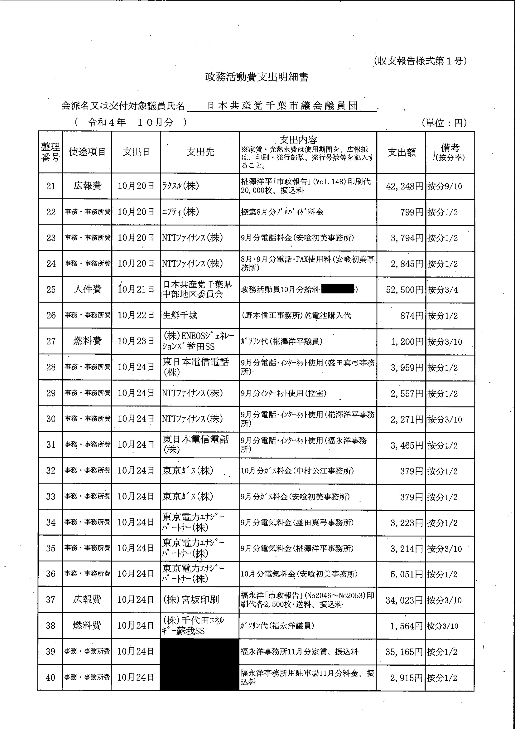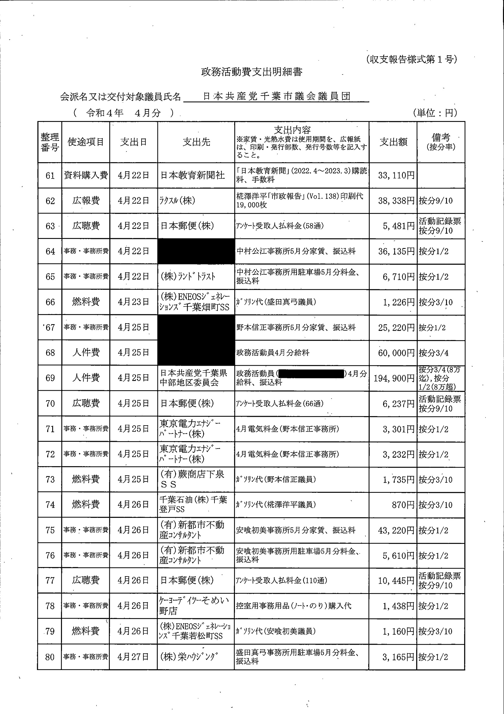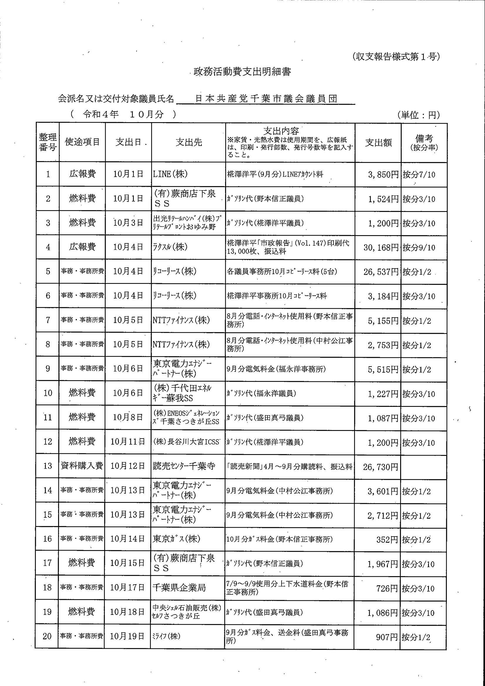 千葉市議会トップページ > 広報・情報公開 > 政務活動費 > 令和4年度交付分(政務活動費収支報告書)