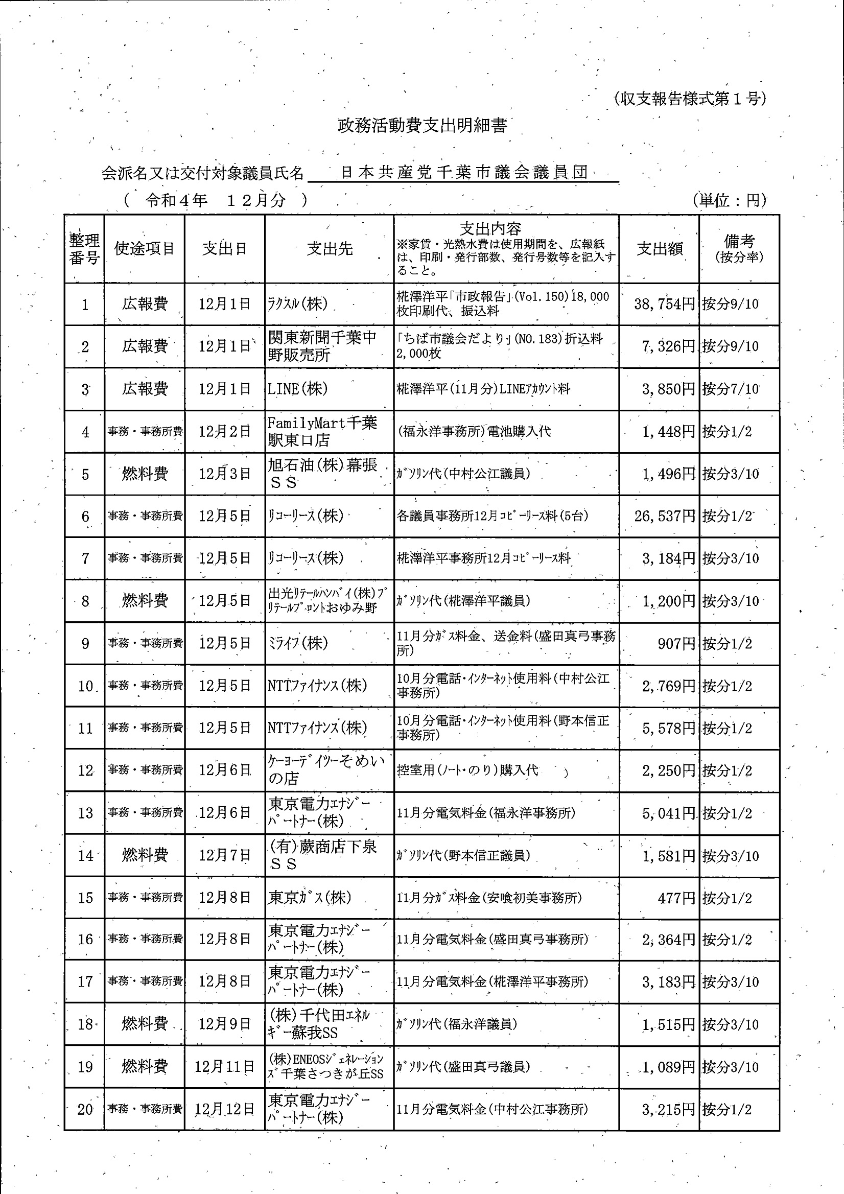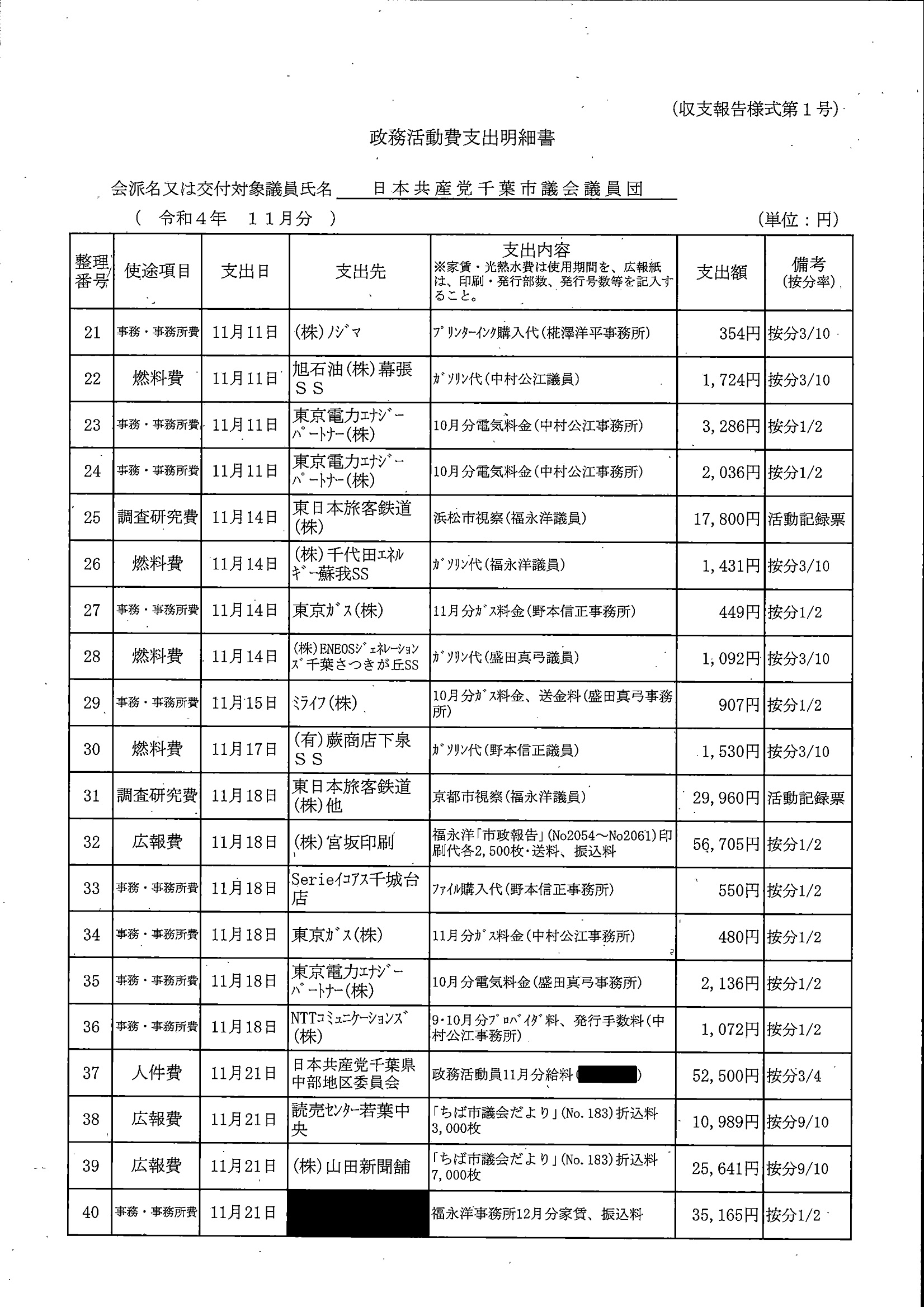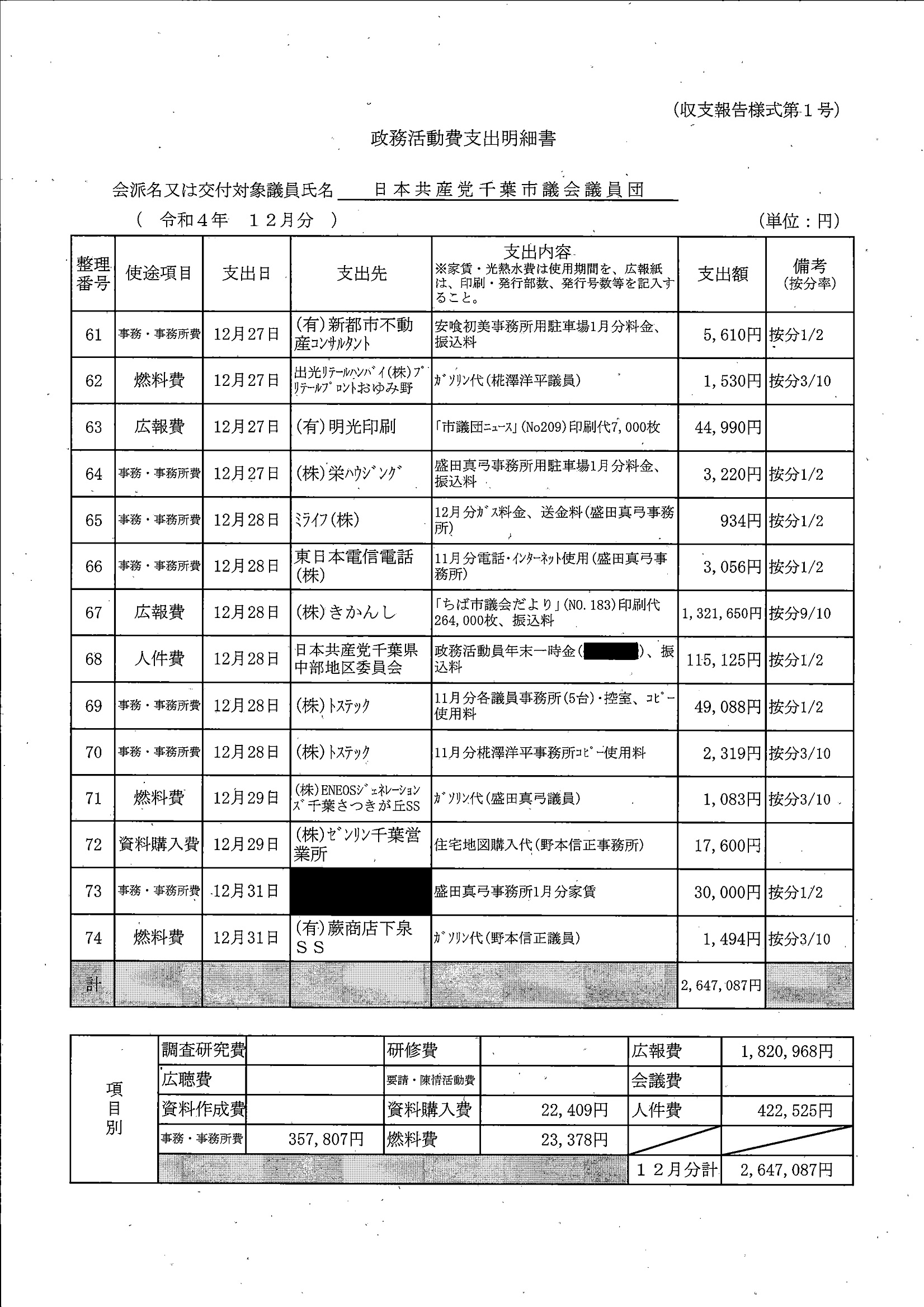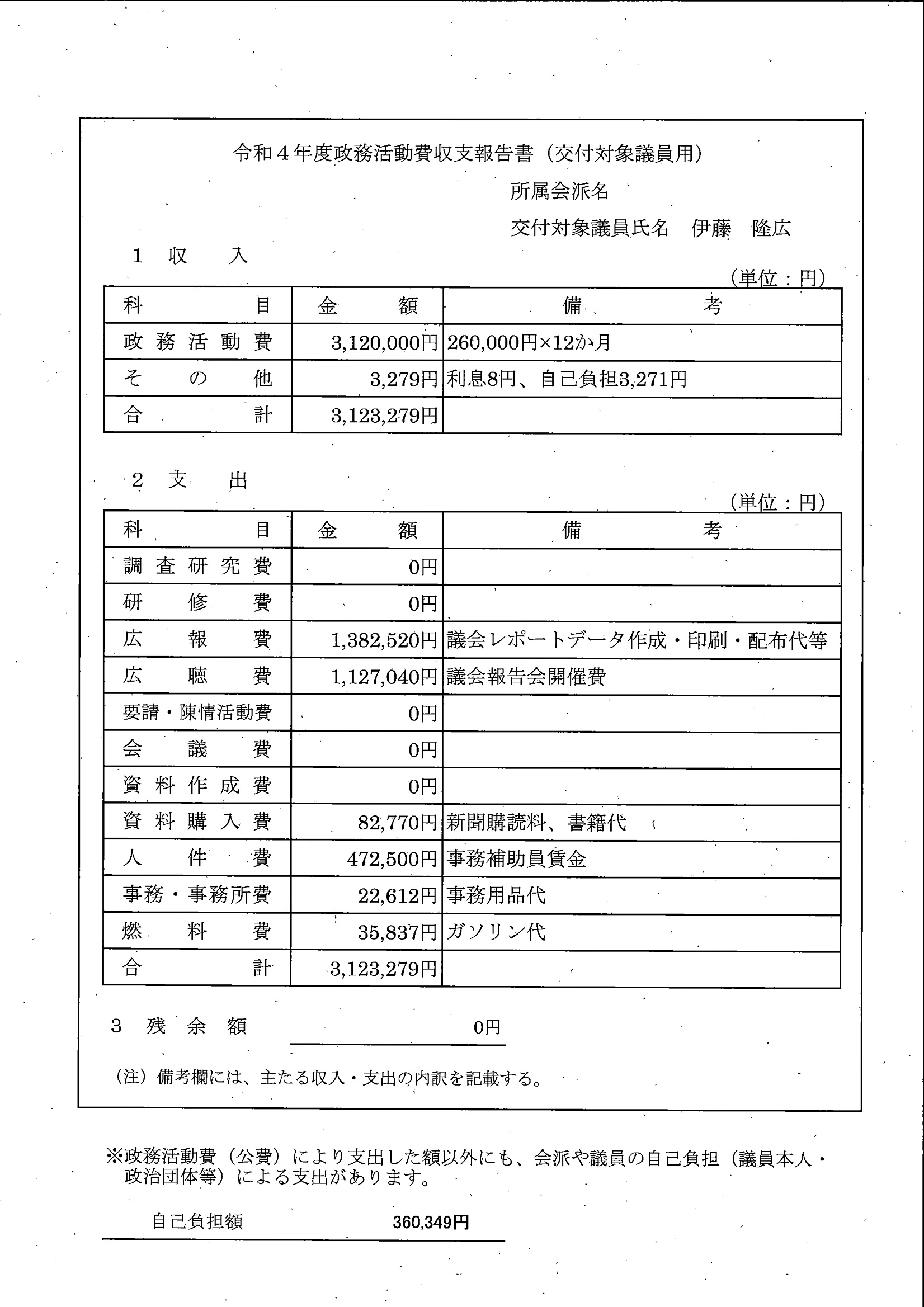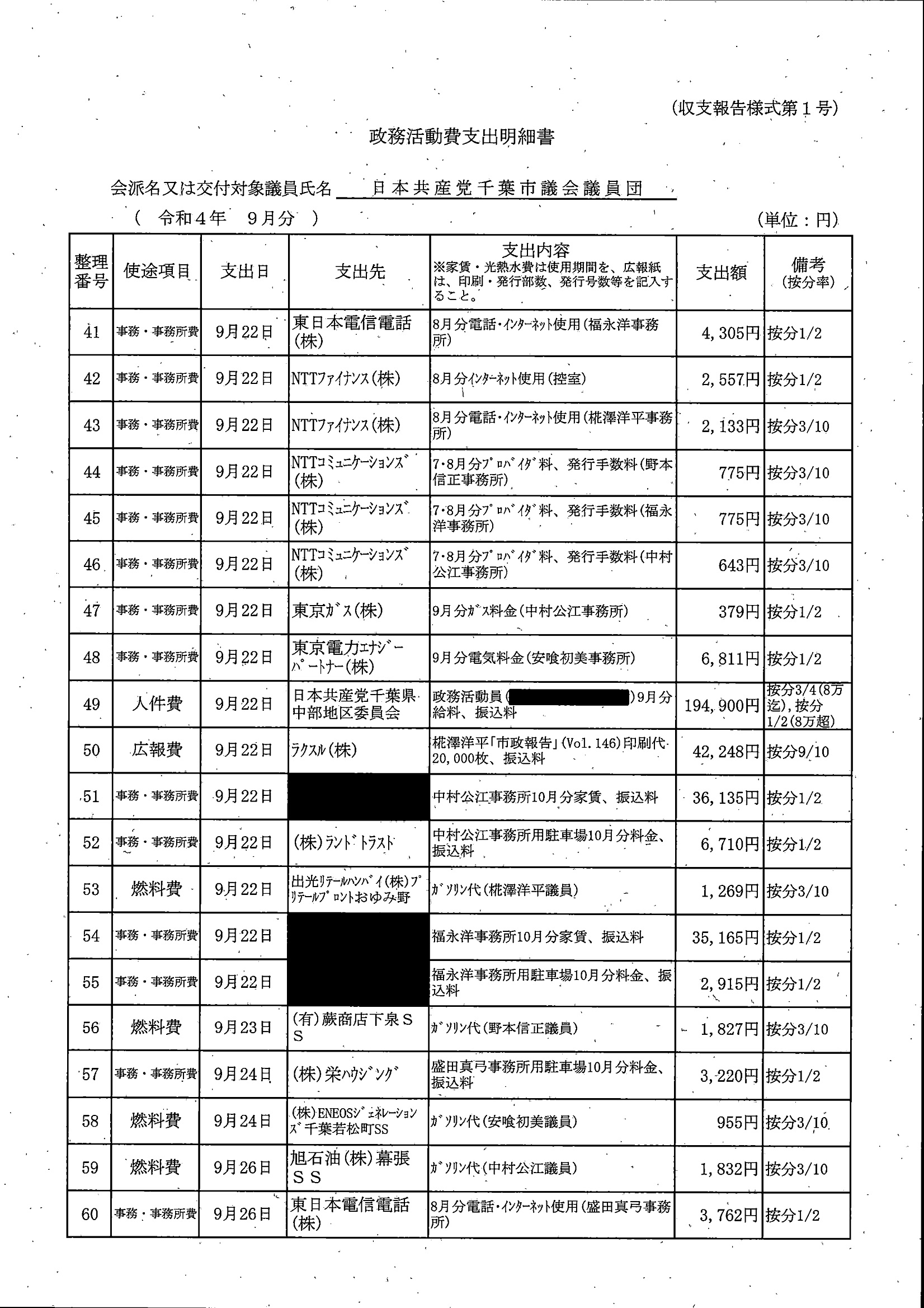千葉市議会トップページ > 広報・情報公開 > 政務活動費 > 令和4年度交付分(政務活動費収支報告書)
