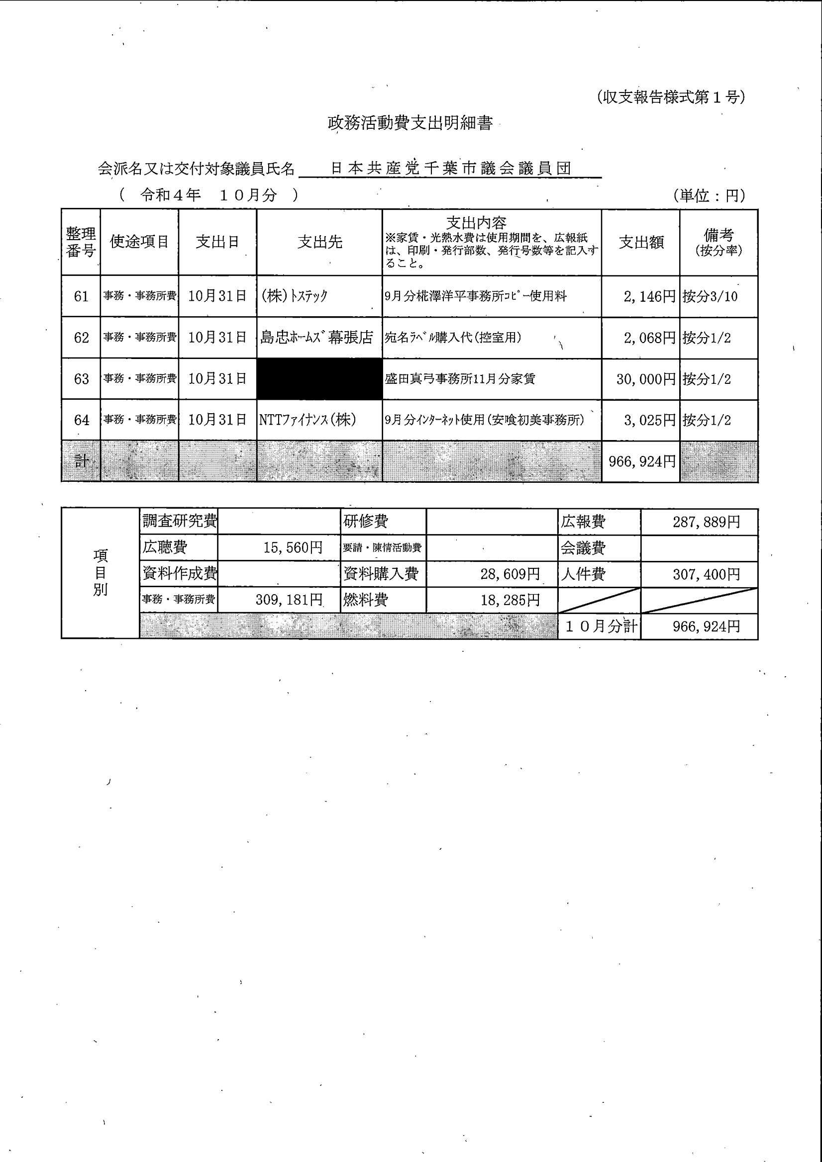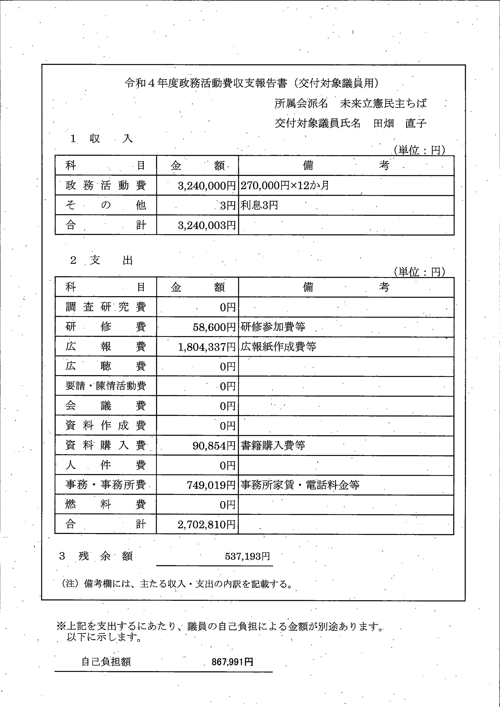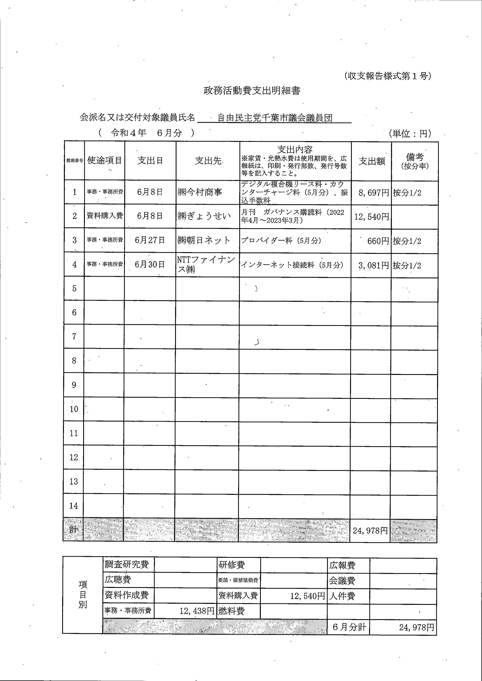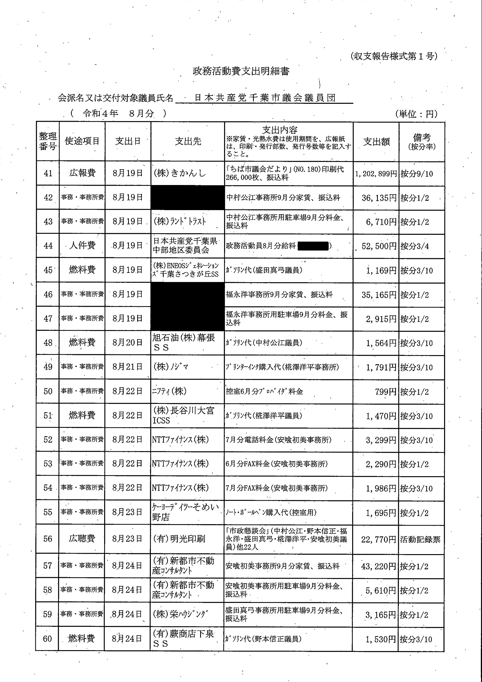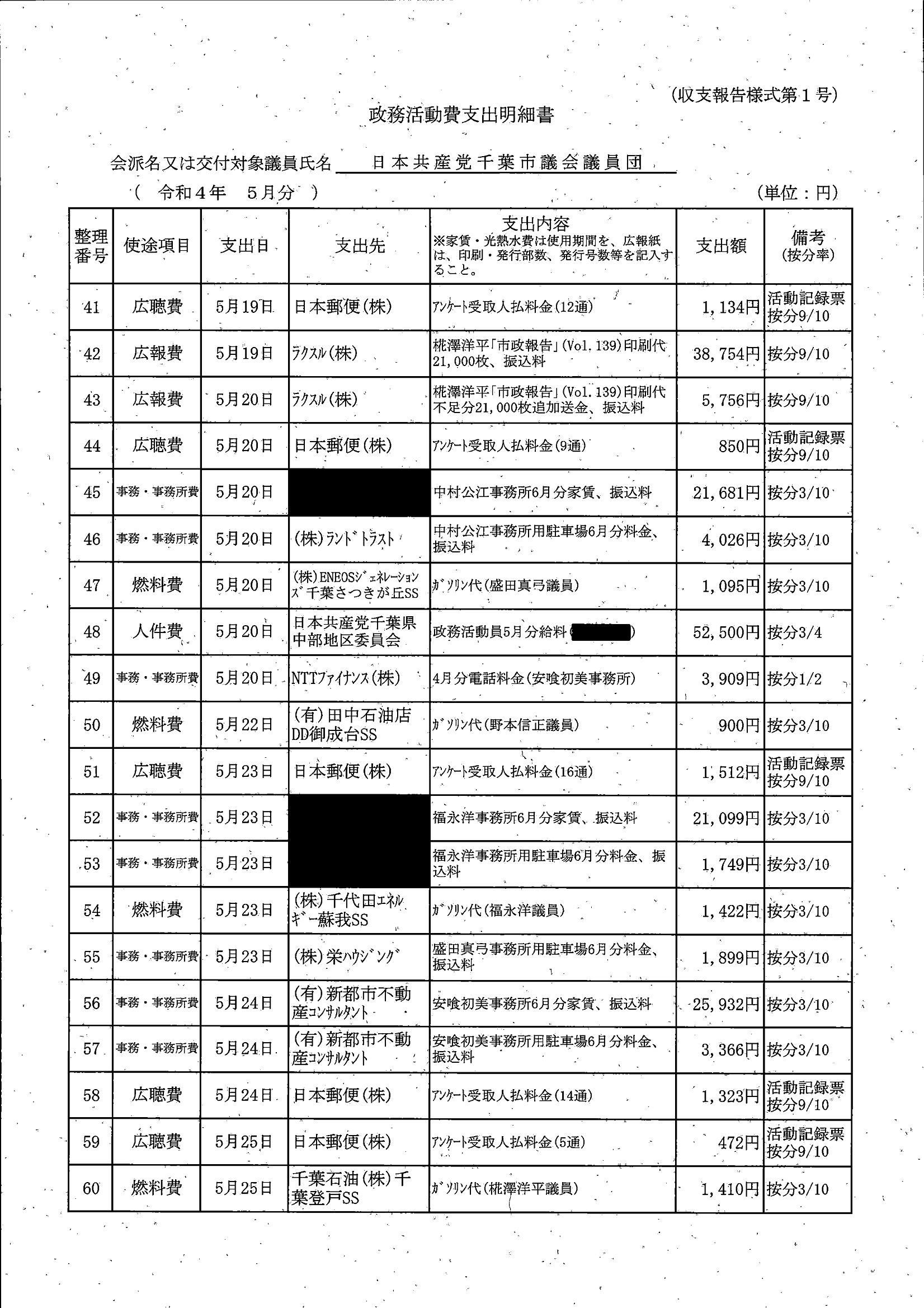 千葉市議会トップページ > 広報・情報公開 > 政務活動費 > 令和4年度交付分(政務活動費収支報告書)