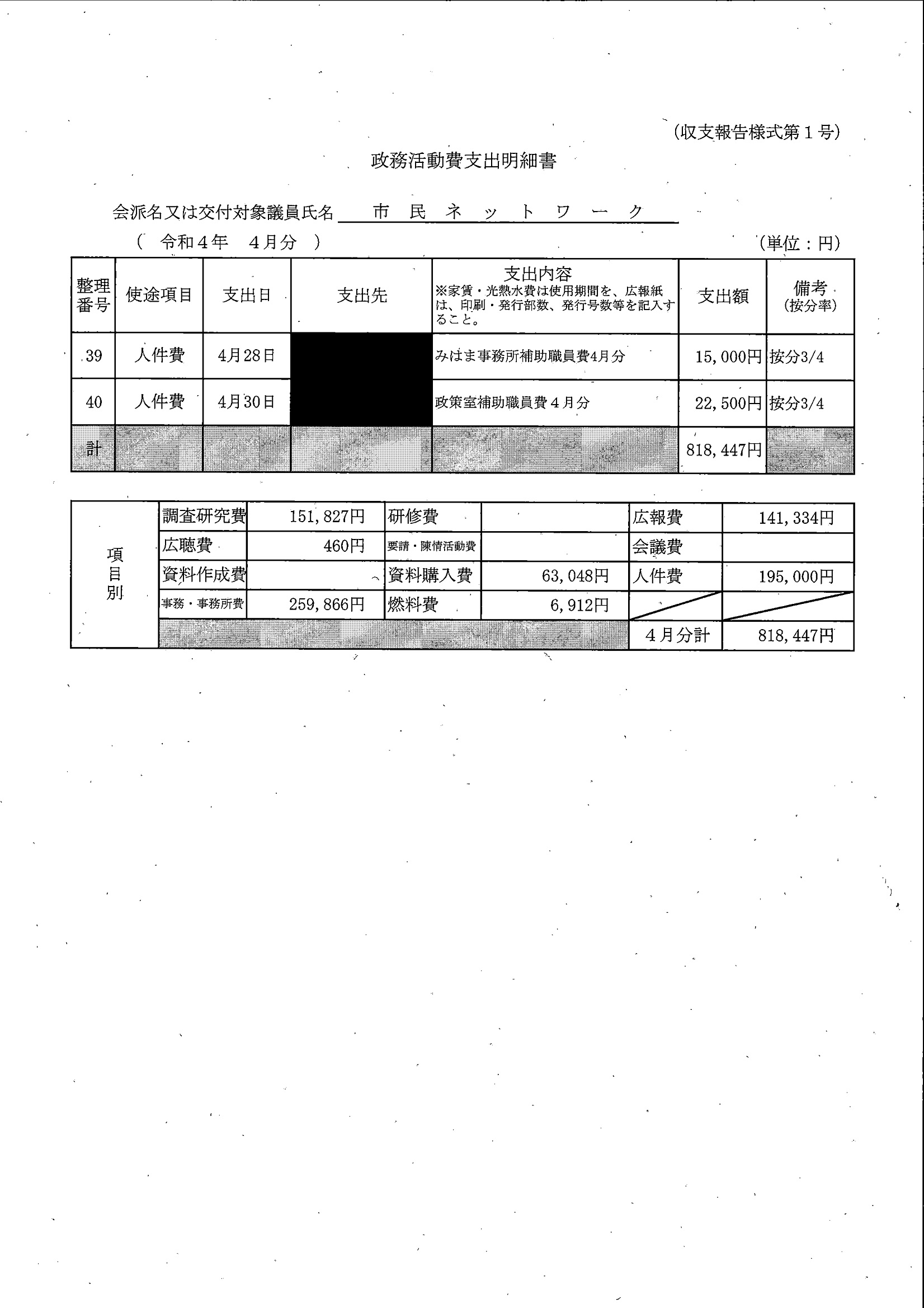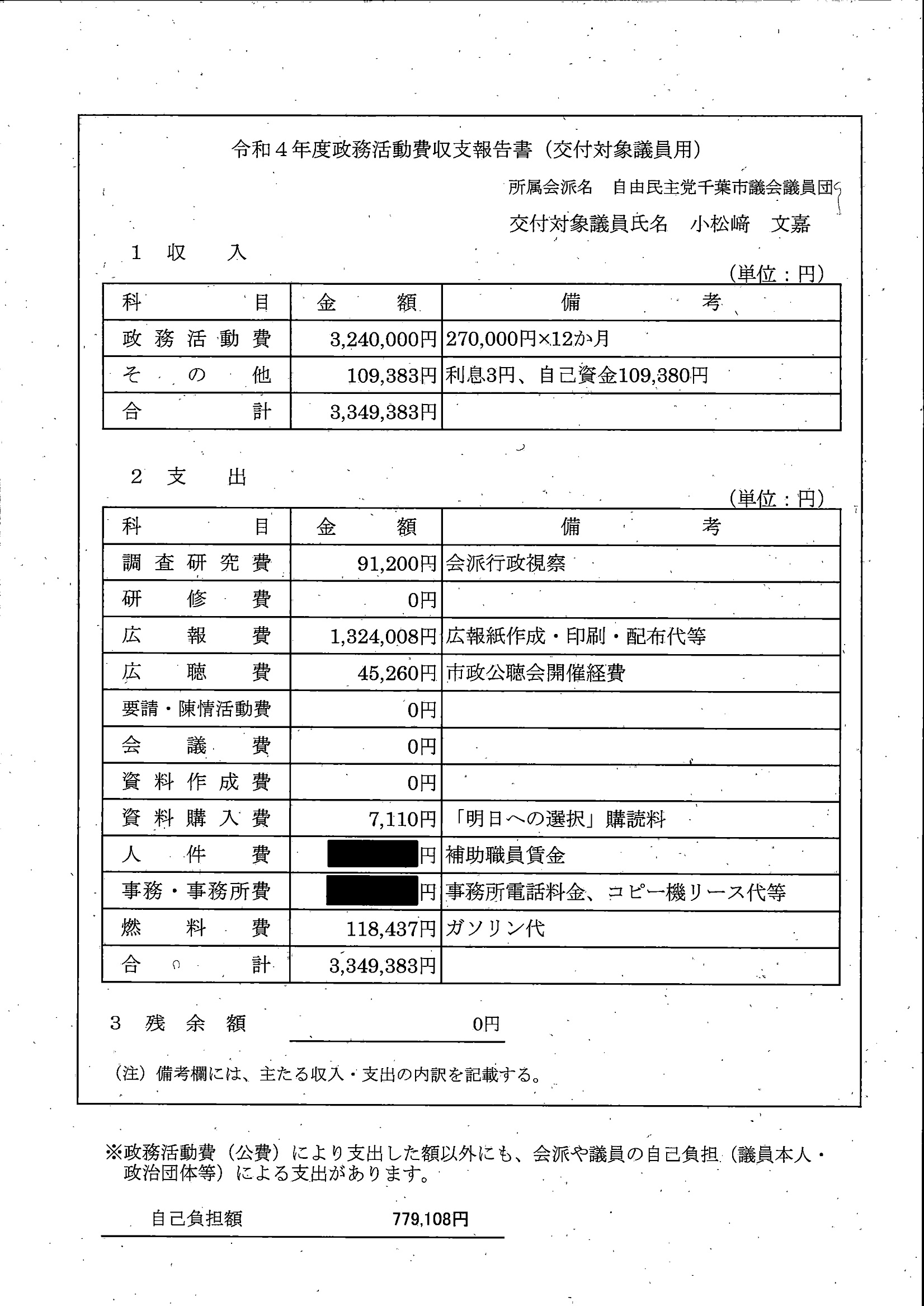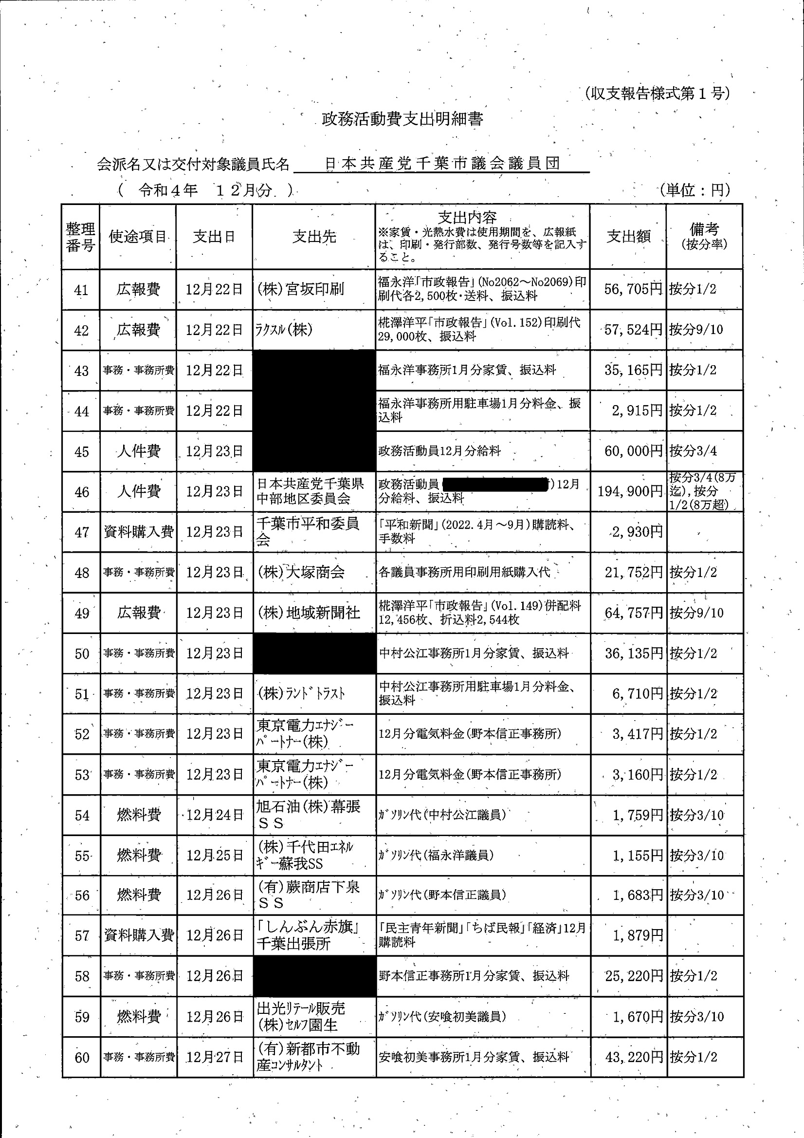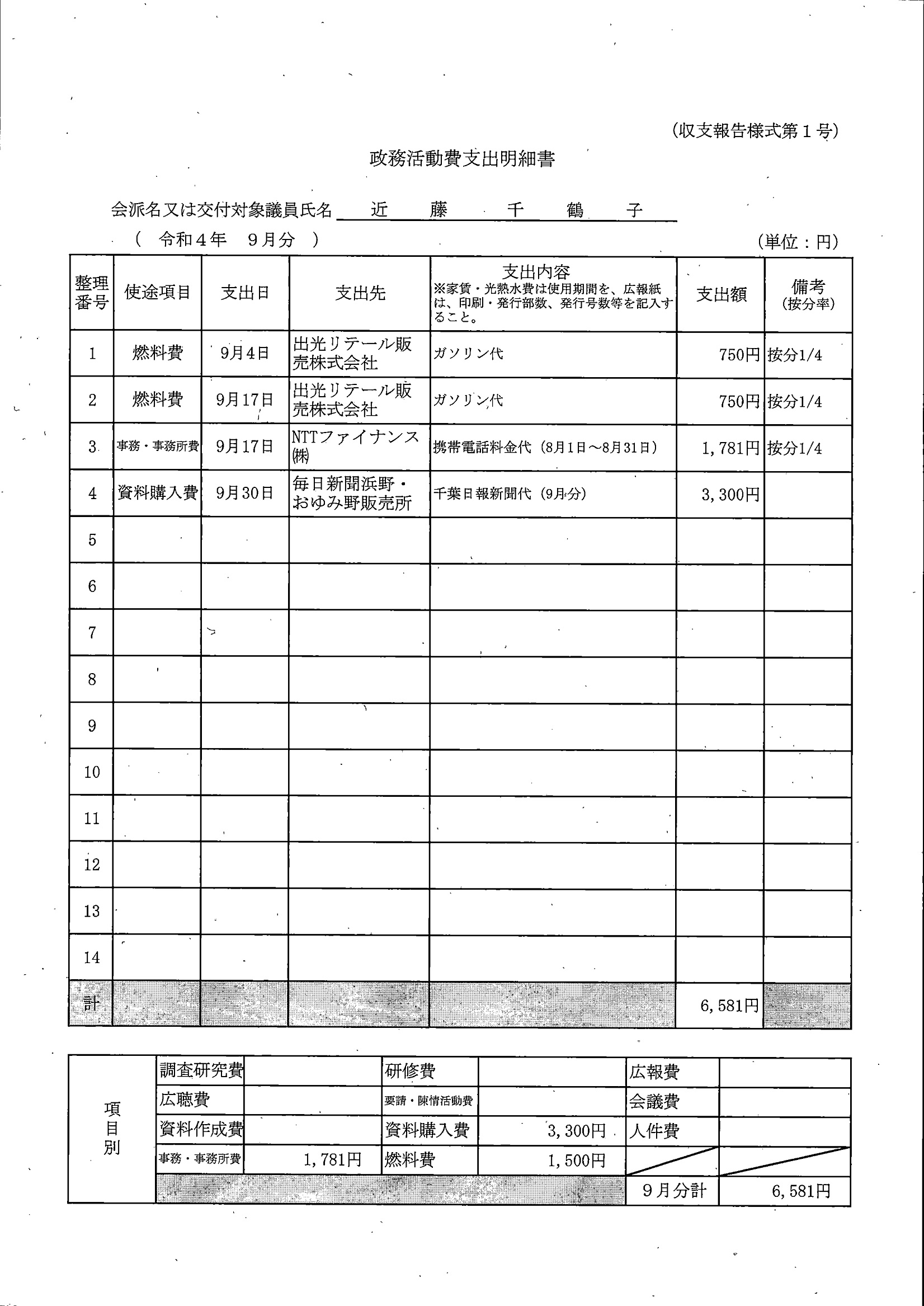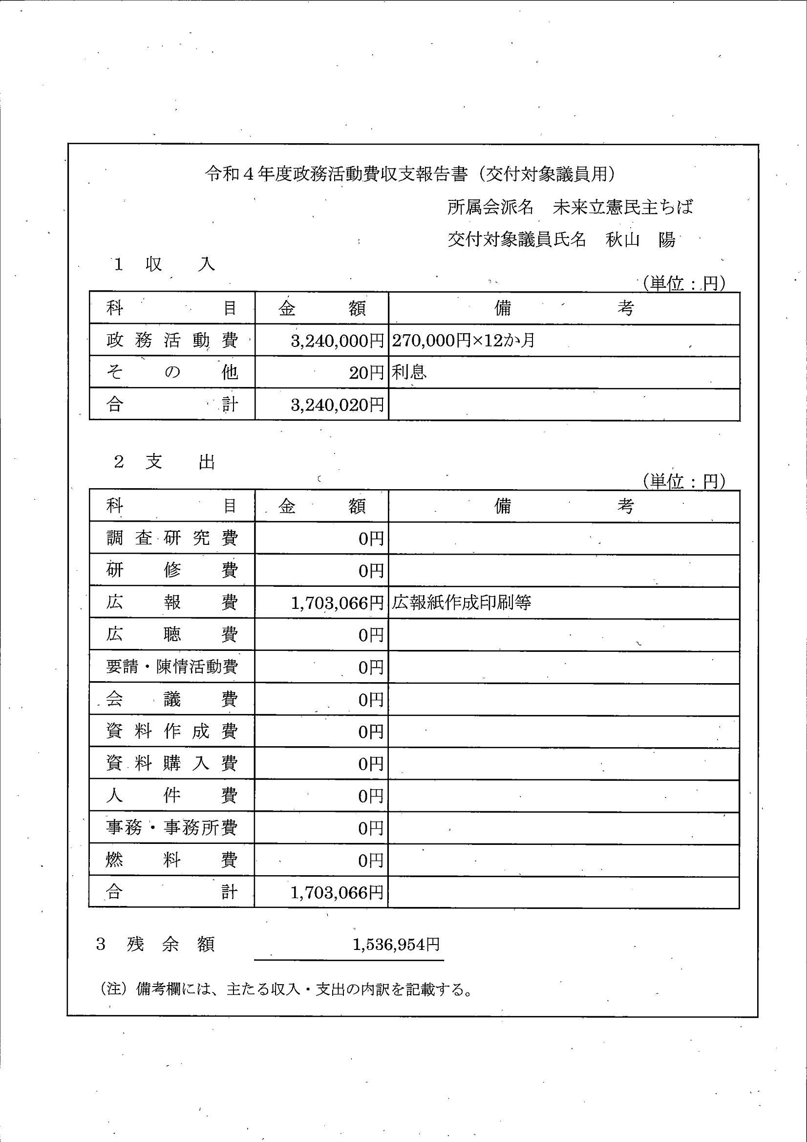 千葉市議会トップページ > 広報・情報公開 > 政務活動費 > 令和4年度交付分(政務活動費収支報告書)