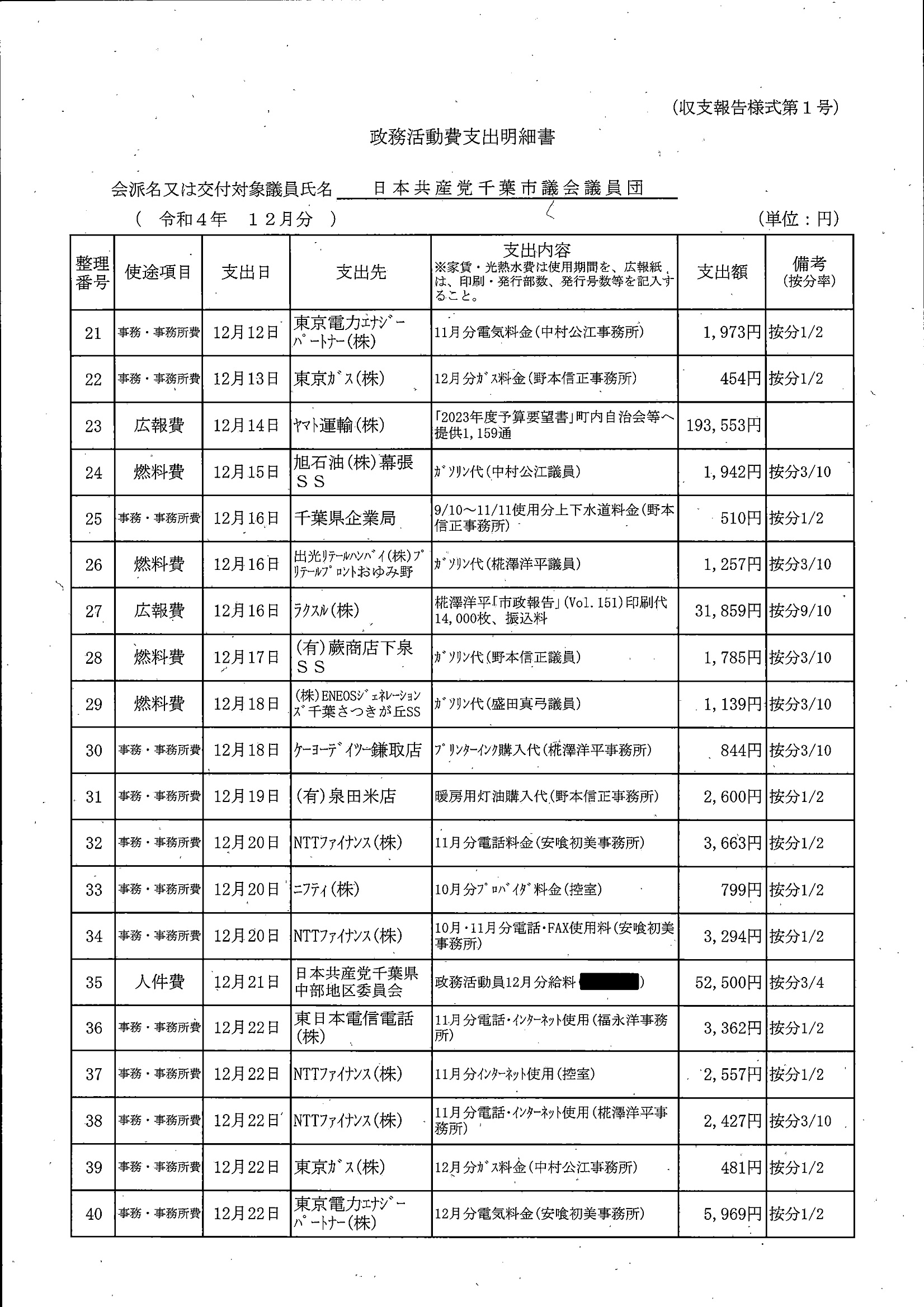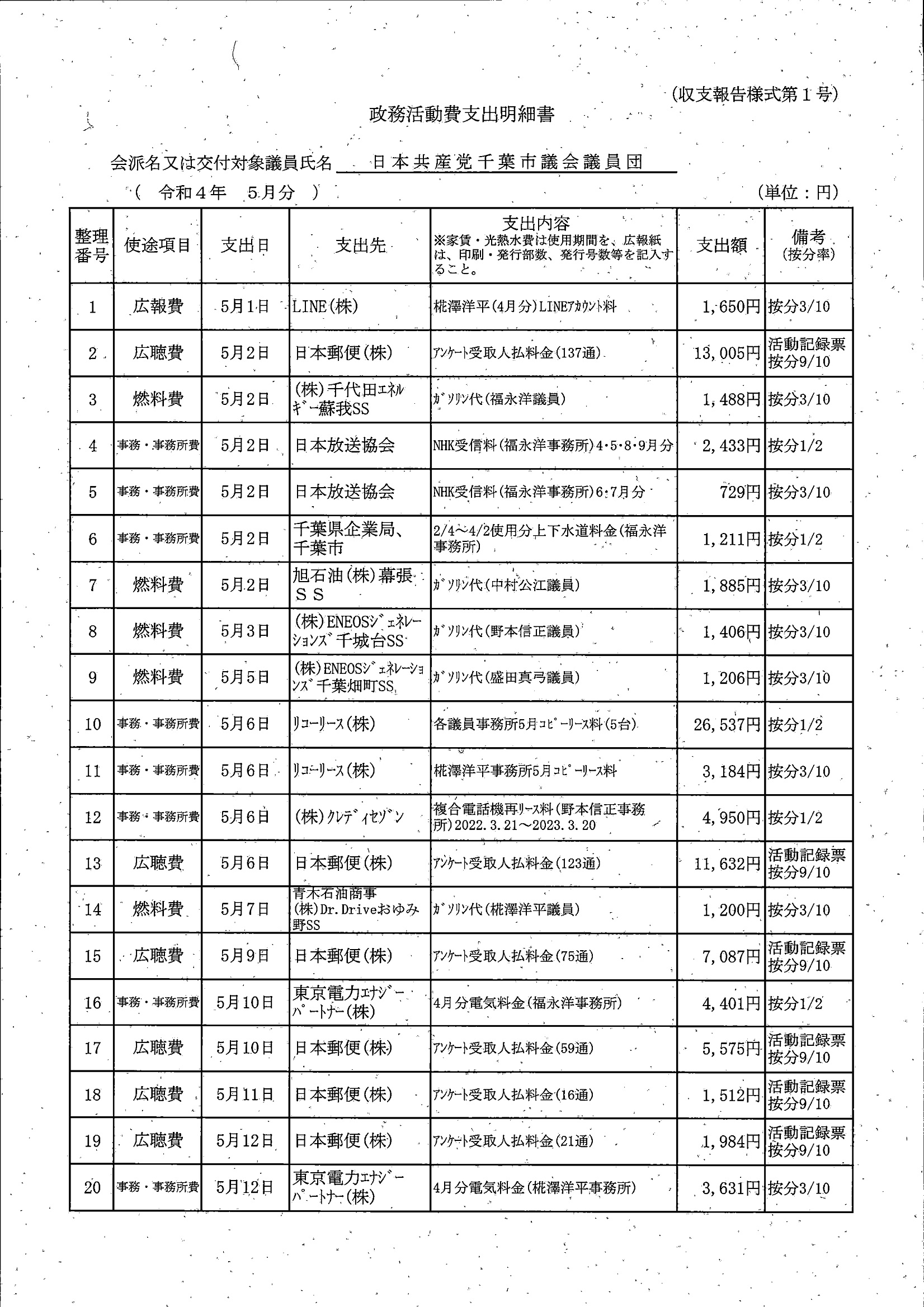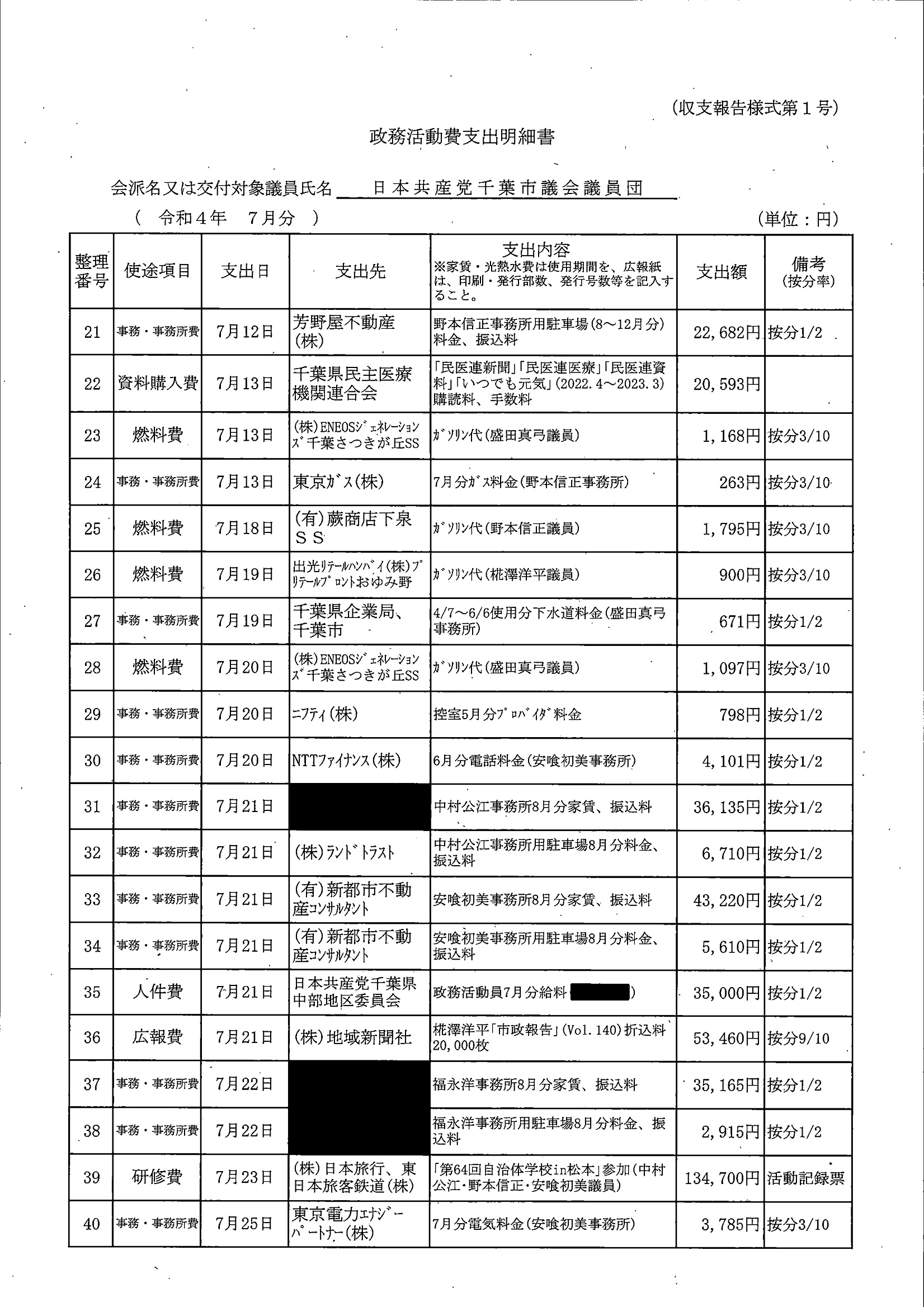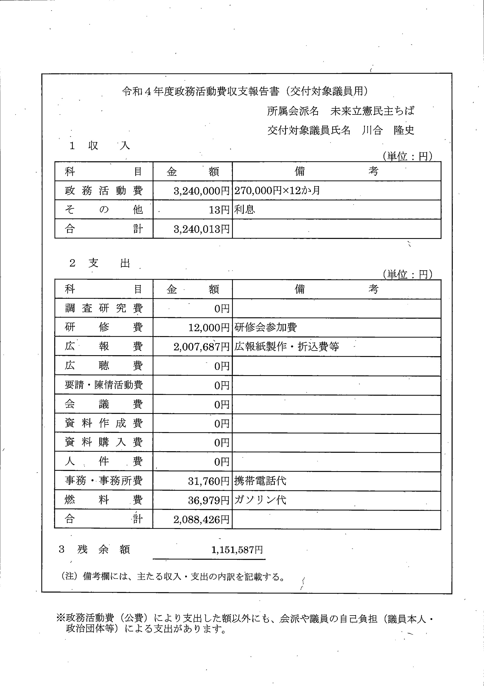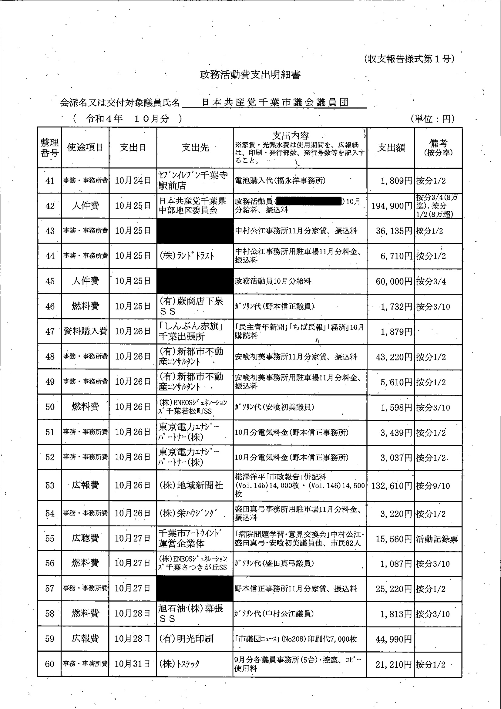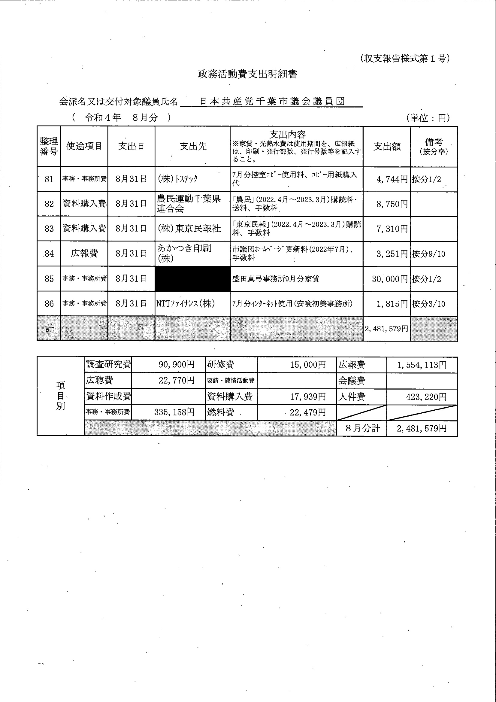 千葉市議会トップページ > 広報・情報公開 > 政務活動費 > 令和4年度交付分(政務活動費収支報告書)