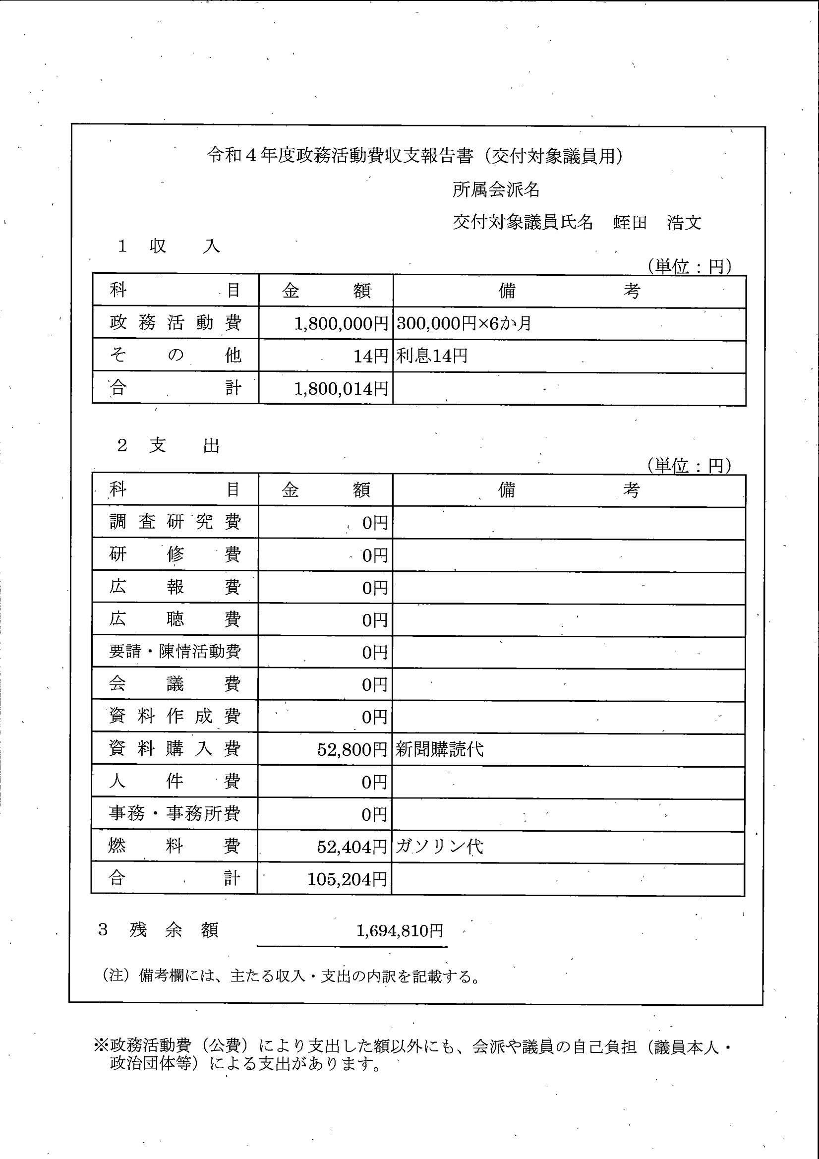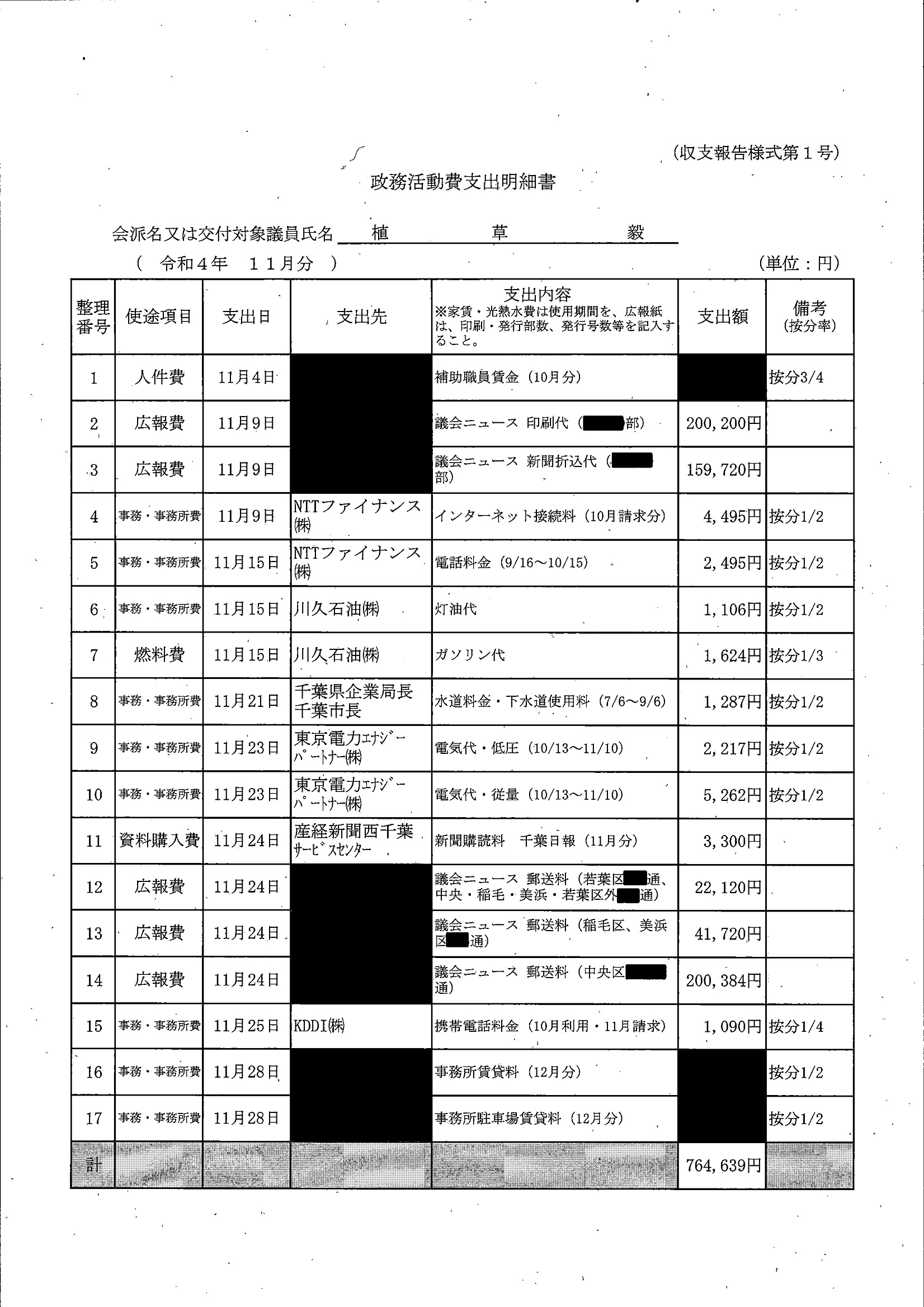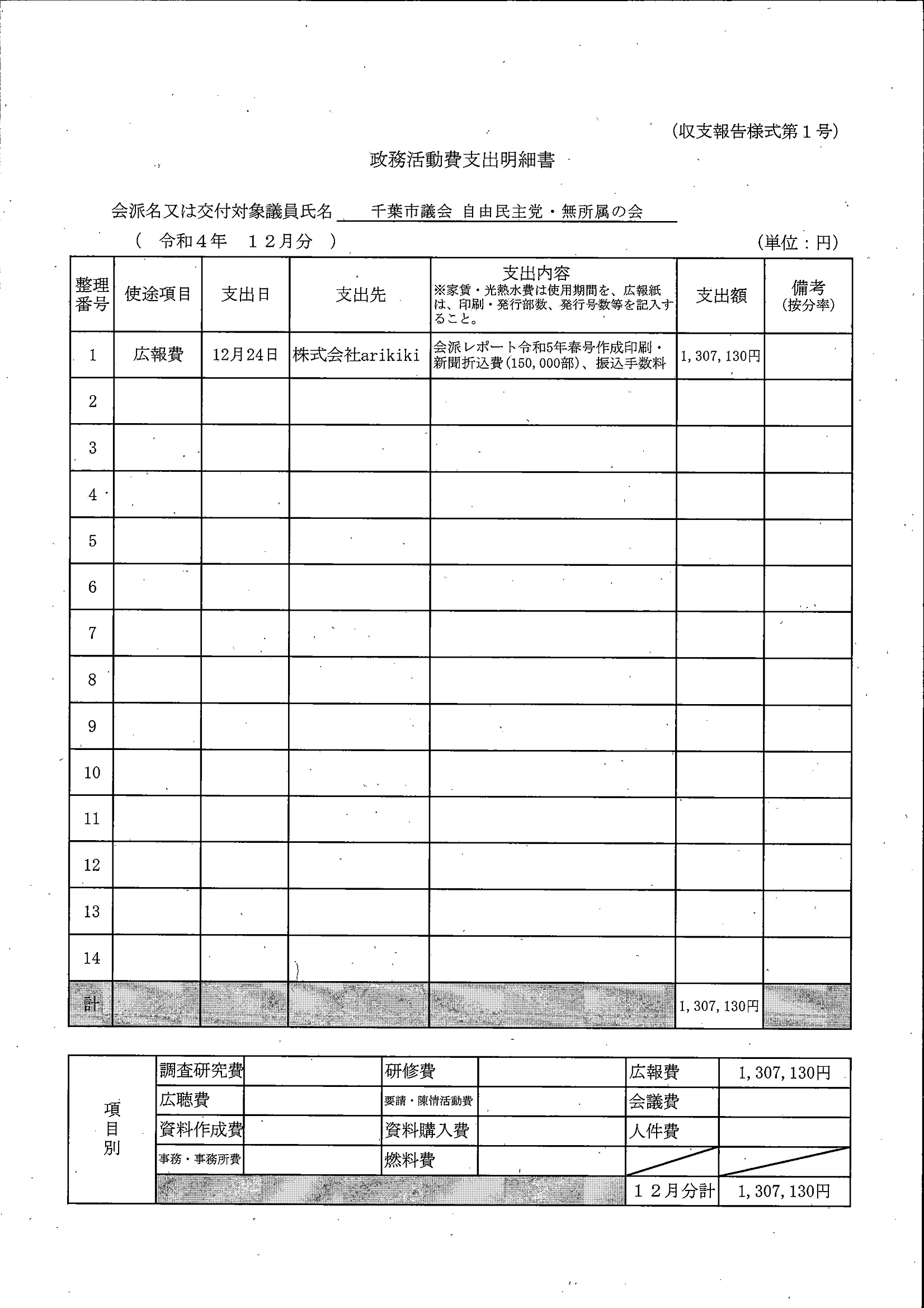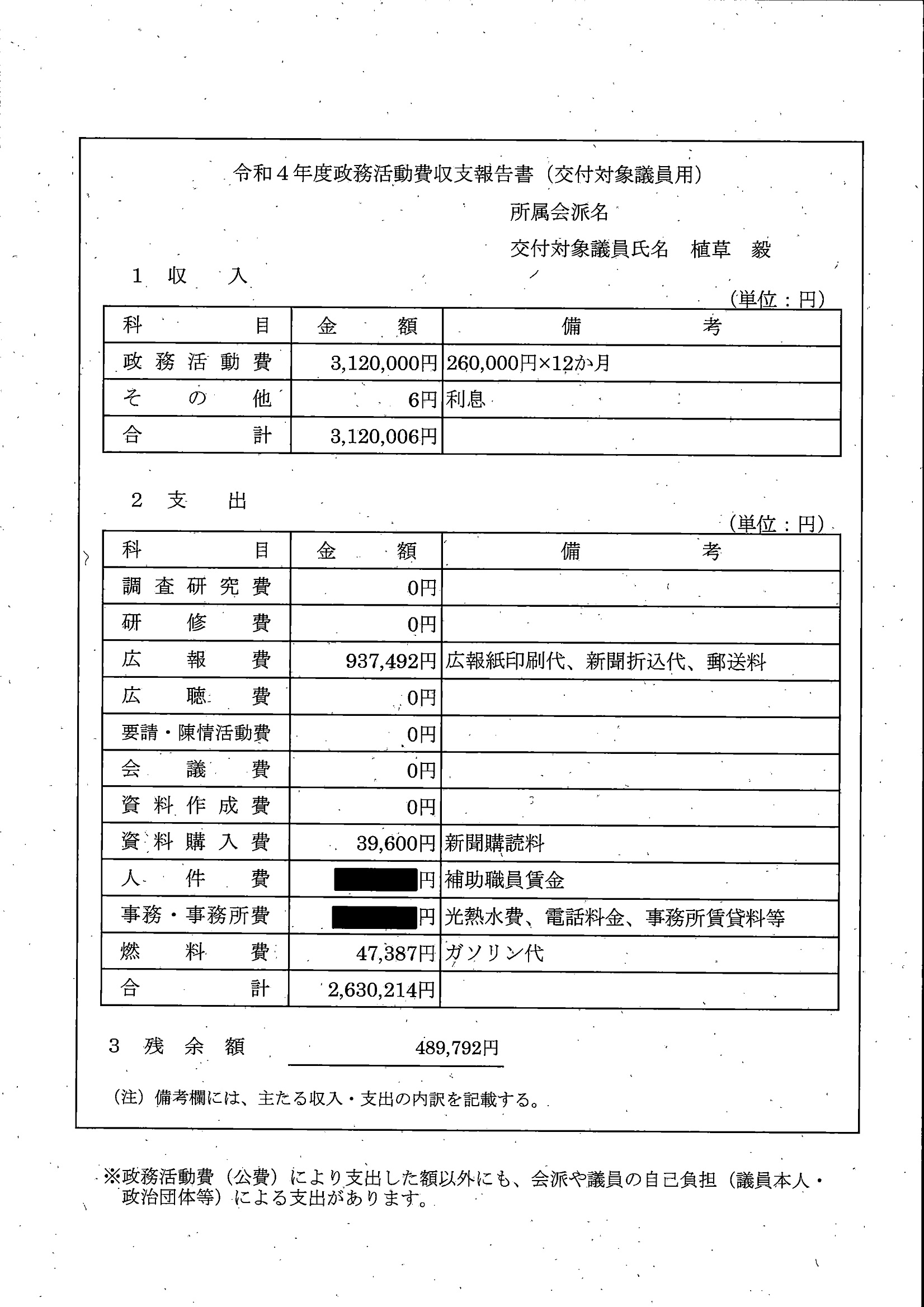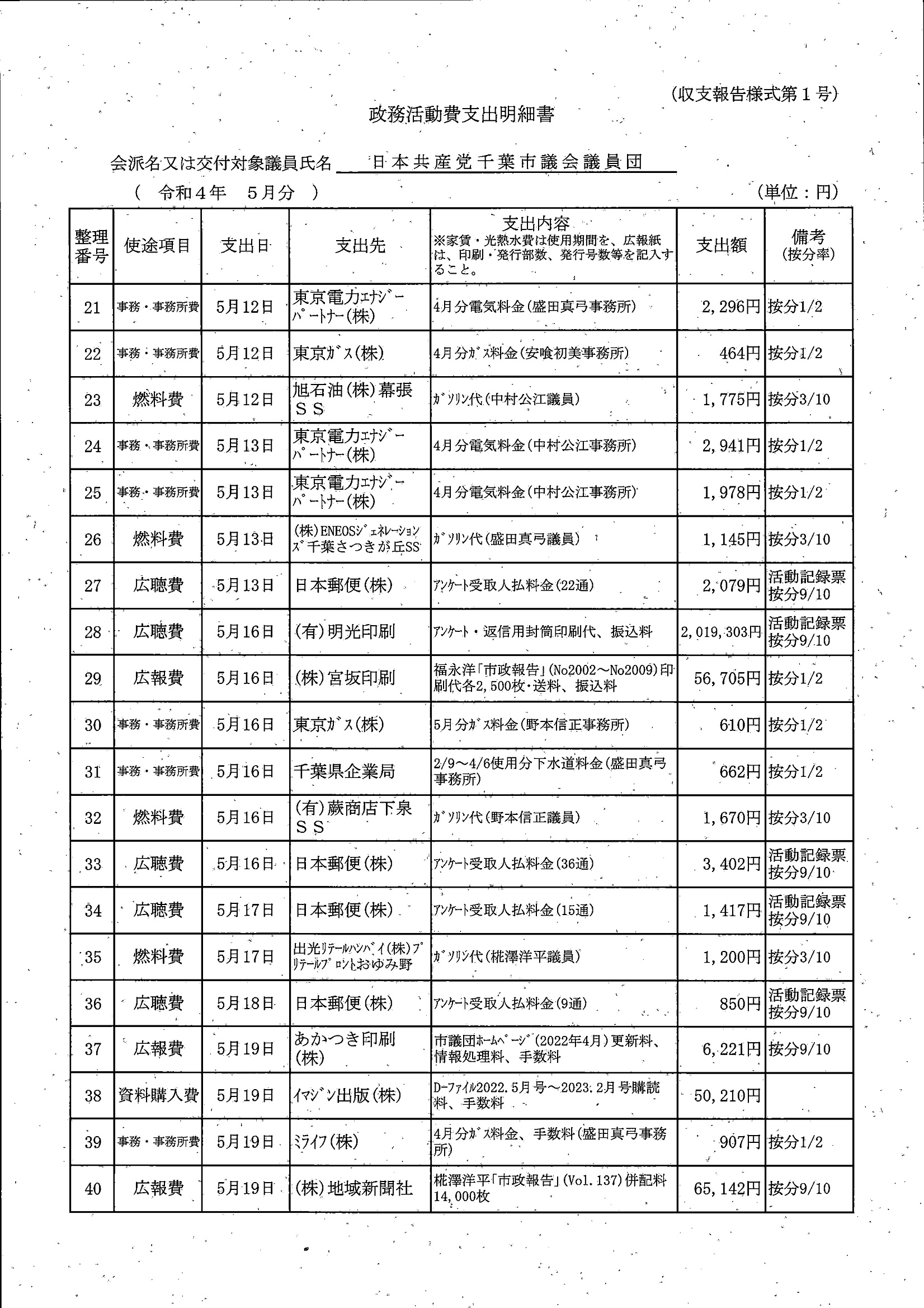 千葉市議会トップページ > 広報・情報公開 > 政務活動費 > 令和4年度交付分(政務活動費収支報告書)