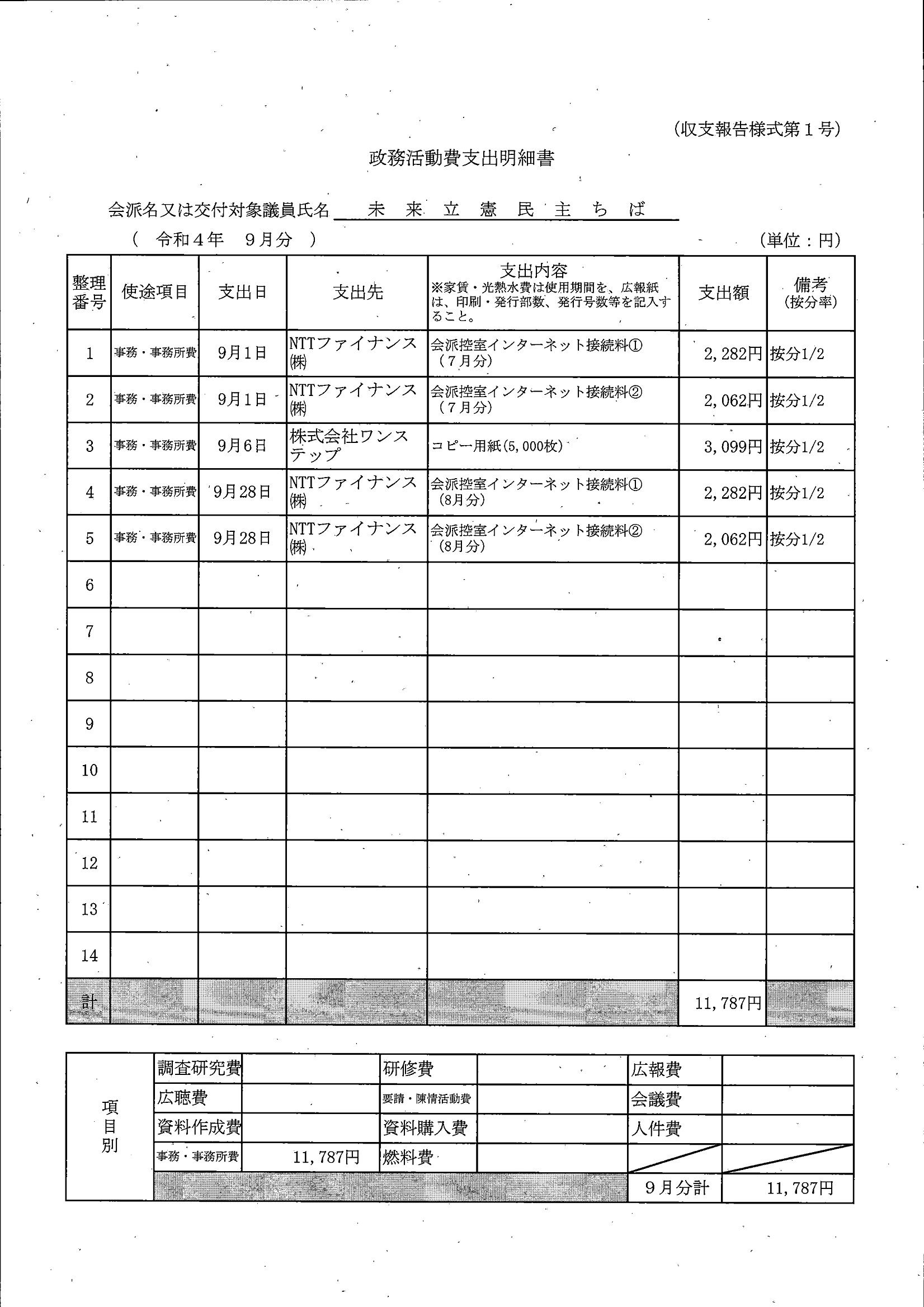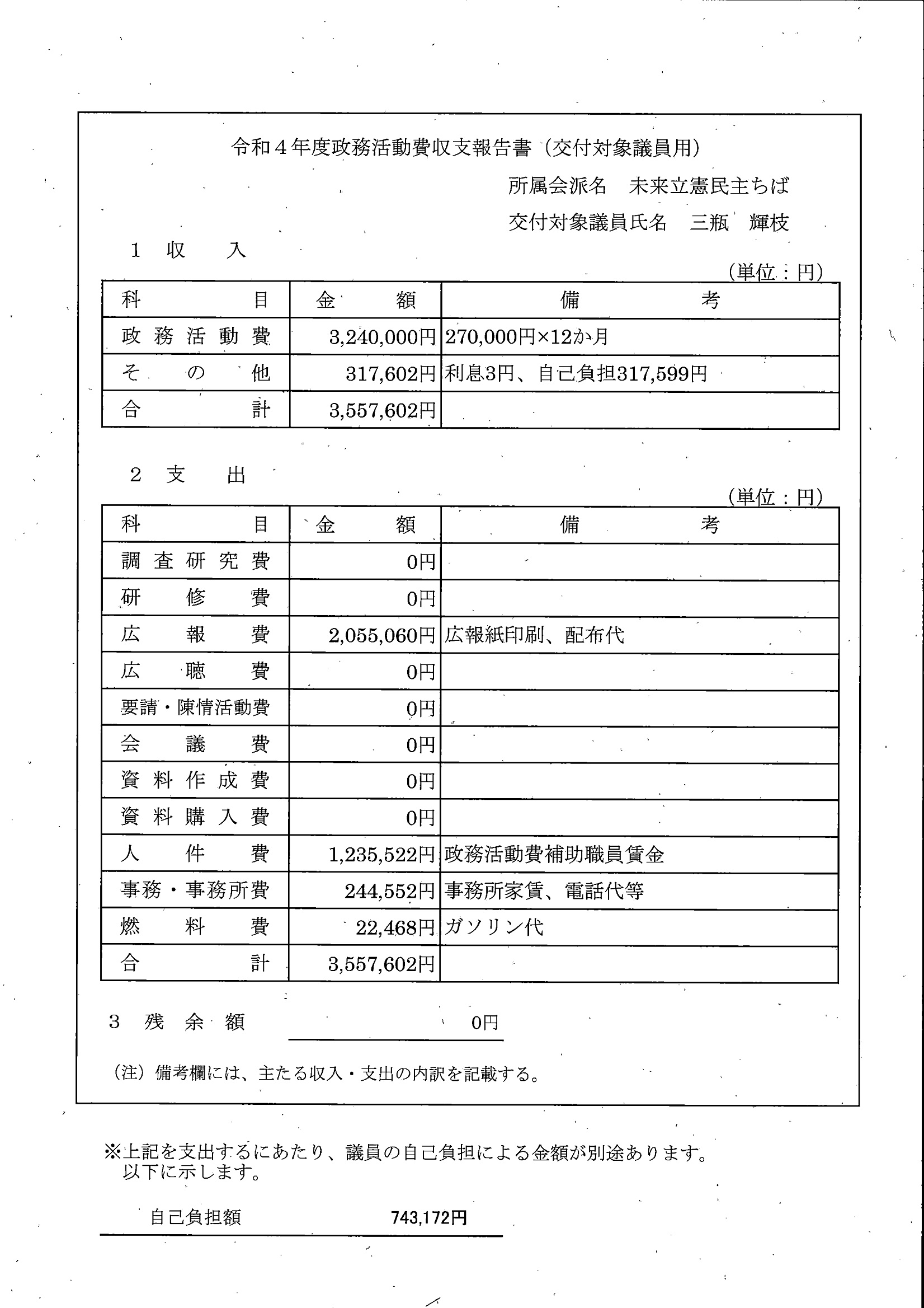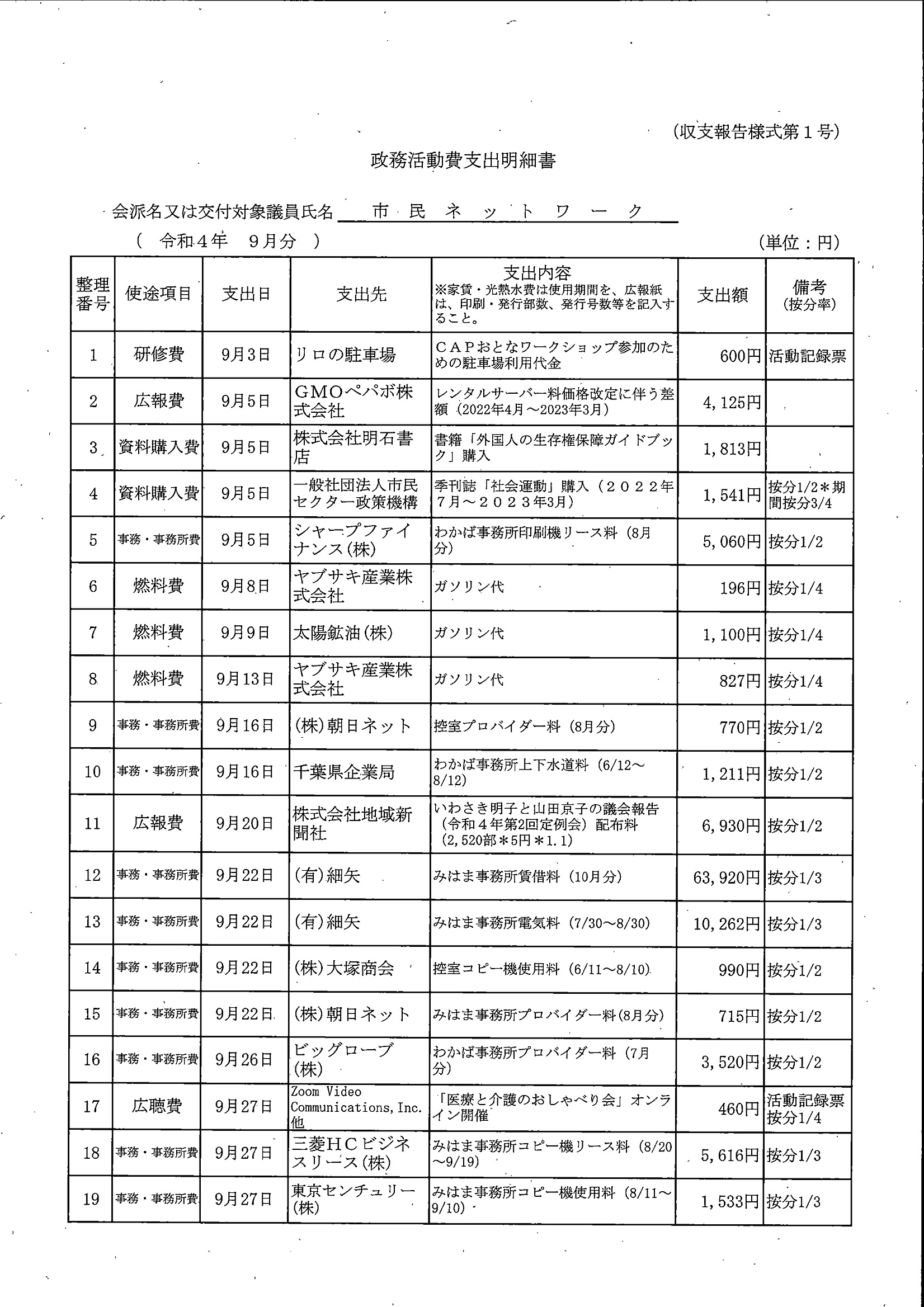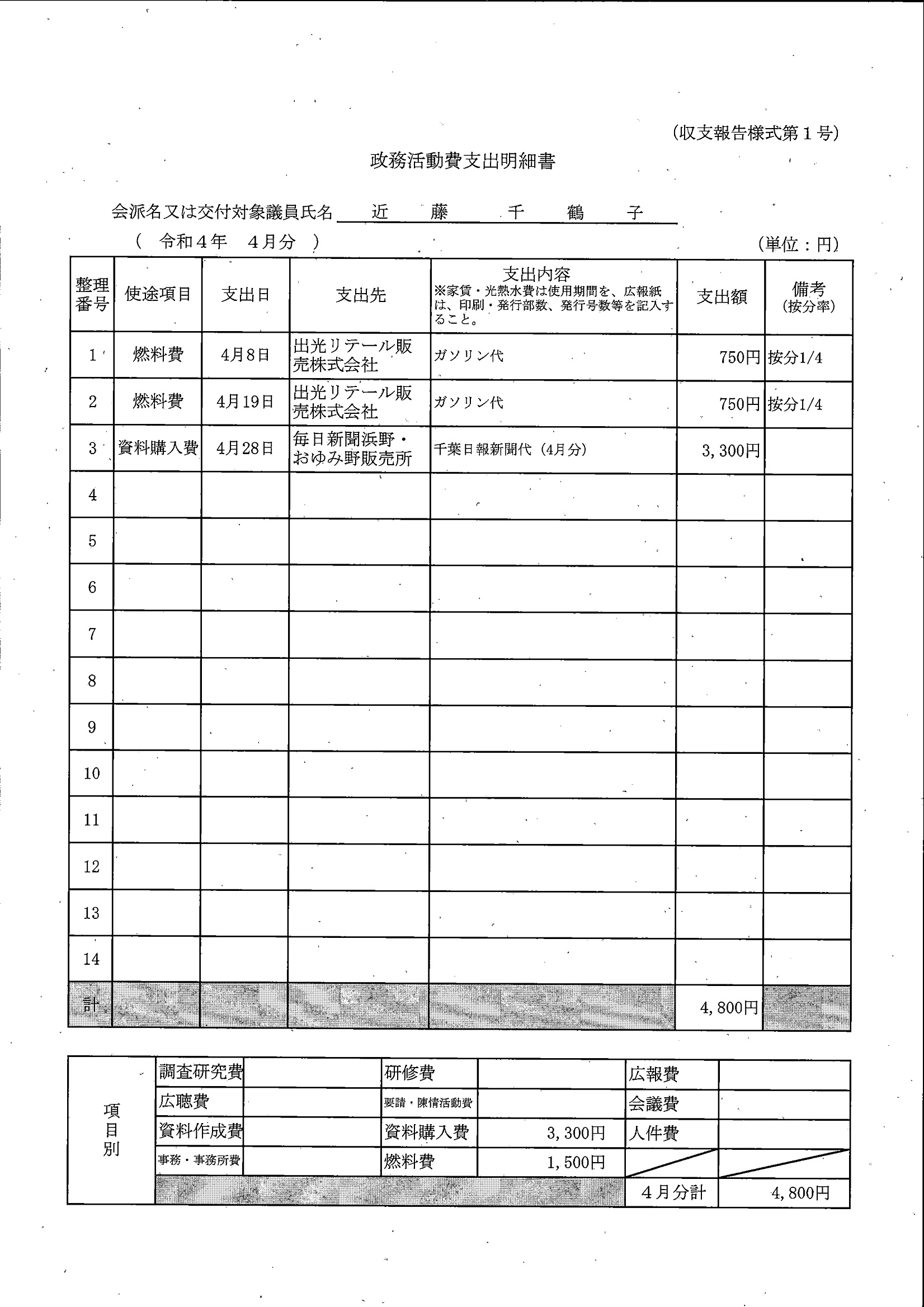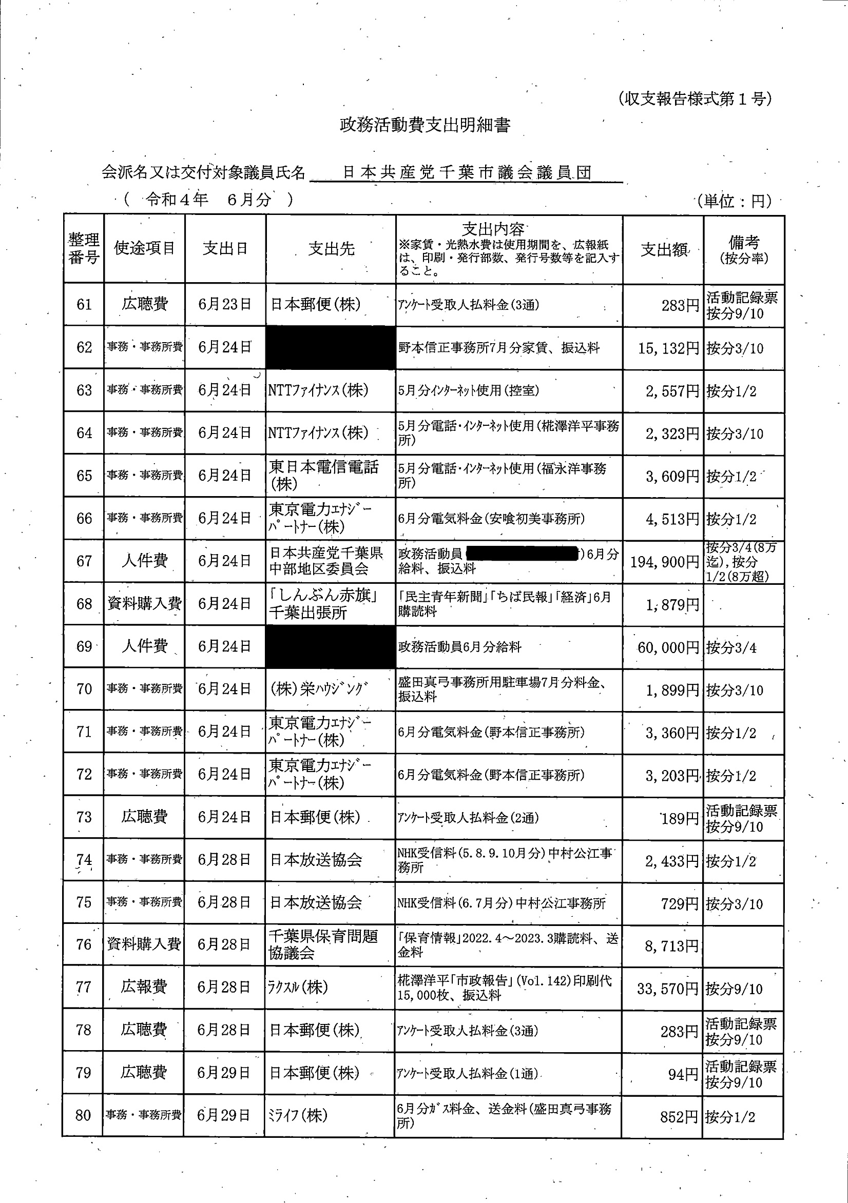 千葉市議会トップページ > 広報・情報公開 > 政務活動費 > 令和4年度交付分(政務活動費収支報告書)