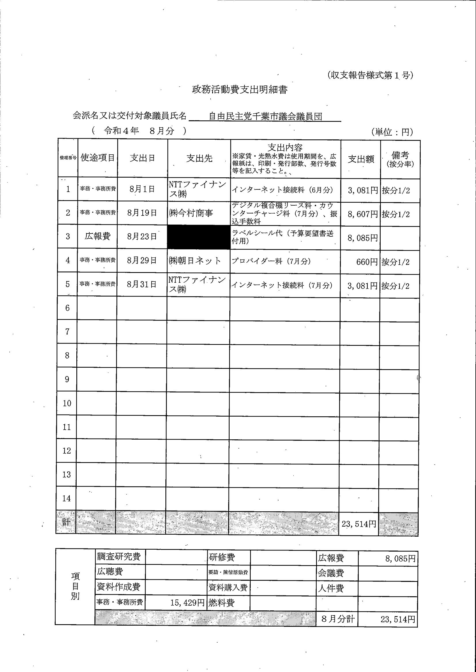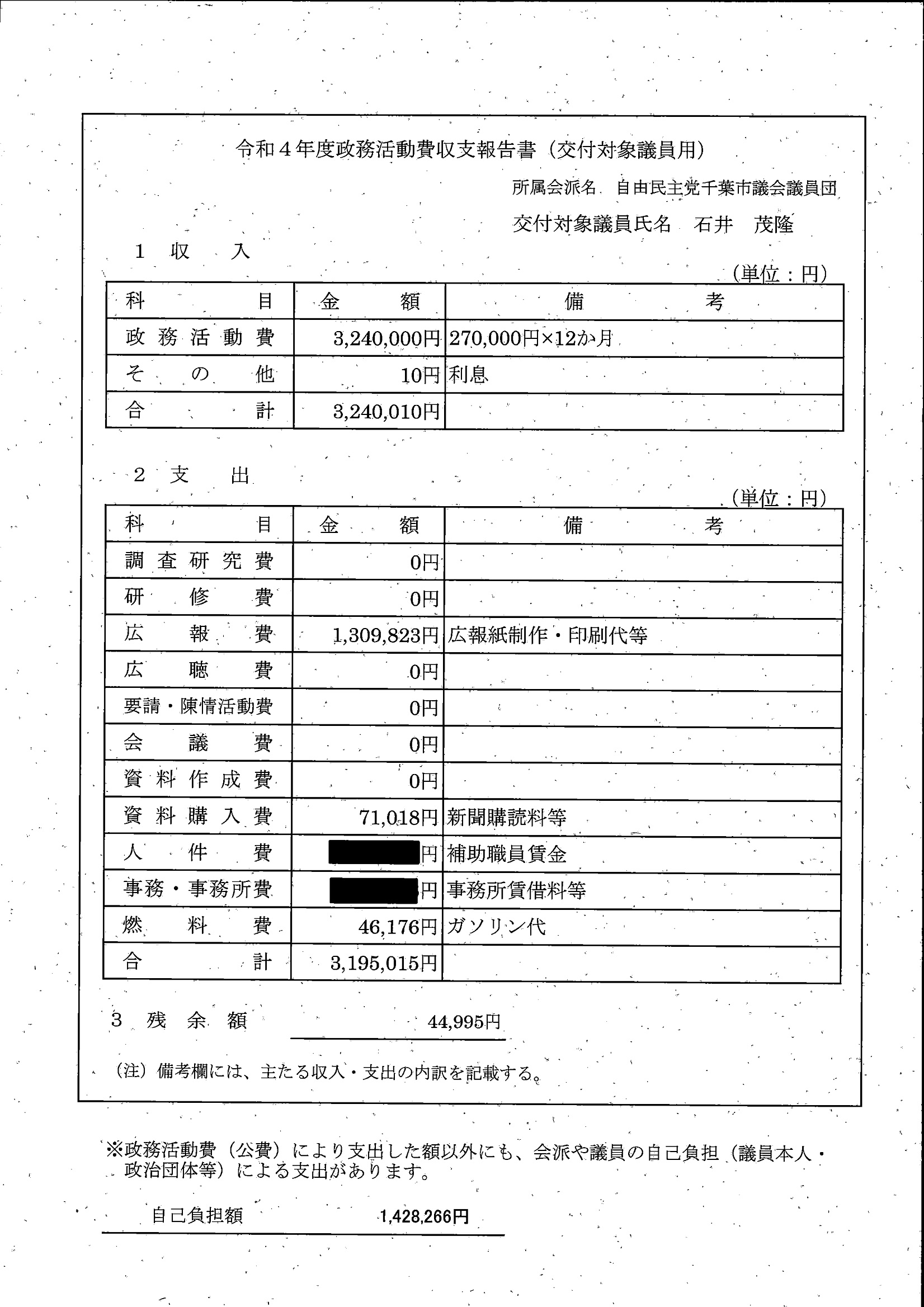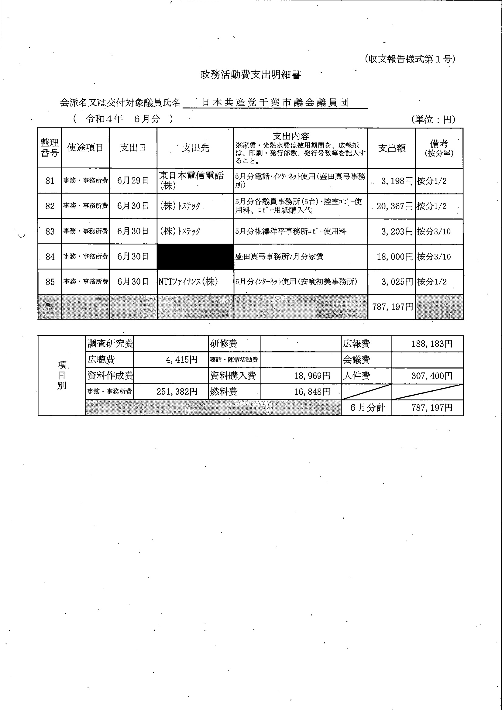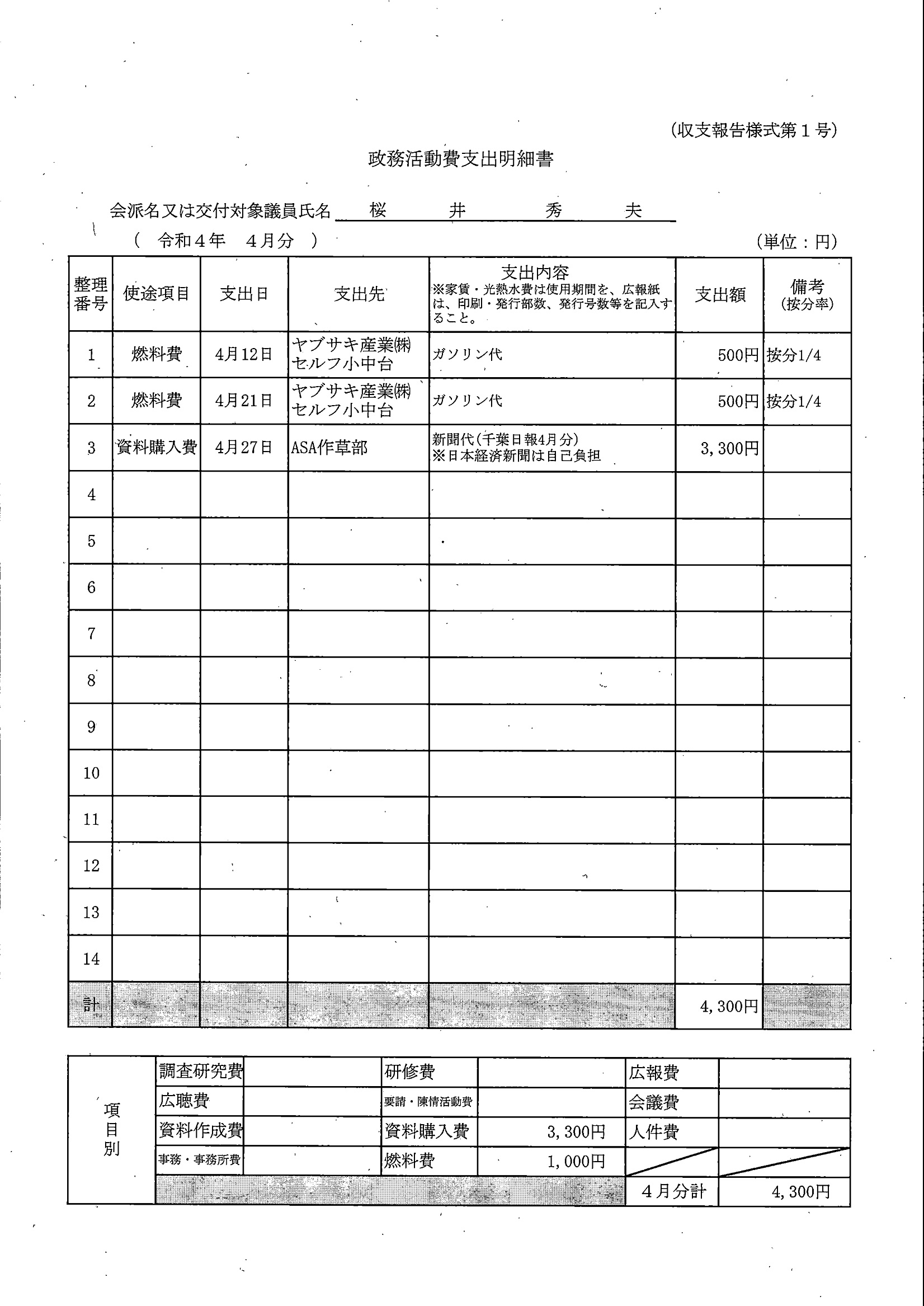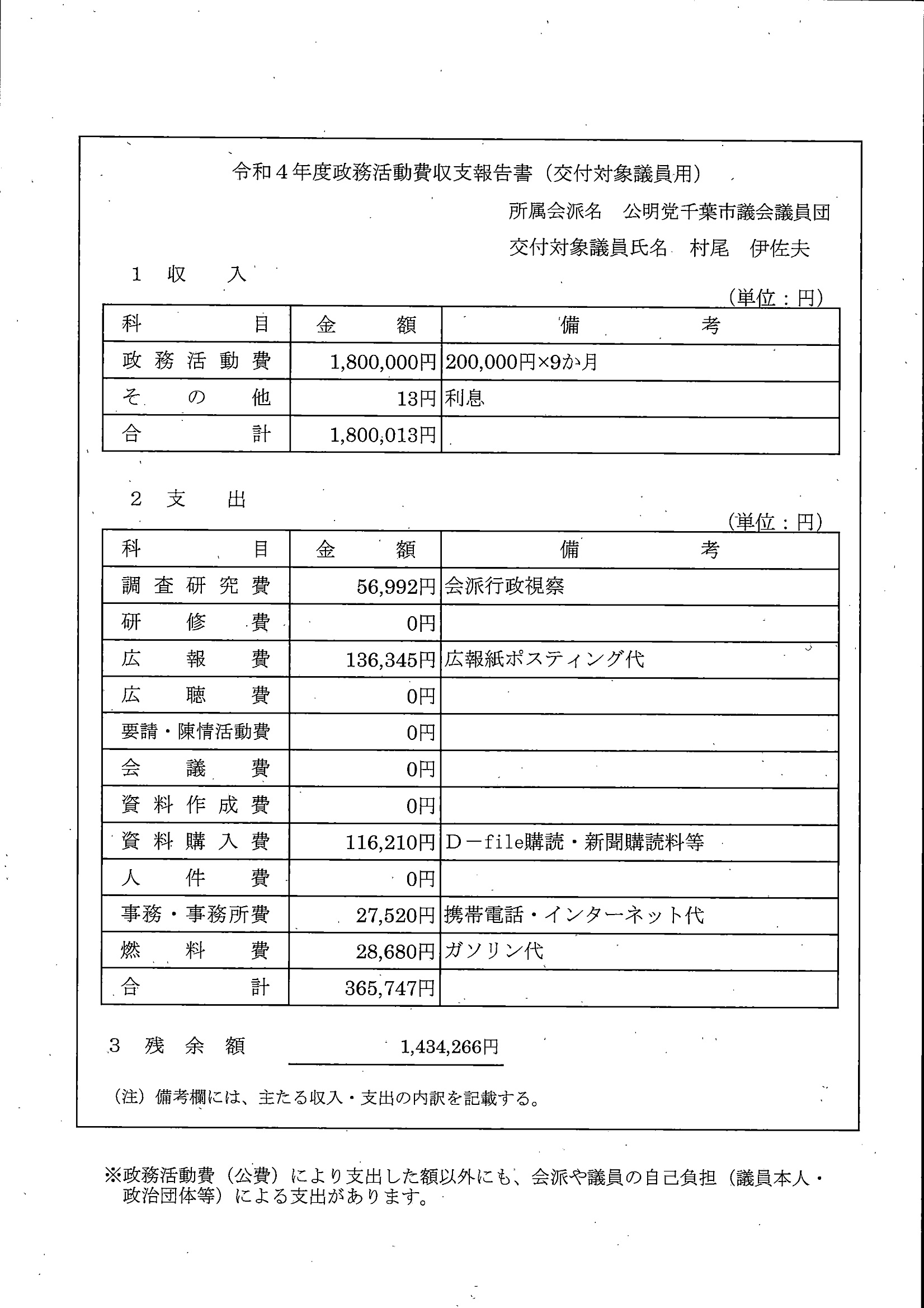 千葉市議会トップページ > 広報・情報公開 > 政務活動費 > 令和4年度交付分(政務活動費収支報告書)