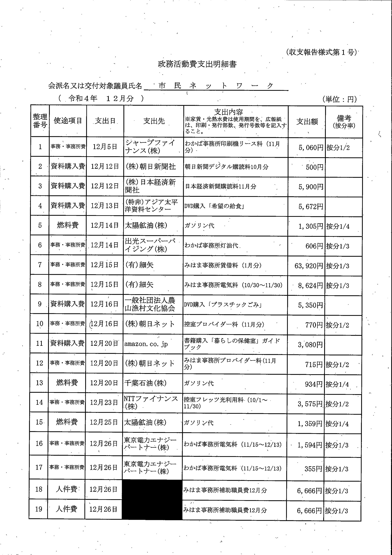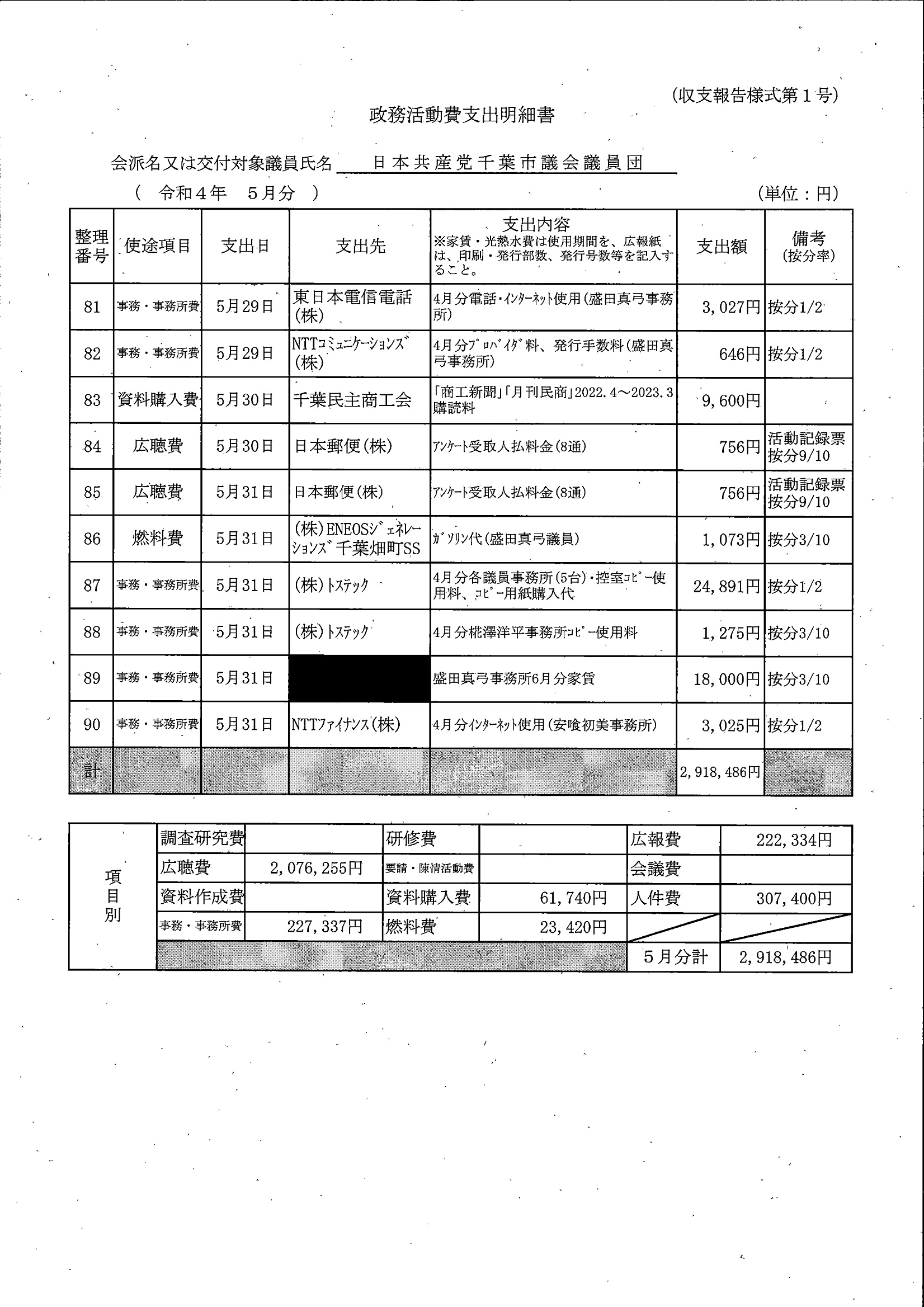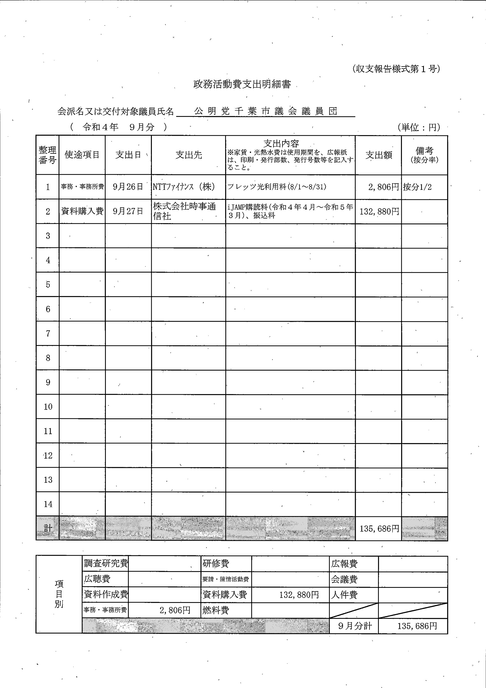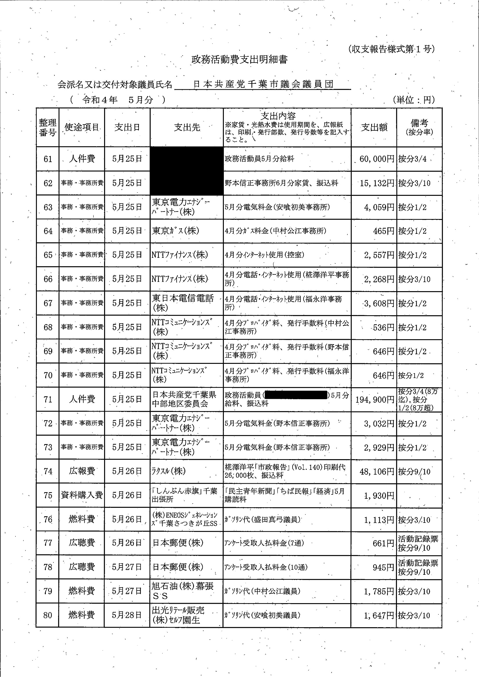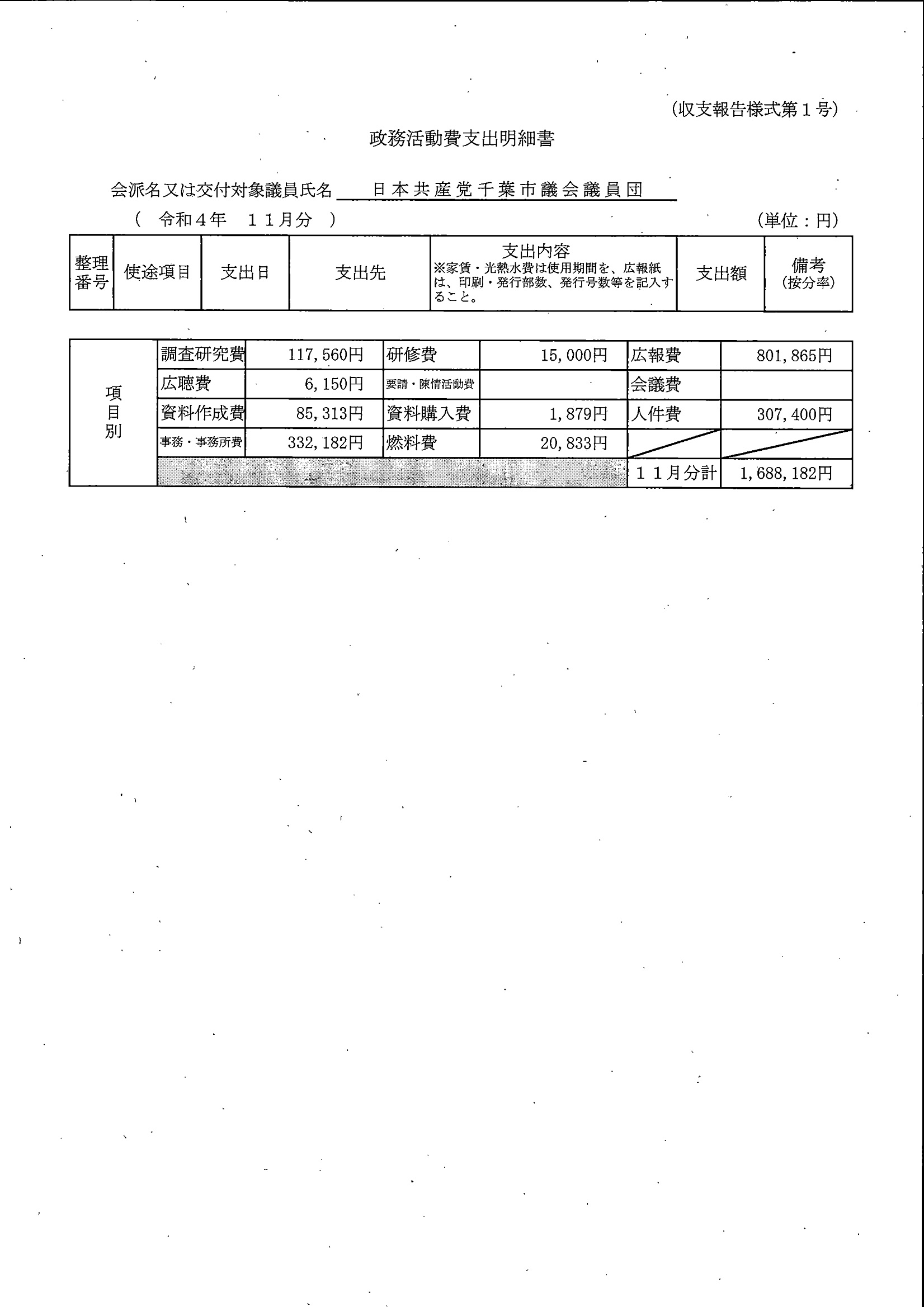 千葉市議会トップページ > 広報・情報公開 > 政務活動費 > 令和4年度交付分(政務活動費収支報告書)
