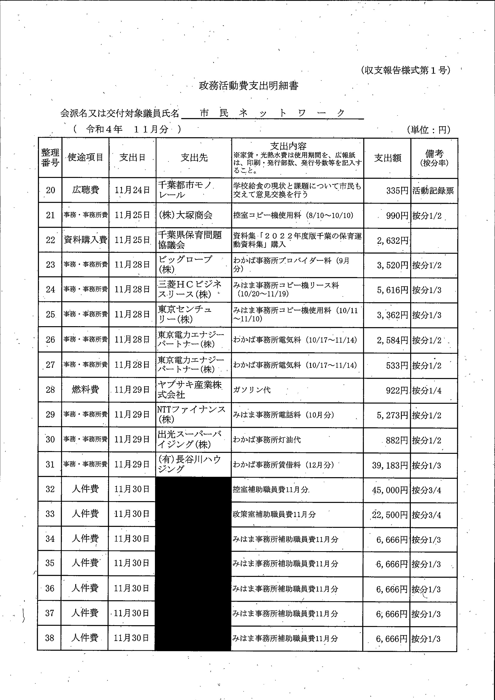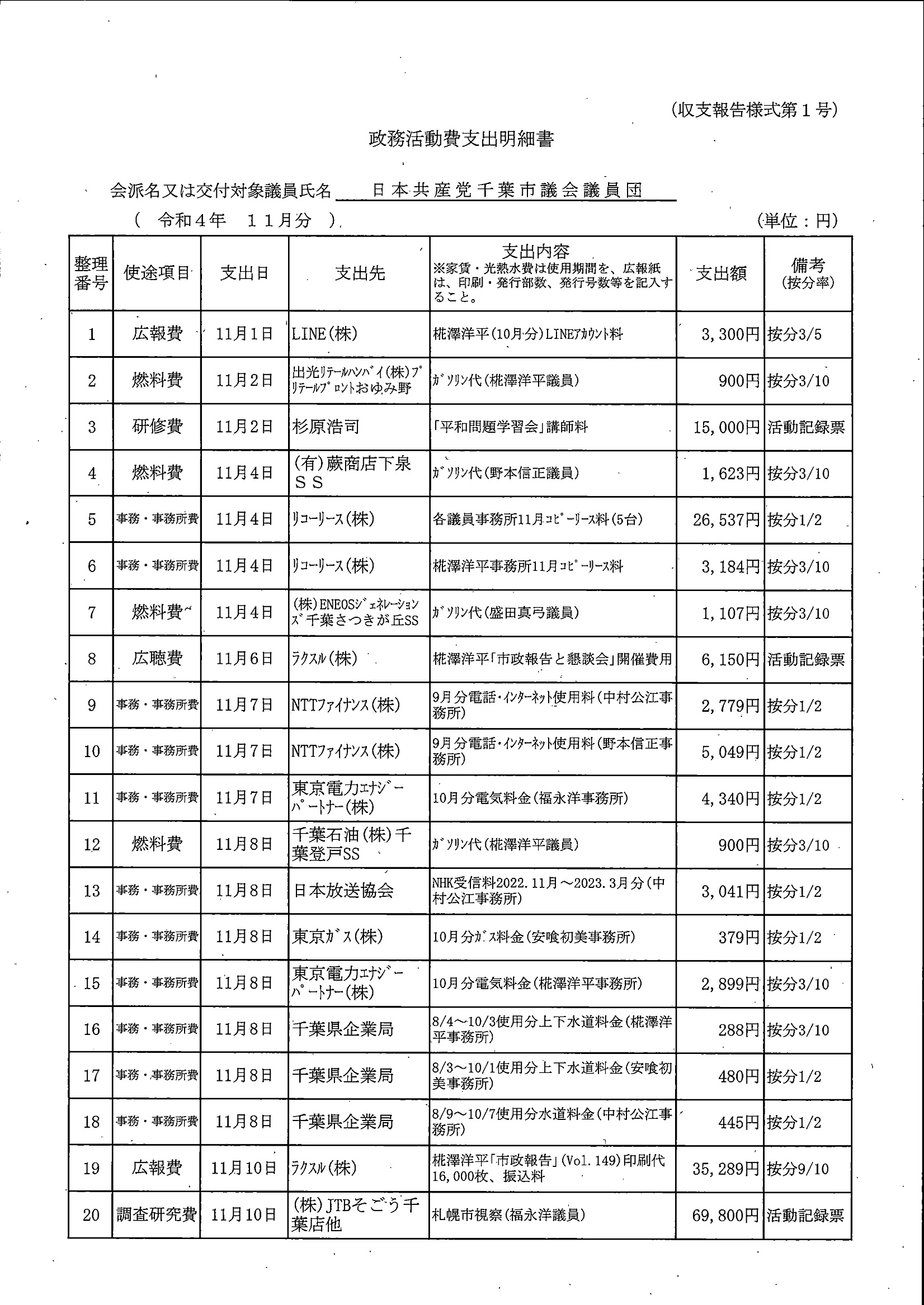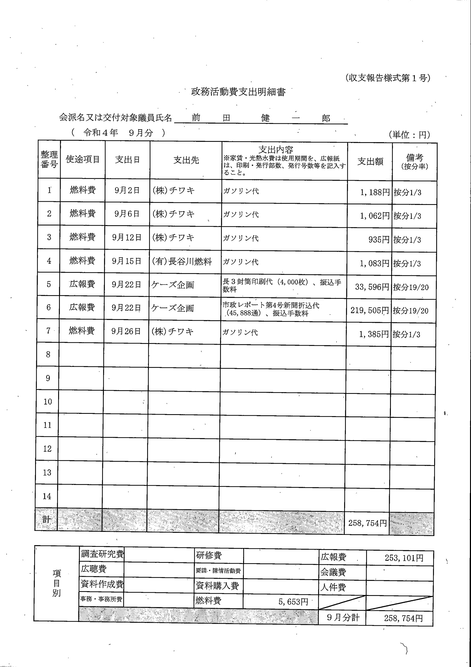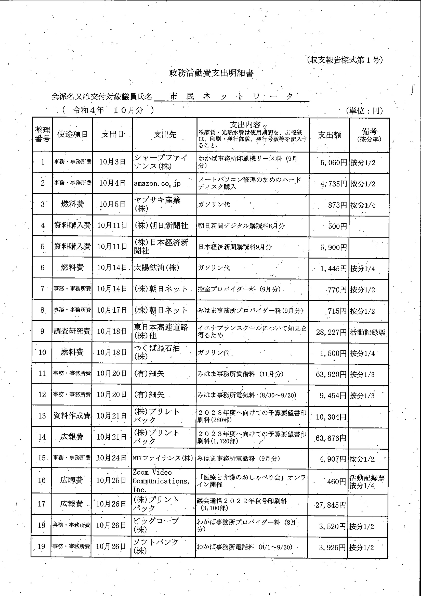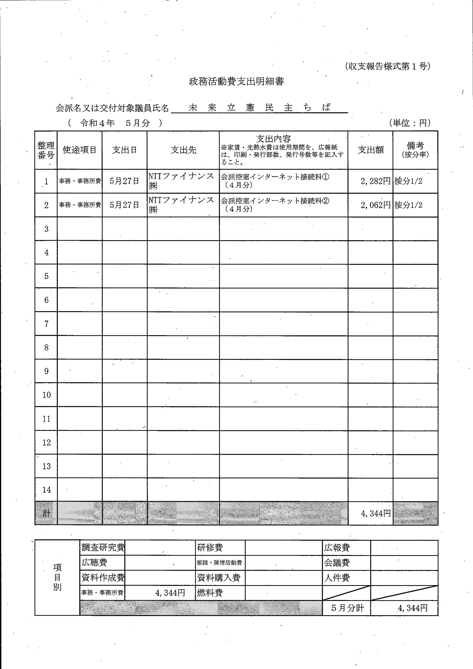 千葉市議会トップページ > 広報・情報公開 > 政務活動費 > 令和4年度交付分(政務活動費収支報告書)