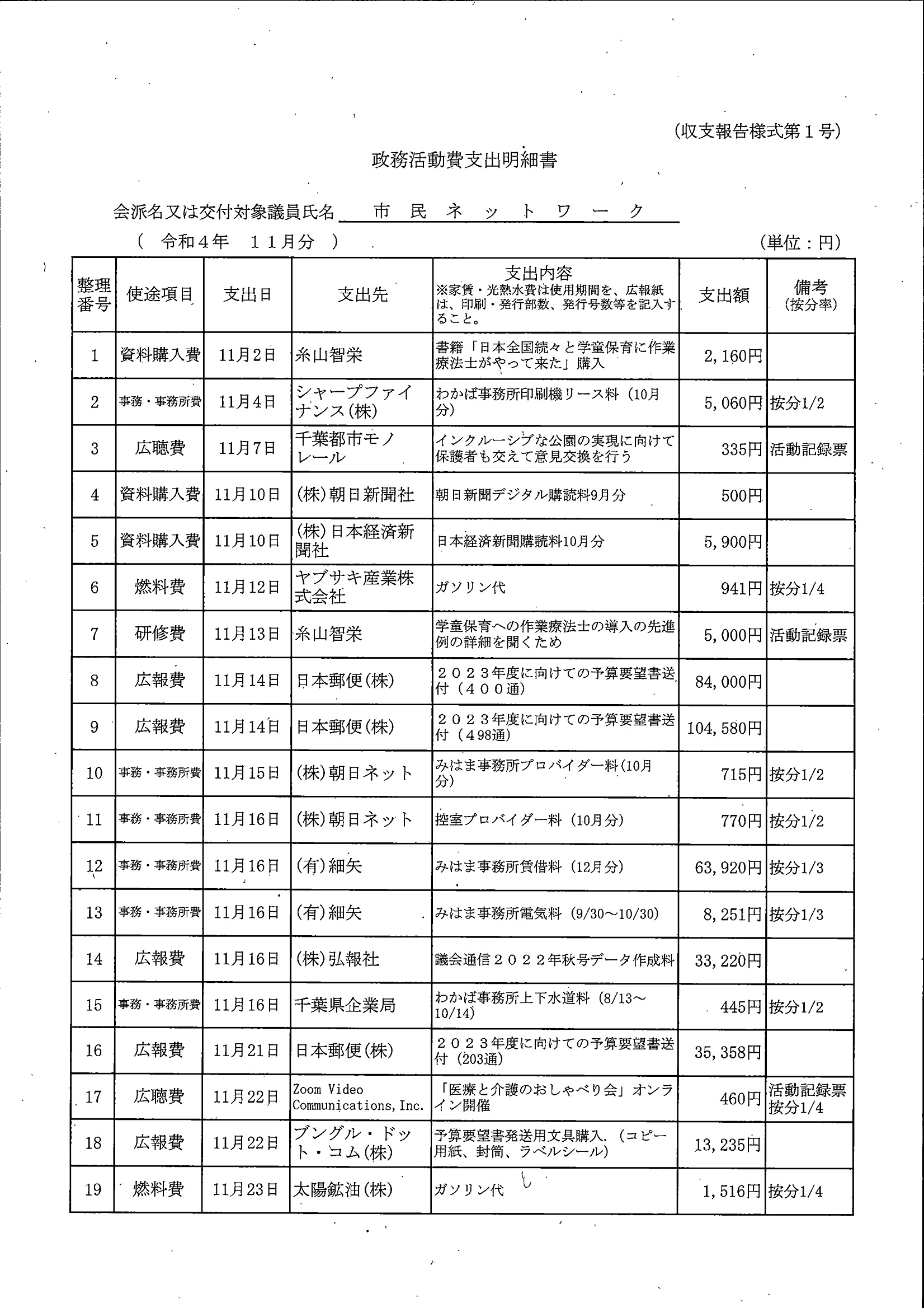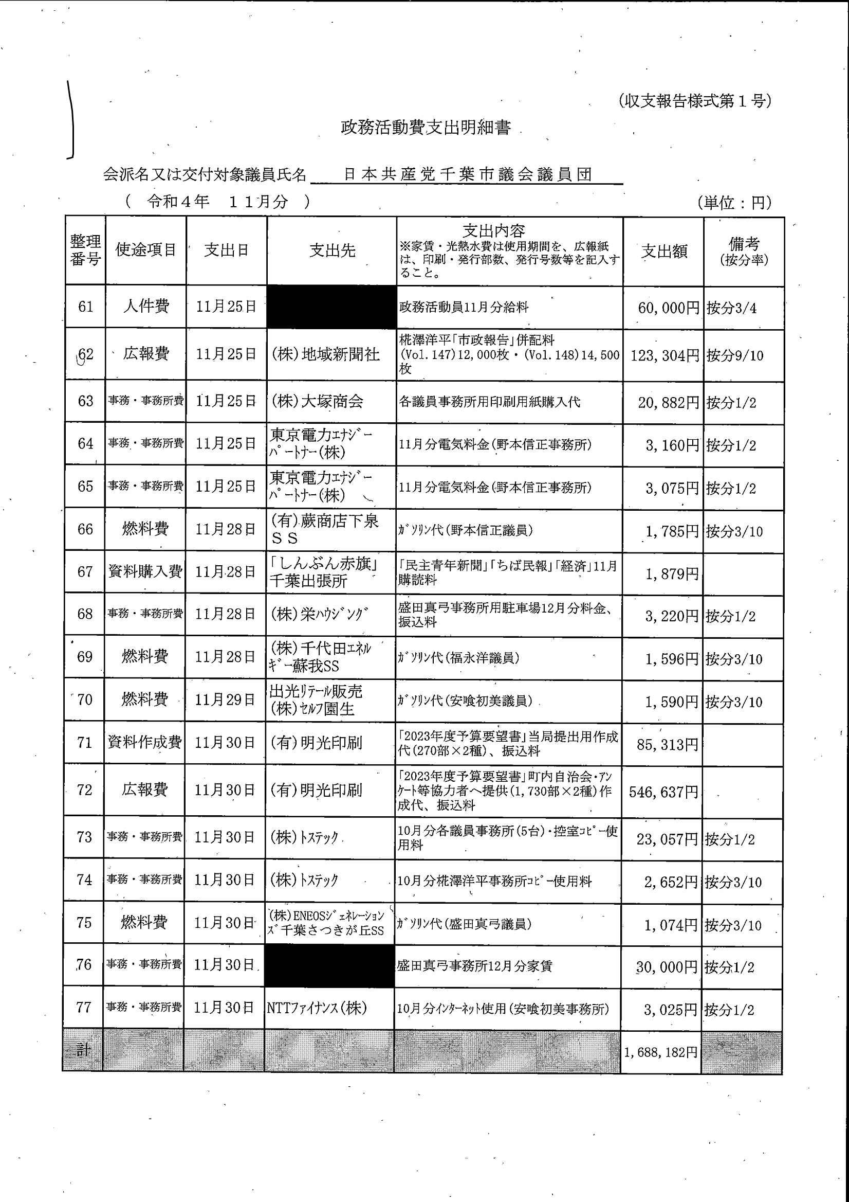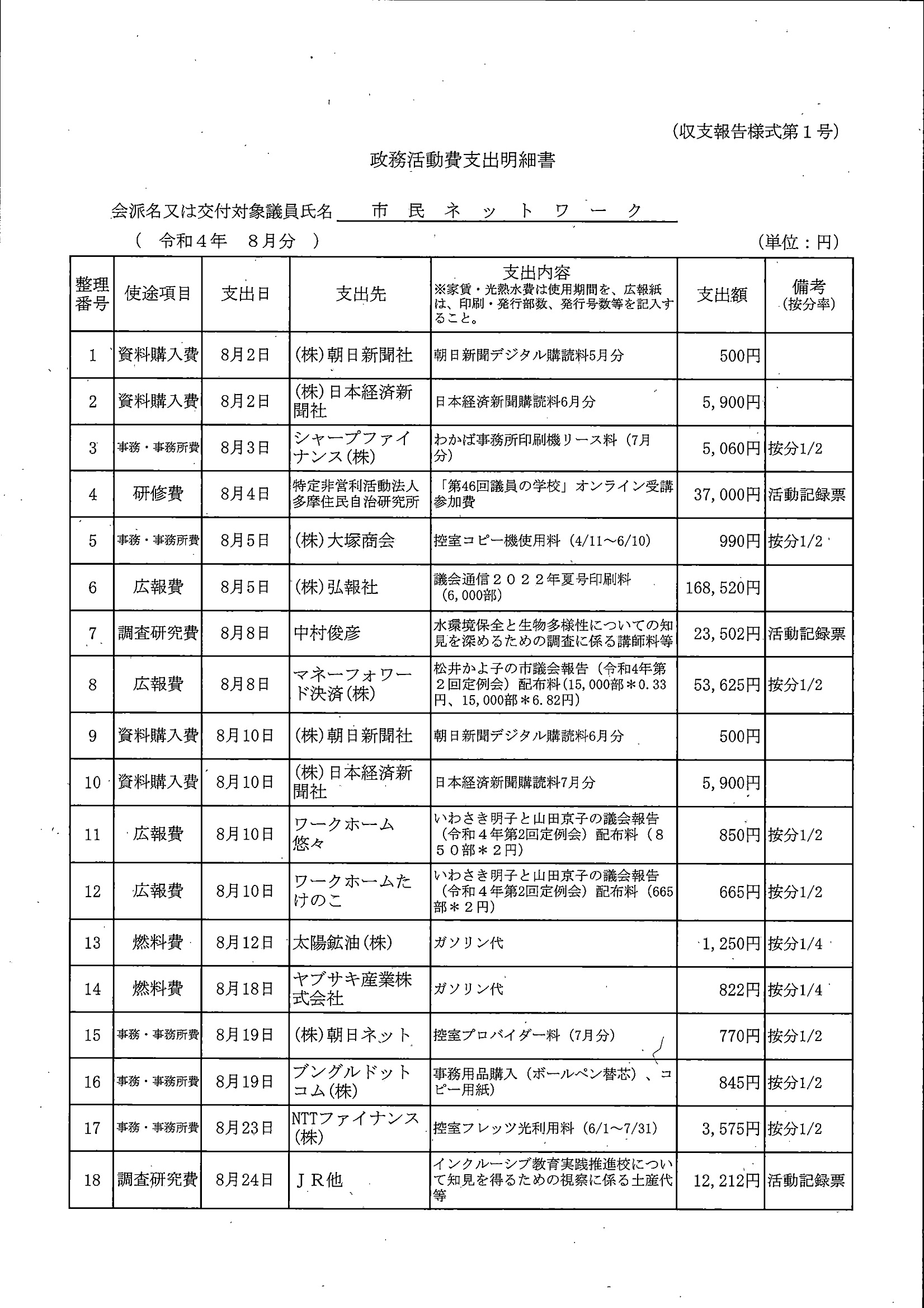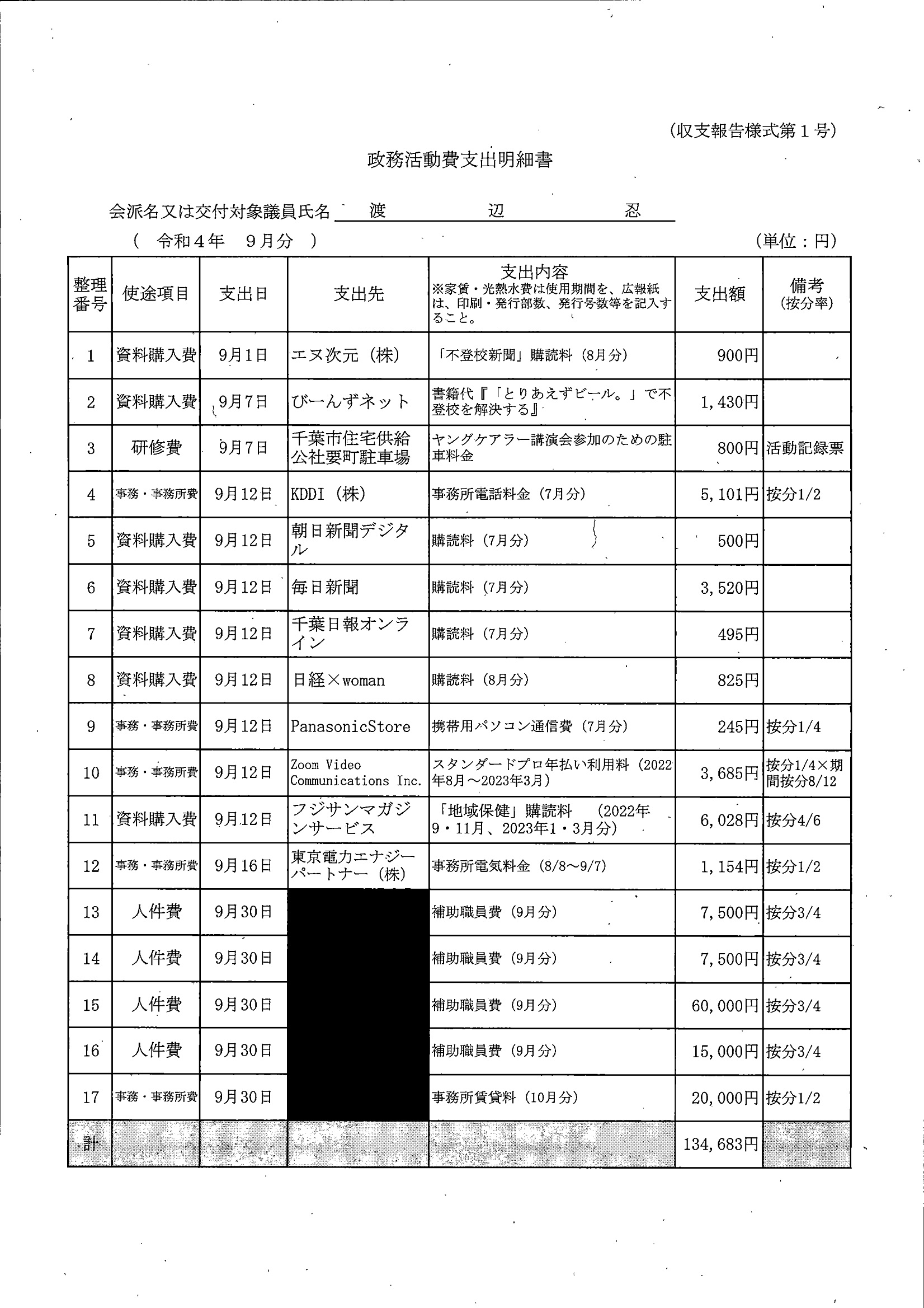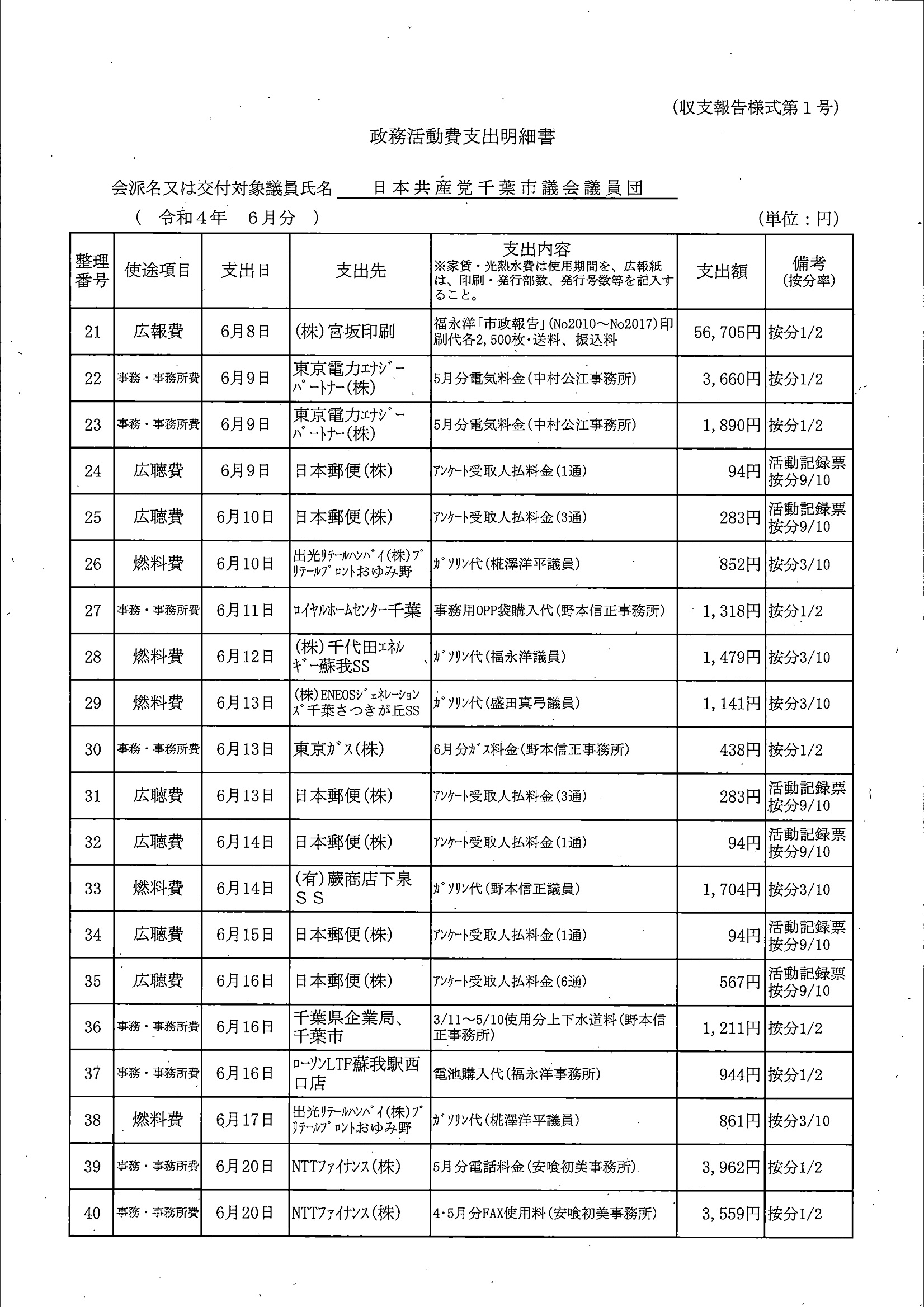 千葉市議会トップページ > 広報・情報公開 > 政務活動費 > 令和4年度交付分(政務活動費収支報告書)