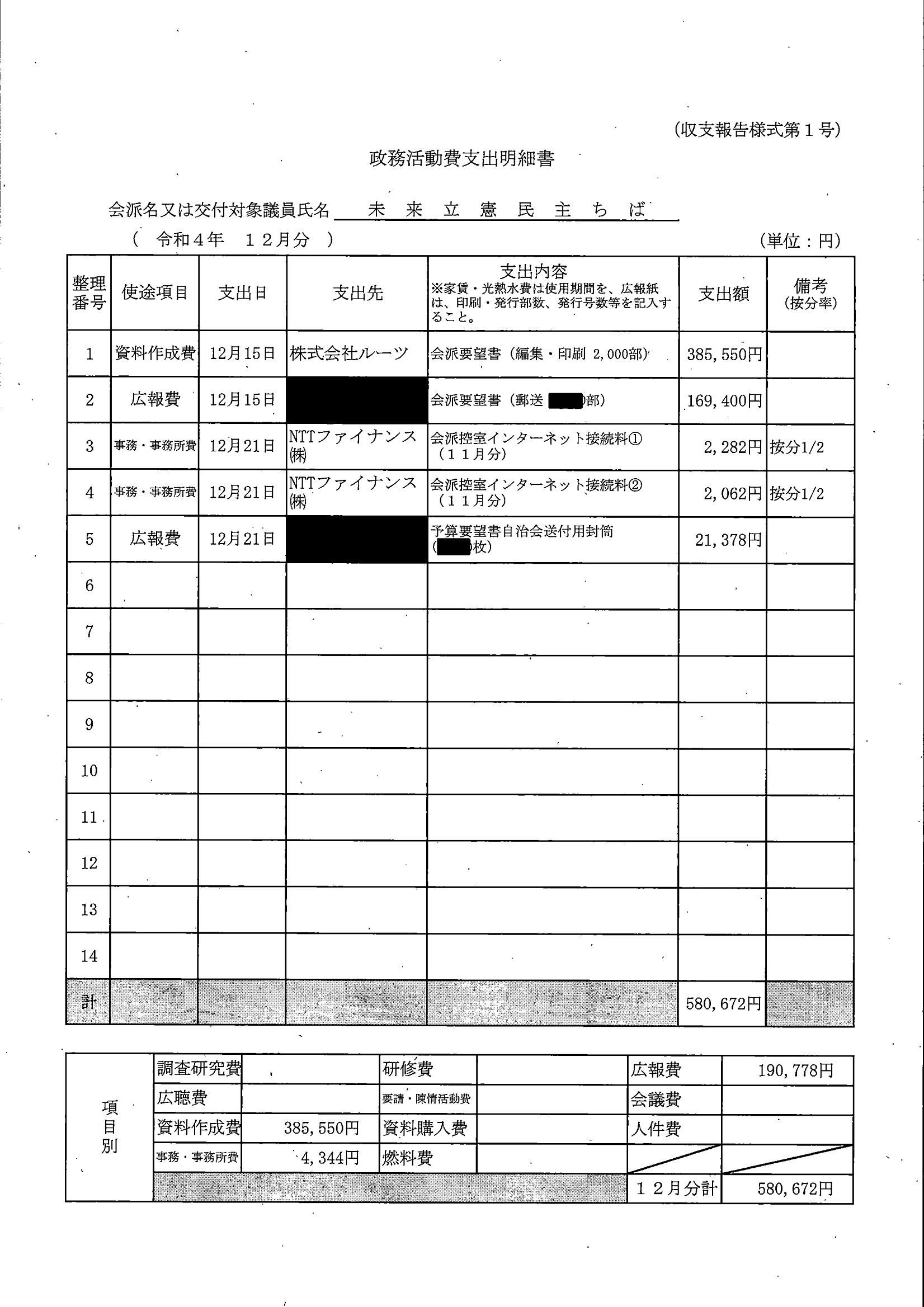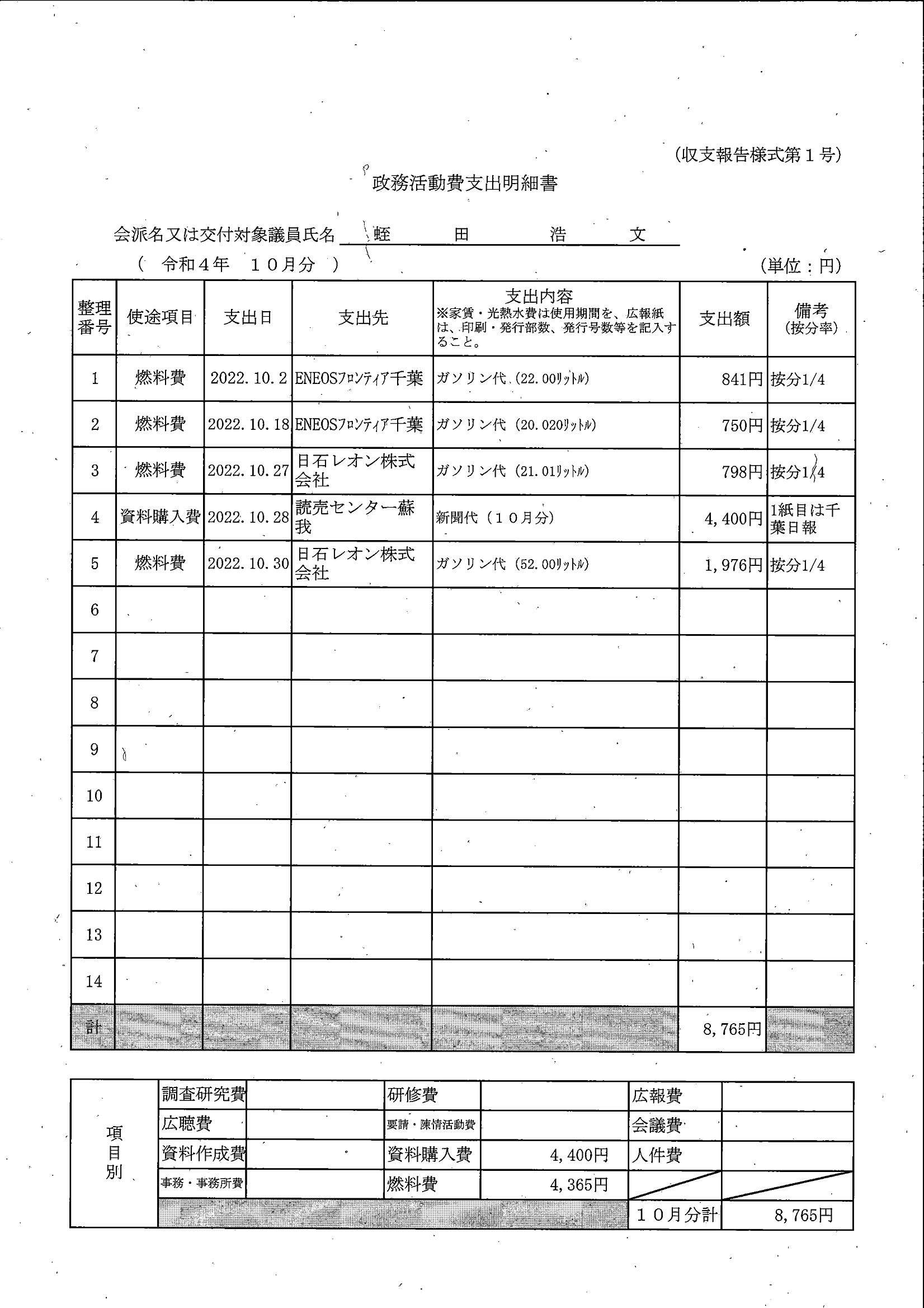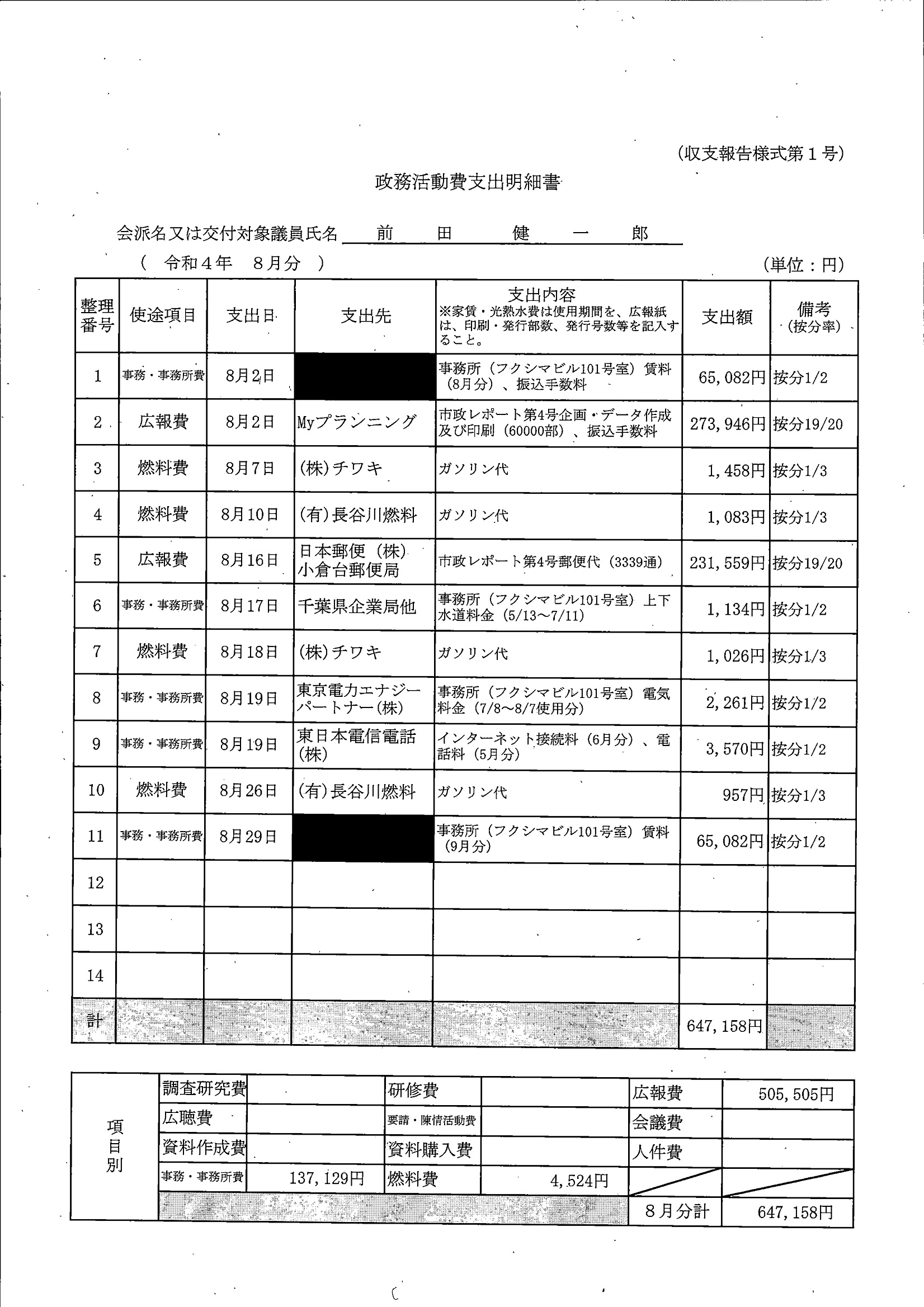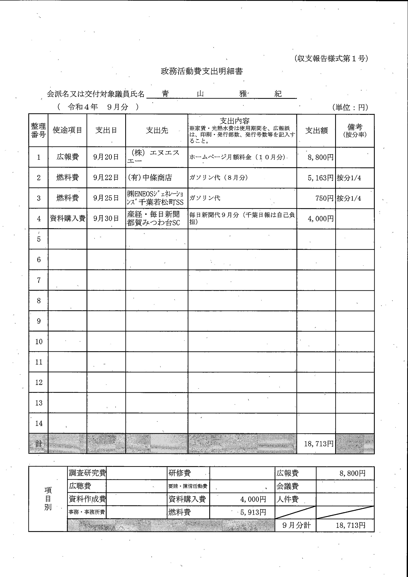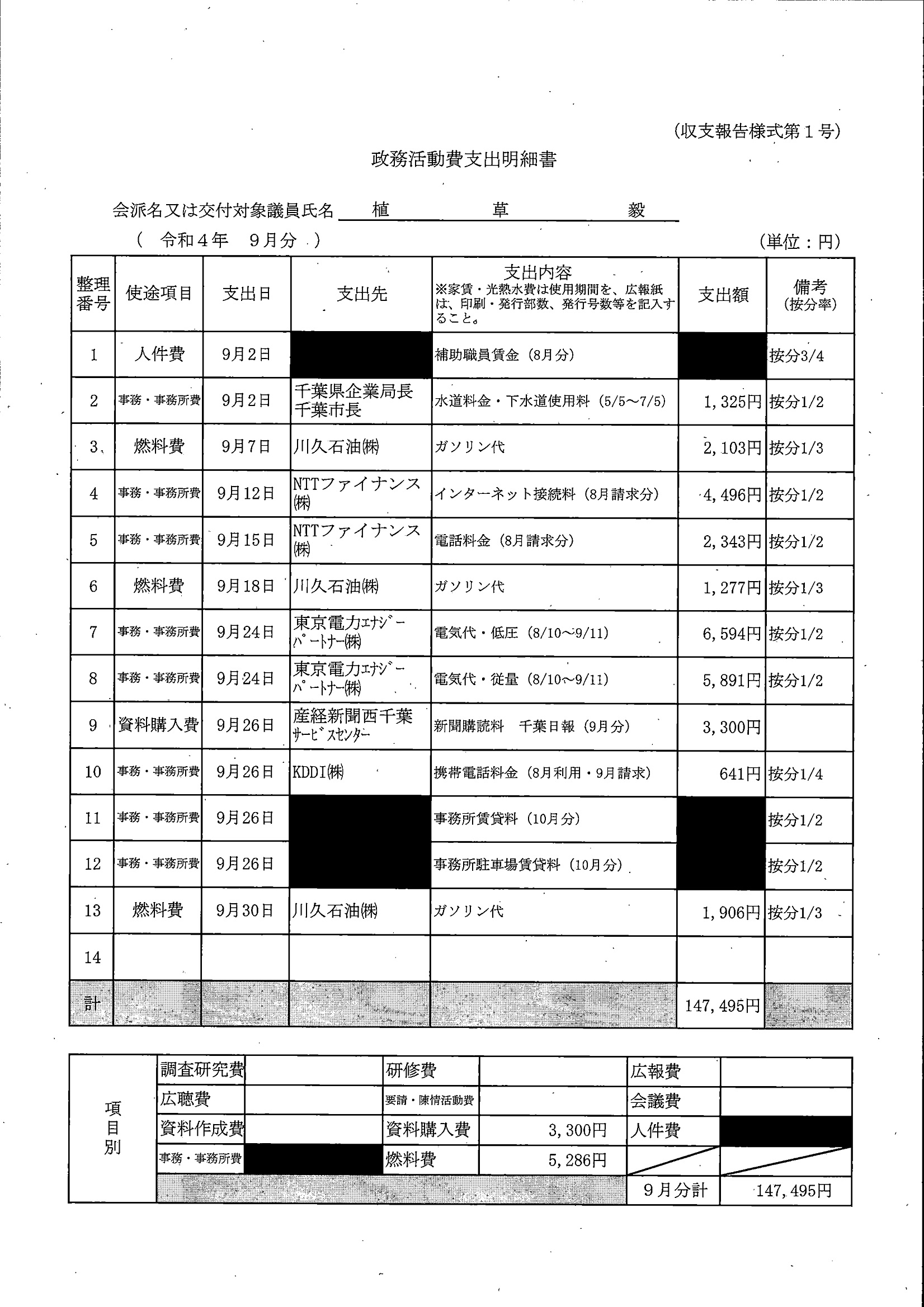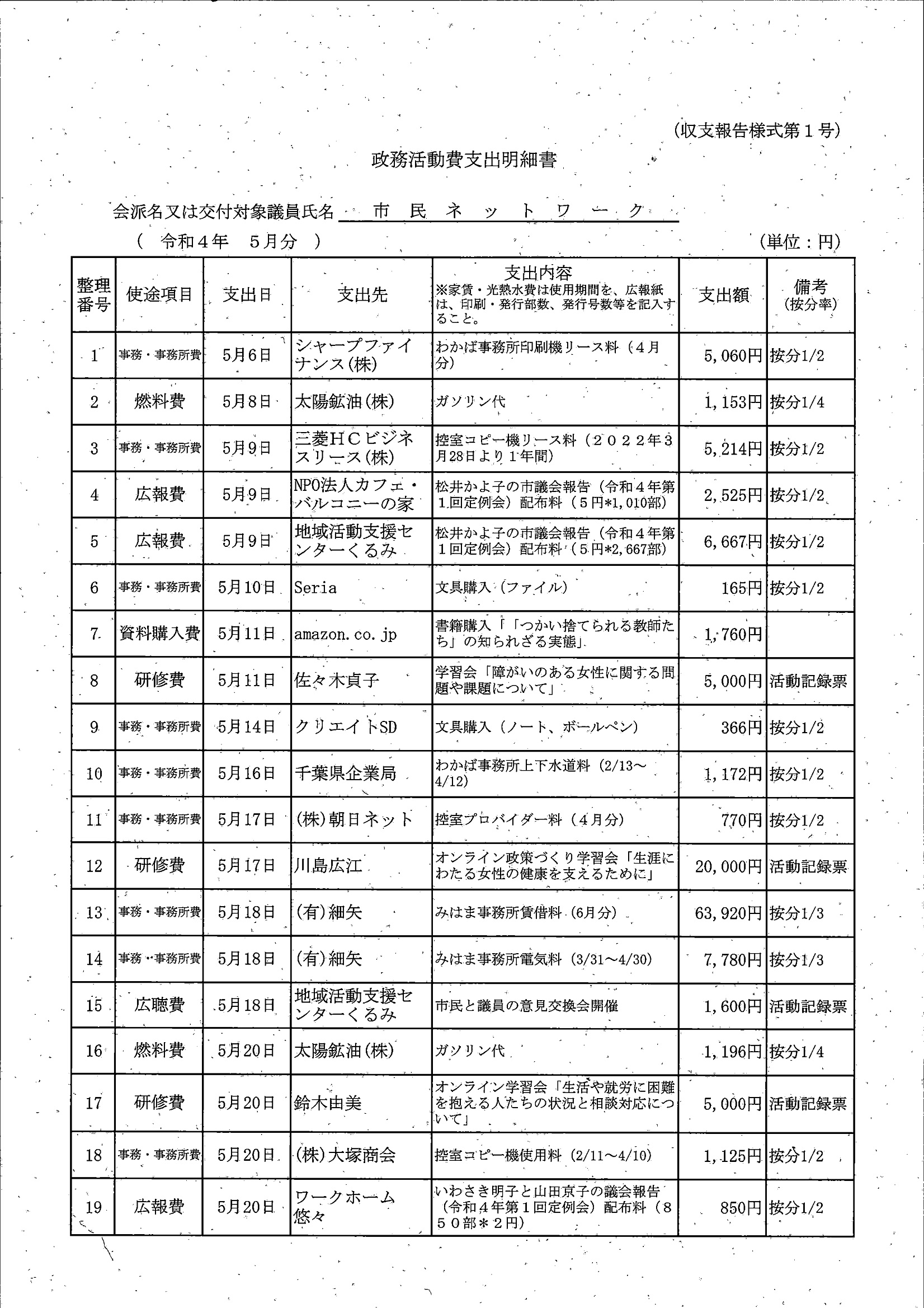 千葉市議会トップページ > 広報・情報公開 > 政務活動費 > 令和4年度交付分(政務活動費収支報告書)