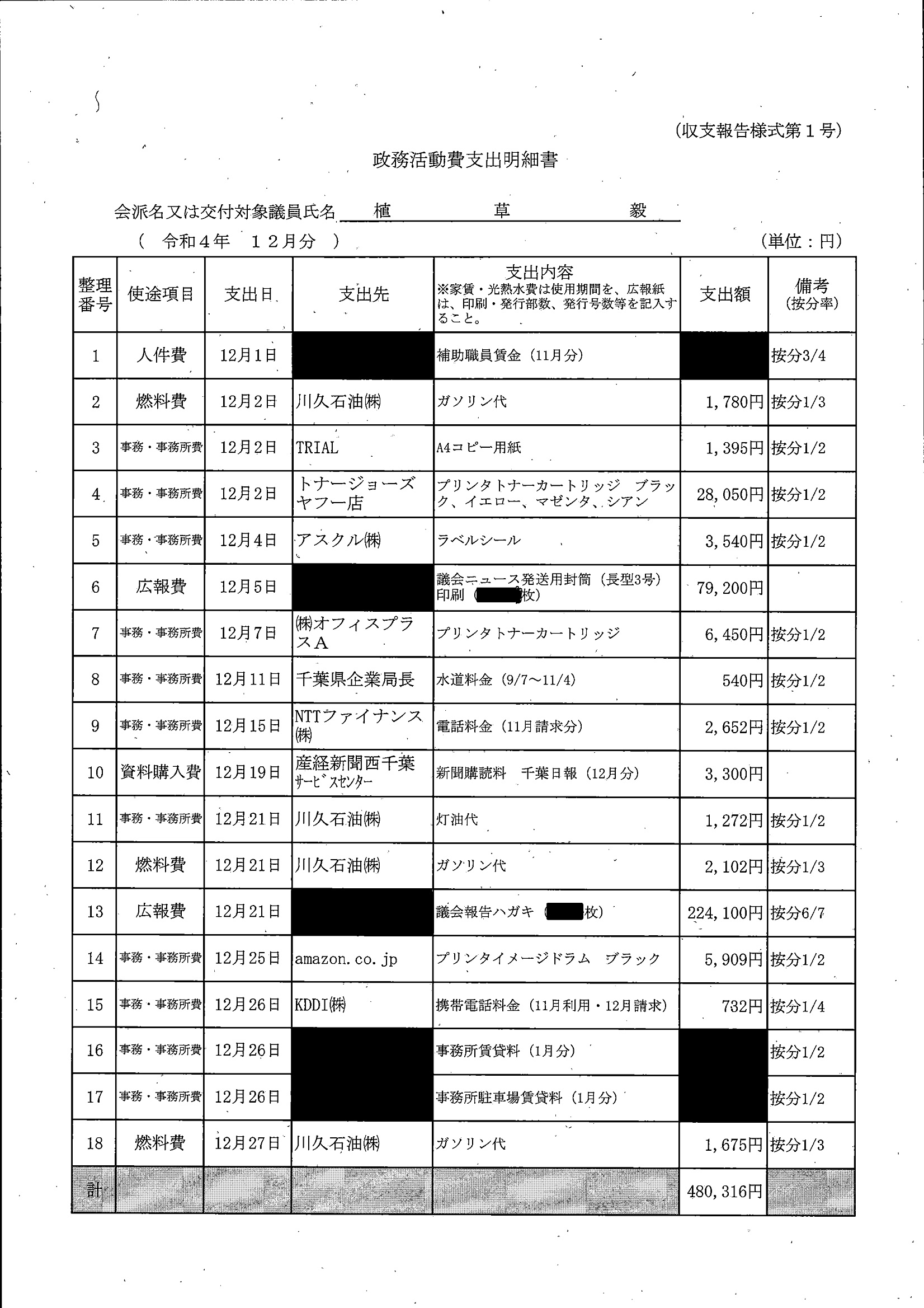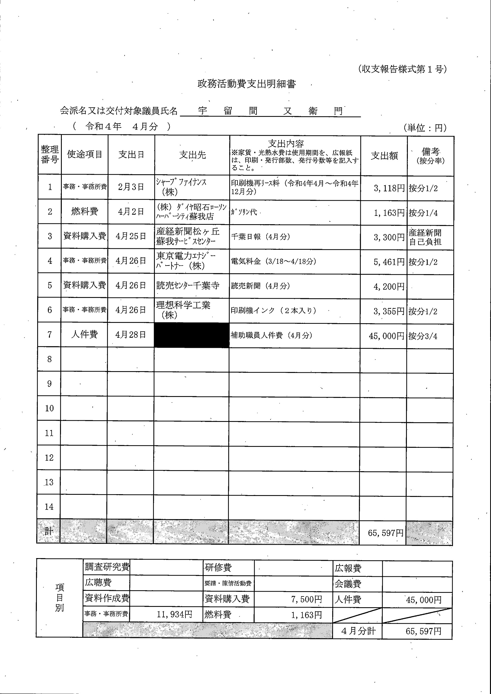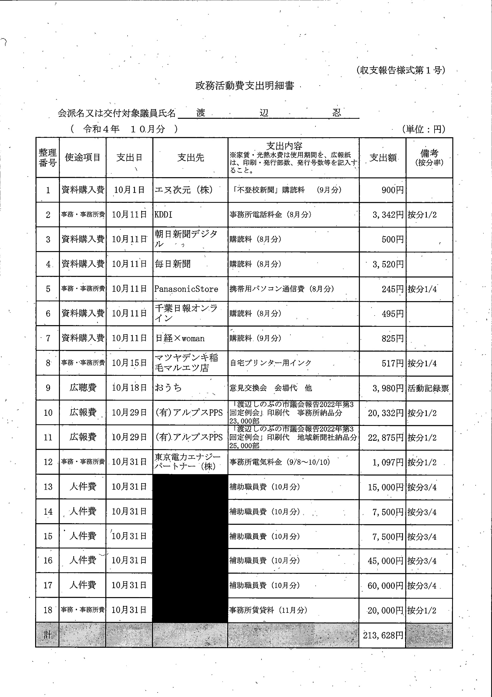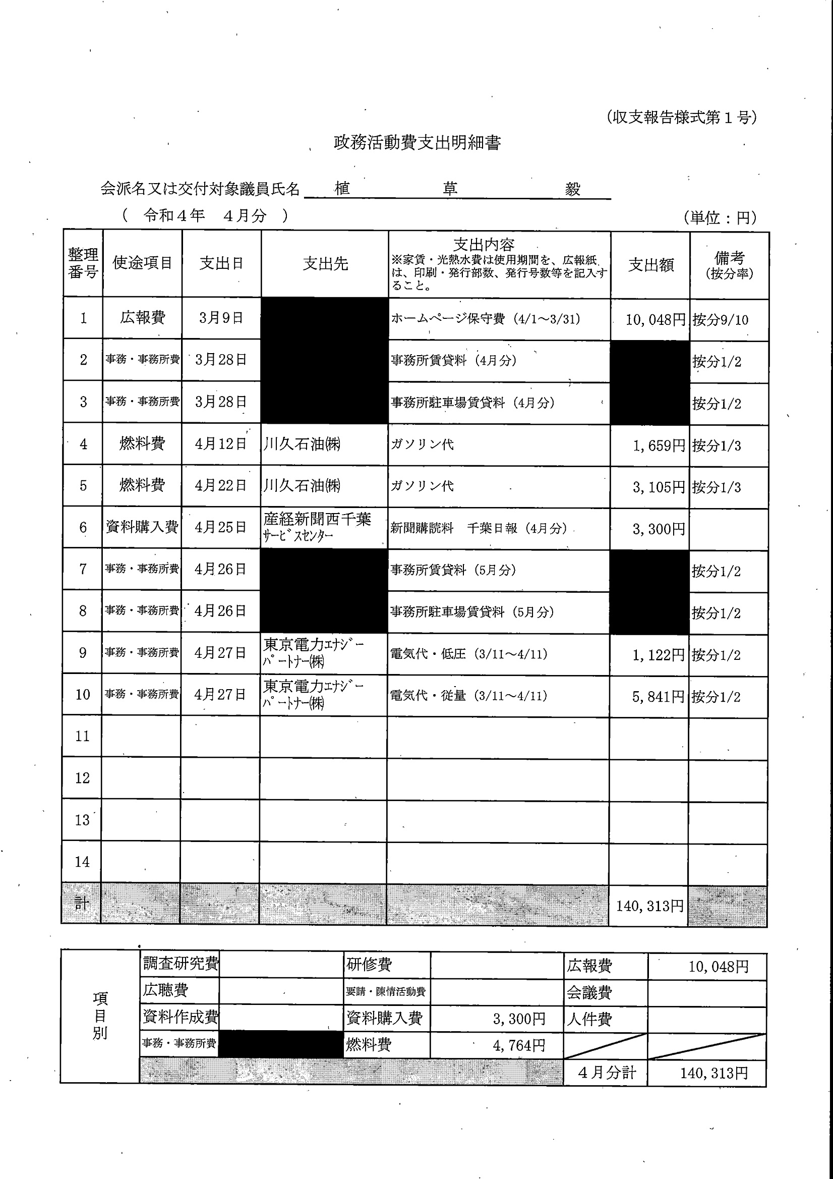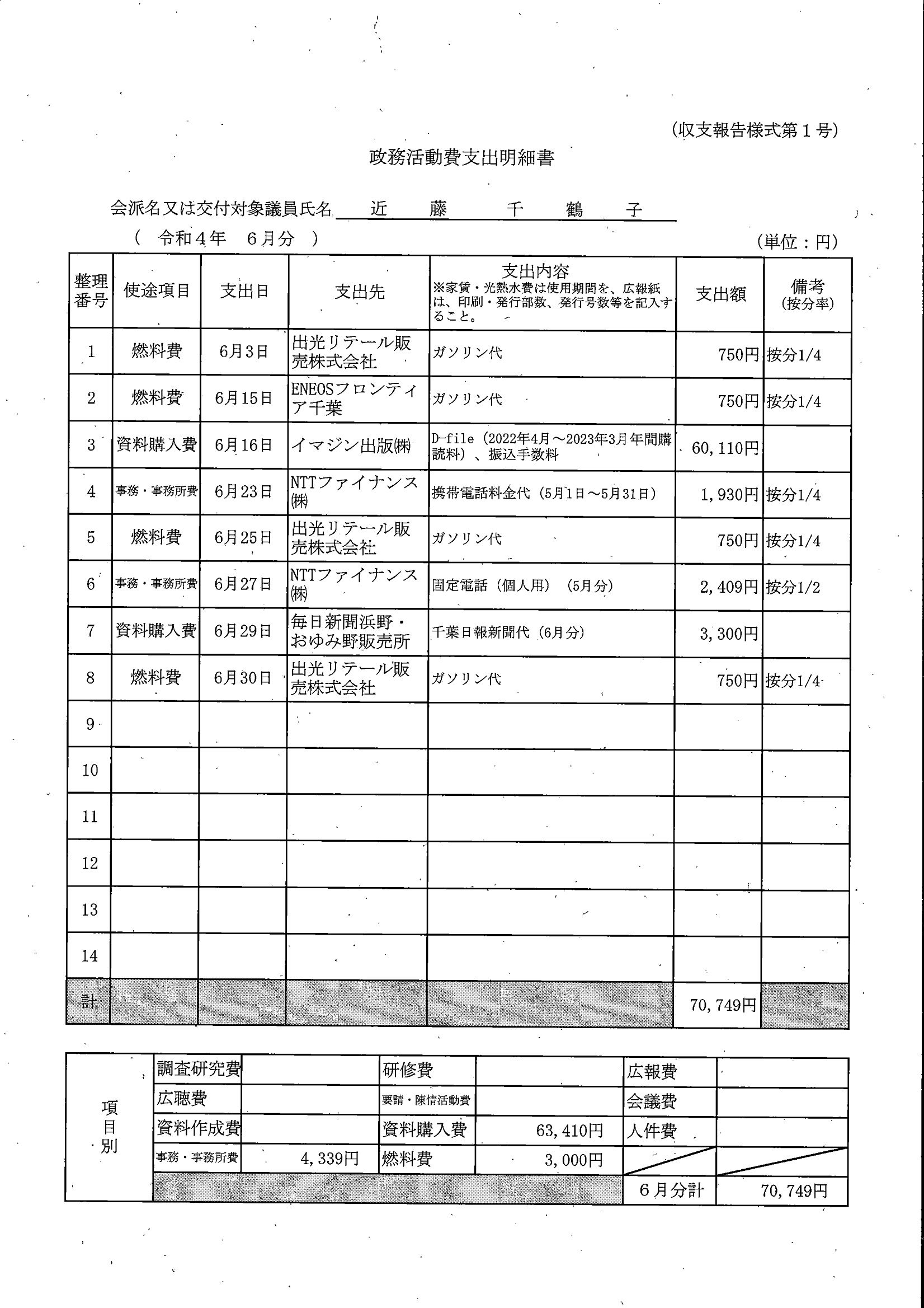 千葉市議会トップページ > 広報・情報公開 > 政務活動費 > 令和4年度交付分(政務活動費収支報告書)