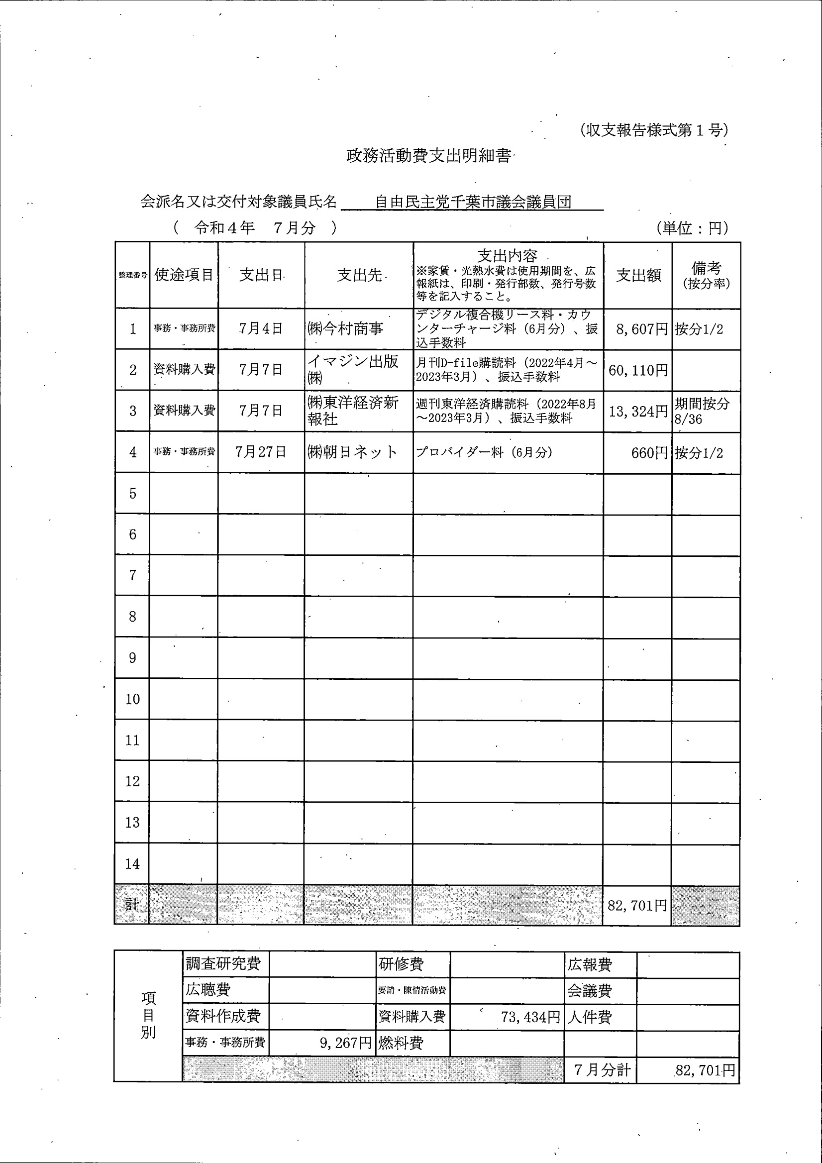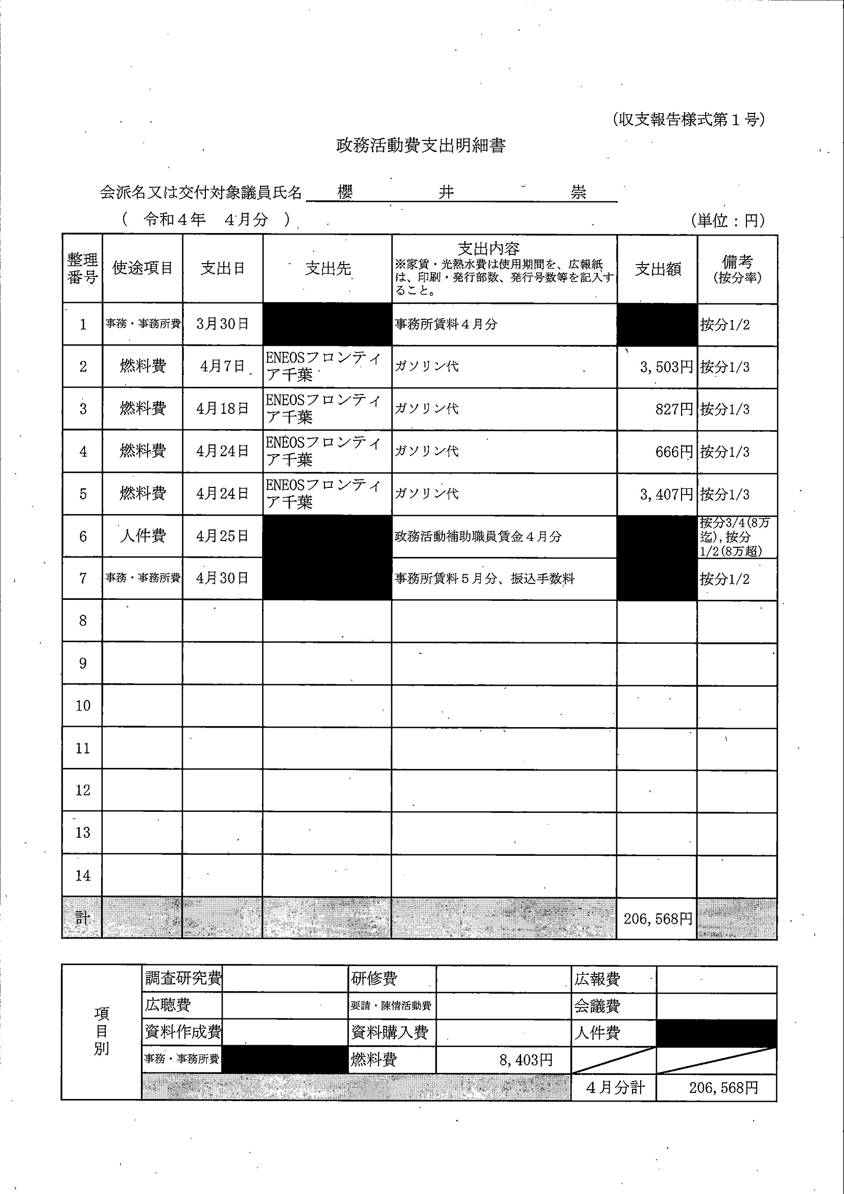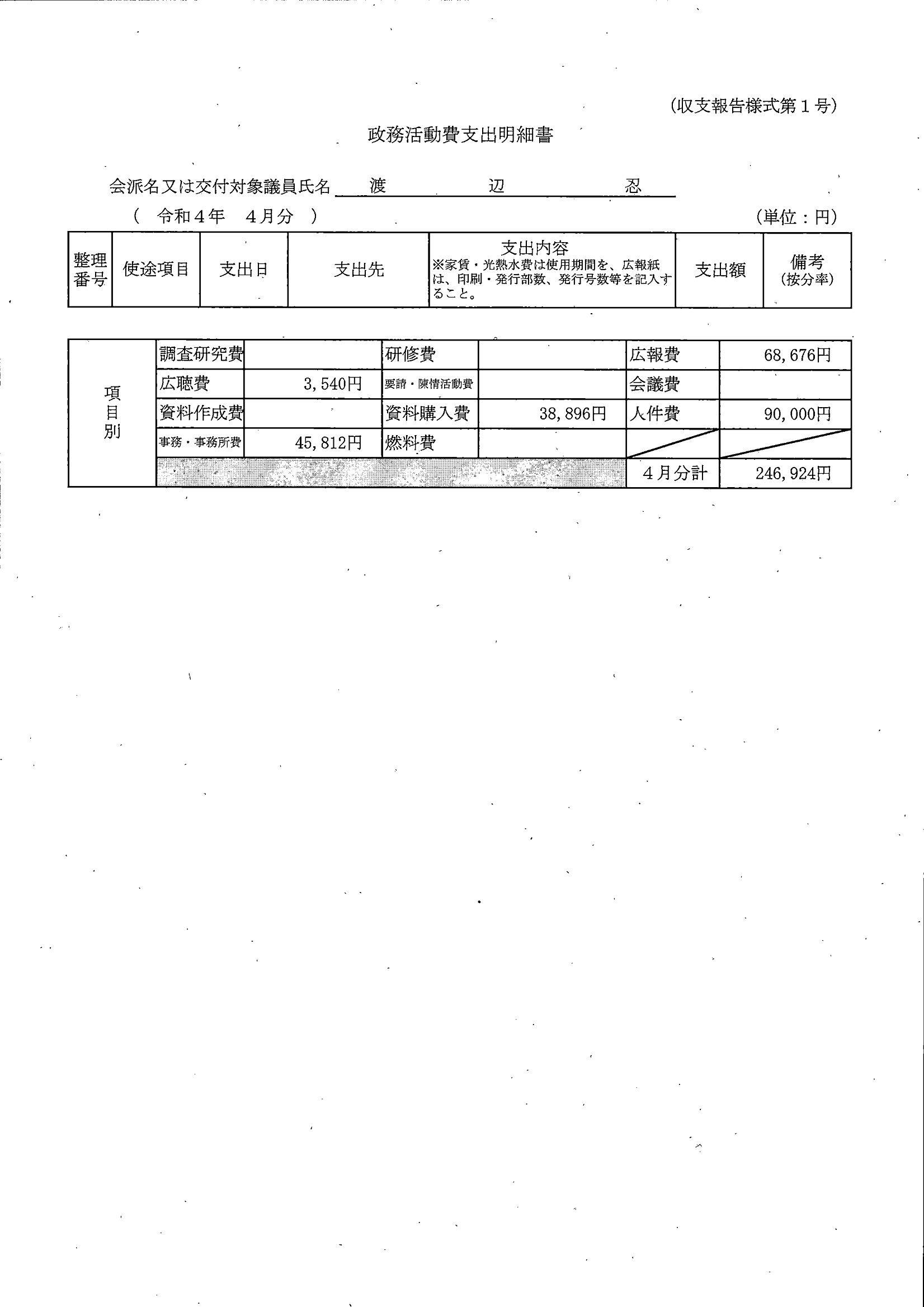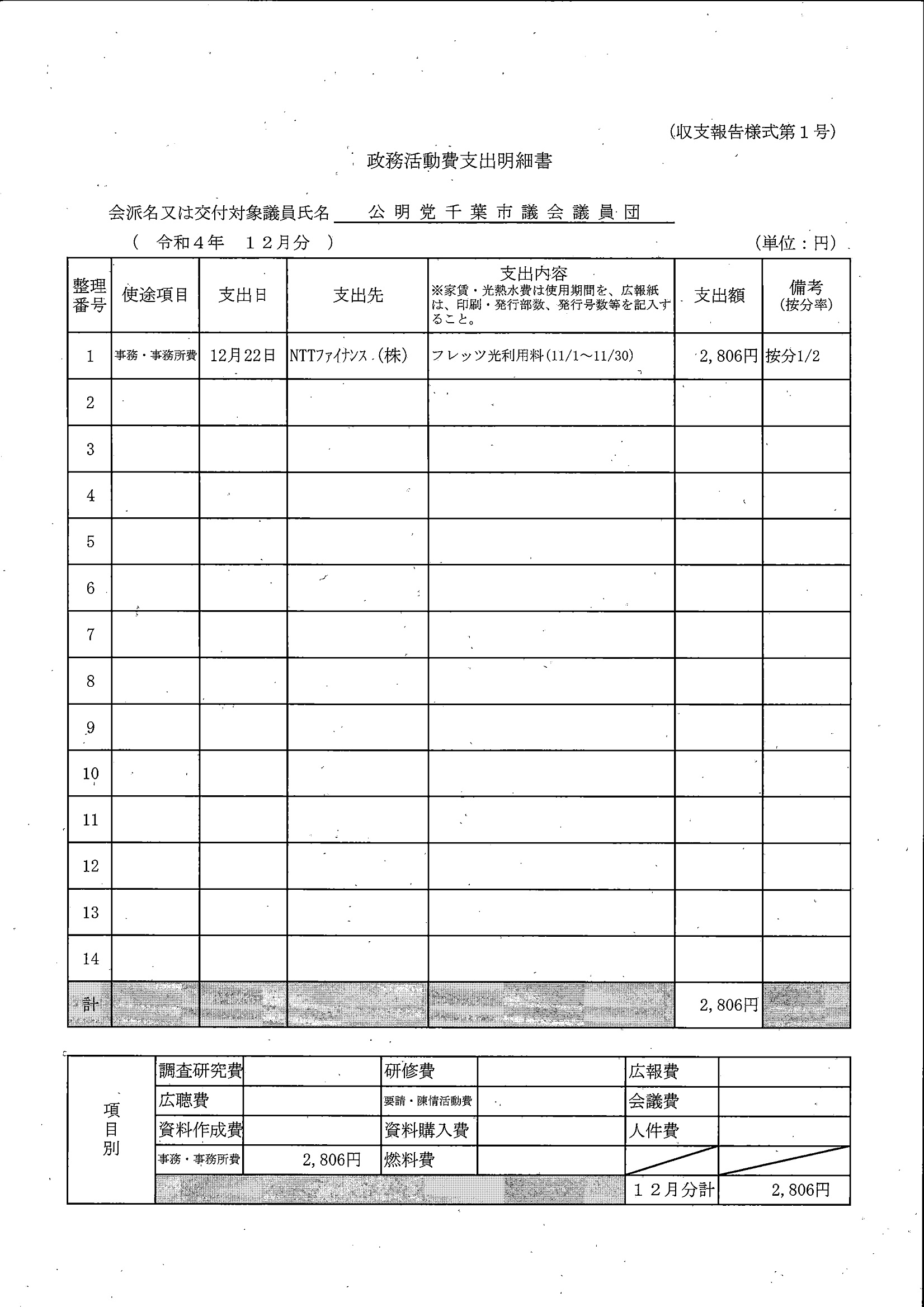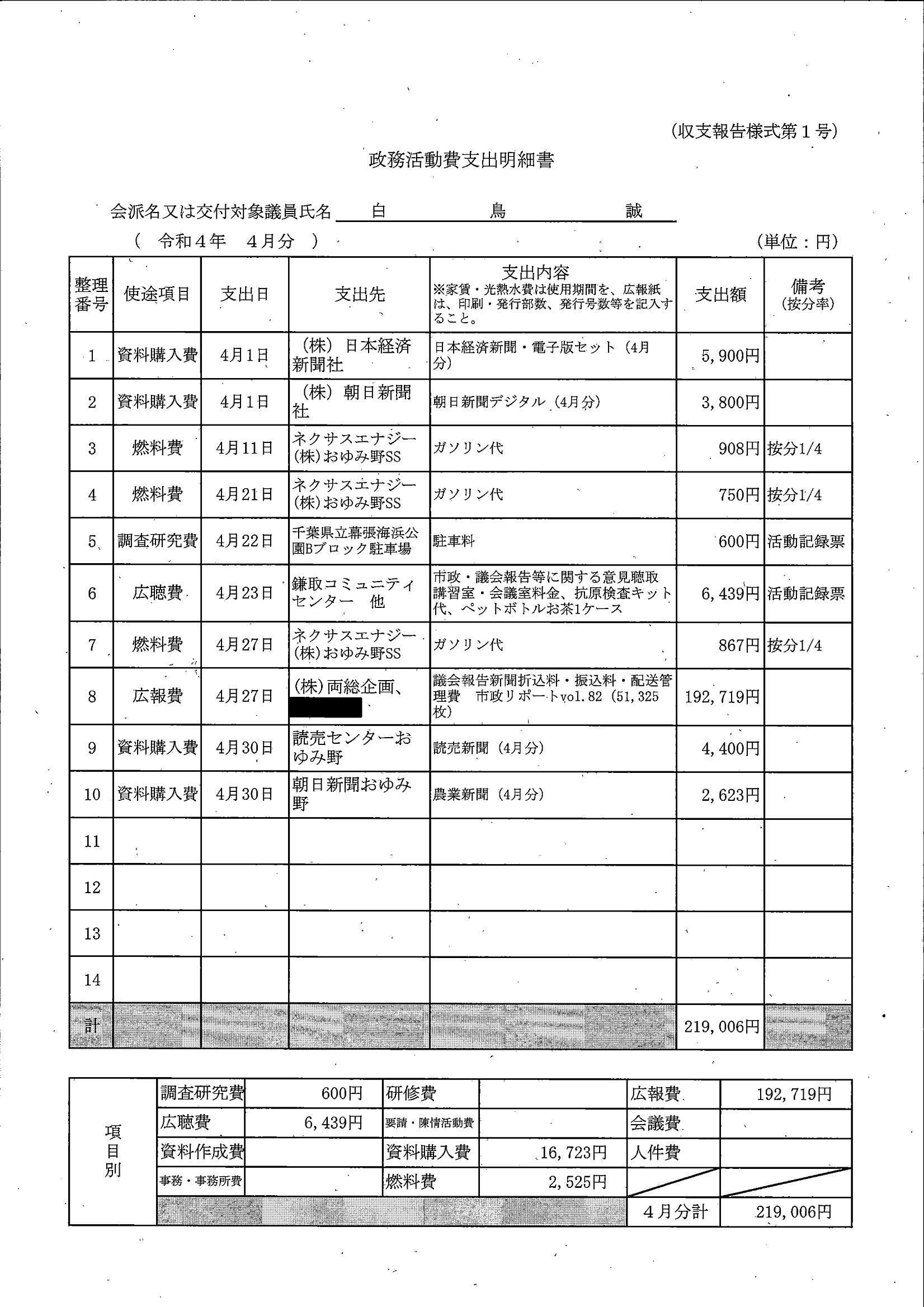 千葉市議会トップページ > 広報・情報公開 > 政務活動費 > 令和4年度交付分(政務活動費収支報告書)