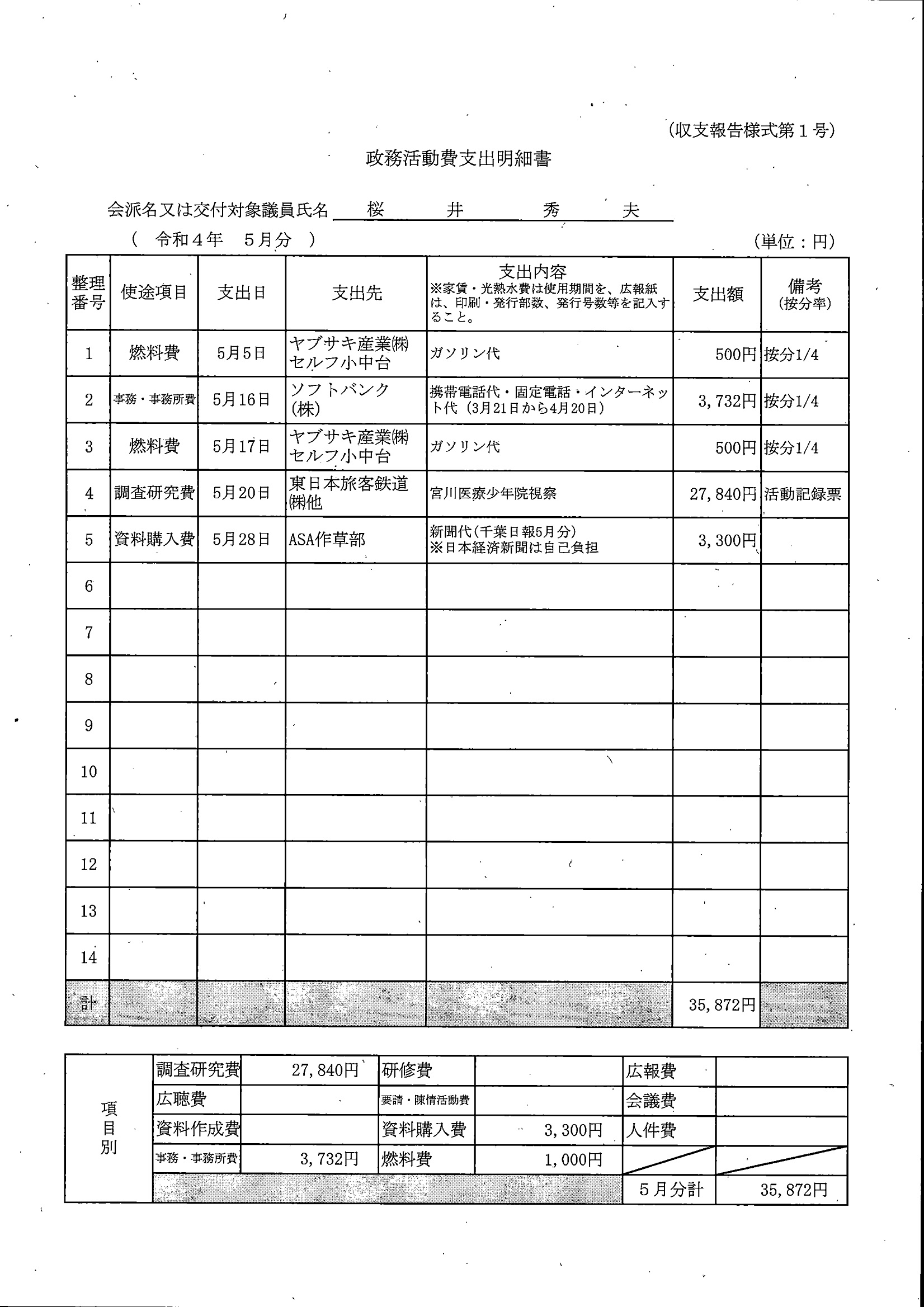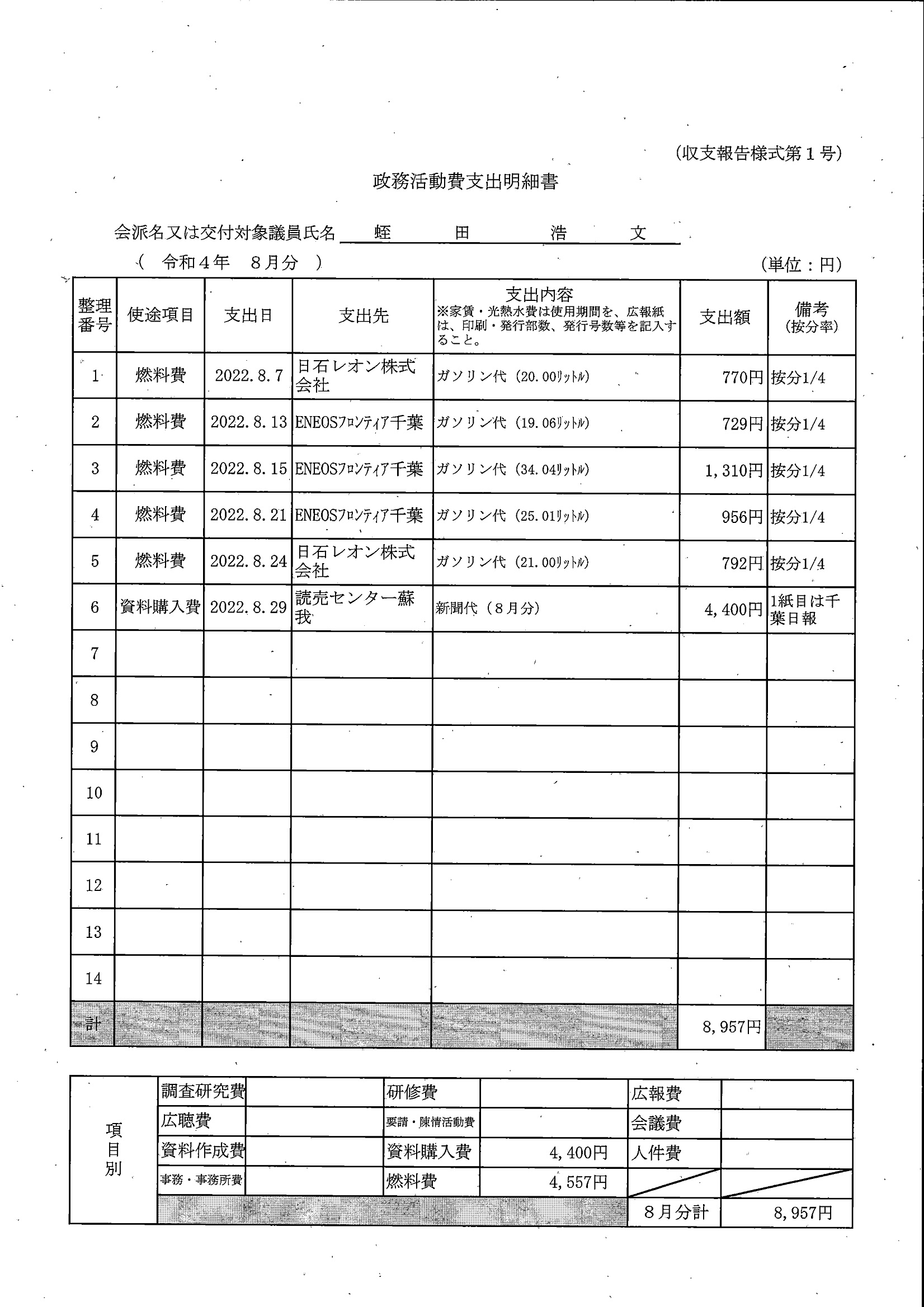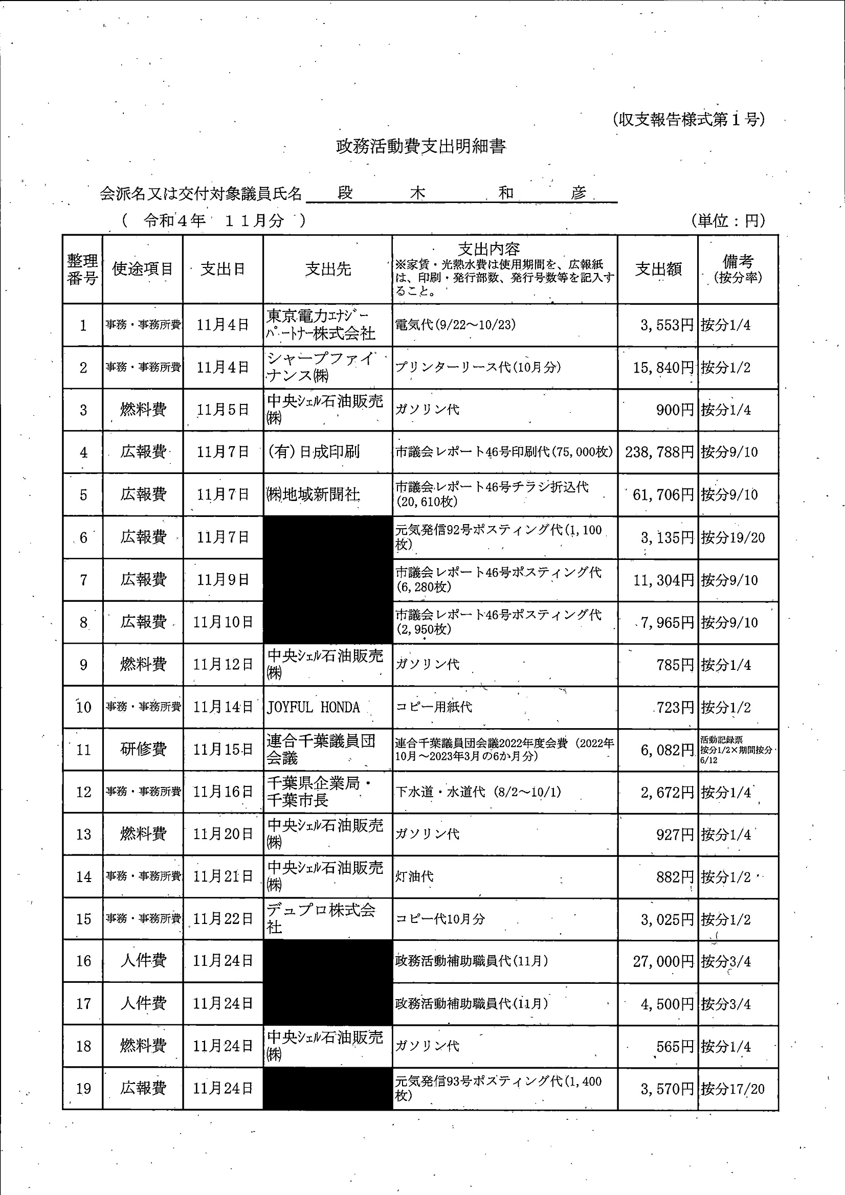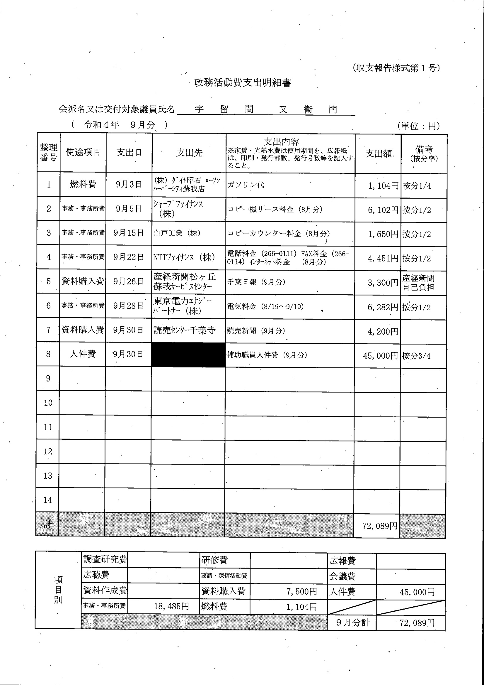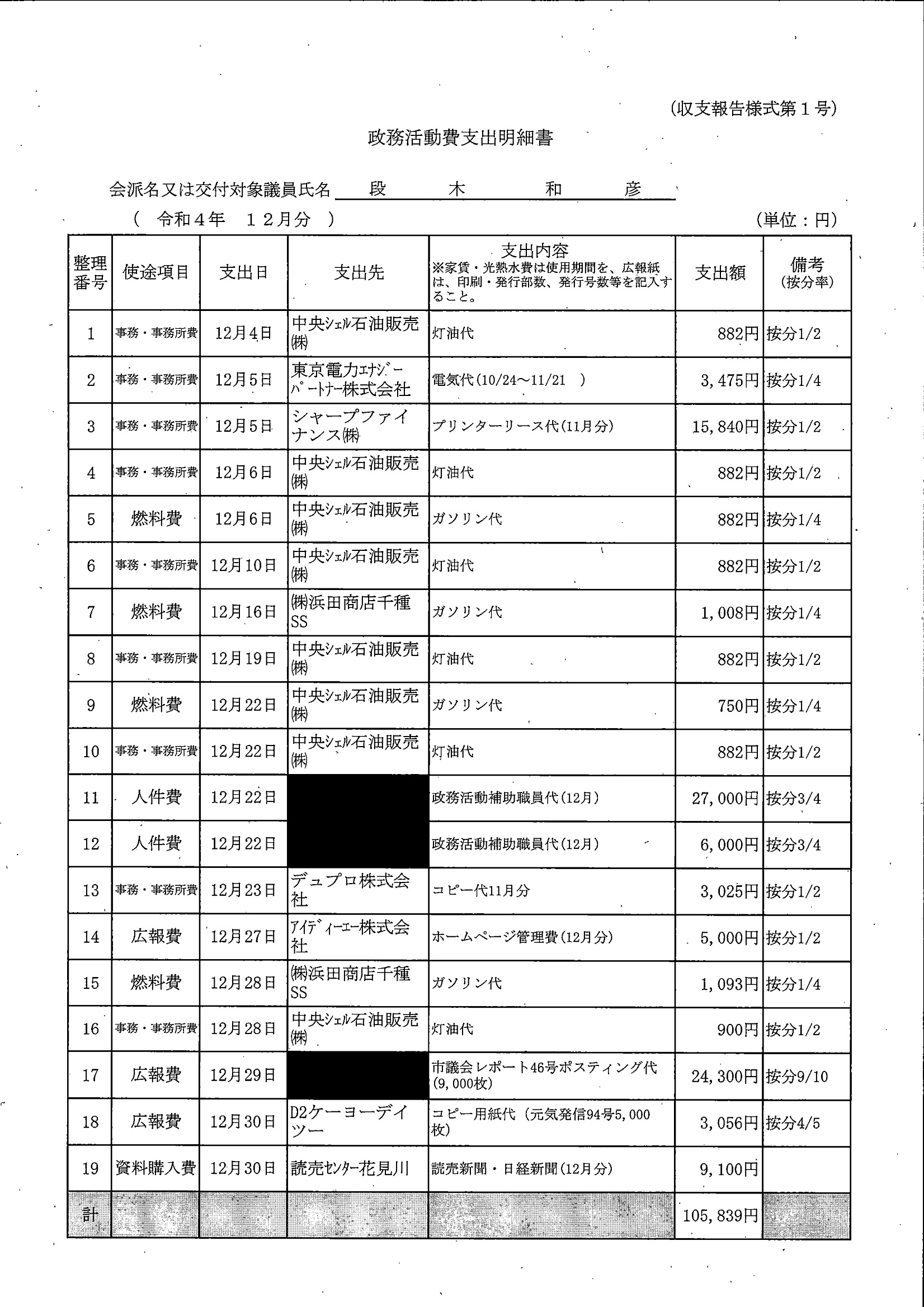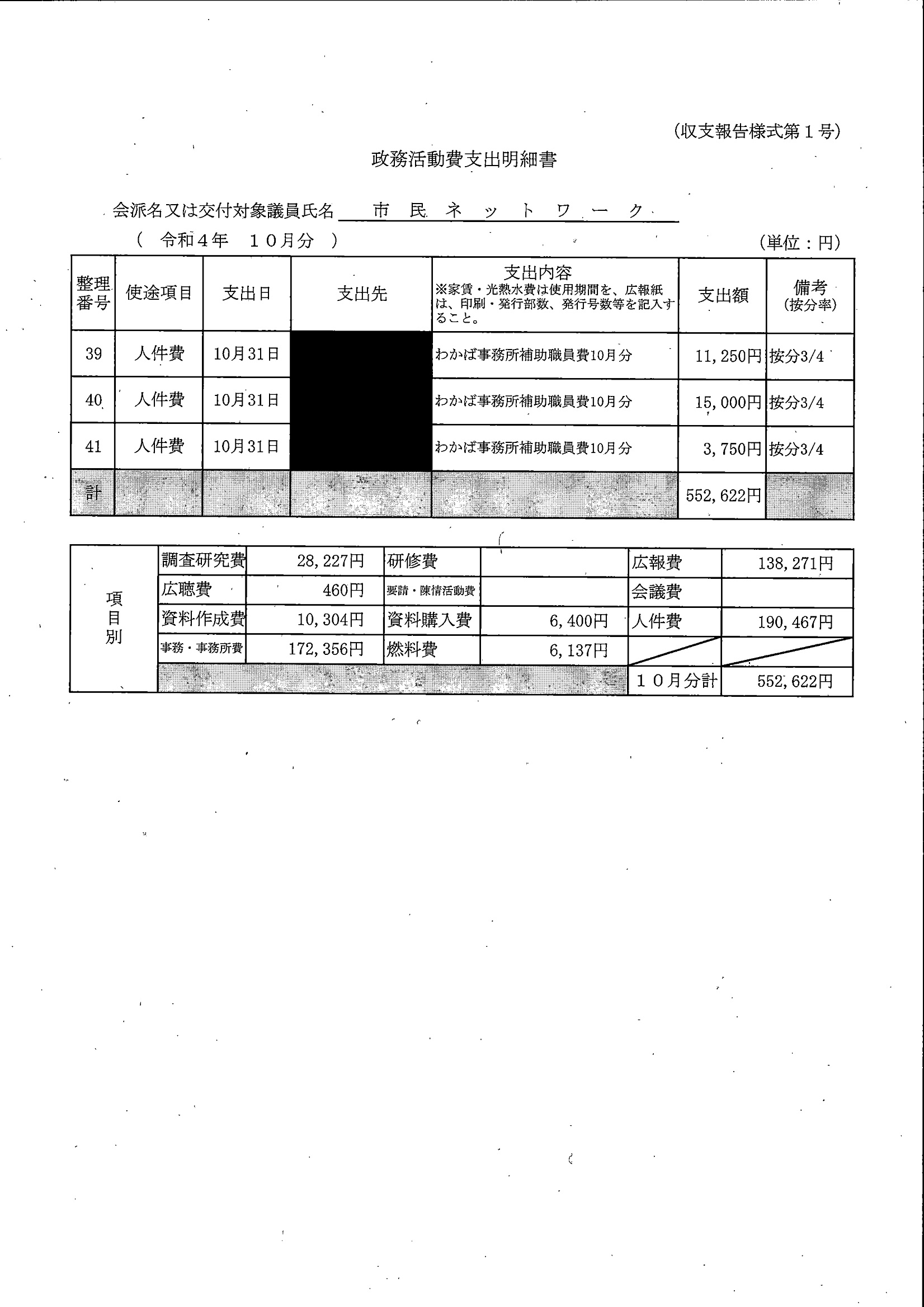 千葉市議会トップページ > 広報・情報公開 > 政務活動費 > 令和4年度交付分(政務活動費収支報告書)