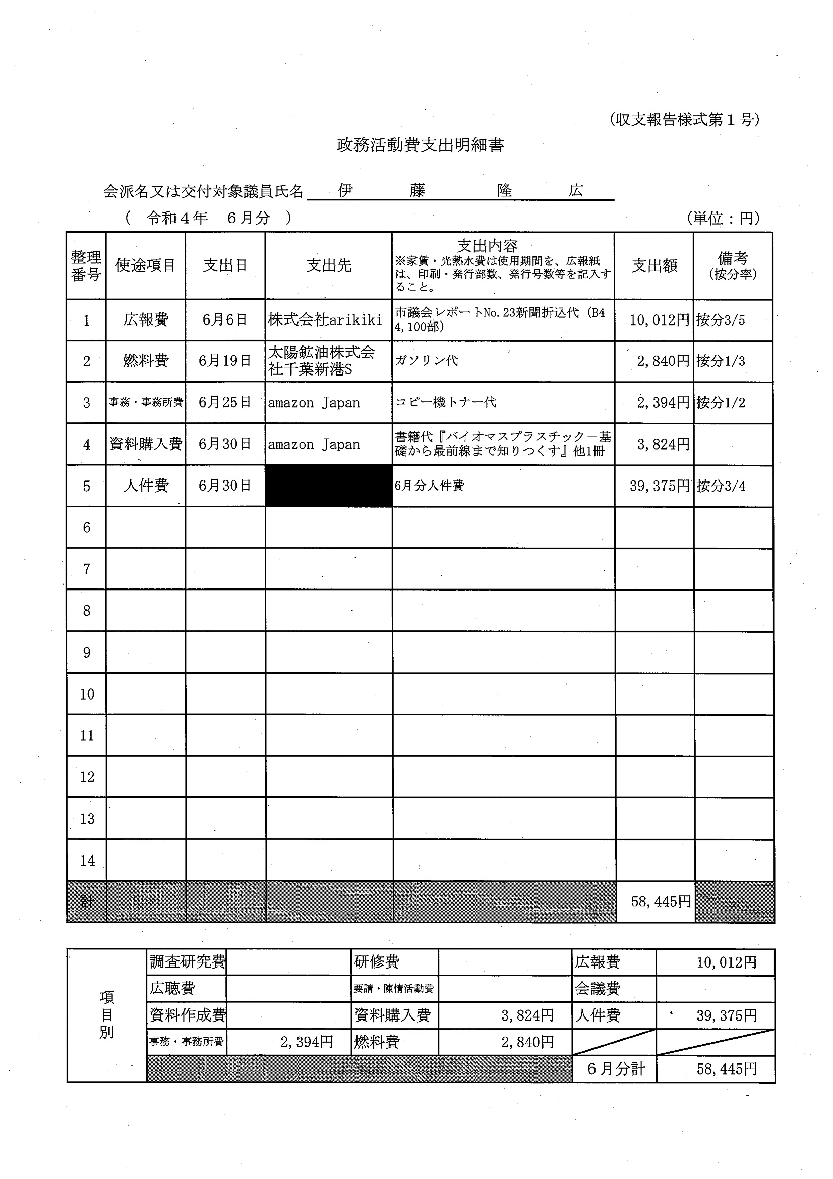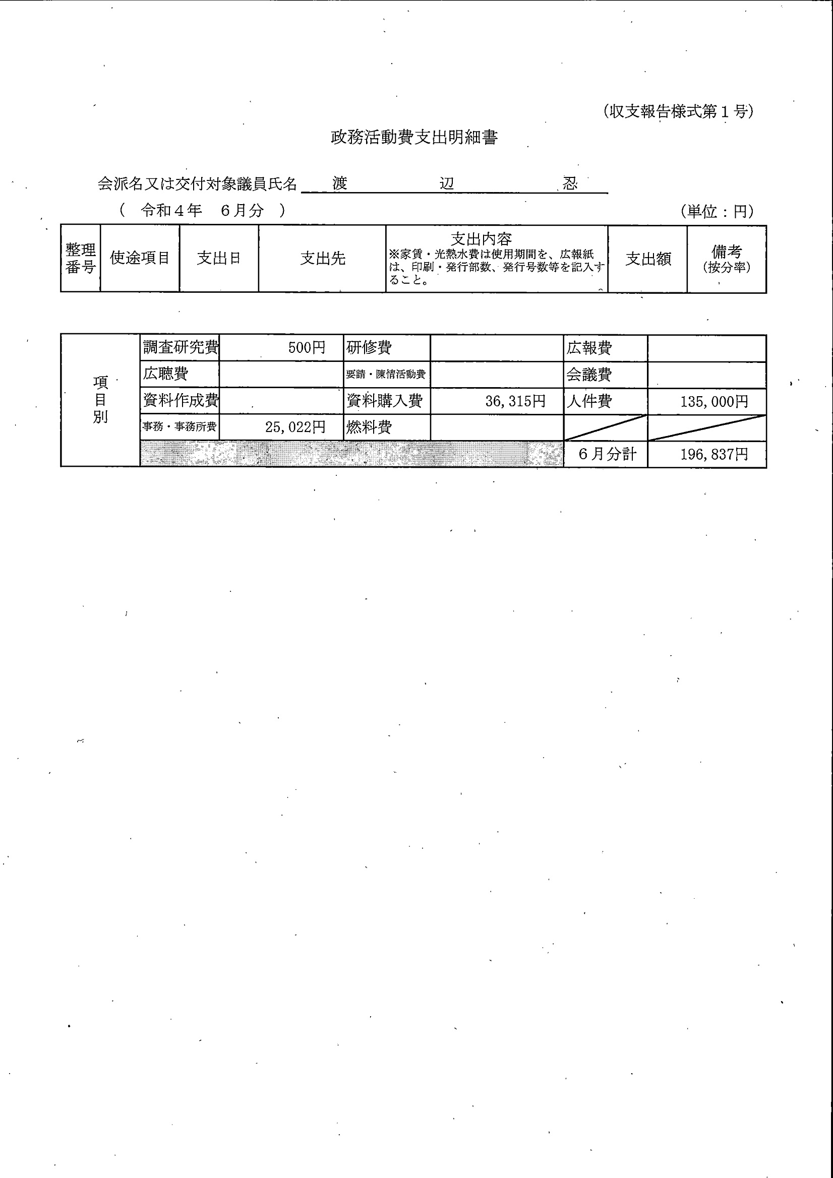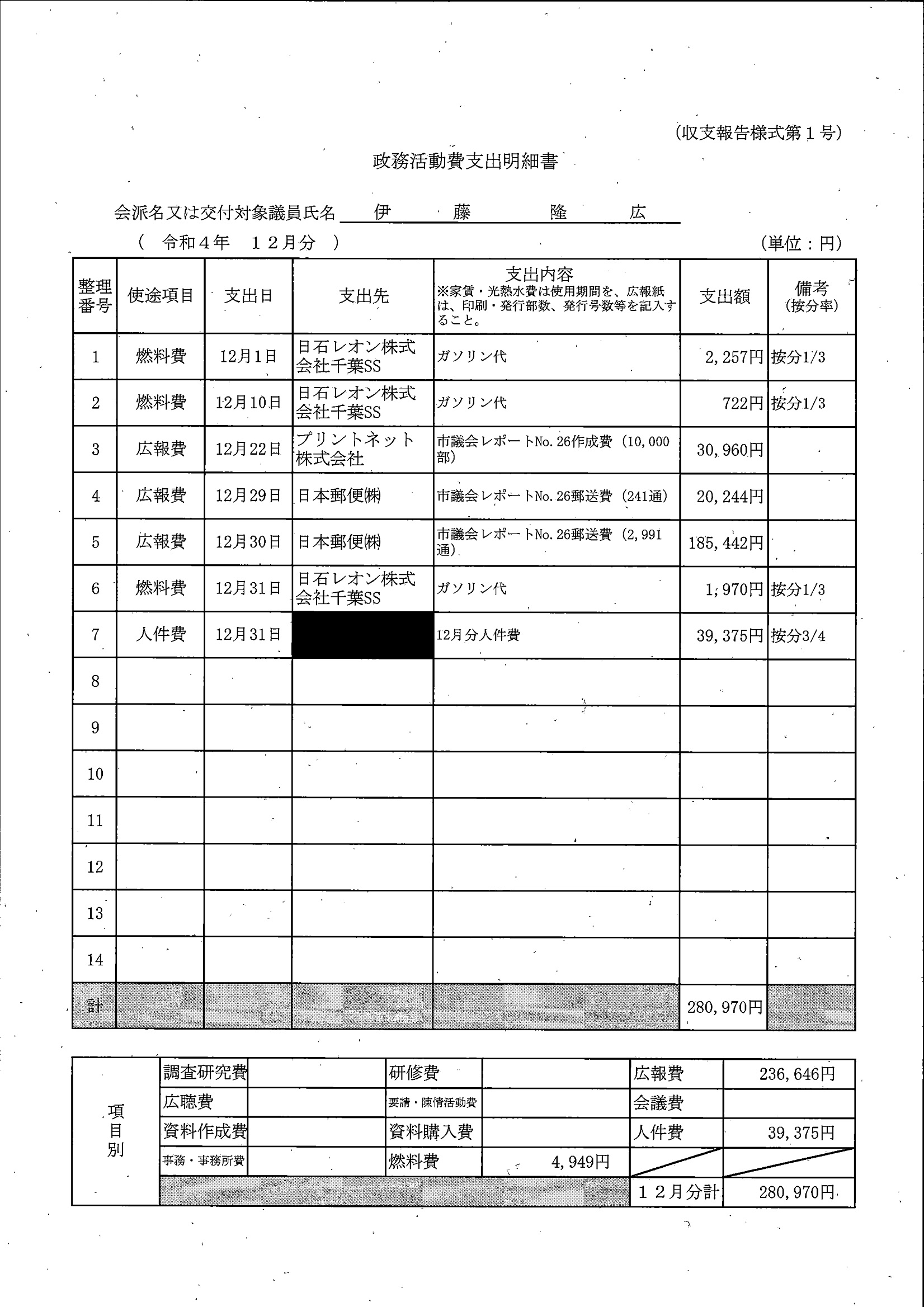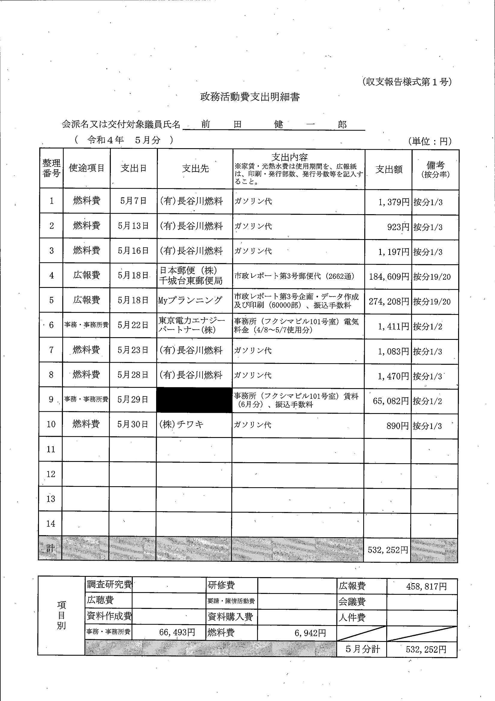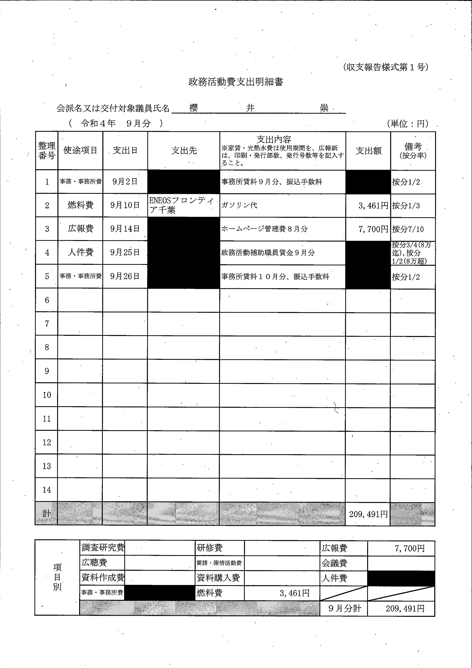千葉市議会トップページ > 広報・情報公開 > 政務活動費 > 令和4年度交付分(政務活動費収支報告書)