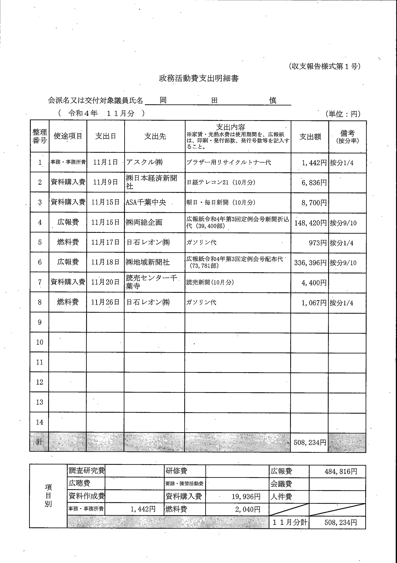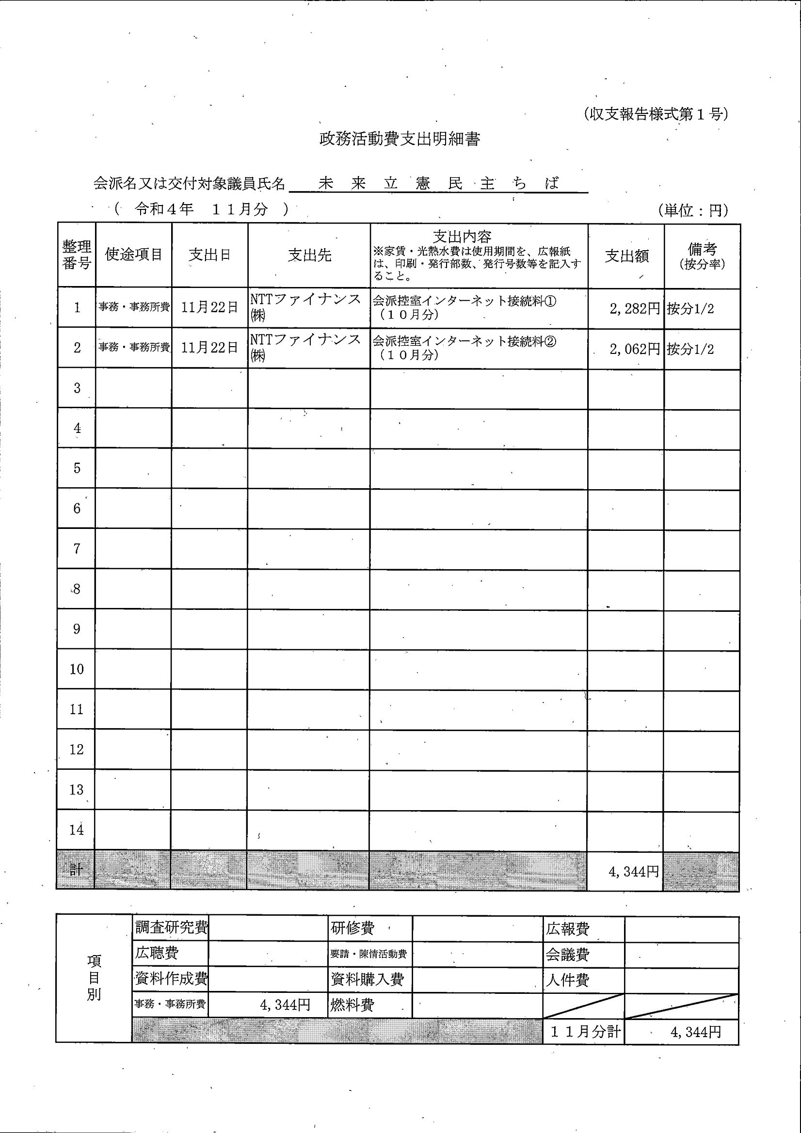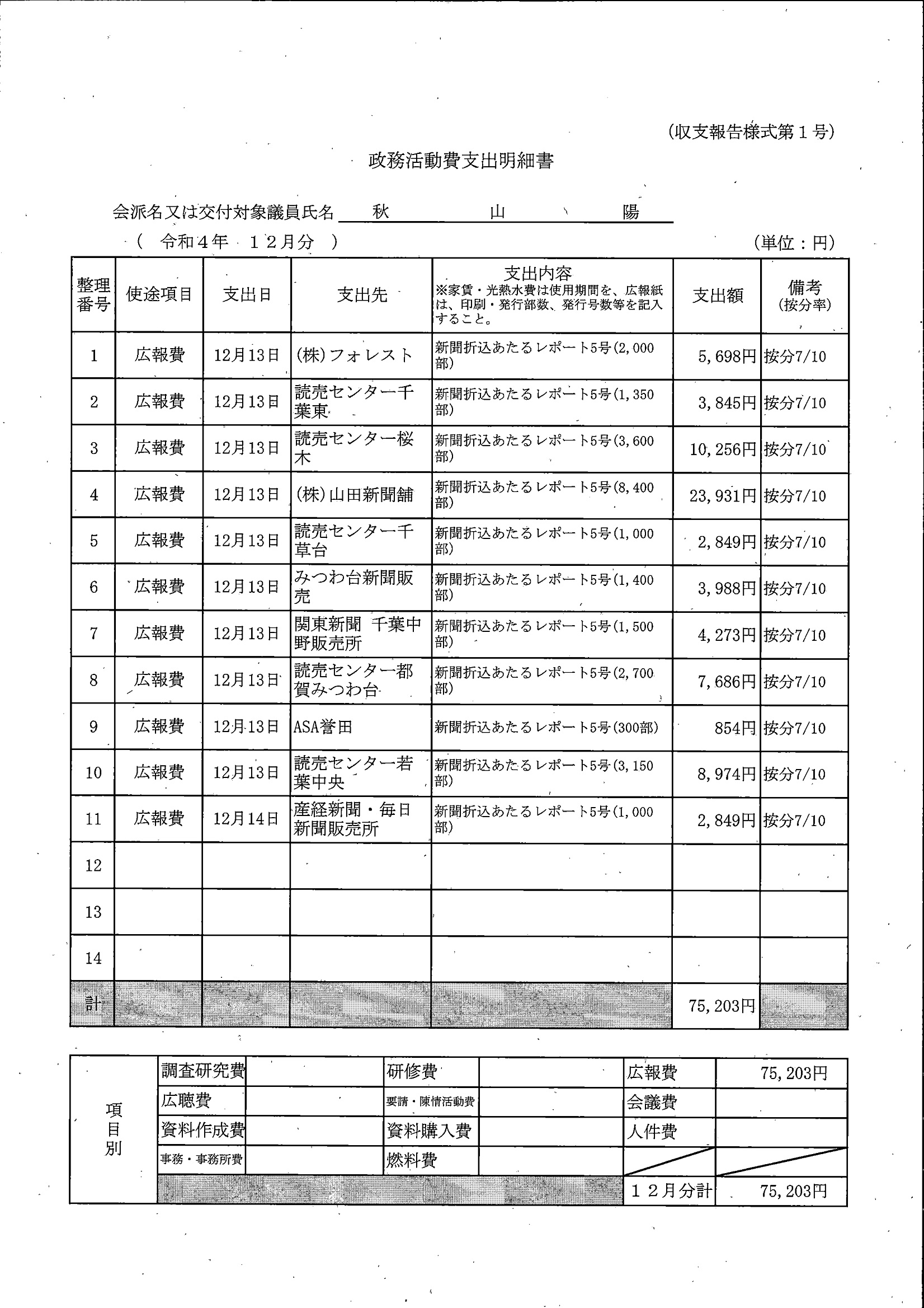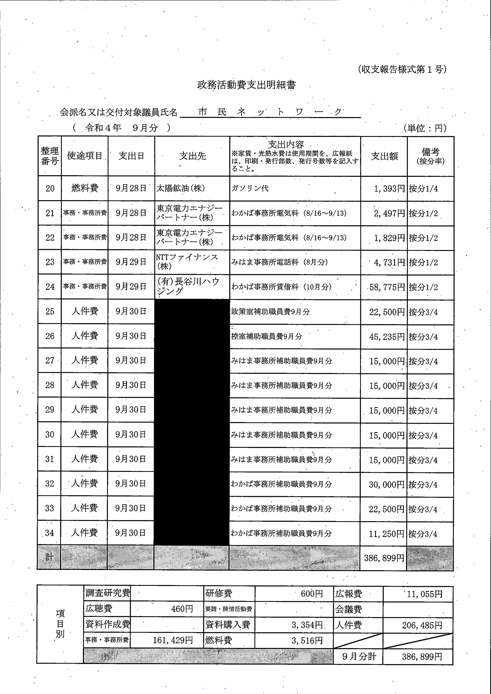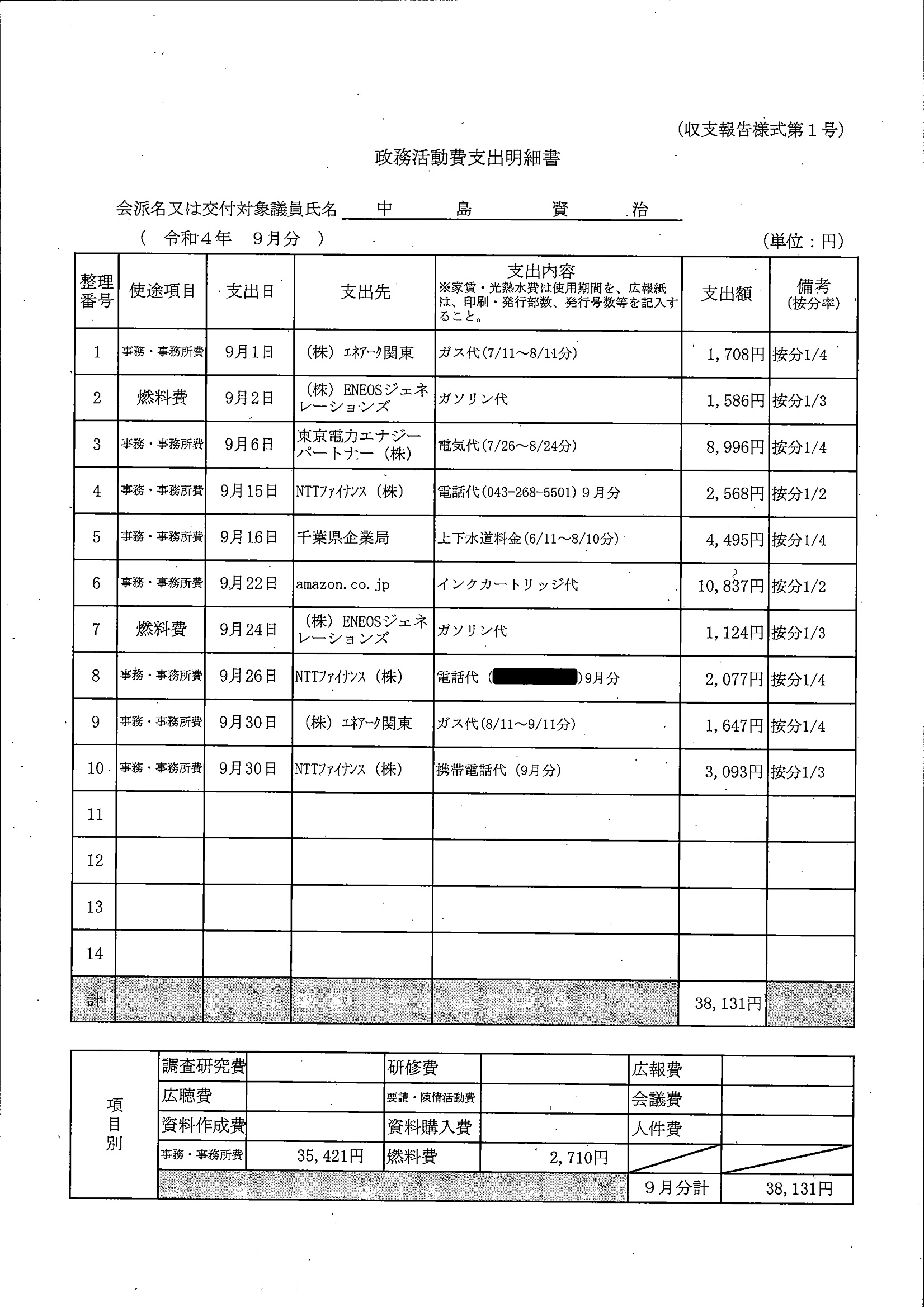 千葉市議会トップページ > 広報・情報公開 > 政務活動費 > 令和4年度交付分(政務活動費収支報告書)