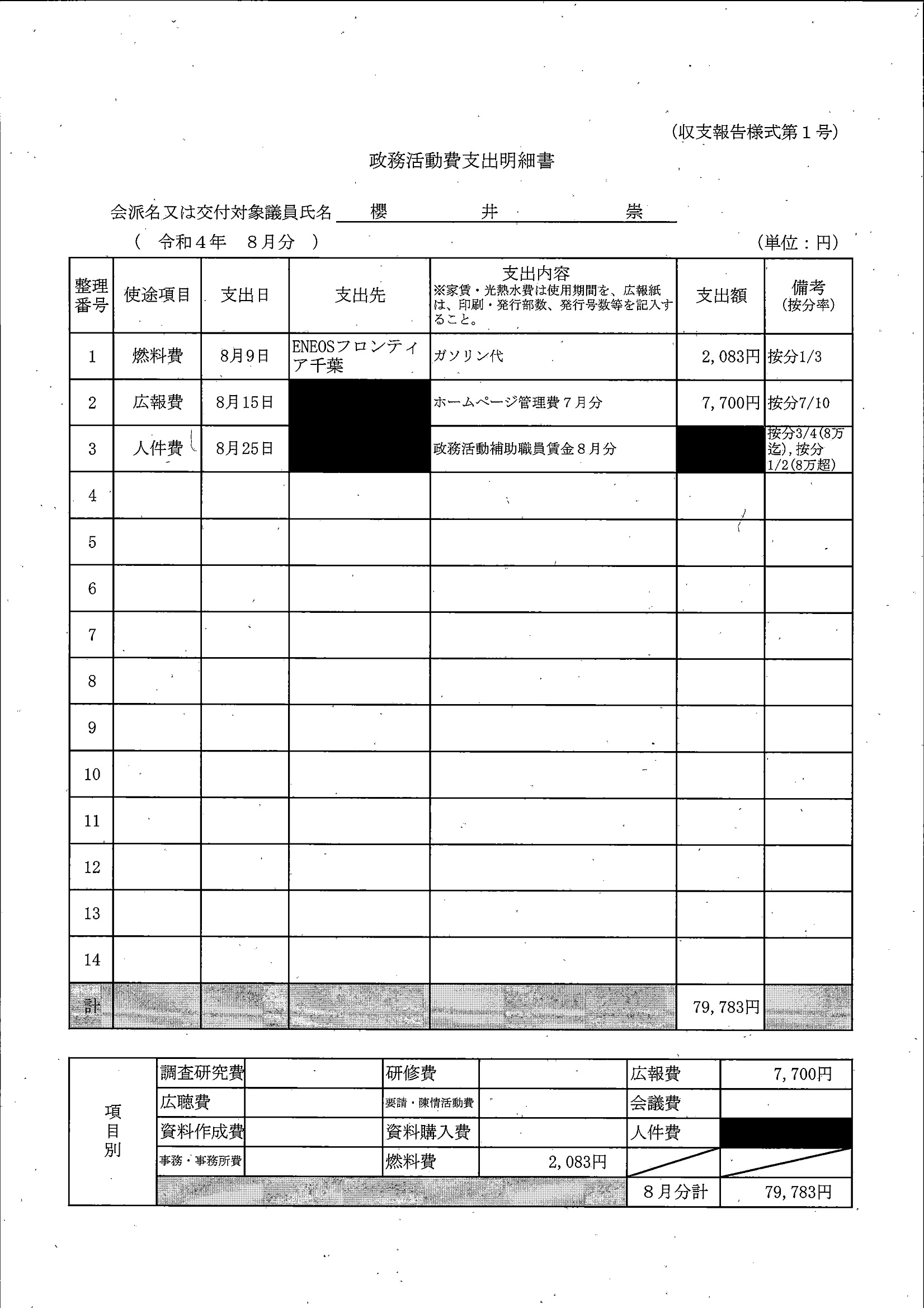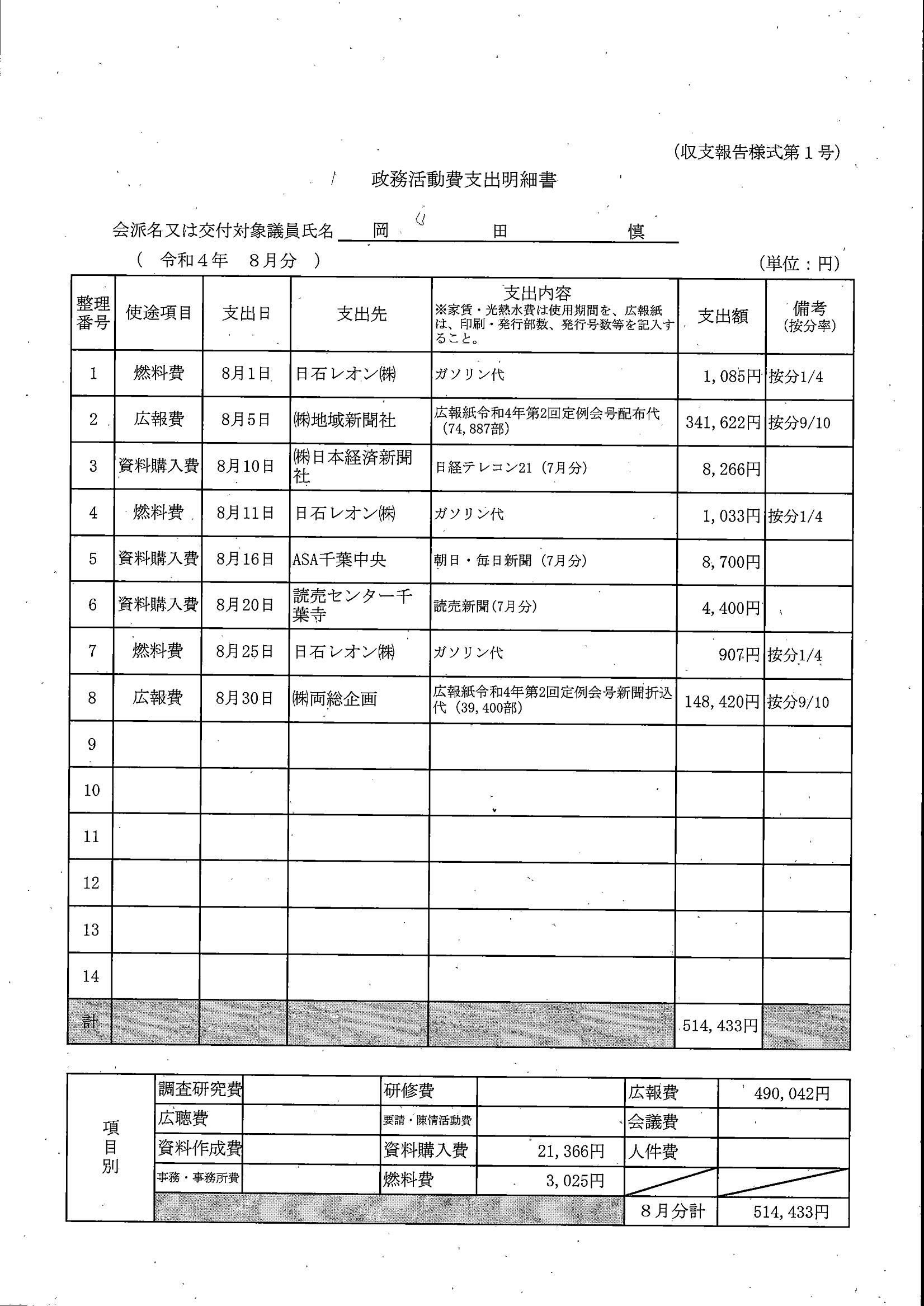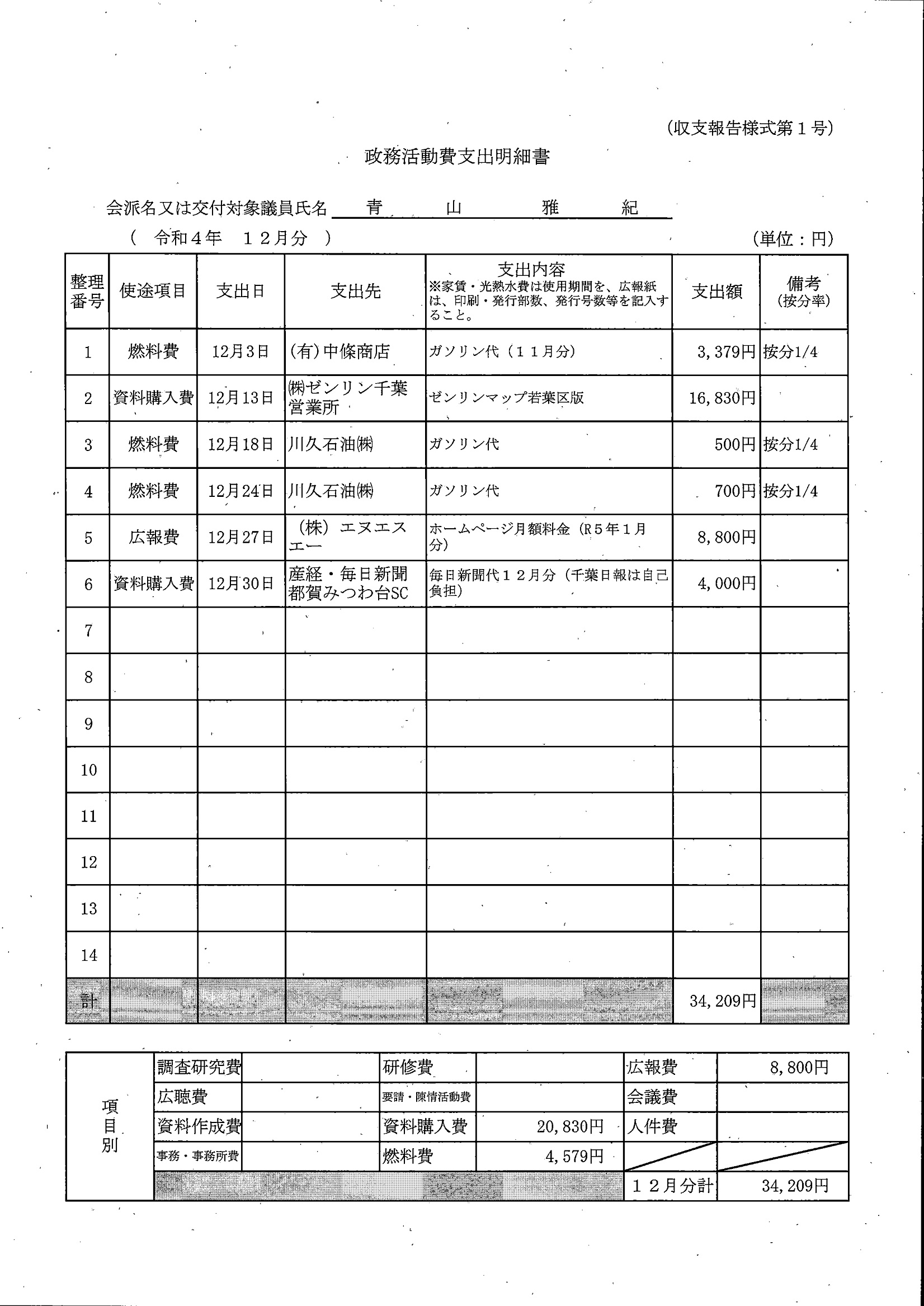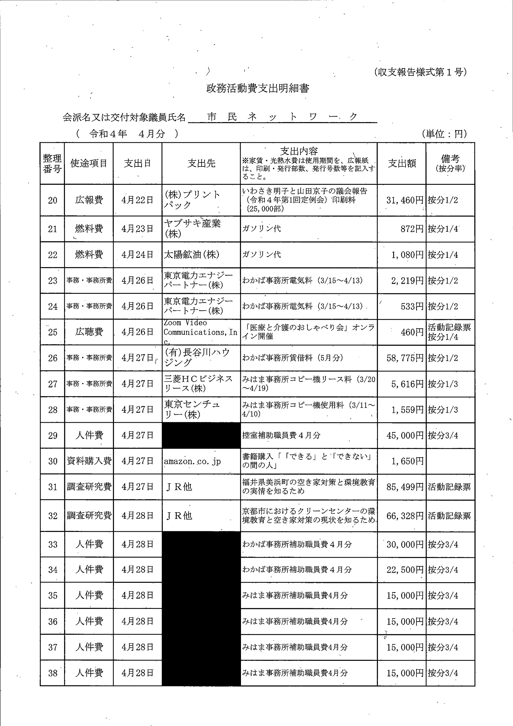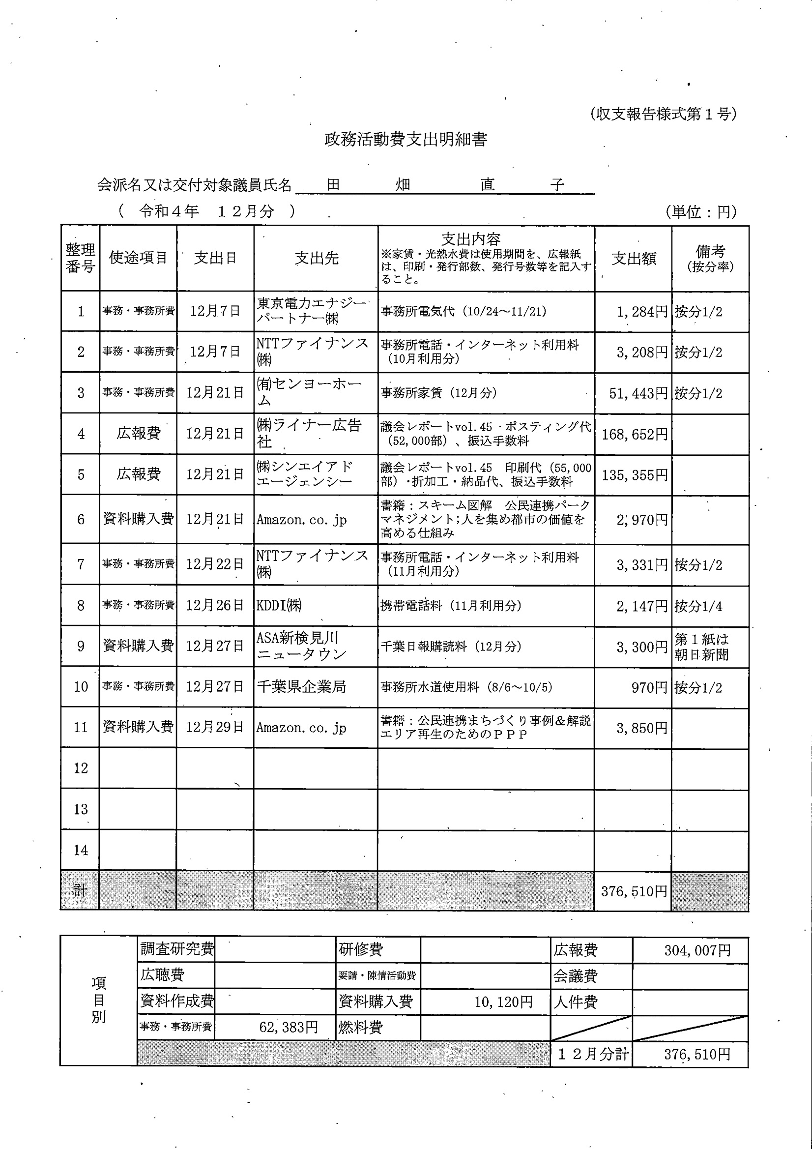 千葉市議会トップページ > 広報・情報公開 > 政務活動費 > 令和4年度交付分(政務活動費収支報告書)
